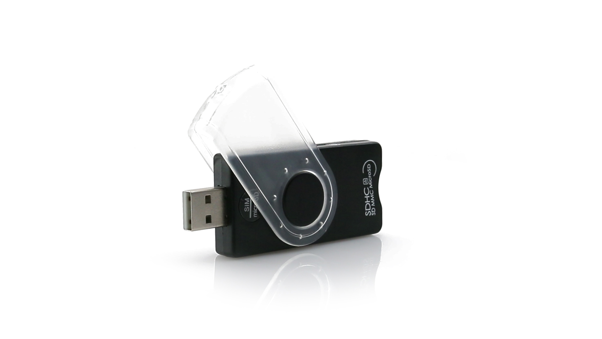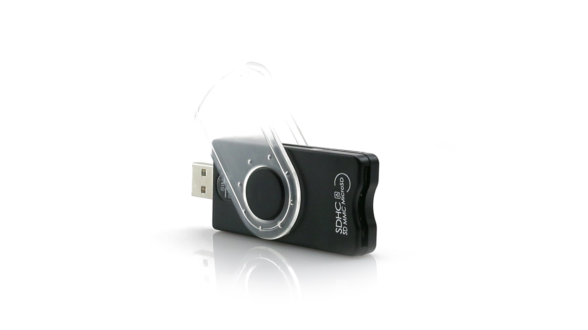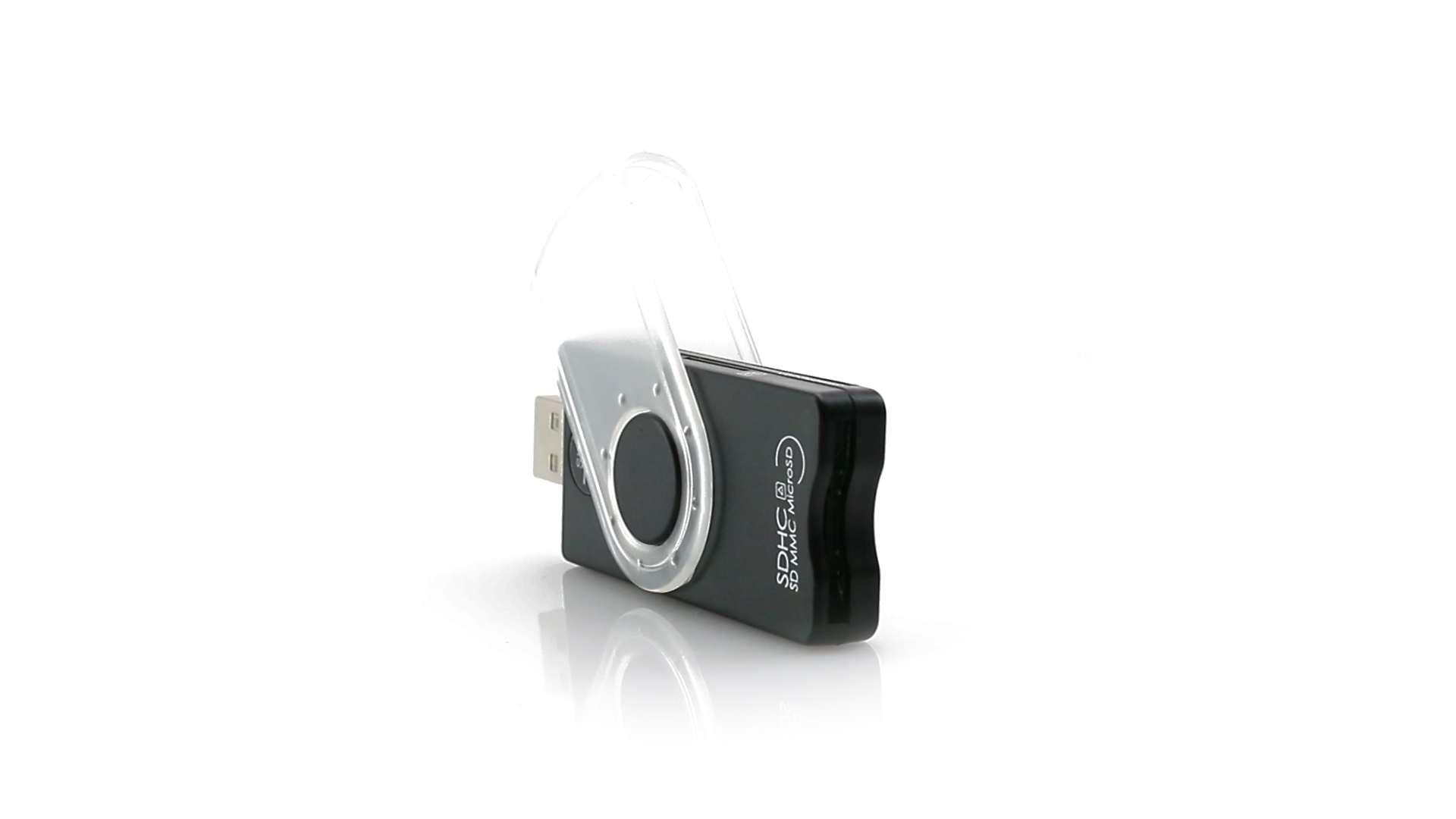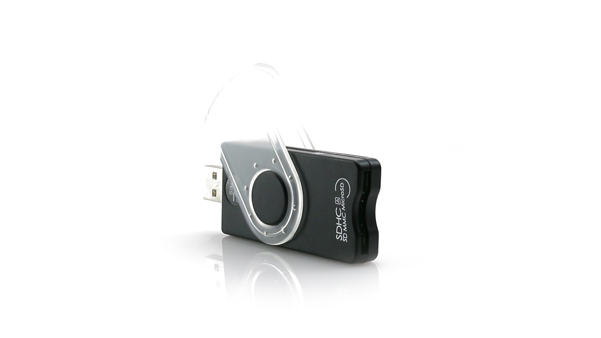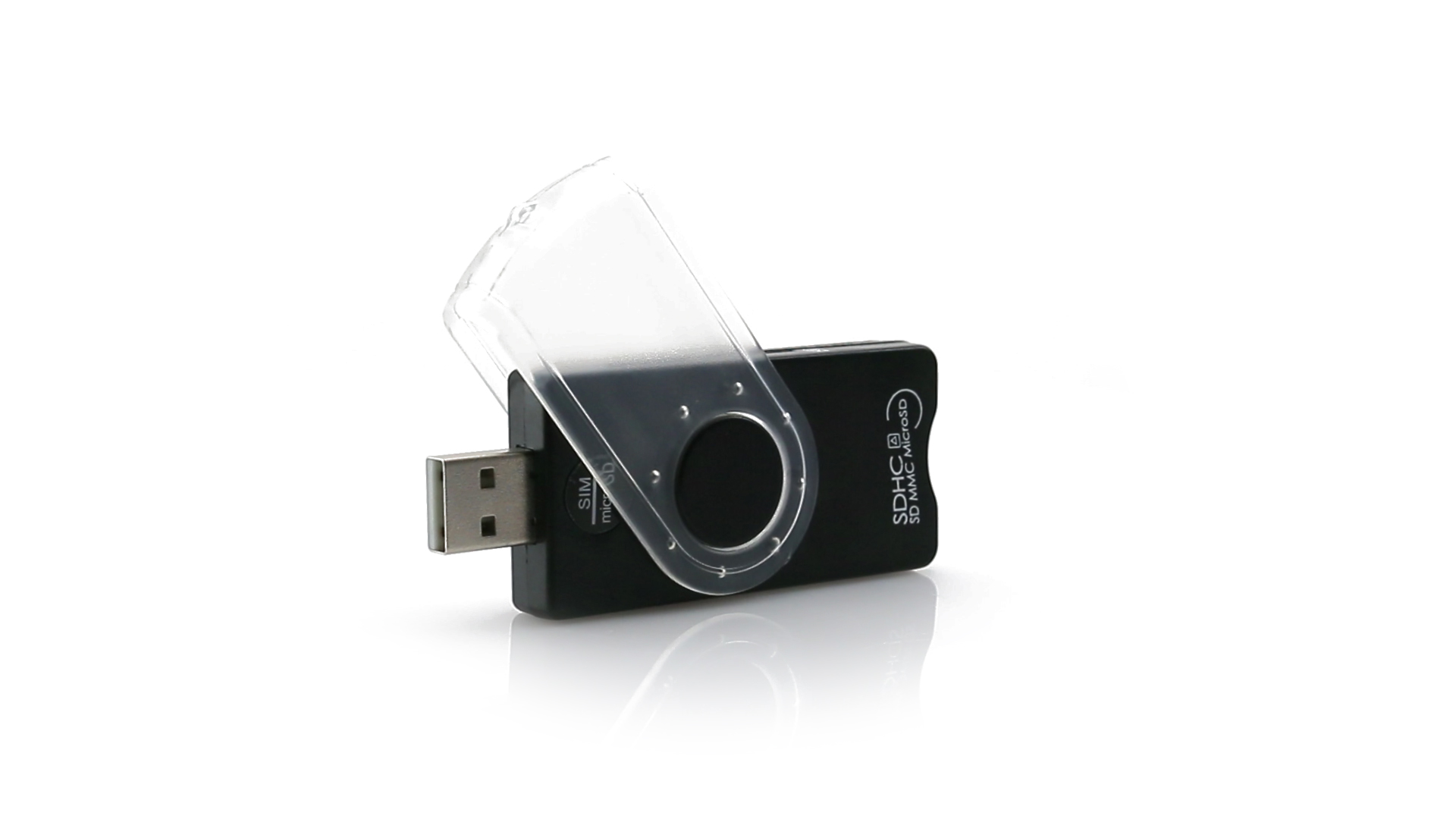 Praktischer ID/Chipkartenleser mit USB 2.0 Anschluss. Mit drehbarer Öffnung und minimalistischem Design. Geeignet für MS, M2, SD, MiniSD, SmartCards, SIM und MicroSD Speicherkarten. Kompatibel mit Windows und Mac OS. Präsentiert in einer individuellen Pappschachtel mit satiniertem schwarzem Finish.