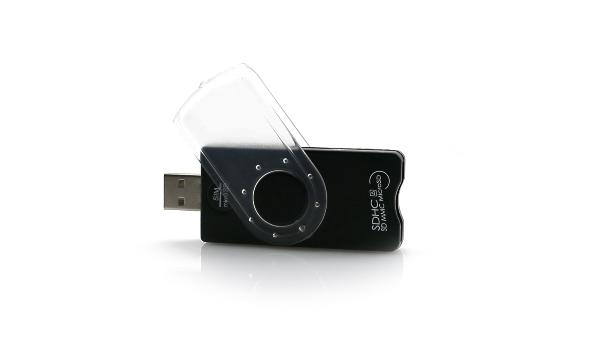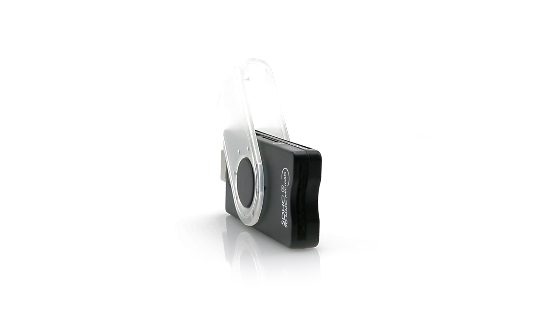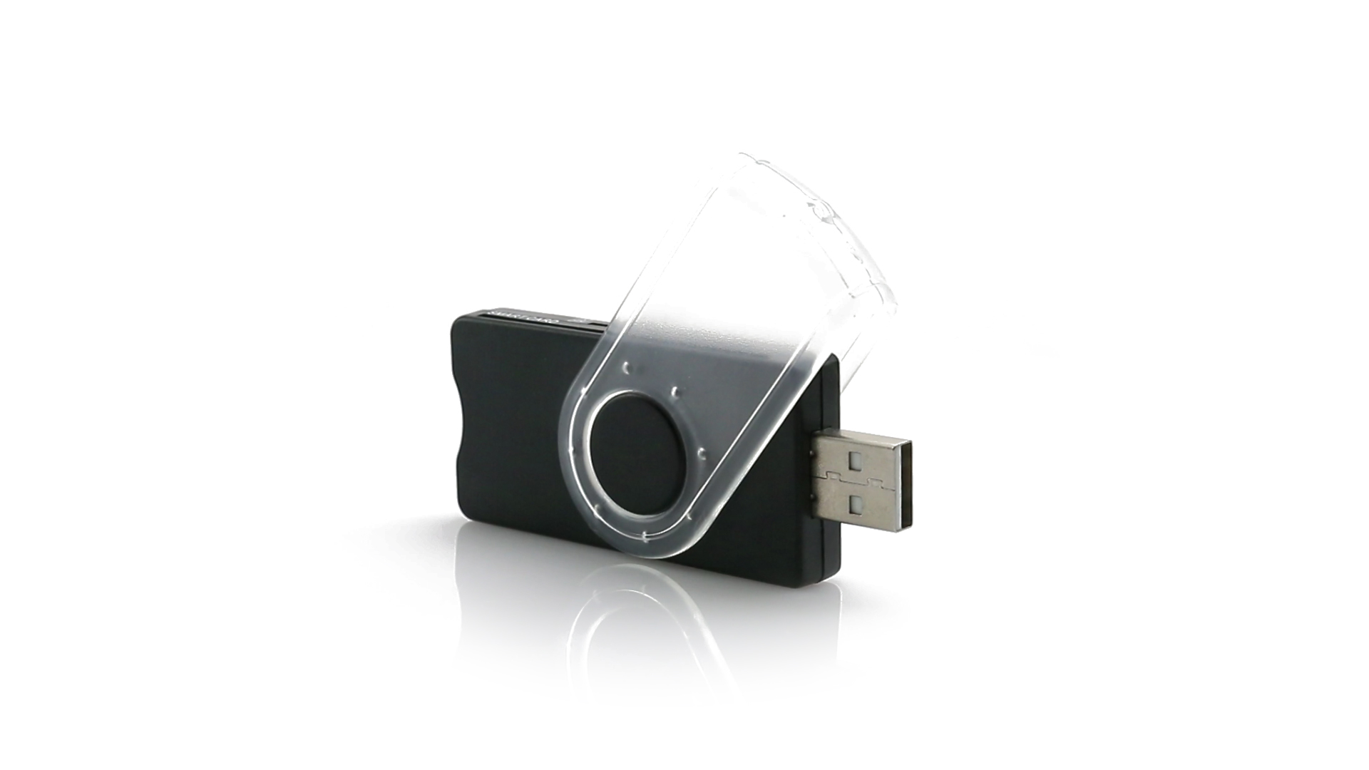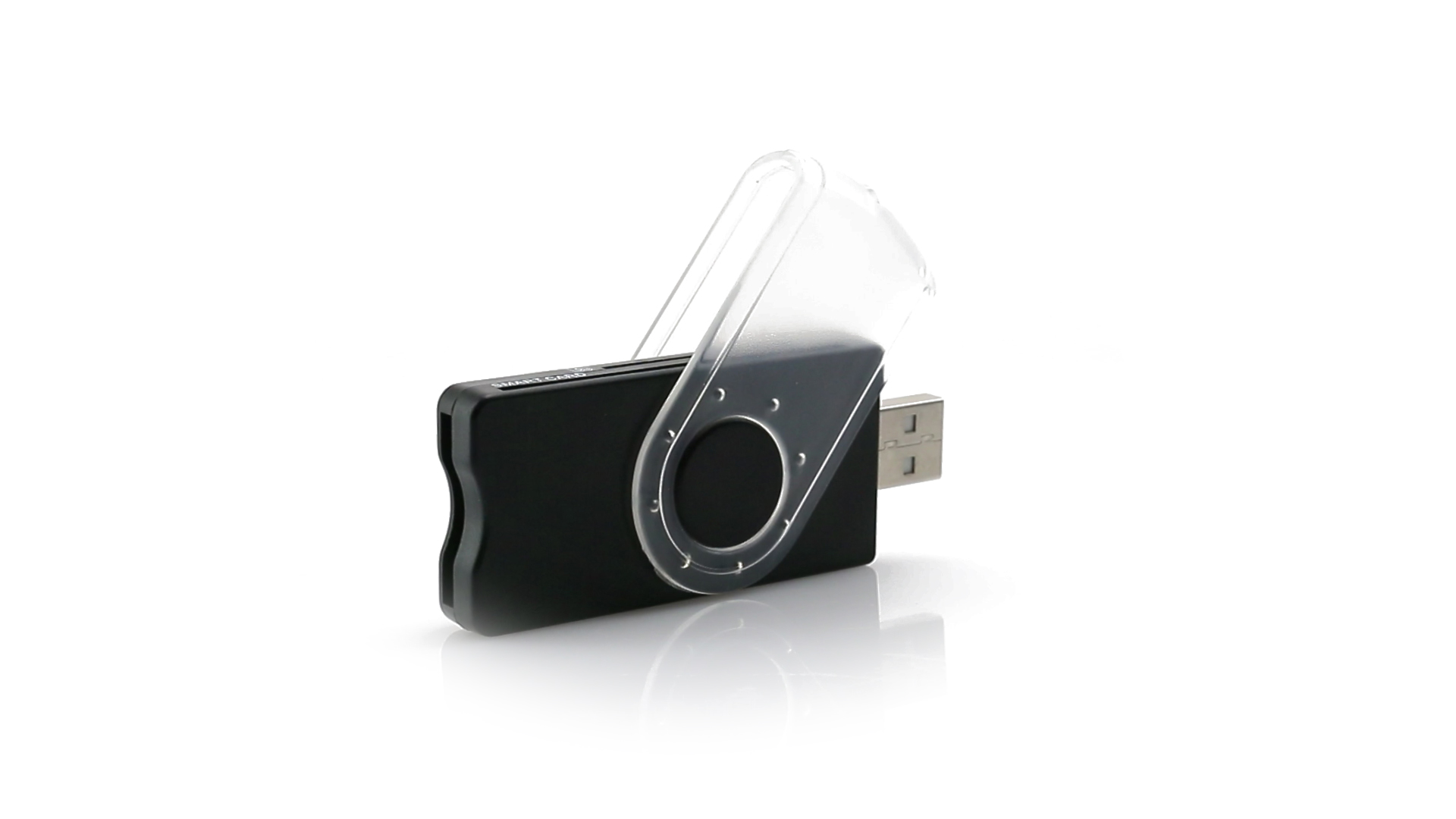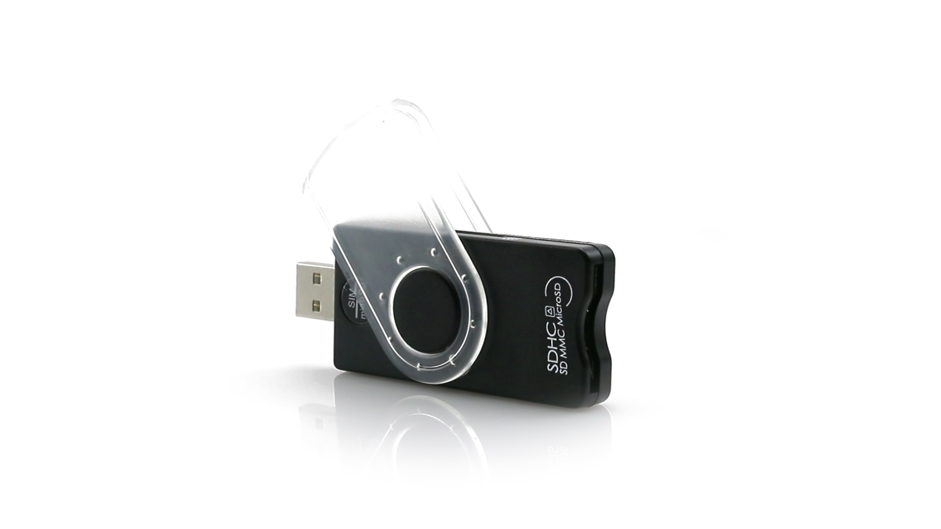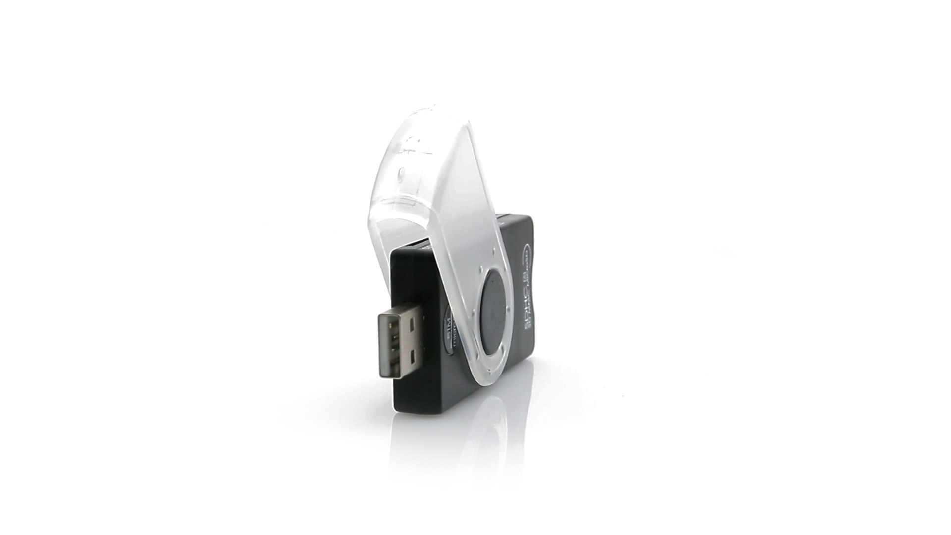 Praktischer ID/Chipkartenleser mit USB 2.0 Anschluss. Mit drehbarer Öffnung und minimalistischem Design. Geeignet für MS, M2, SD, MiniSD, SmartCards, SIM und MicroSD Speicherkarten. Kompatibel mit Windows und Mac OS. Präsentiert in einer individuellen Pappschachtel mit satiniertem schwarzem Finish.