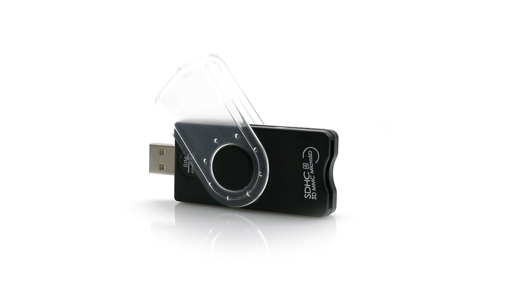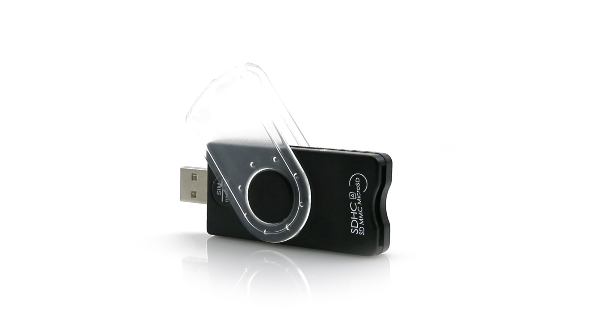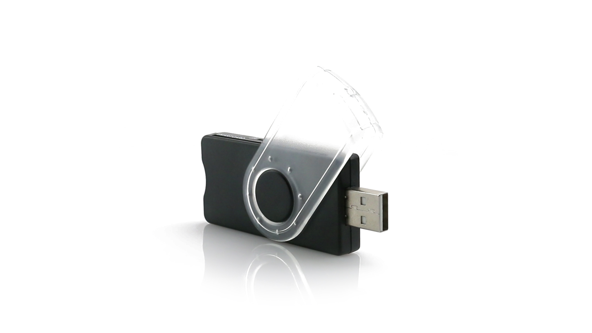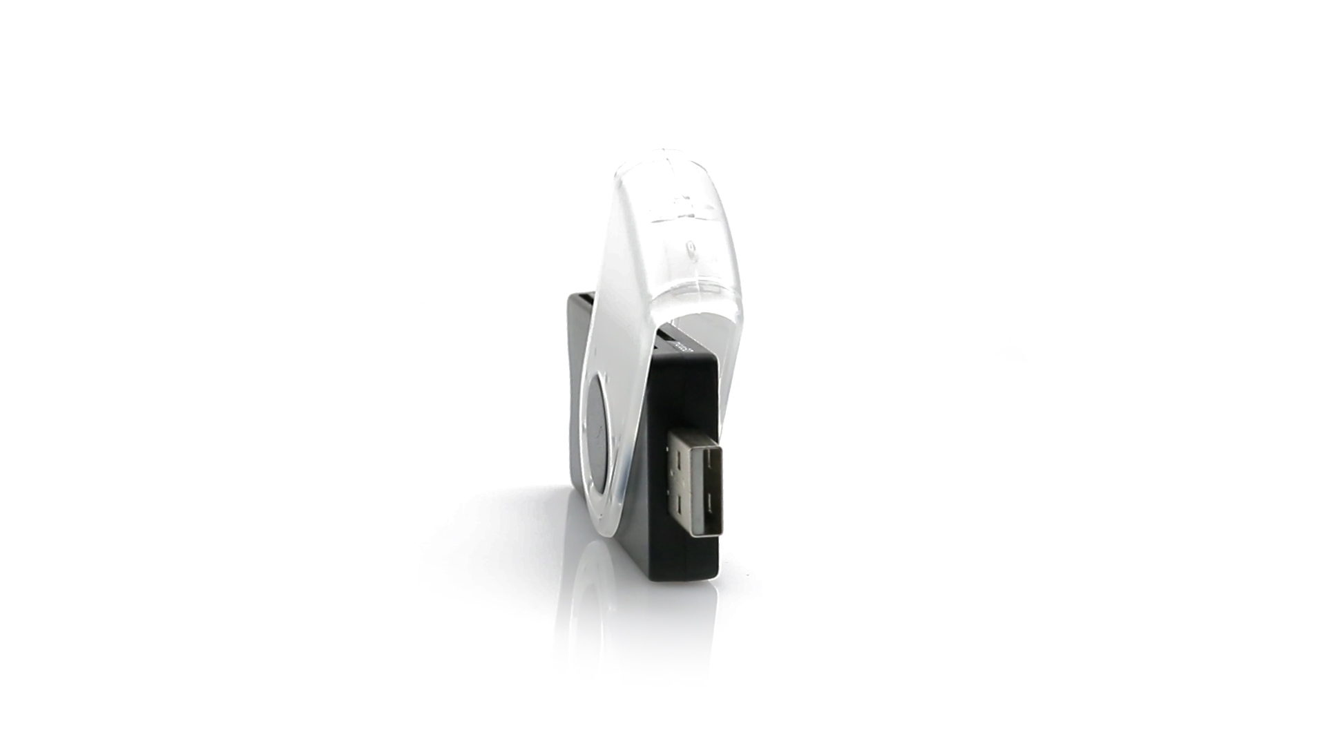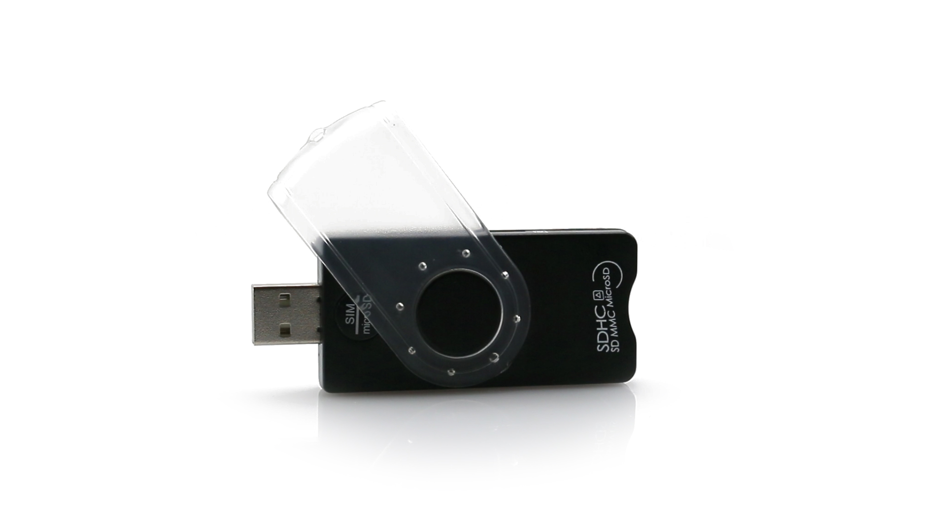 Praktischer ID/Chipkartenleser mit USB 2.0 Anschluss. Mit drehbarer Öffnung und minimalistischem Design. Geeignet für MS, M2, SD, MiniSD, SmartCards, SIM und MicroSD Speicherkarten. Kompatibel mit Windows und Mac OS. Präsentiert in einer individuellen Pappschachtel mit satiniertem schwarzem Finish.