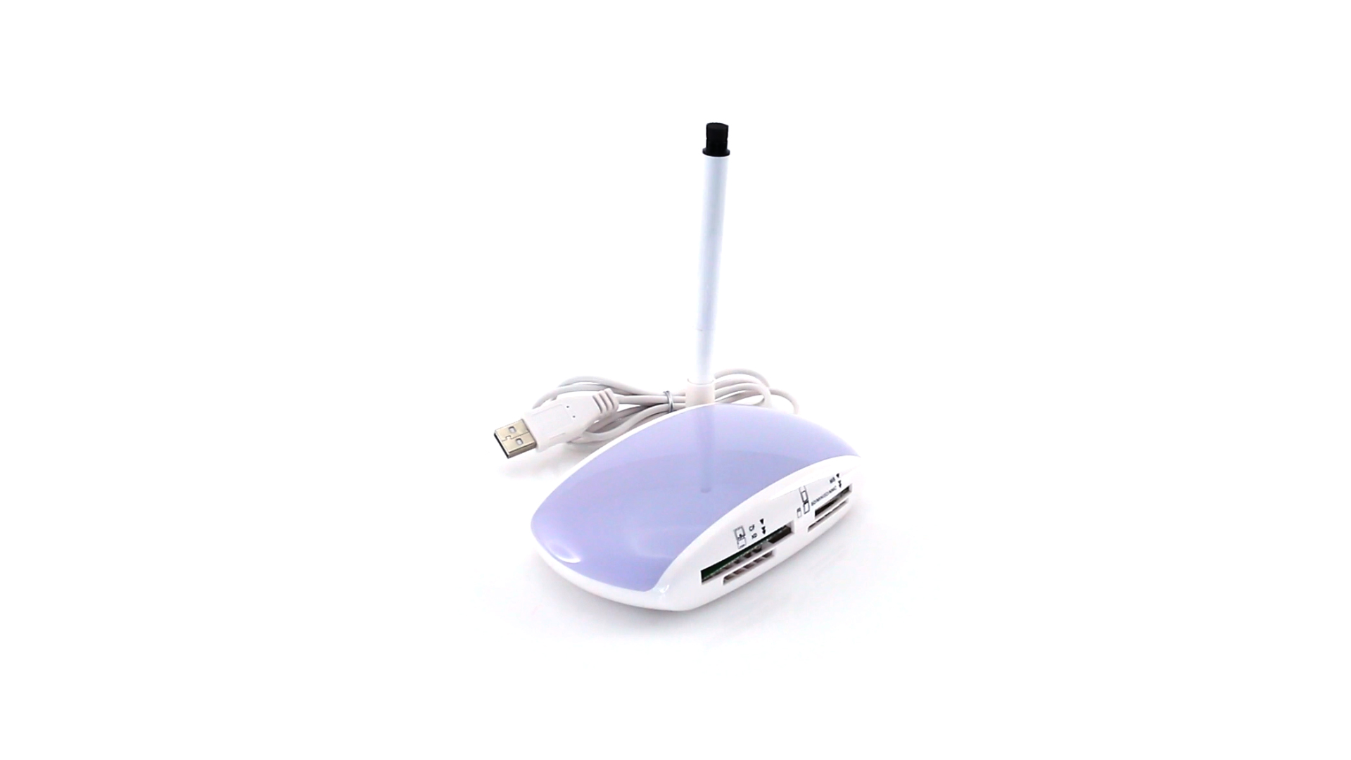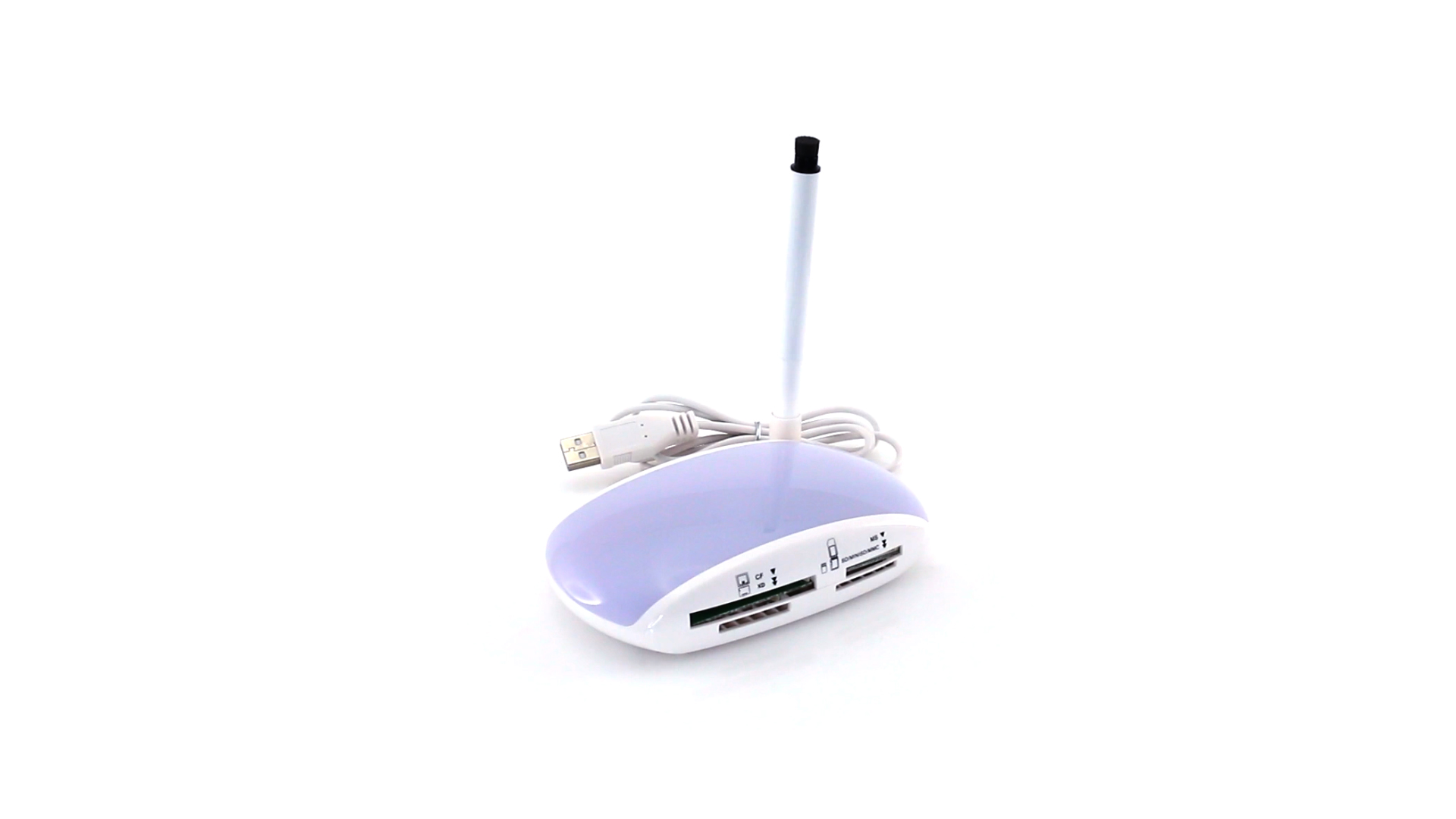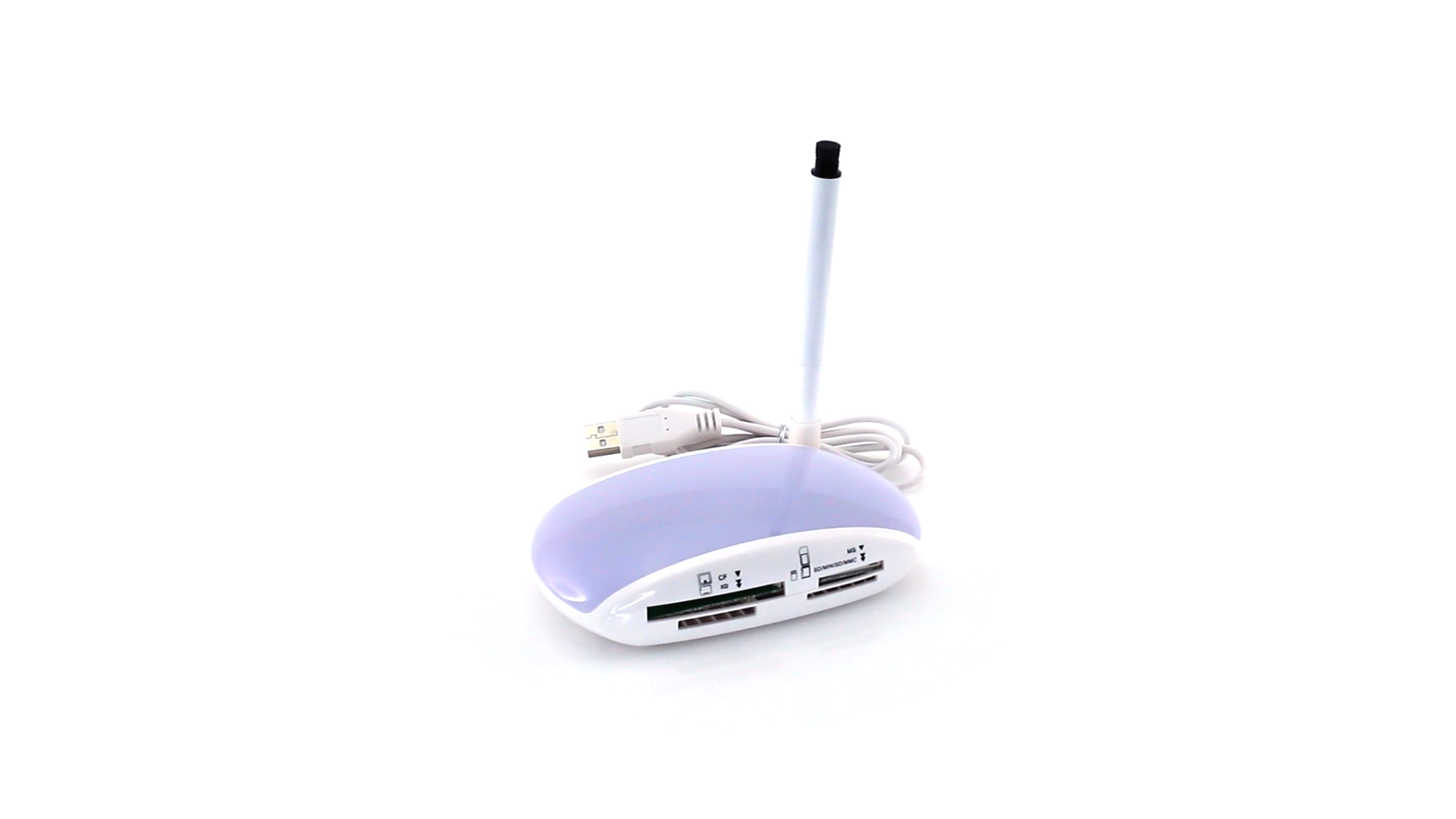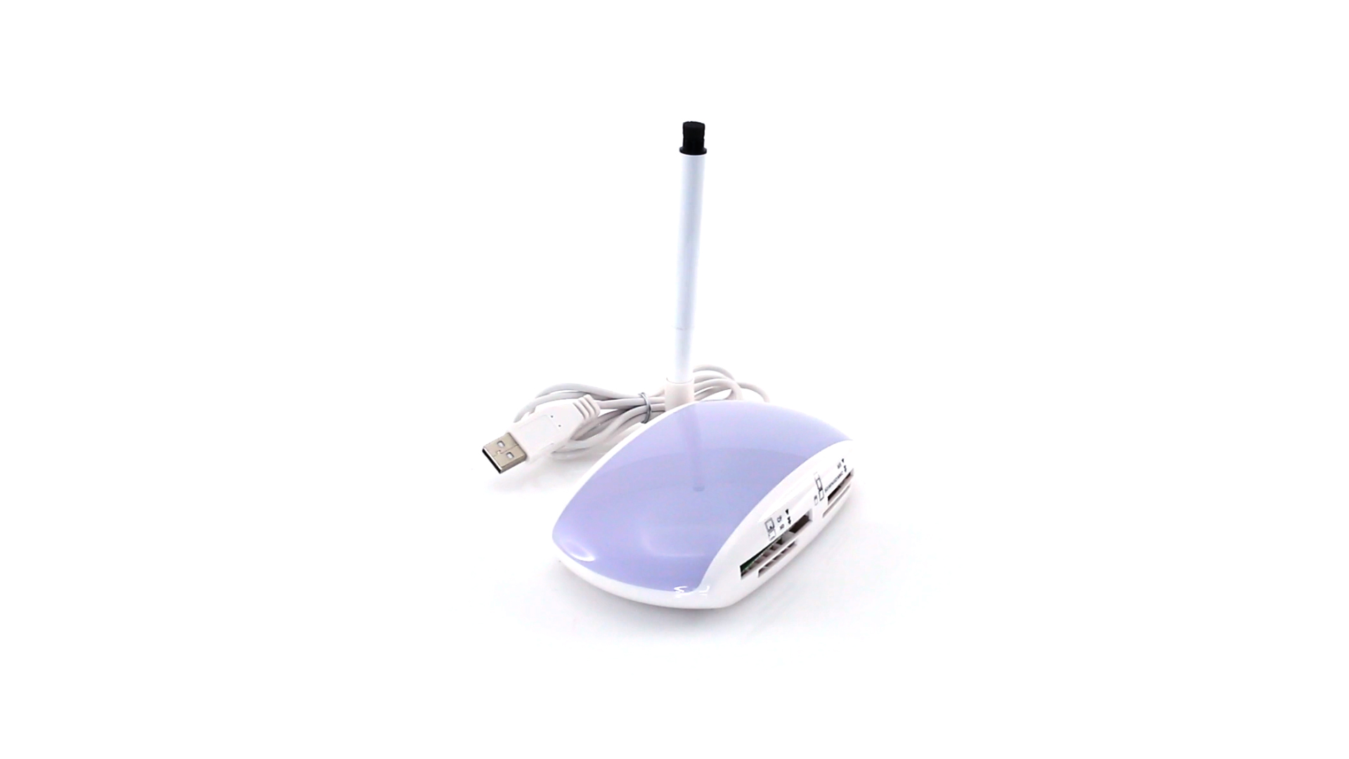 Origineller Kartenleser mit zweifarbigem, geschwungenem Design und halbtransparenter Abdeckung mit Beleuchtung. Mit Stift zum Schreiben von Nachrichten auf die beleuchtete Fläche. Kompatibel mit SD, MiniSD, mmC, XD, XS und CF. Präsentiert in einer individuellen schwarzen Box.