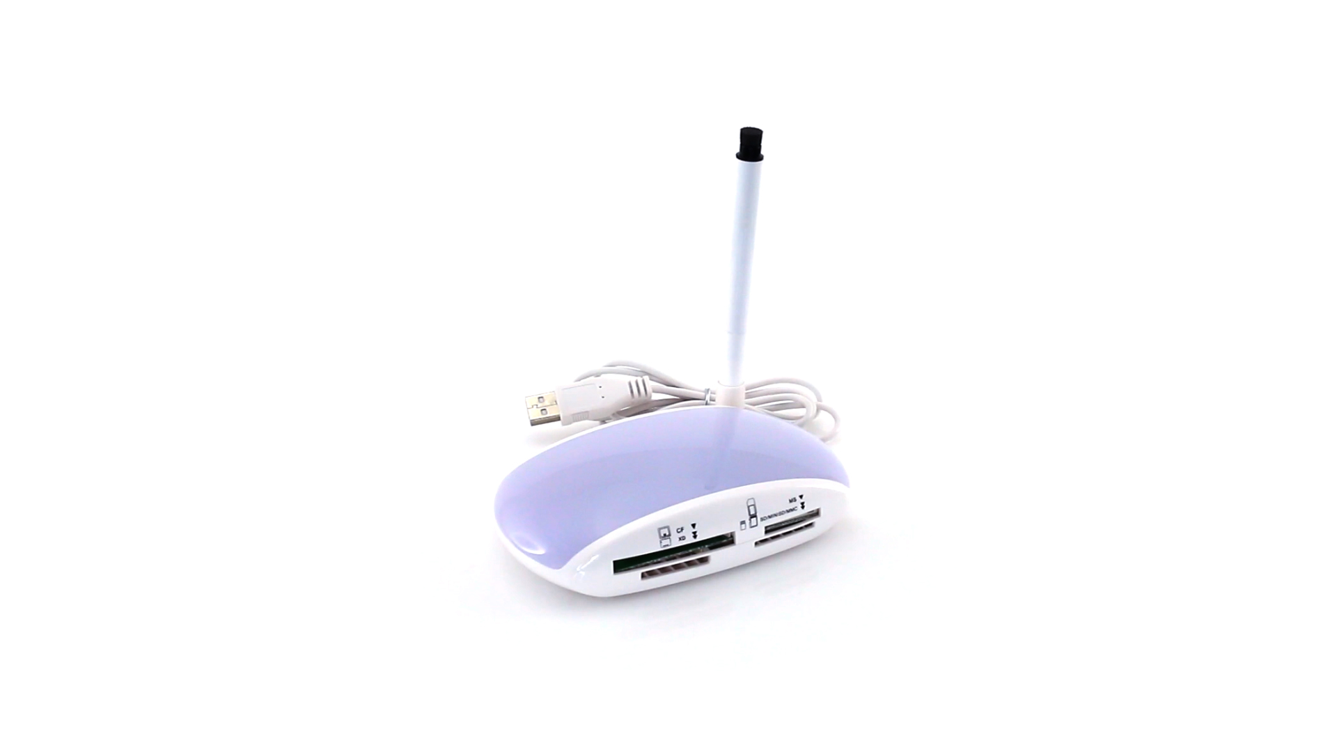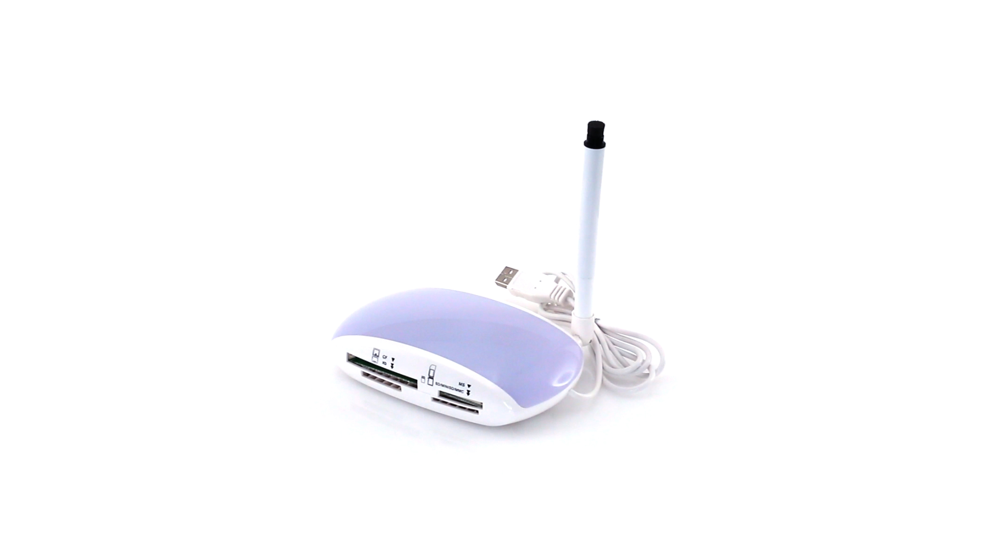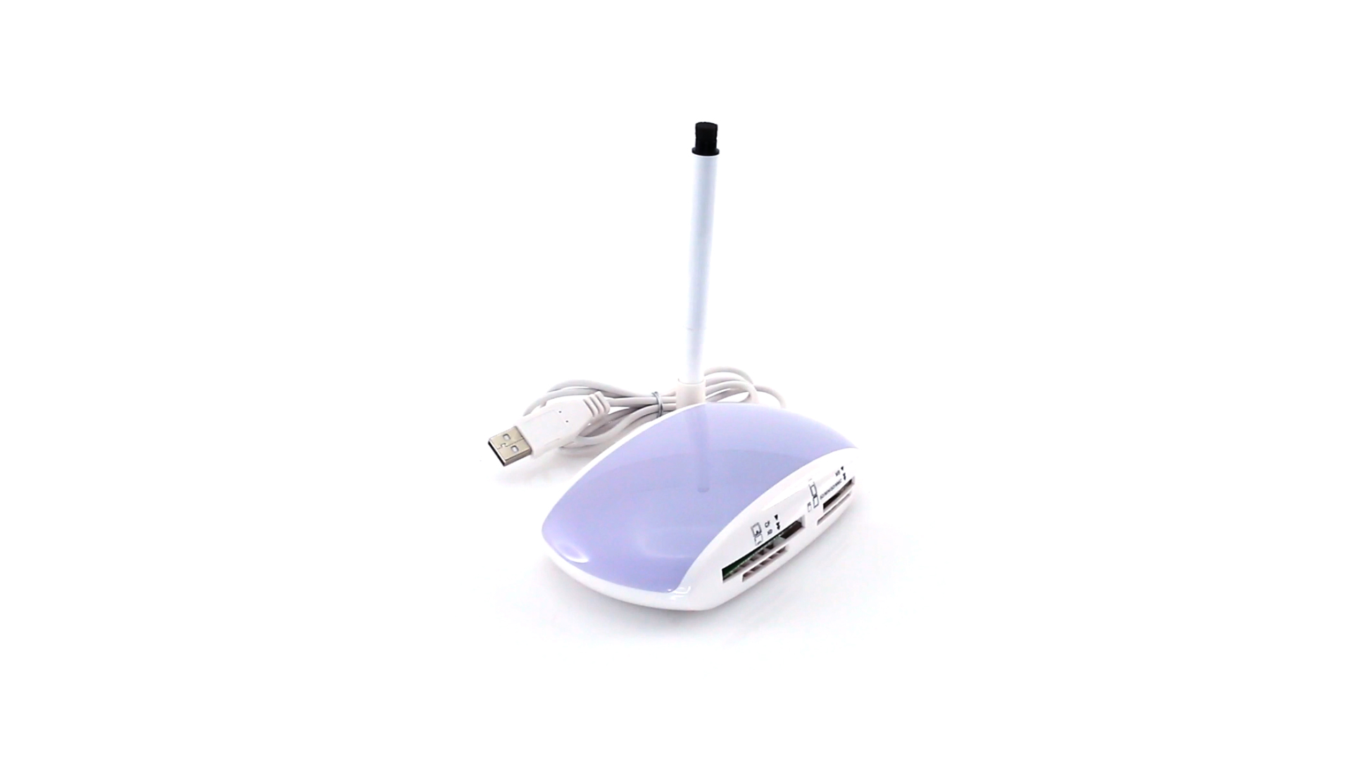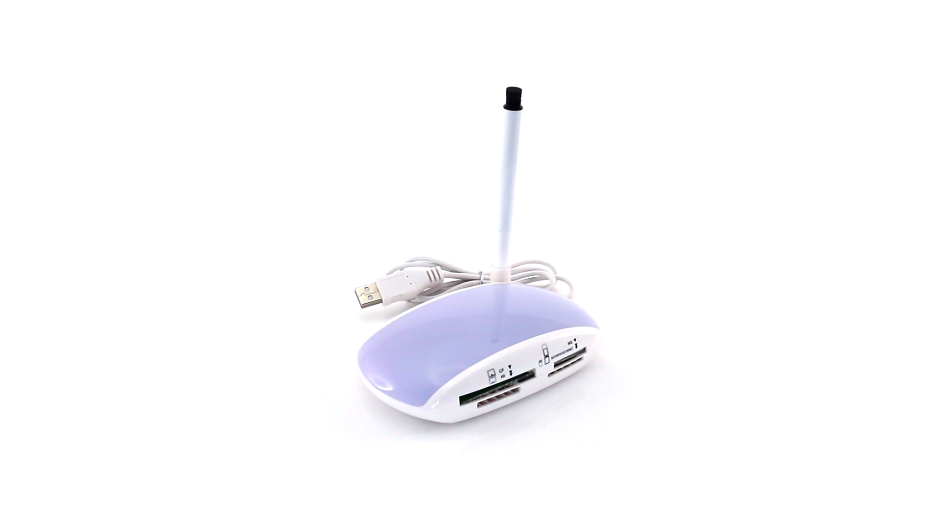Origineller Kartenleser mit zweifarbigem, geschwungenem Design und halbtransparenter Abdeckung mit Beleuchtung. Mit Stift zum Schreiben von Nachrichten auf die beleuchtete Fläche. Kompatibel mit SD, MiniSD, mmC, XD, XS und CF. Präsentiert in einer individuellen schwarzen Box.