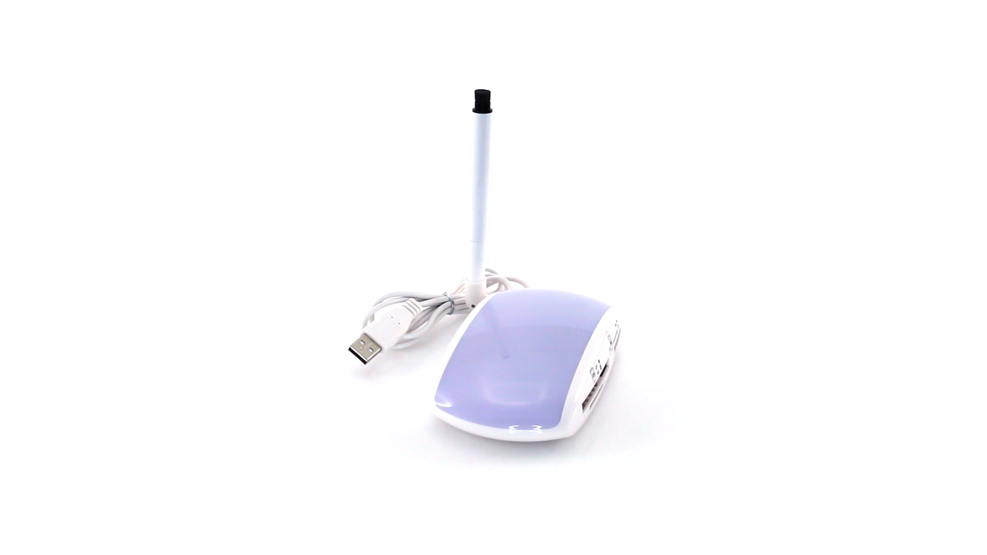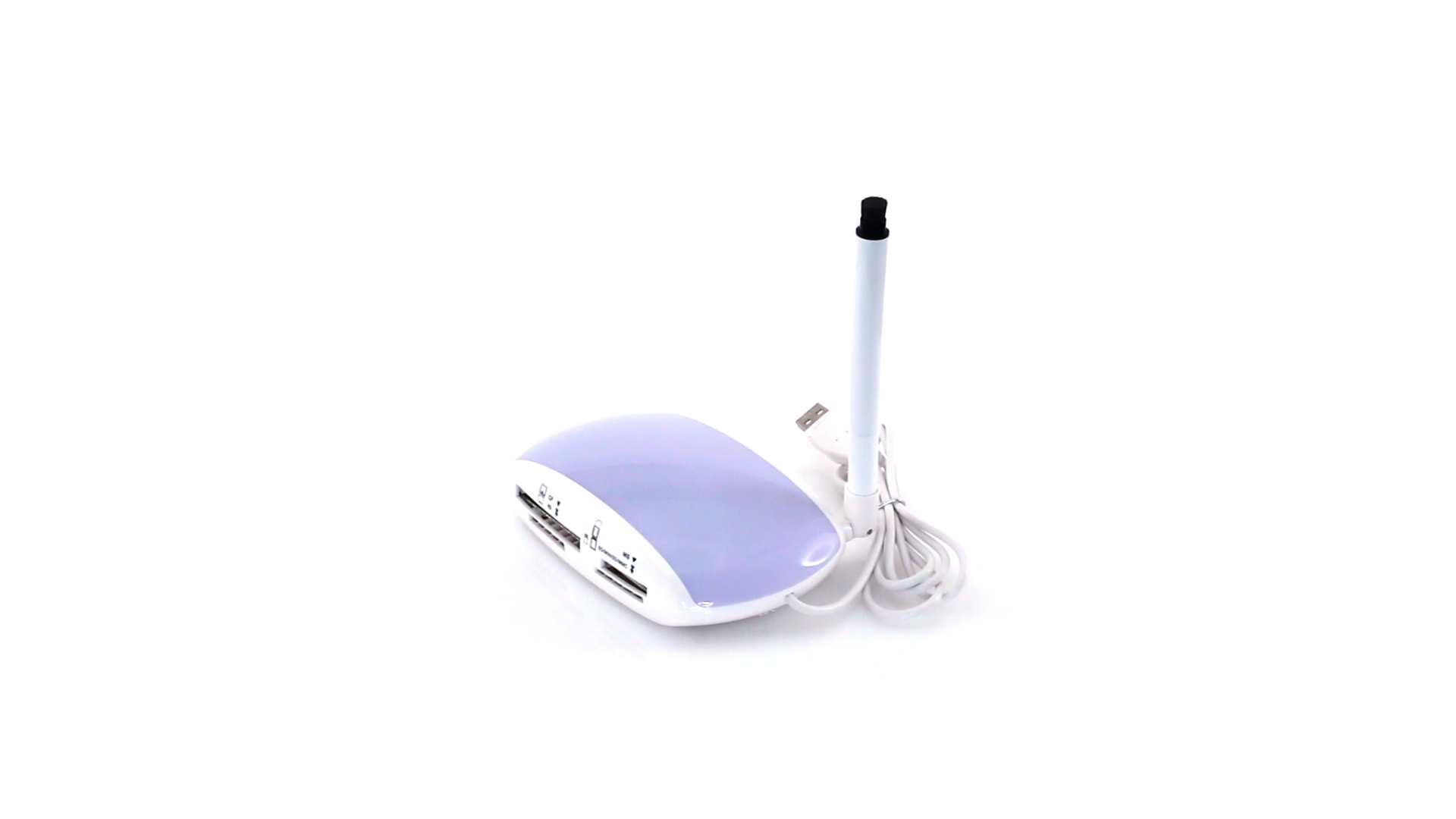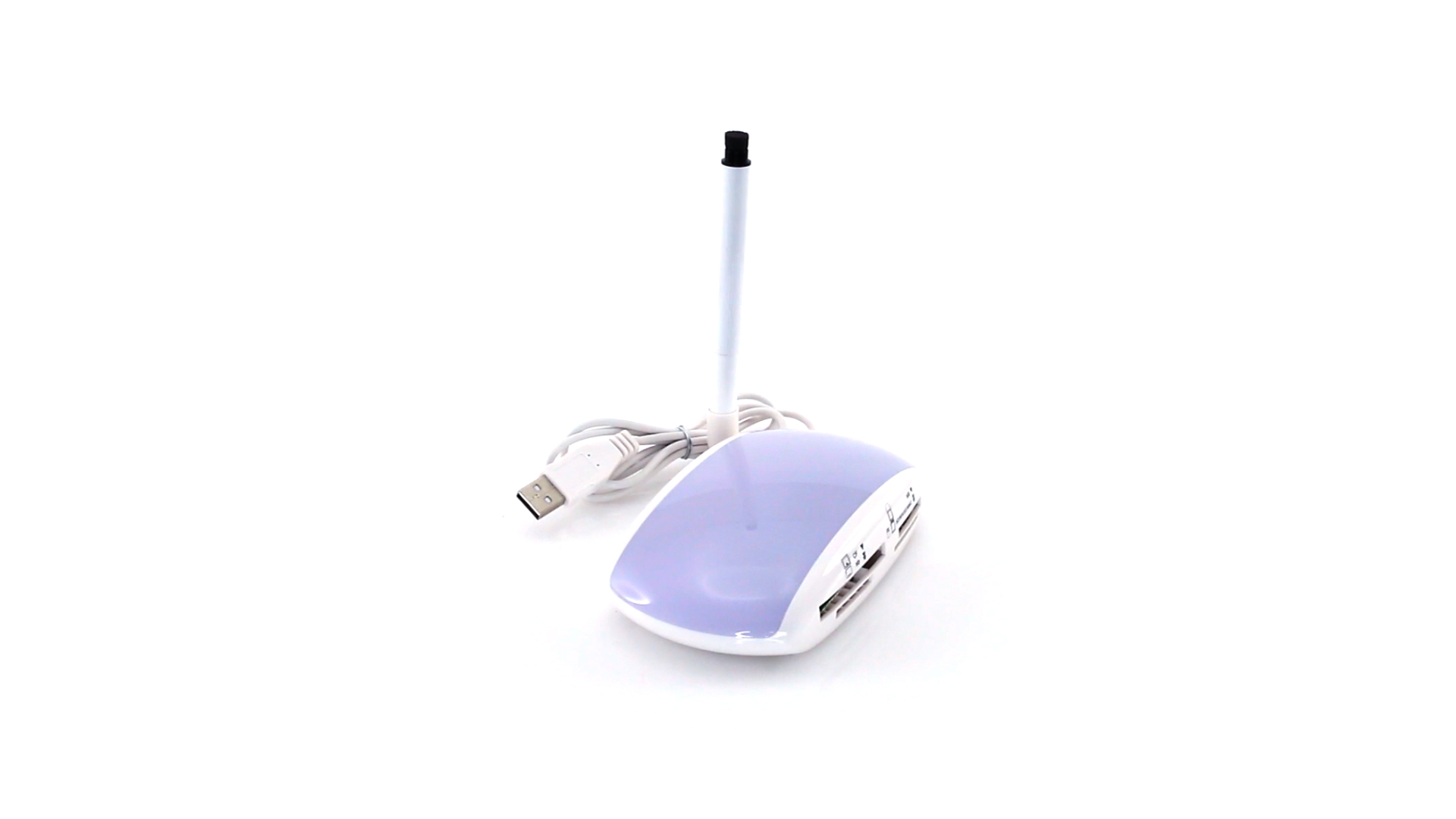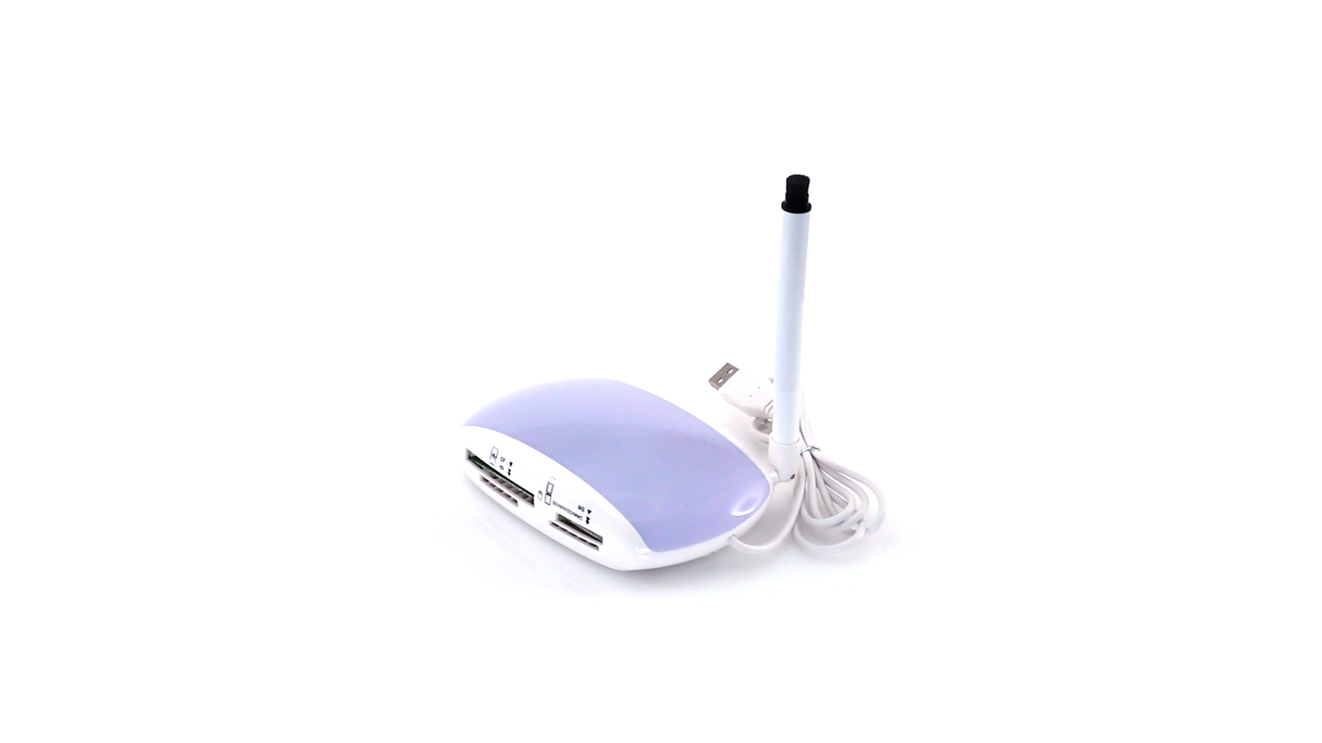 Origineller Kartenleser mit zweifarbigem, geschwungenem Design und halbtransparenter Abdeckung mit Beleuchtung. Mit Stift zum Schreiben von Nachrichten auf die beleuchtete Fläche. Kompatibel mit SD, MiniSD, mmC, XD, XS und CF. Präsentiert in einer individuellen schwarzen Box.