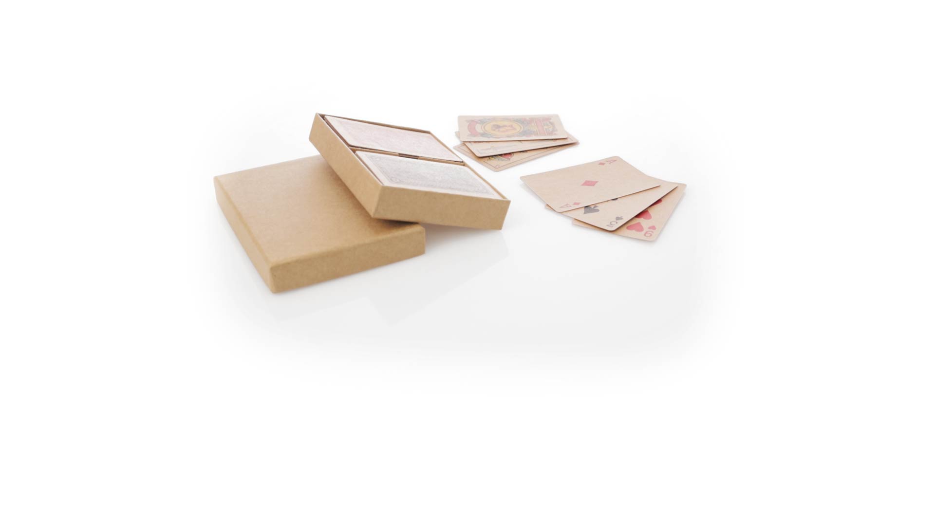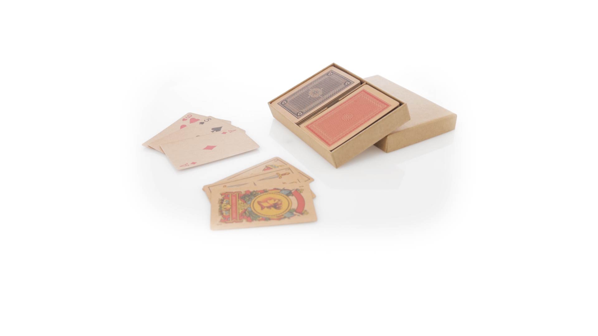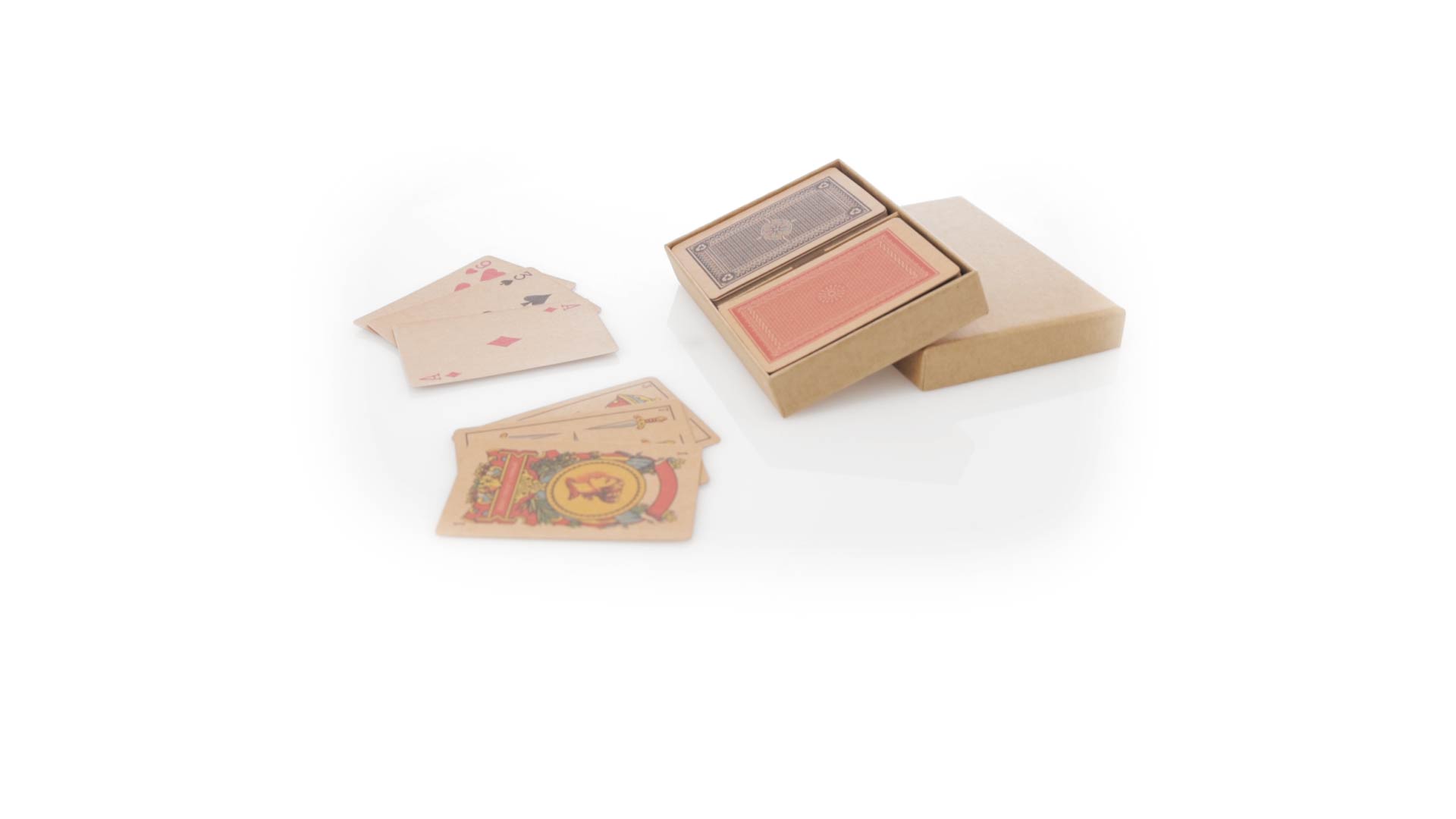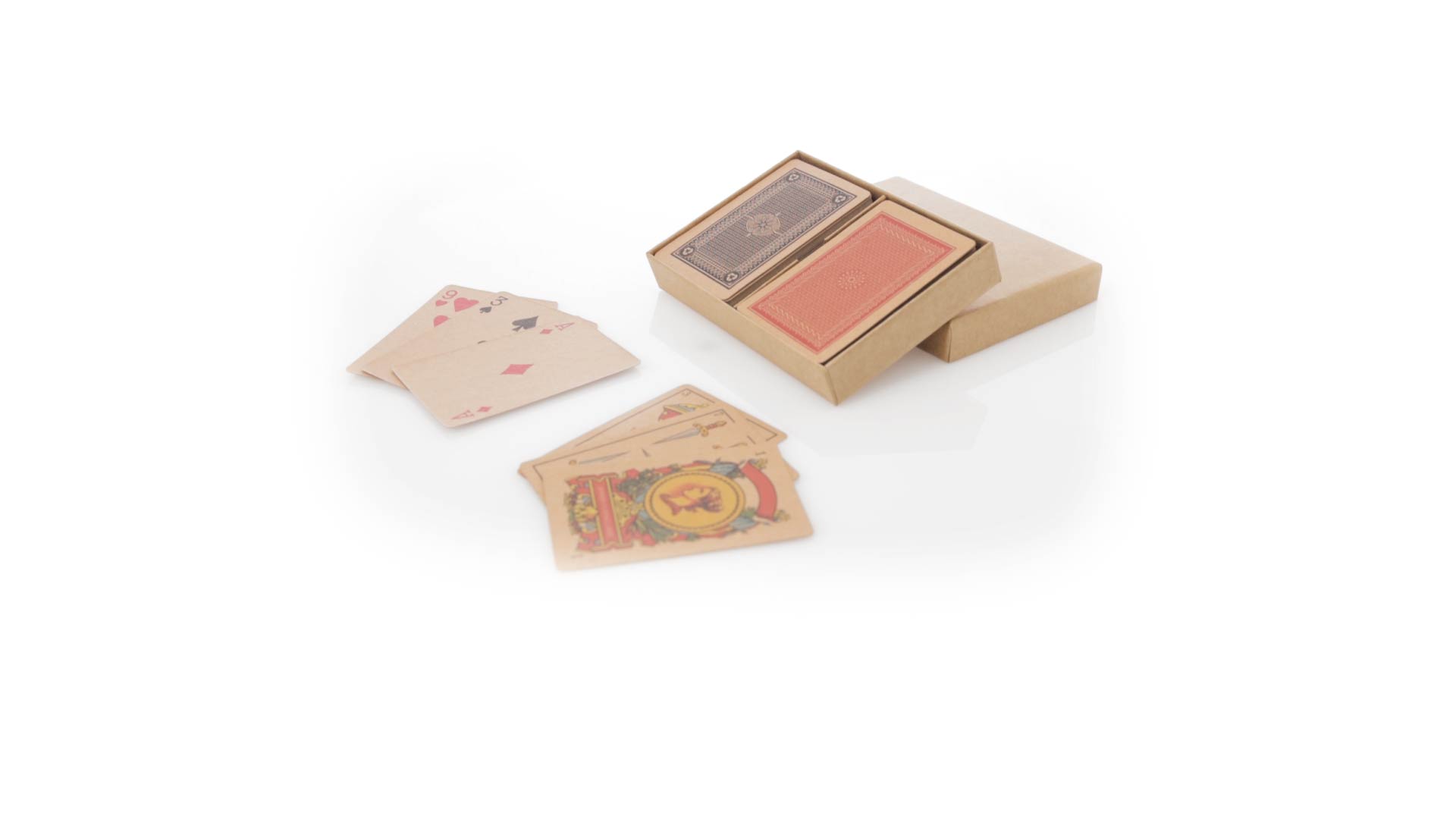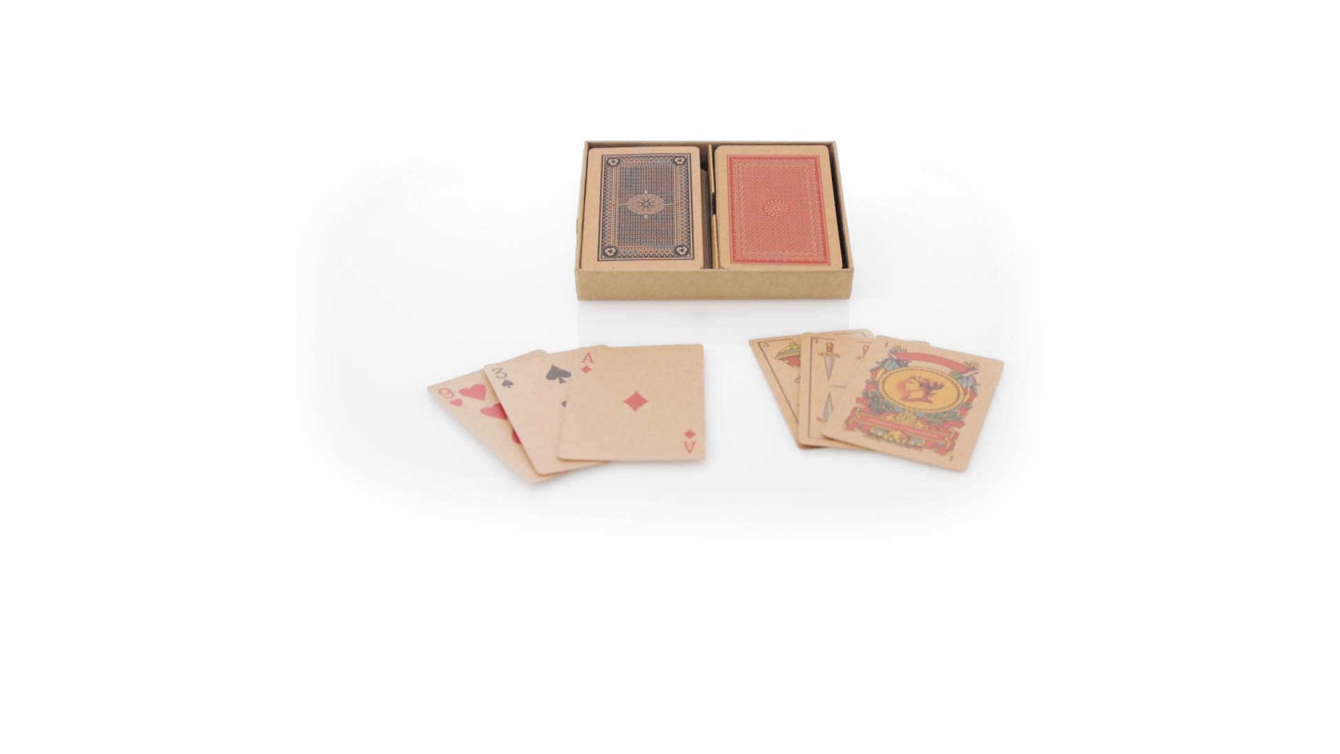 Set spanischer und französischer Spielkarten aus widerstandsfähigem Recyclingkarton. Spanisches Kartenspiel mit 50 Karten und französisches Kartenspiel mit 54 Karten, präsentiert in einer Kraftkartonschachtel mit Deckel.