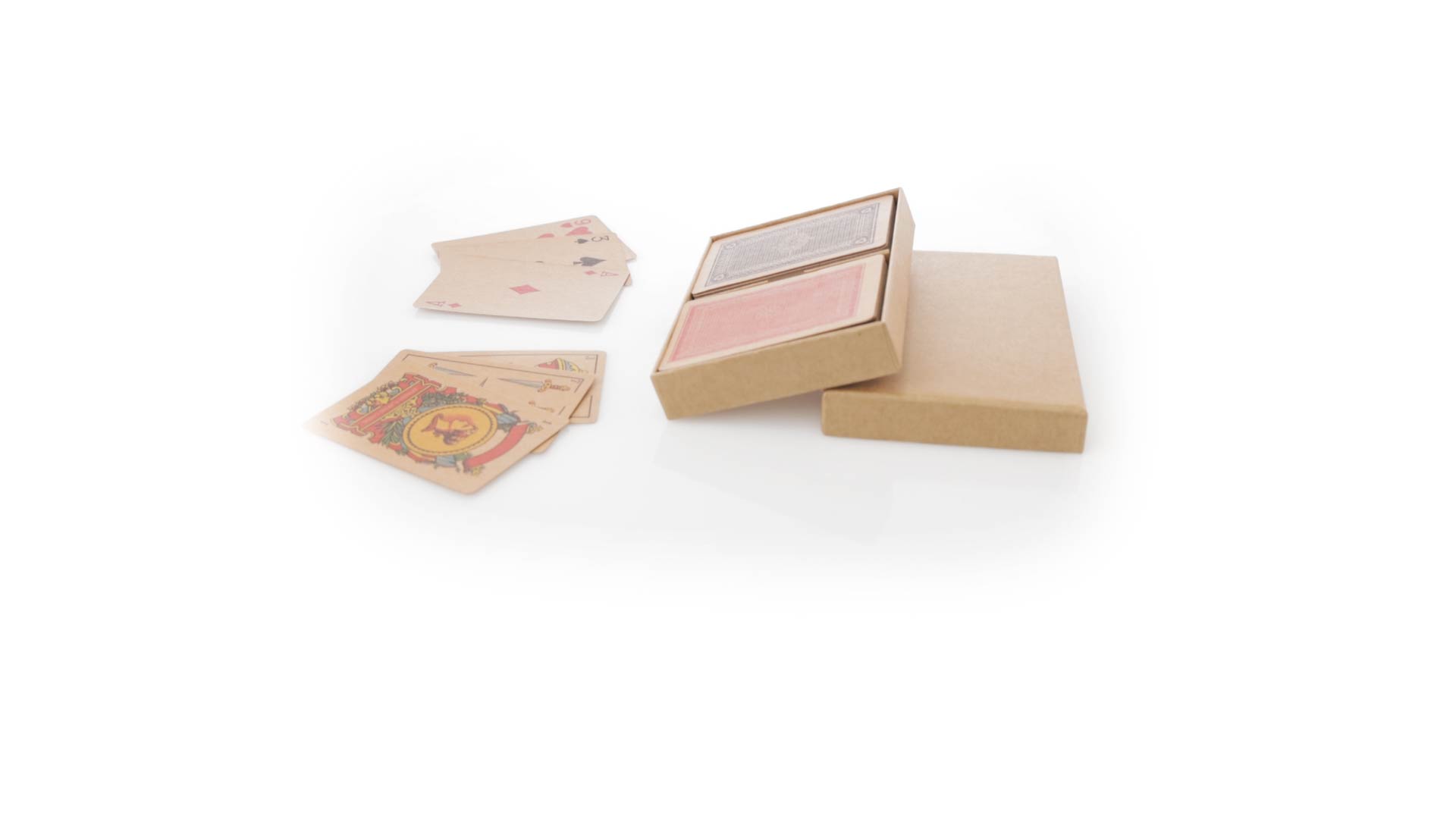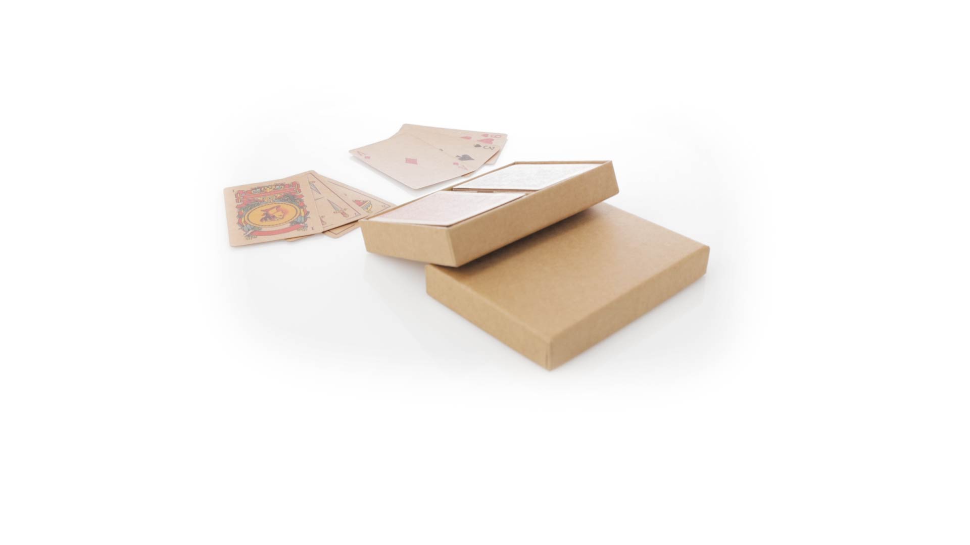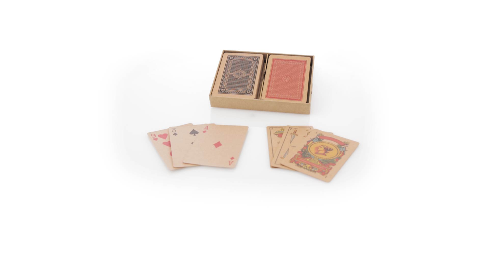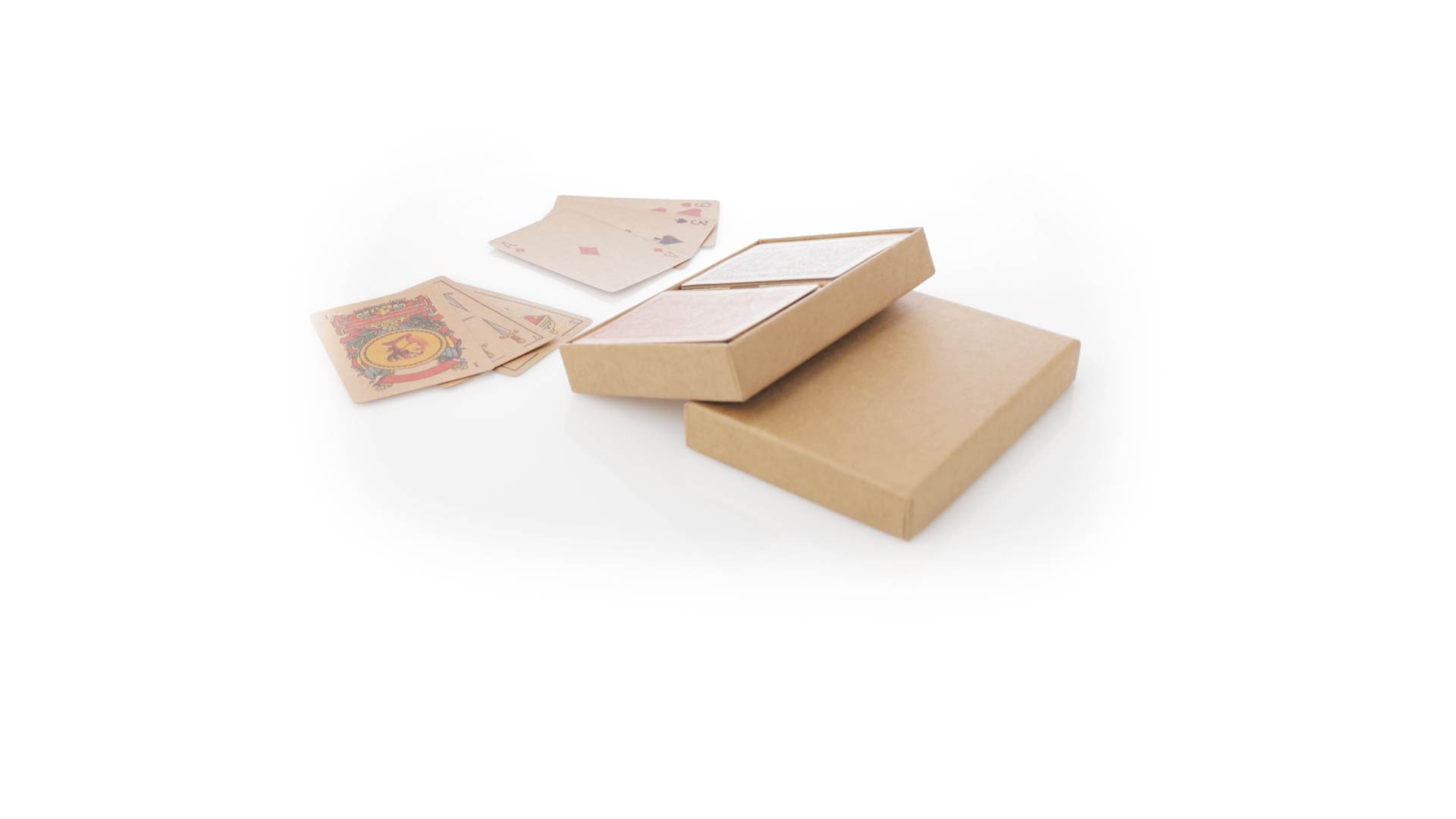 Set spanischer und französischer Spielkarten aus widerstandsfähigem Recyclingkarton. Spanisches Kartenspiel mit 50 Karten und französisches Kartenspiel mit 54 Karten, präsentiert in einer Kraftkartonschachtel mit Deckel.