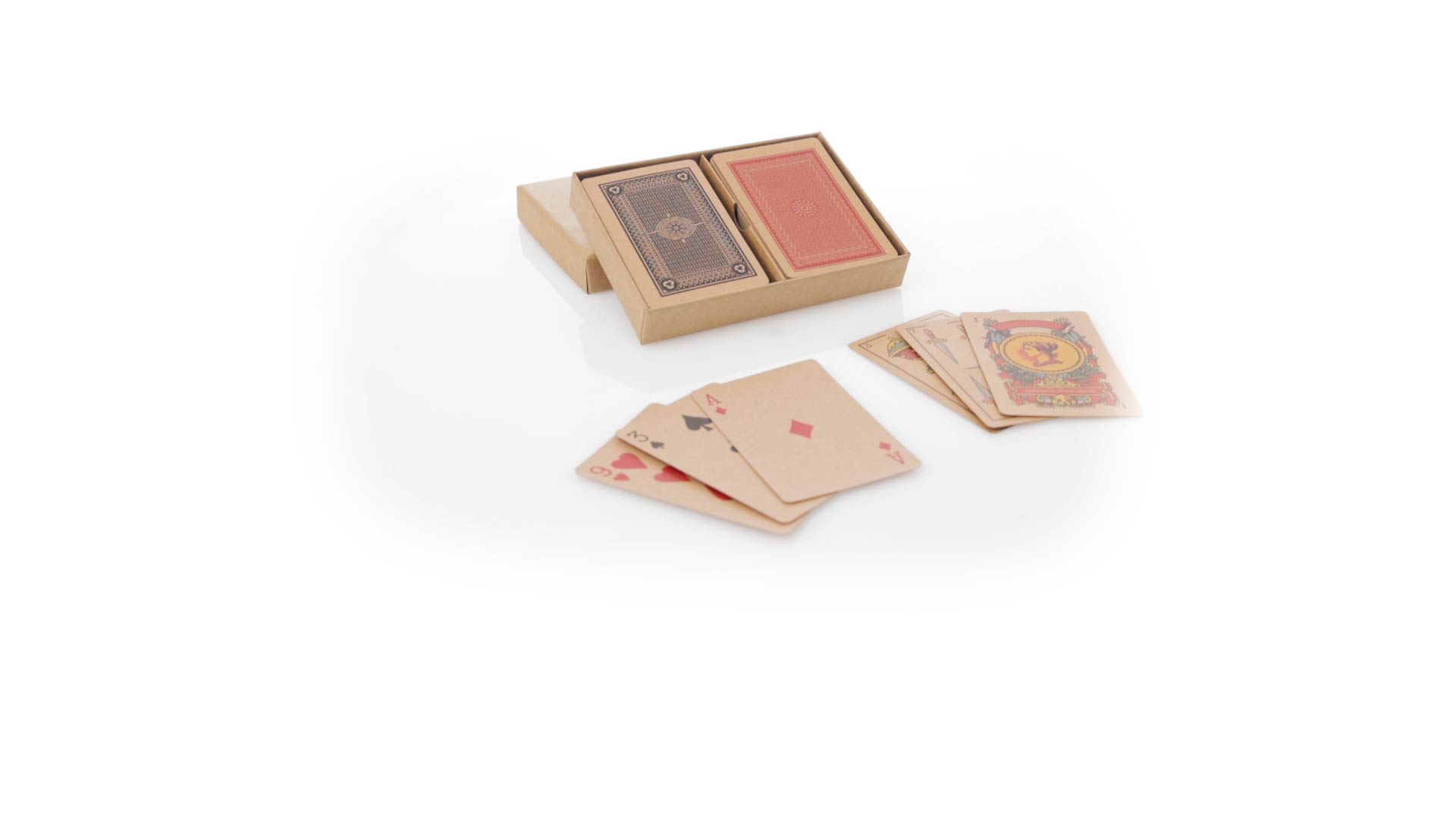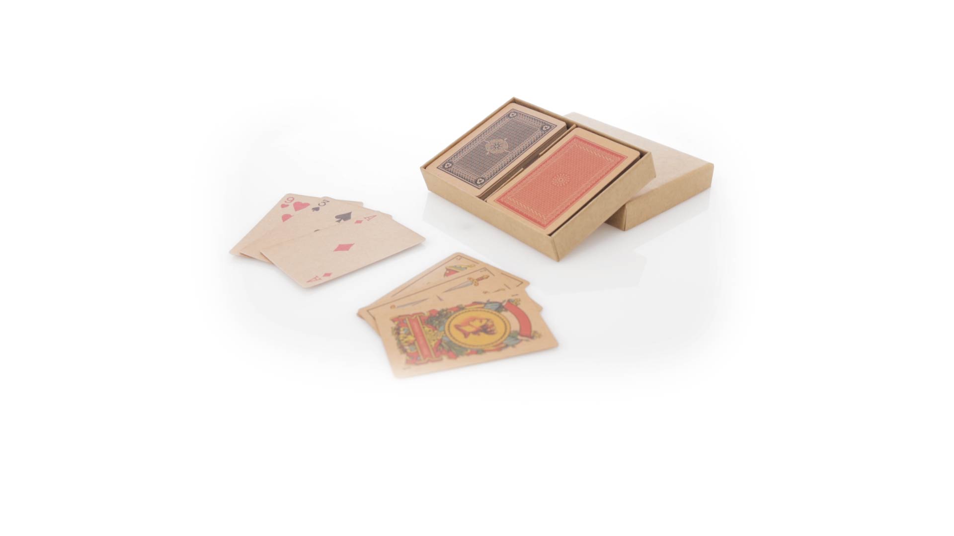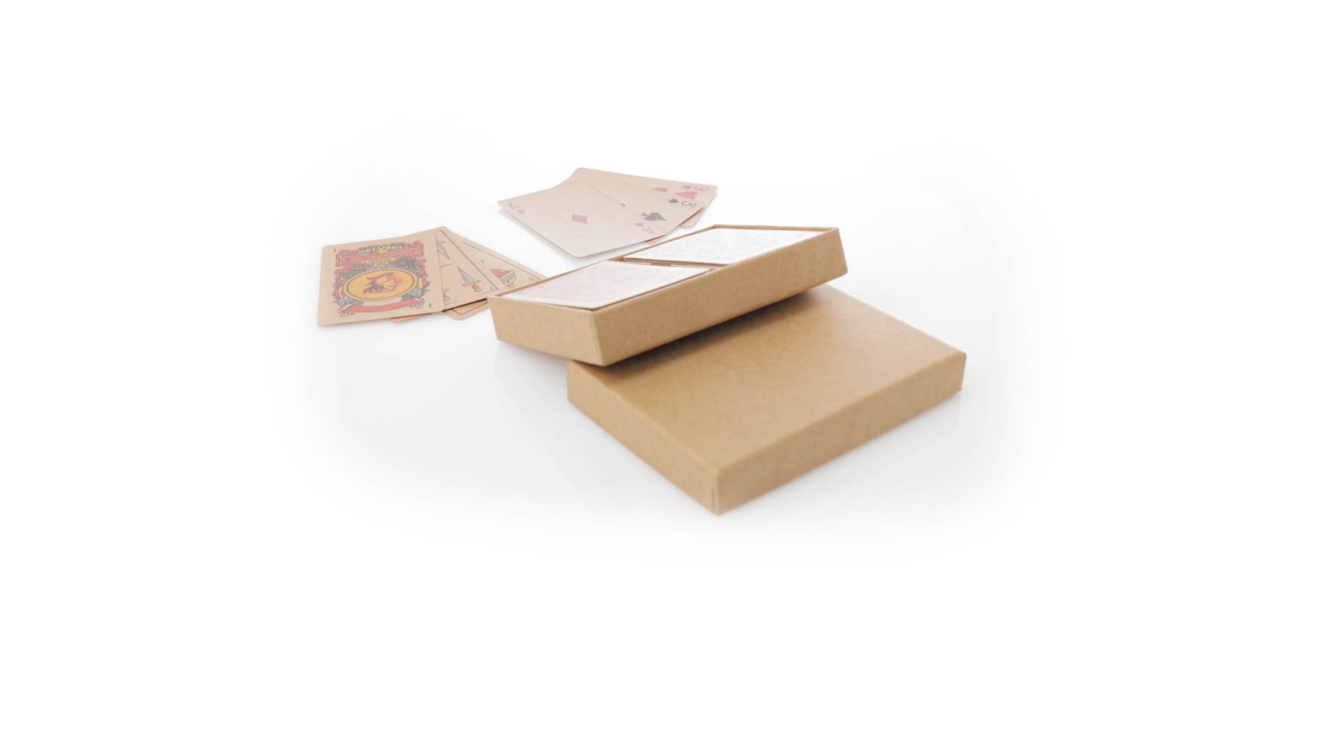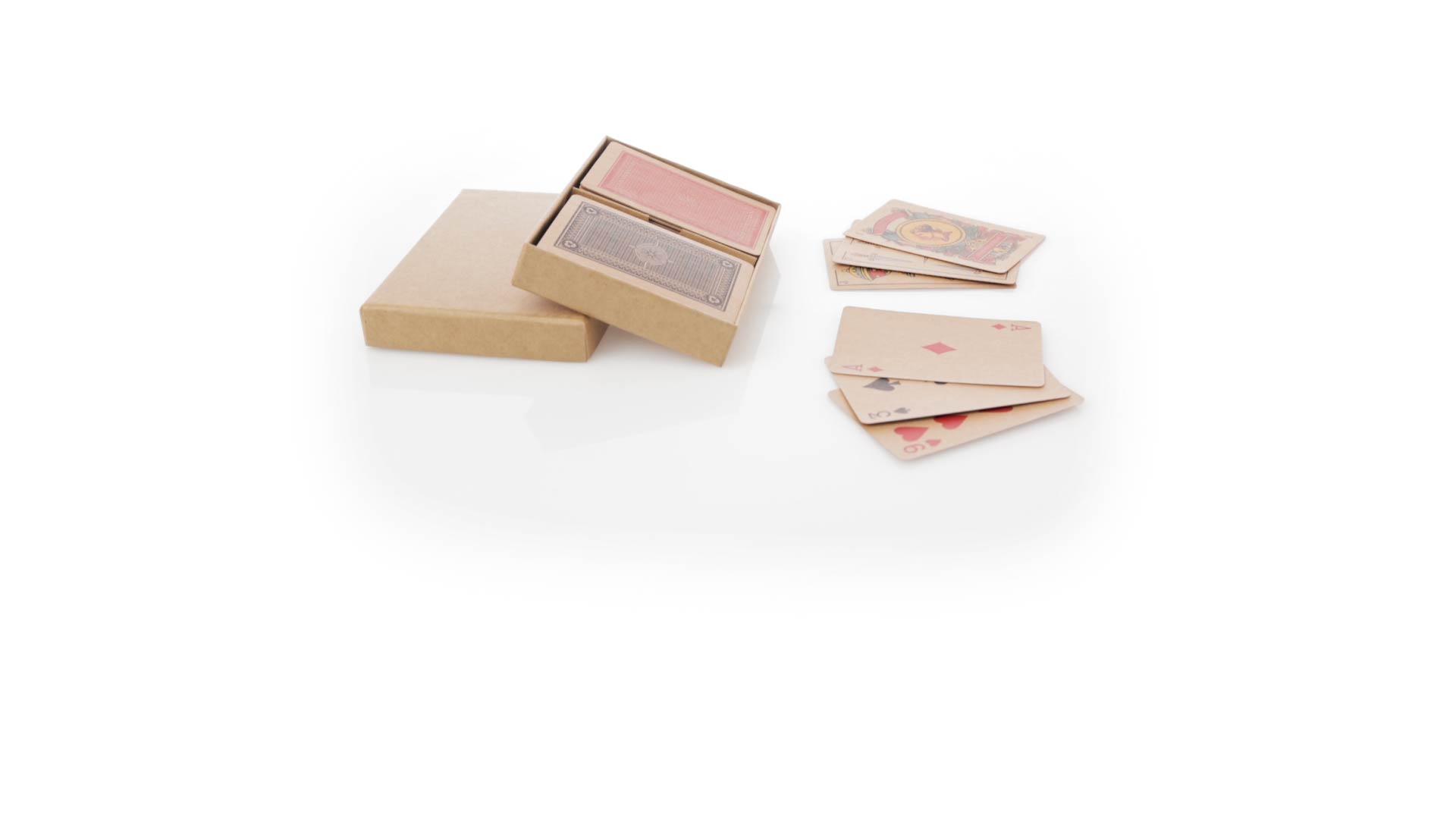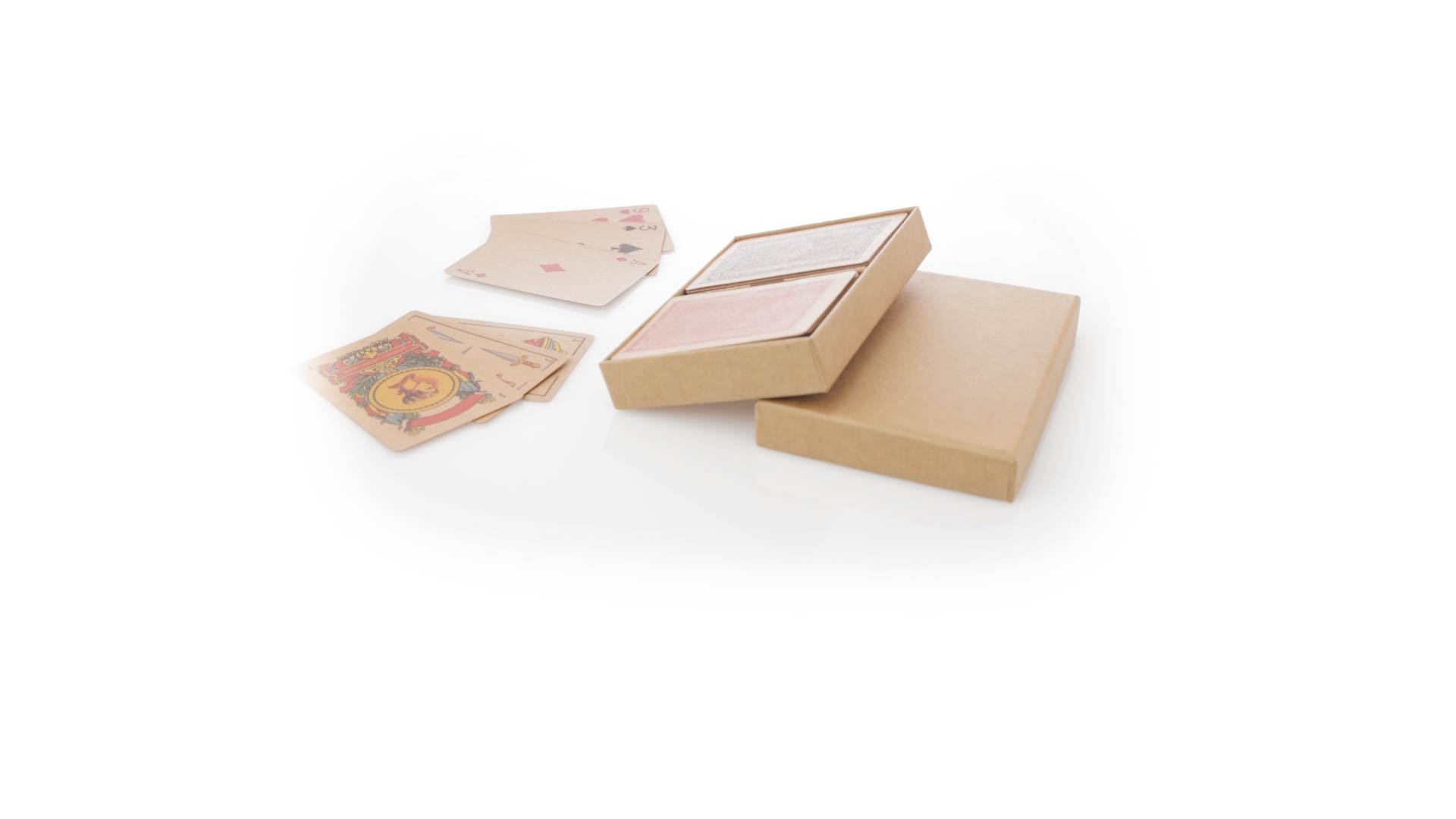 Set spanischer und französischer Spielkarten aus widerstandsfähigem Recyclingkarton. Spanisches Kartenspiel mit 50 Karten und französisches Kartenspiel mit 54 Karten, präsentiert in einer Kraftkartonschachtel mit Deckel.