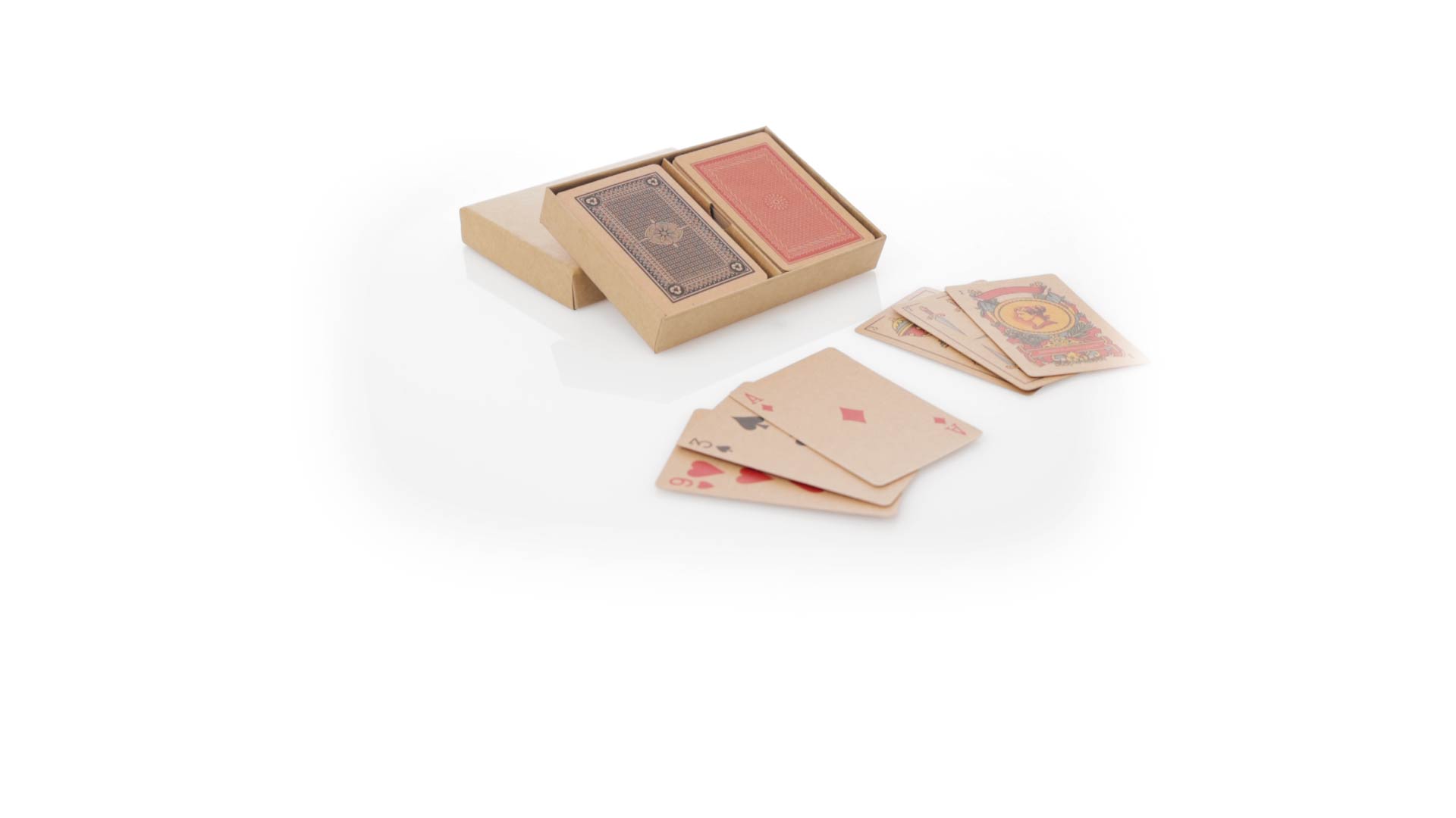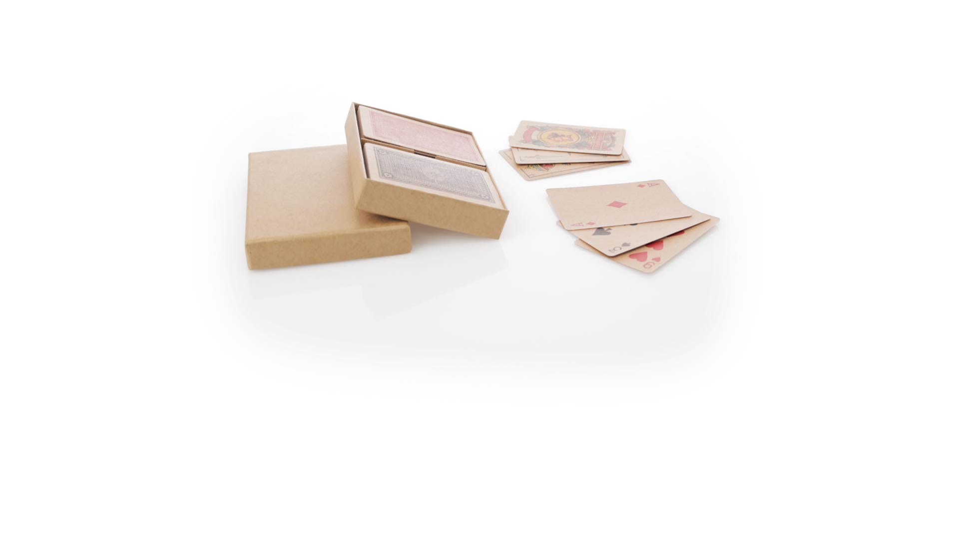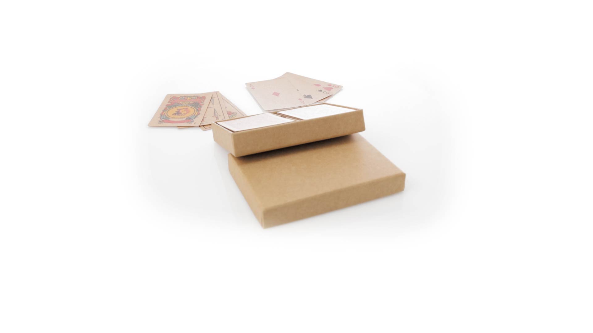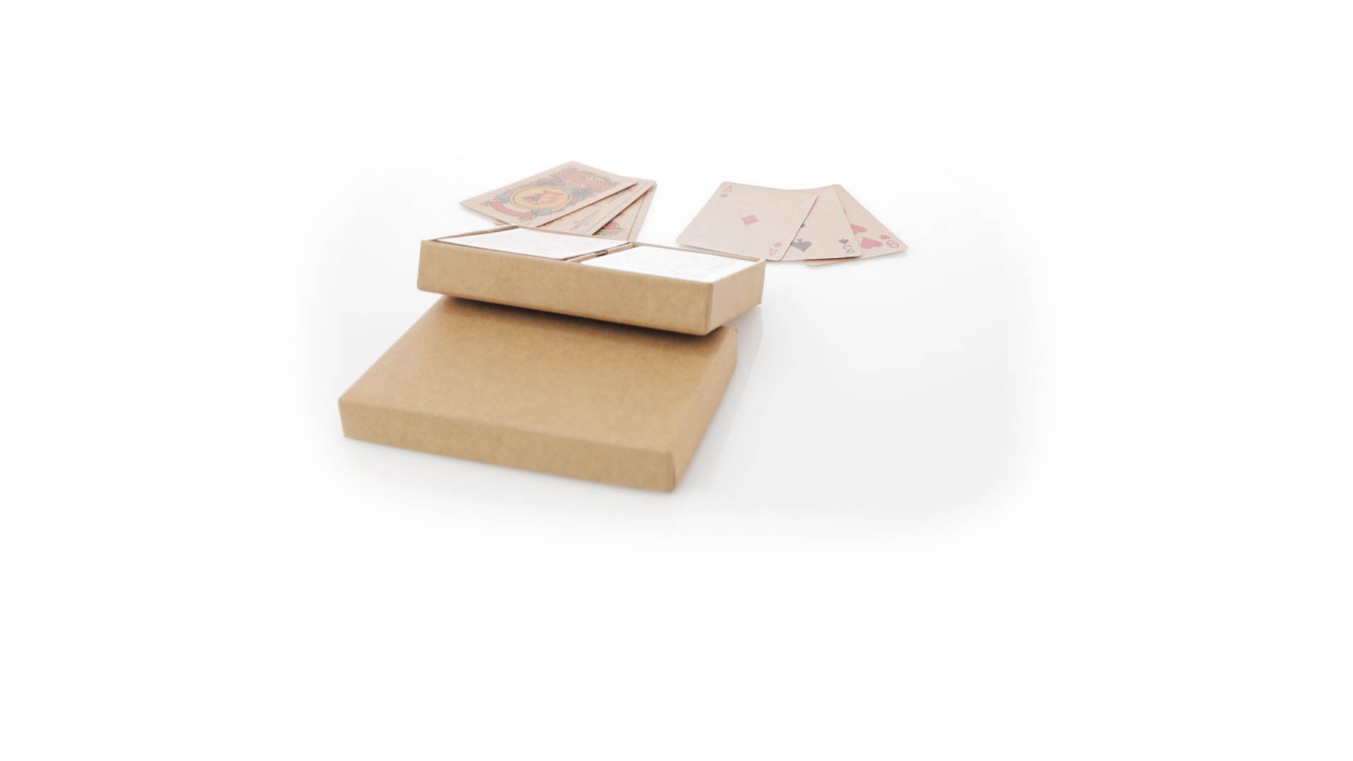 Set spanischer und französischer Spielkarten aus widerstandsfähigem Recyclingkarton. Spanisches Kartenspiel mit 50 Karten und französisches Kartenspiel mit 54 Karten, präsentiert in einer Kraftkartonschachtel mit Deckel.