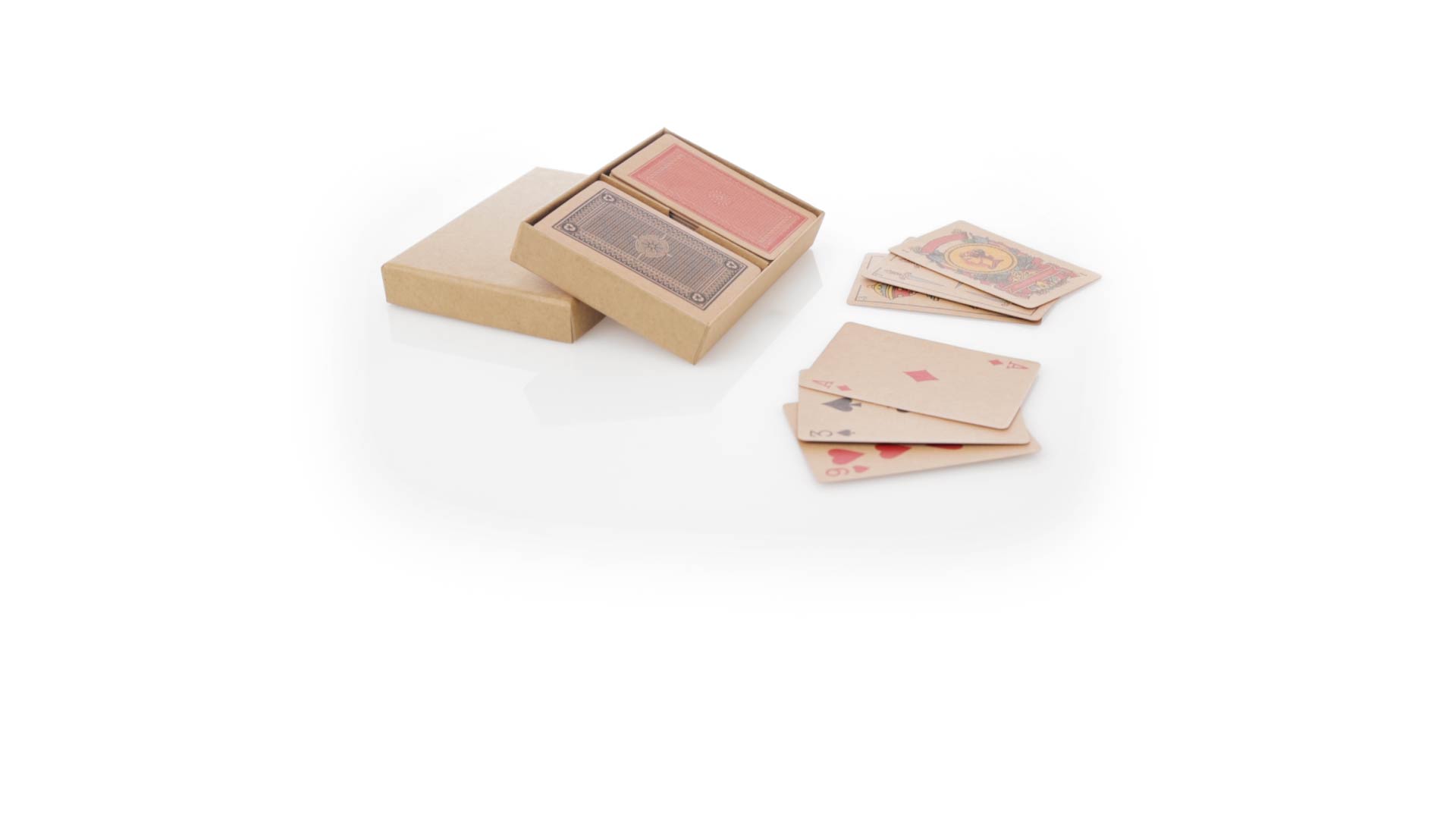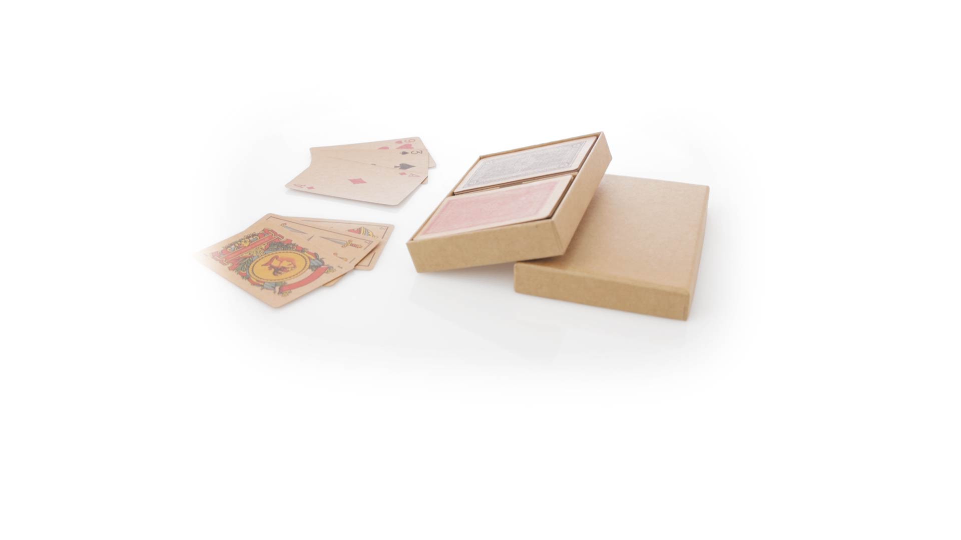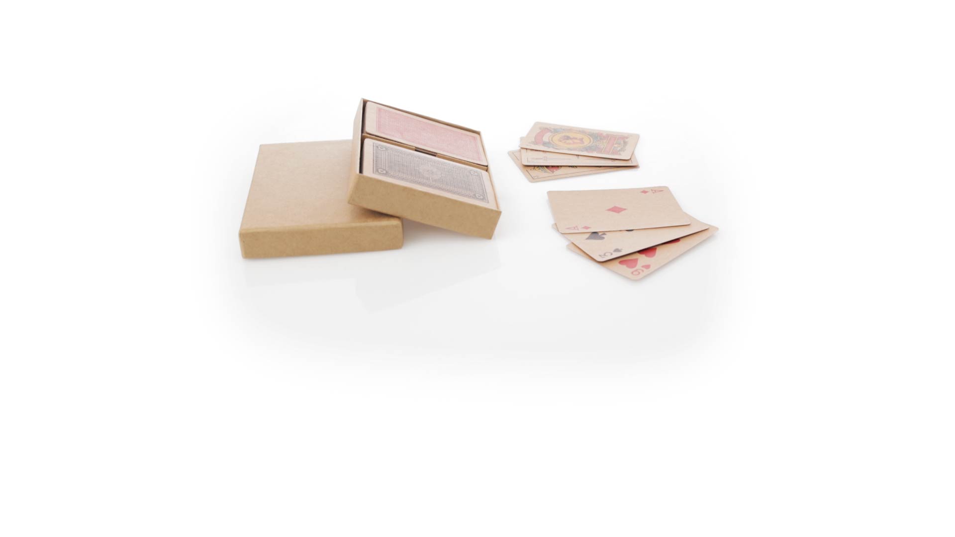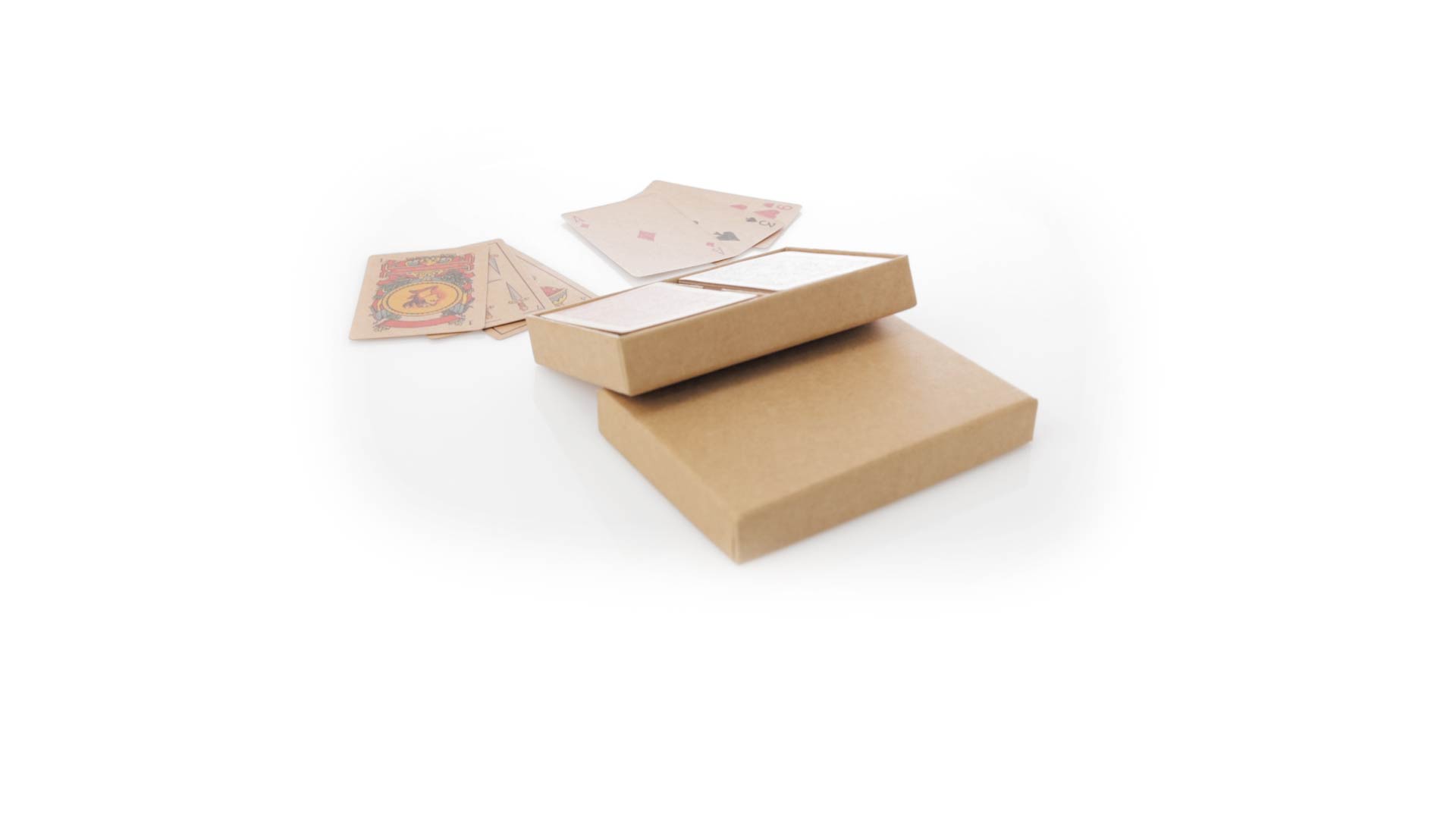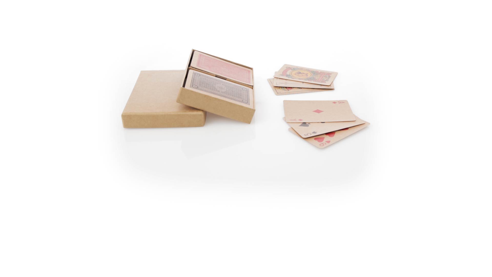 Set spanischer und französischer Spielkarten aus widerstandsfähigem Recyclingkarton. Spanisches Kartenspiel mit 50 Karten und französisches Kartenspiel mit 54 Karten, präsentiert in einer Kraftkartonschachtel mit Deckel.