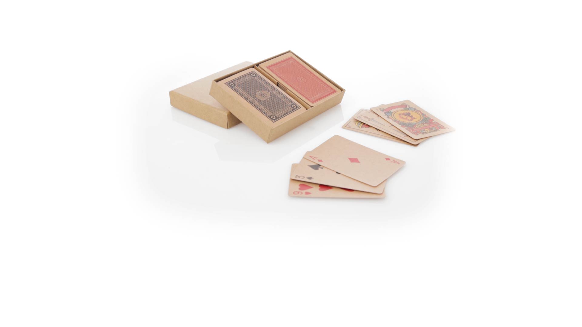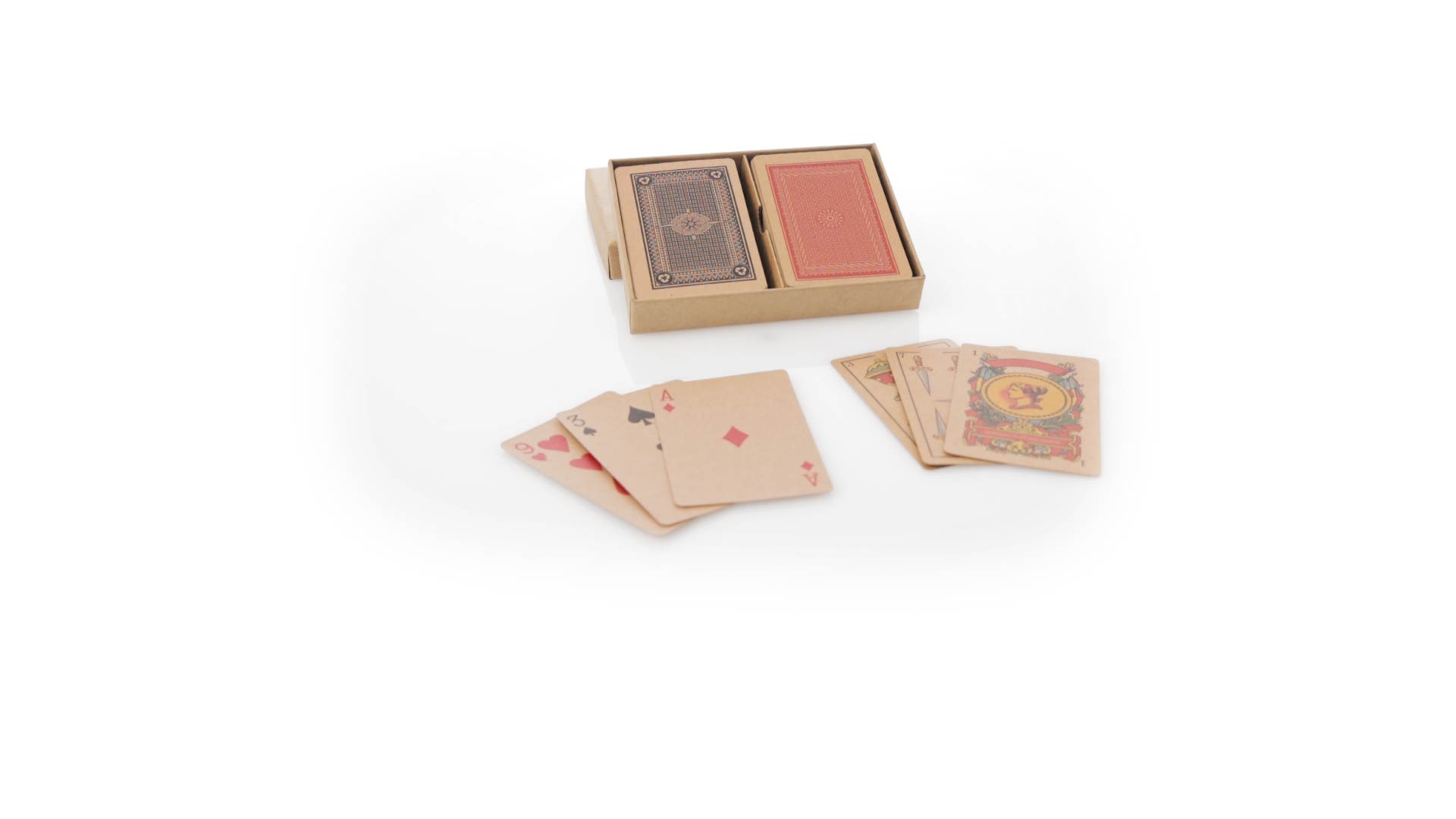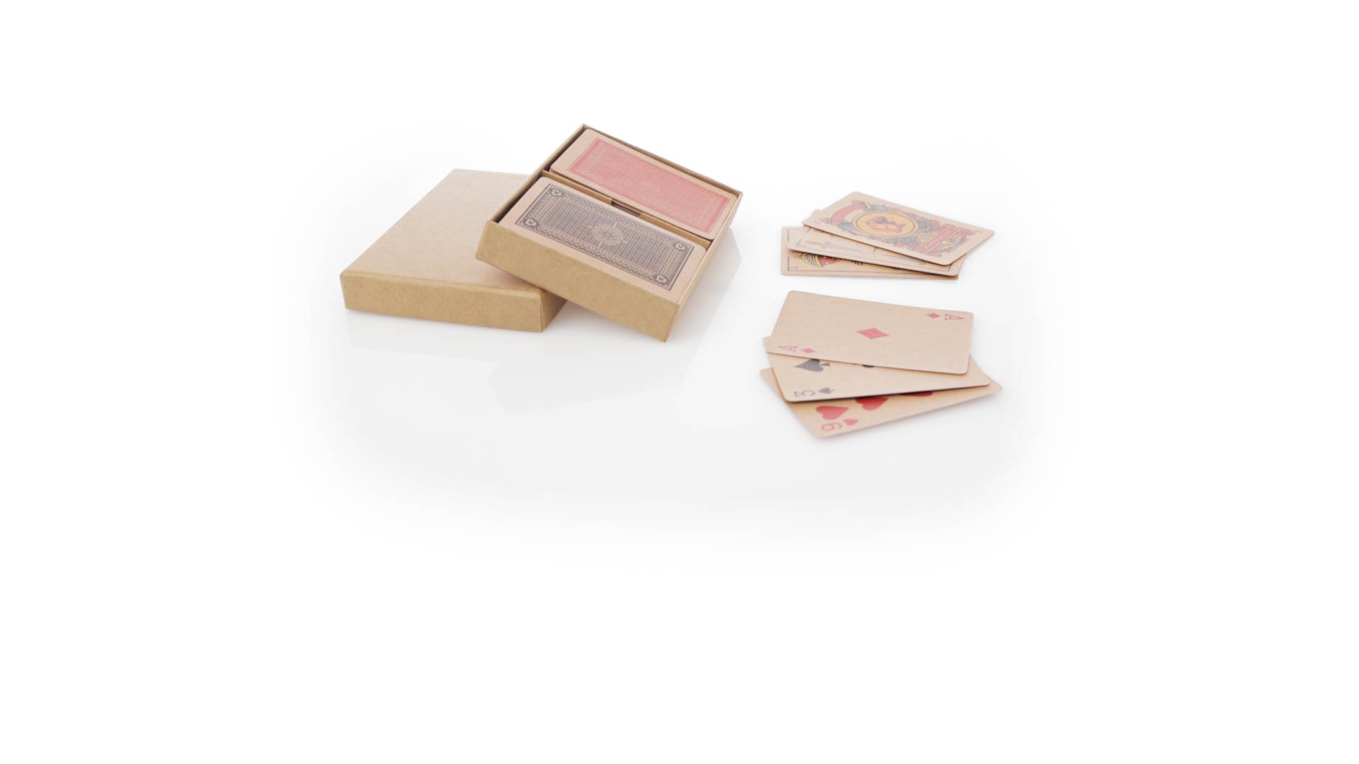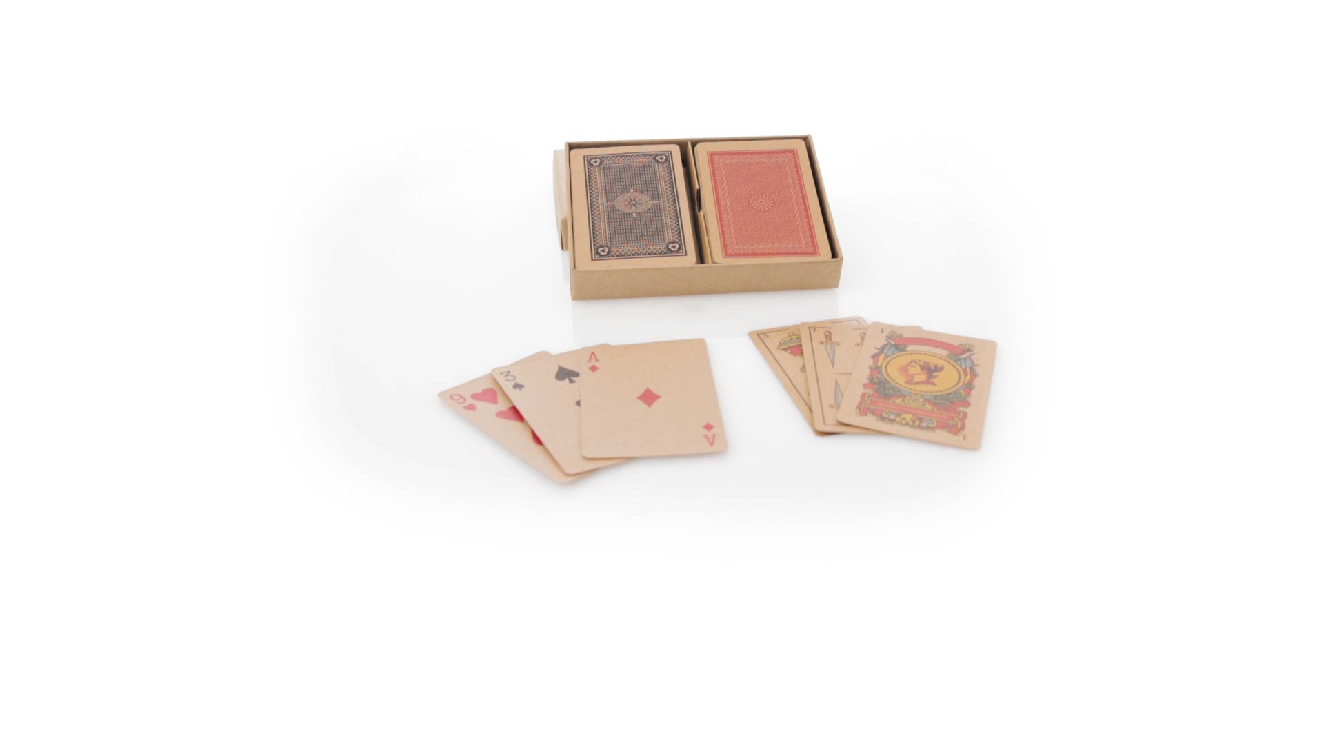 Set spanischer und französischer Spielkarten aus widerstandsfähigem Recyclingkarton. Spanisches Kartenspiel mit 50 Karten und französisches Kartenspiel mit 54 Karten, präsentiert in einer Kraftkartonschachtel mit Deckel.