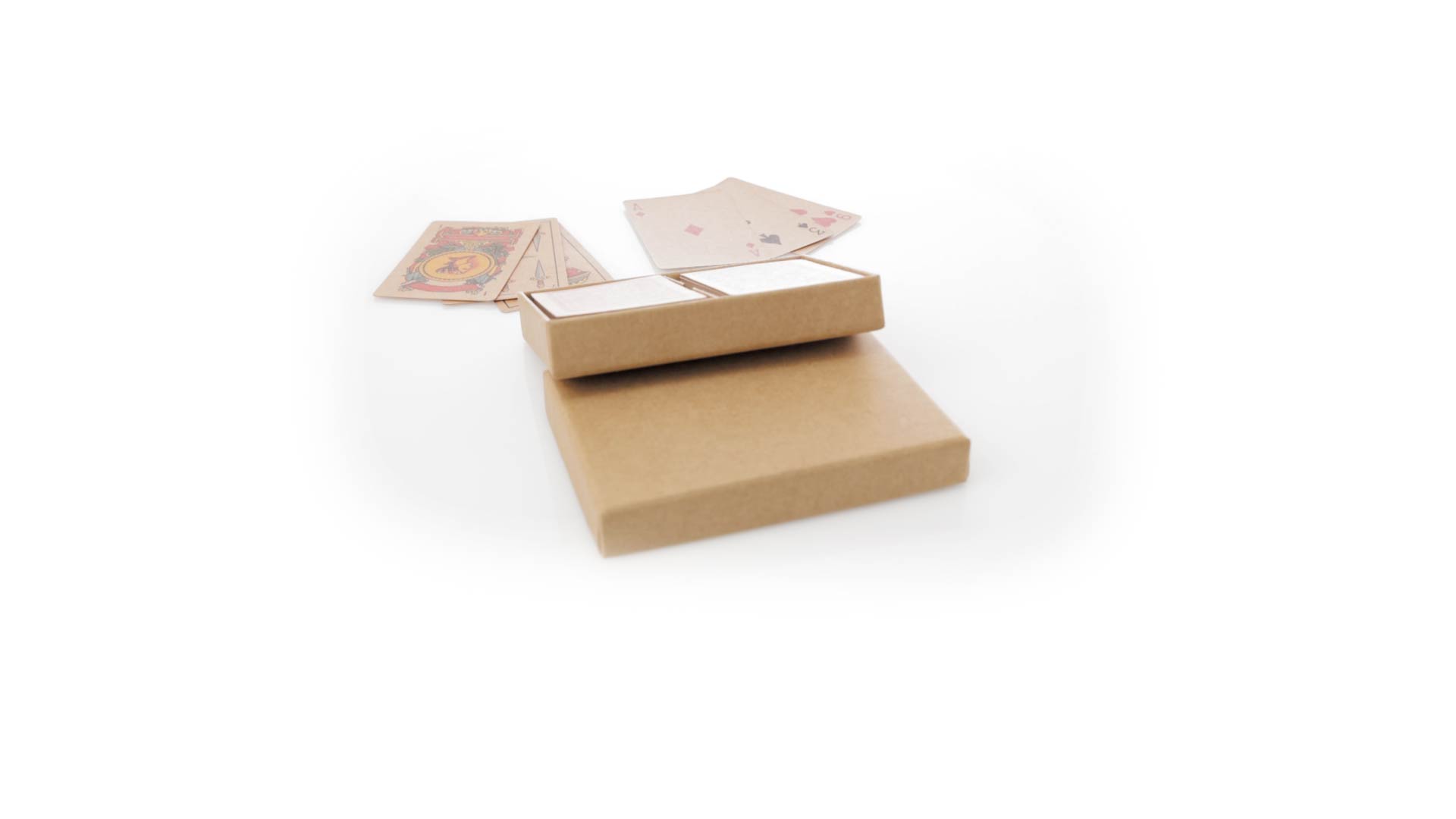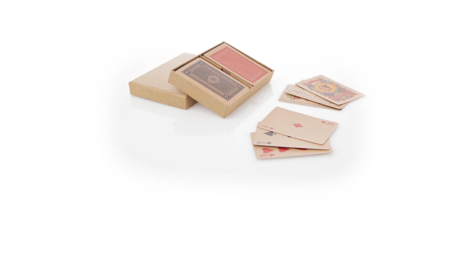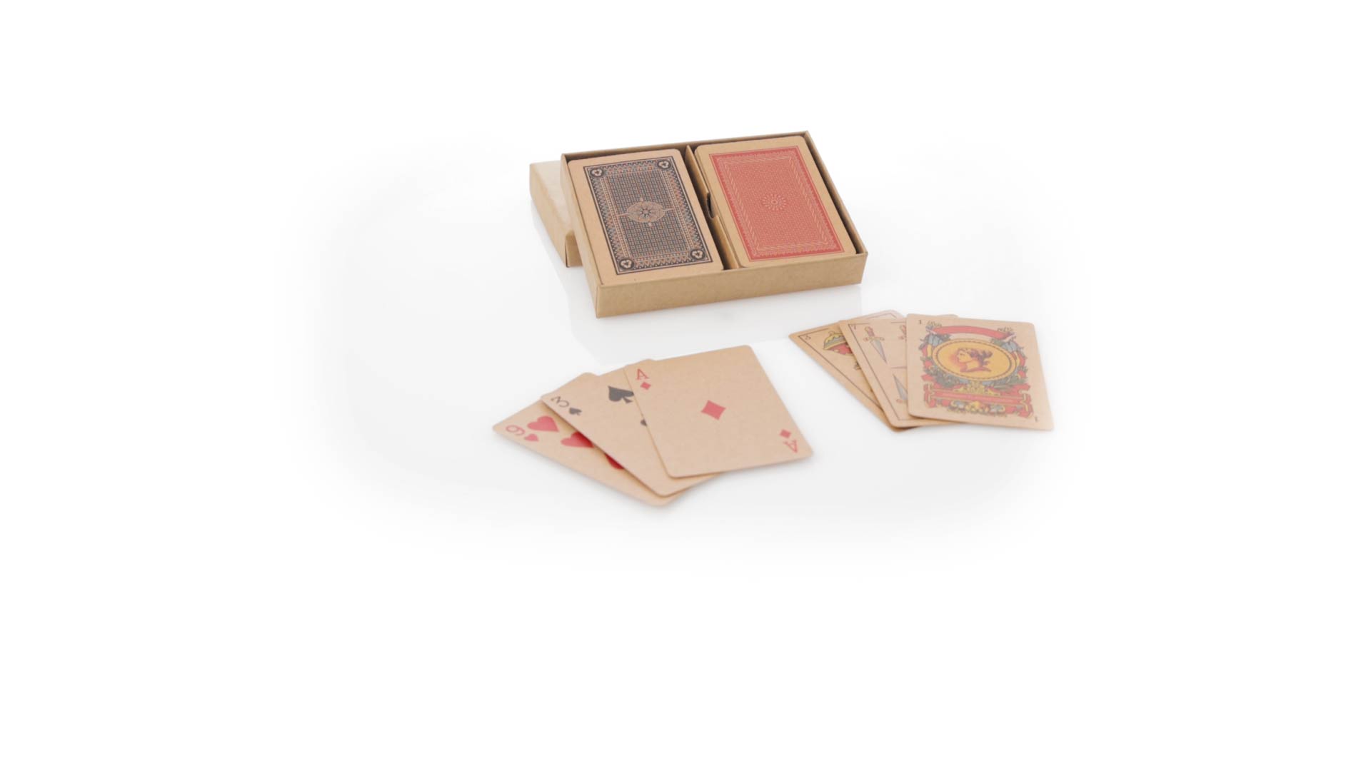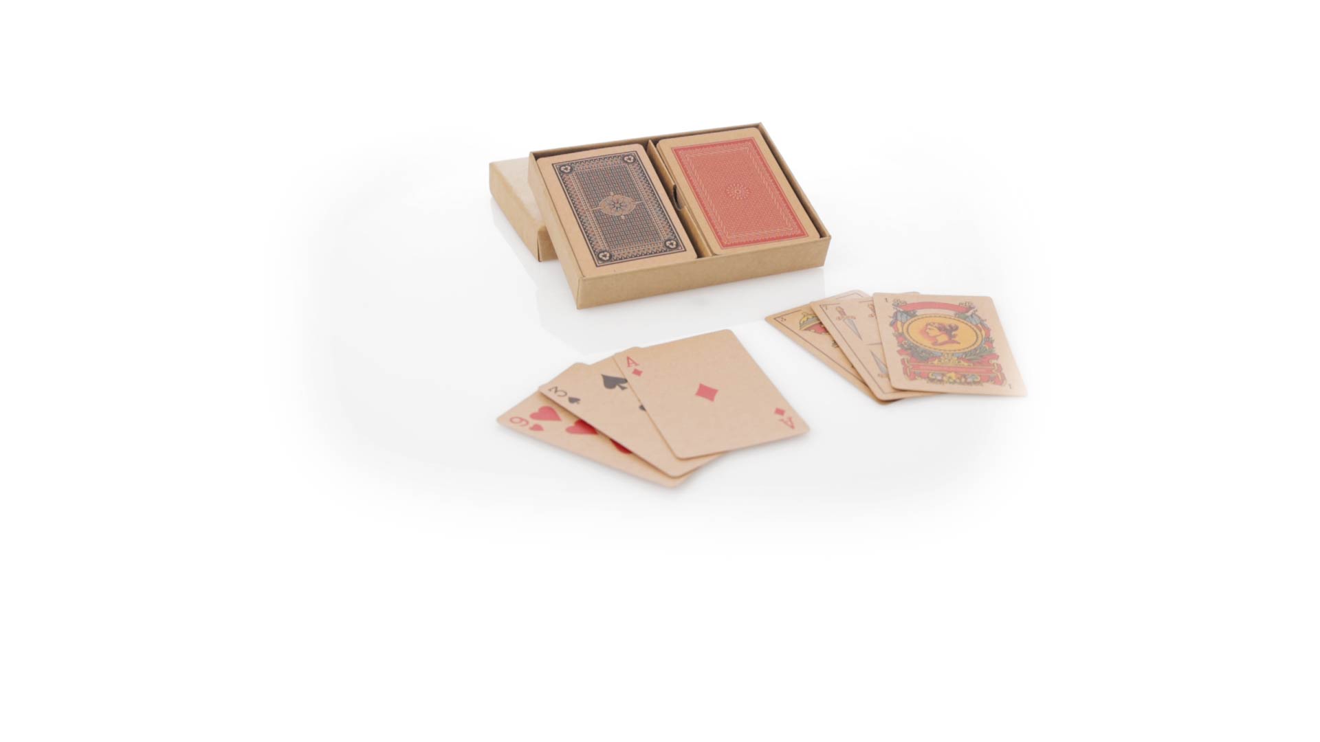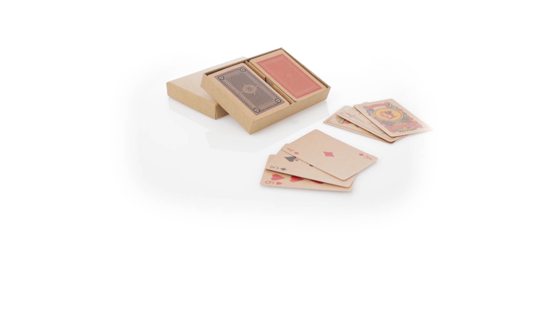 Set spanischer und französischer Spielkarten aus widerstandsfähigem Recyclingkarton. Spanisches Kartenspiel mit 50 Karten und französisches Kartenspiel mit 54 Karten, präsentiert in einer Kraftkartonschachtel mit Deckel.