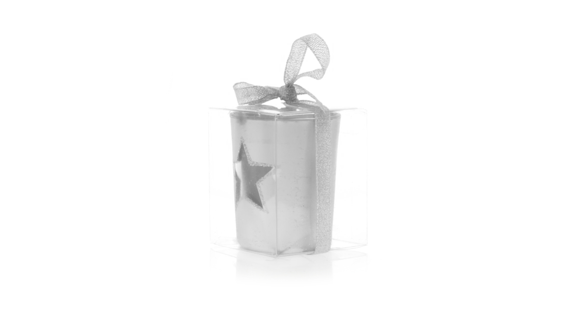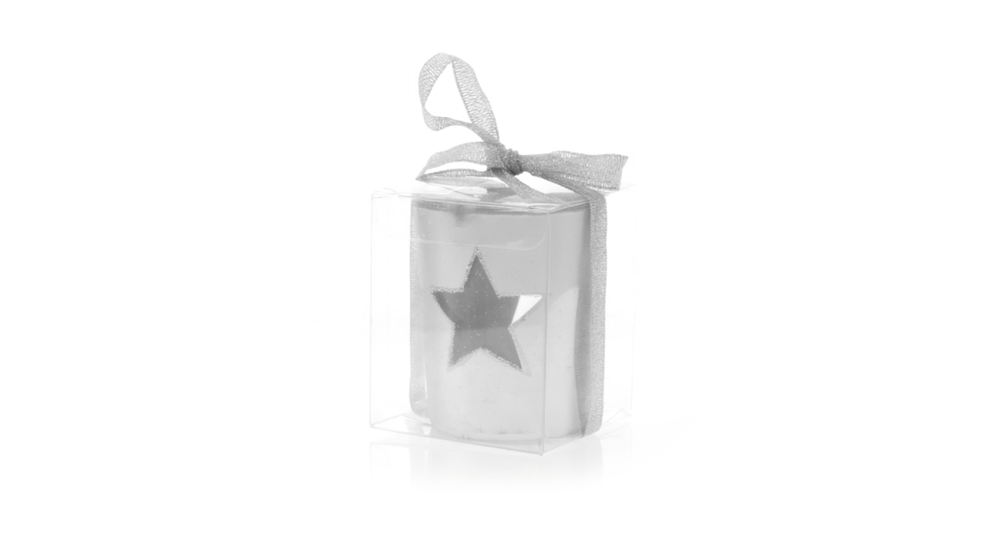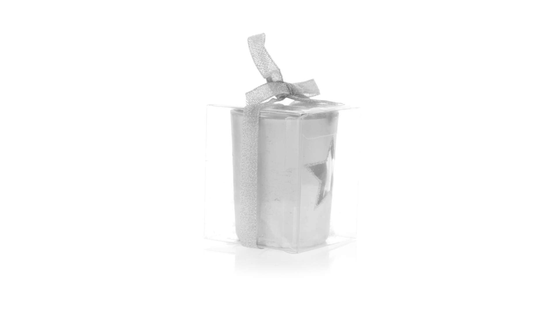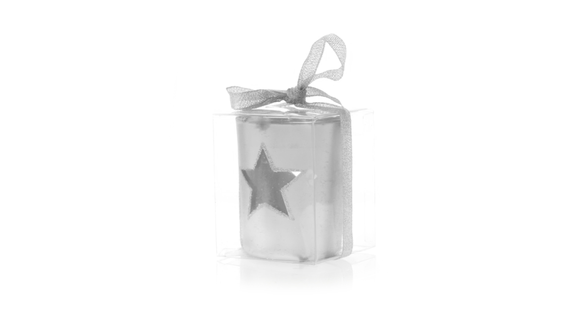 Weihnachtskerze in Kerzenglas mit Sterndesign. Präsentiert in einer individuellen PVC-Schachtel.