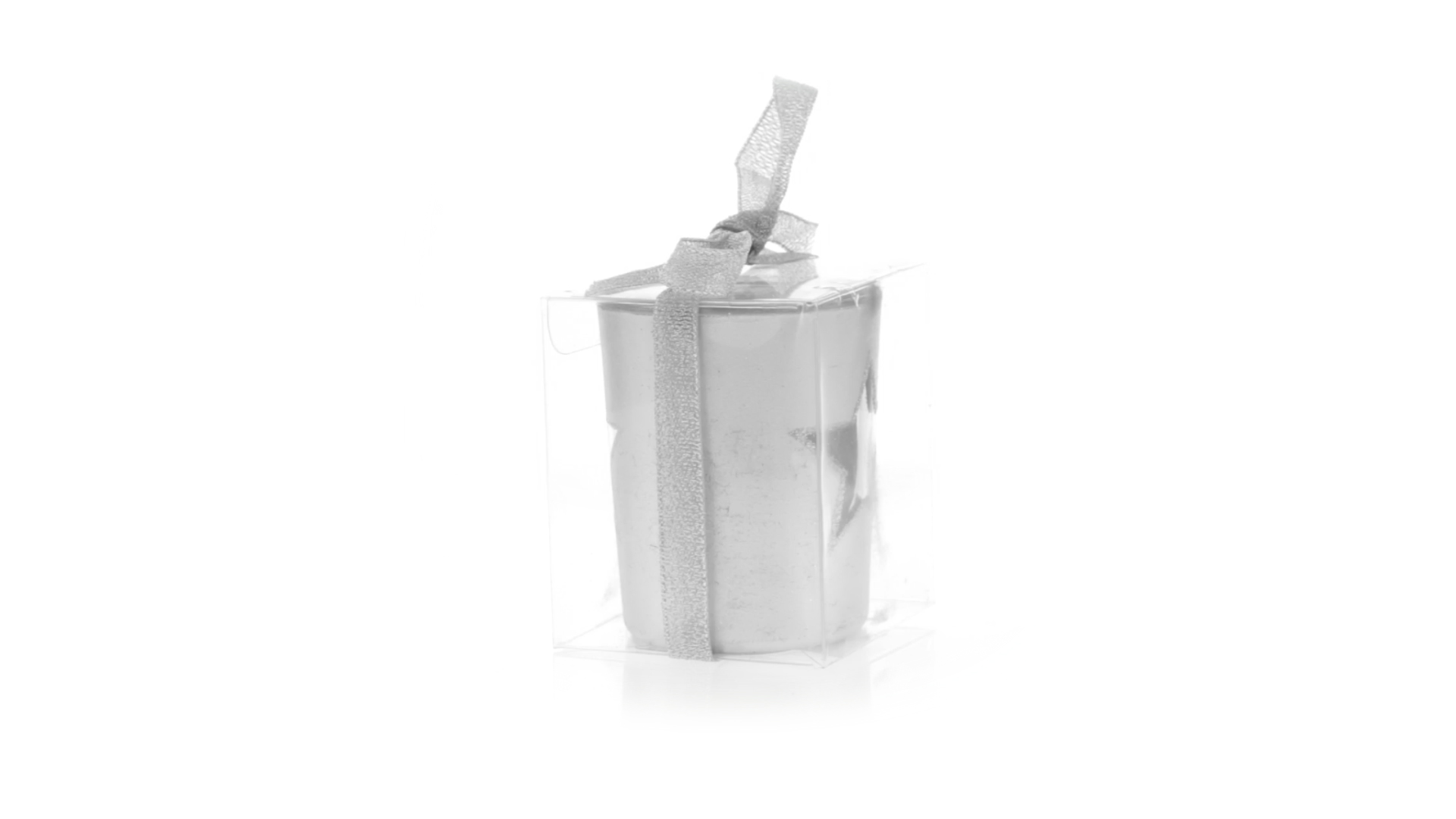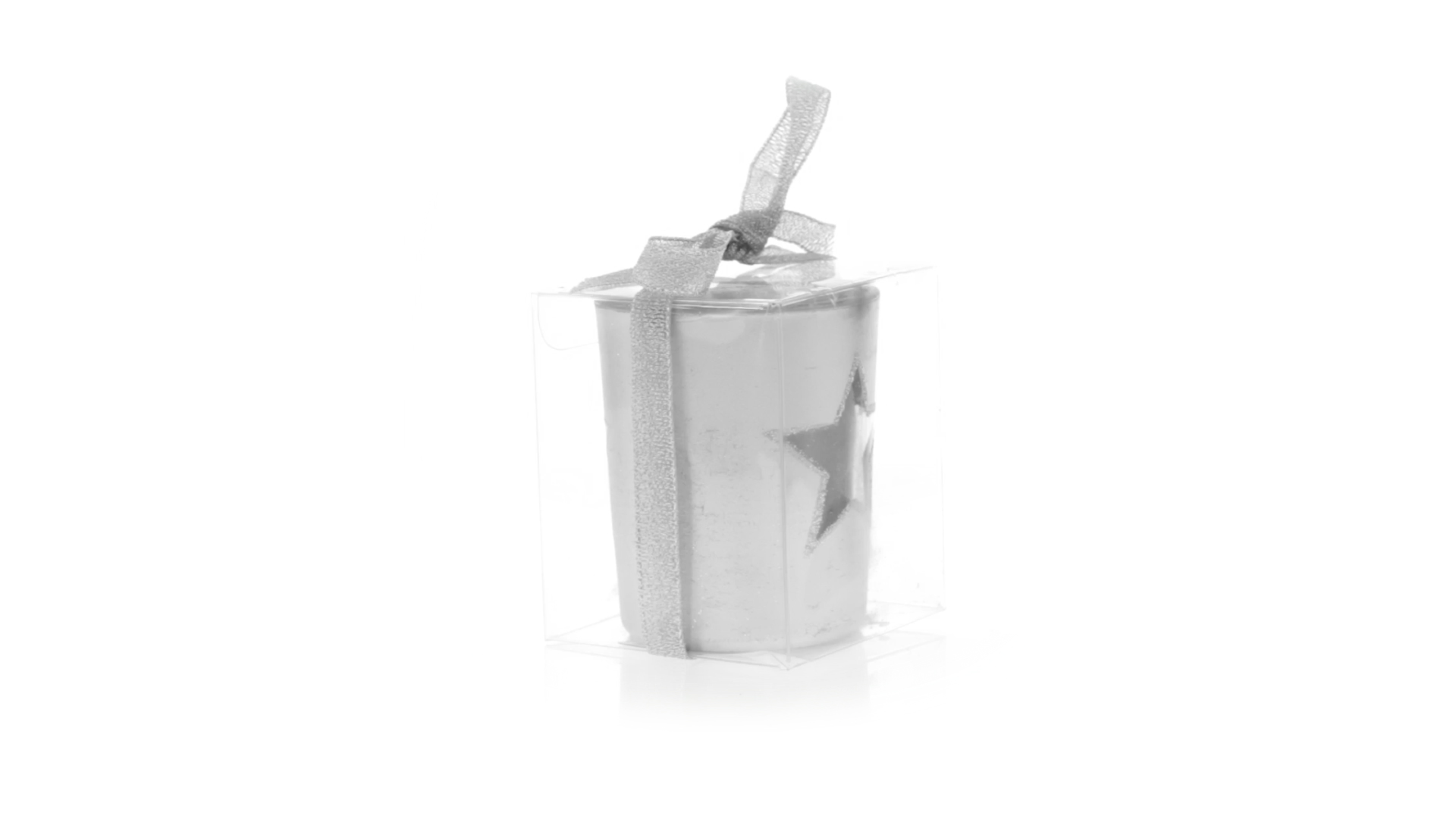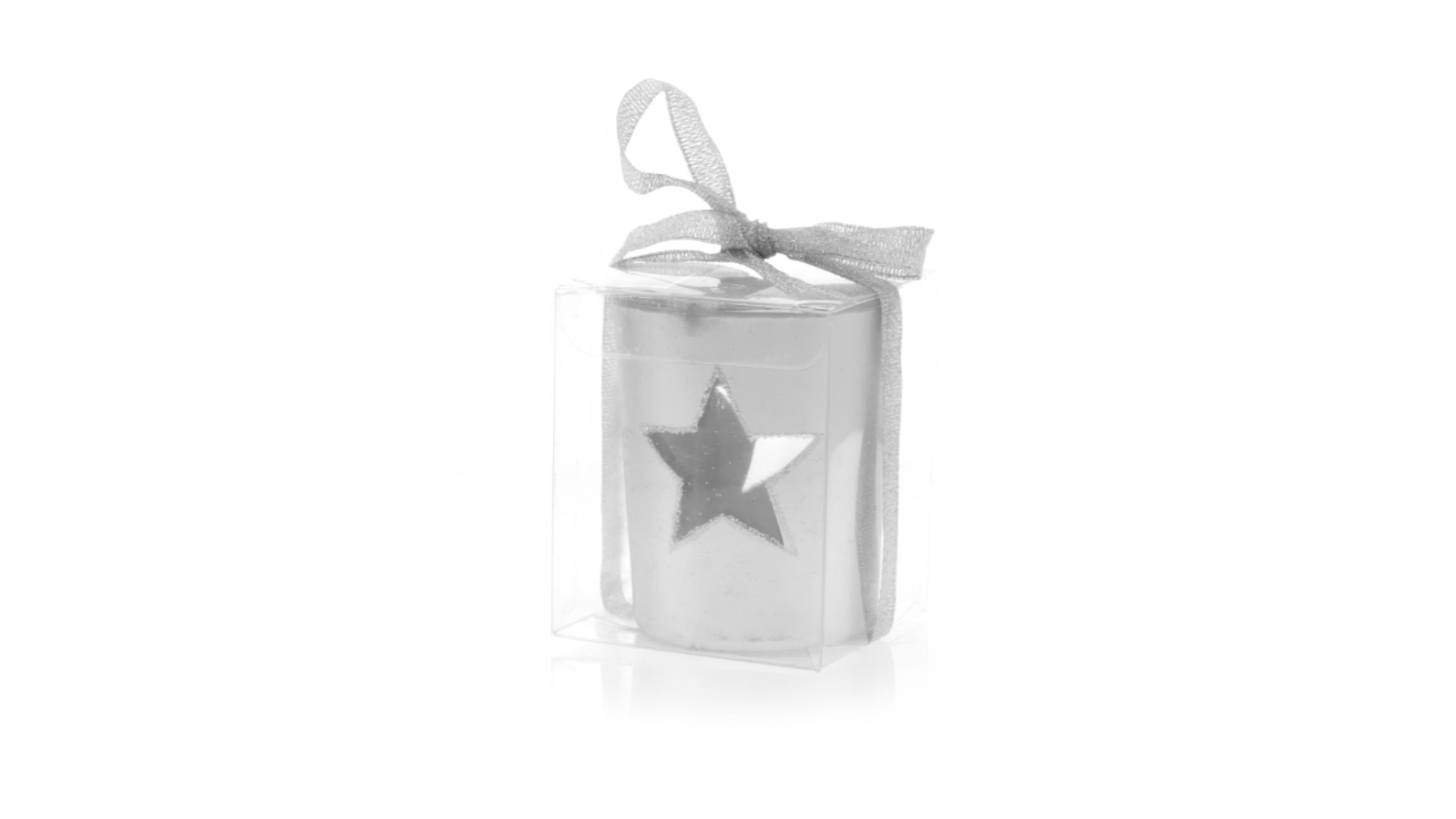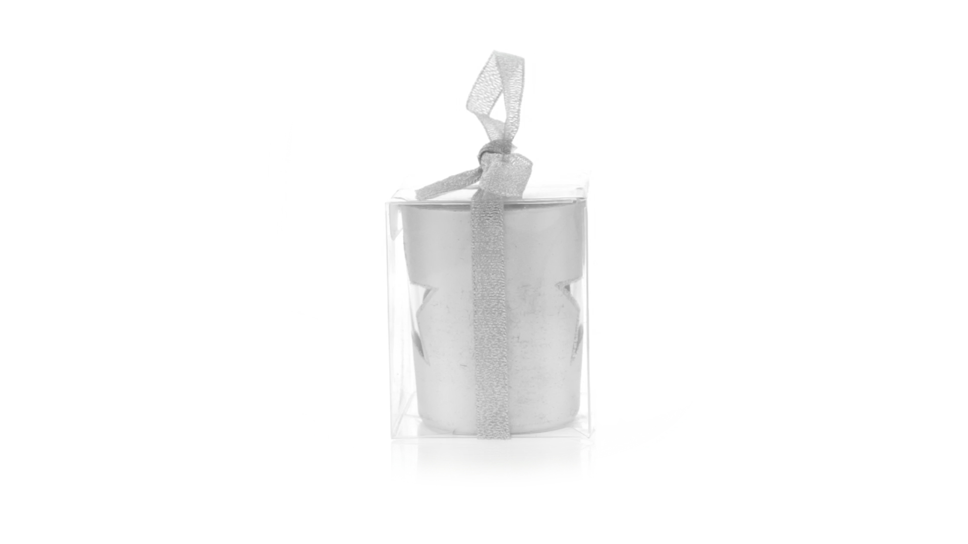 Weihnachtskerze in Kerzenglas mit Sterndesign. Präsentiert in einer individuellen PVC-Schachtel.