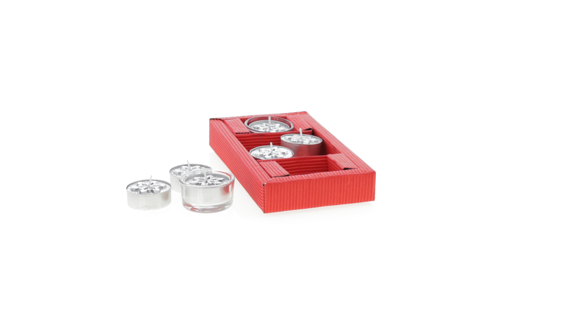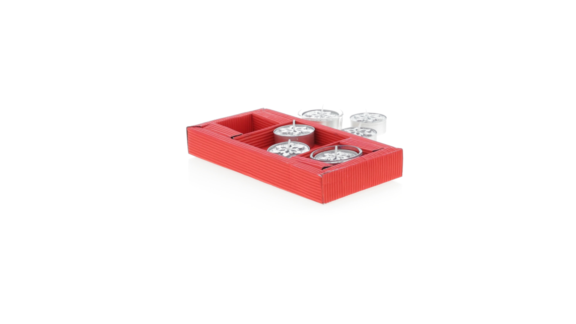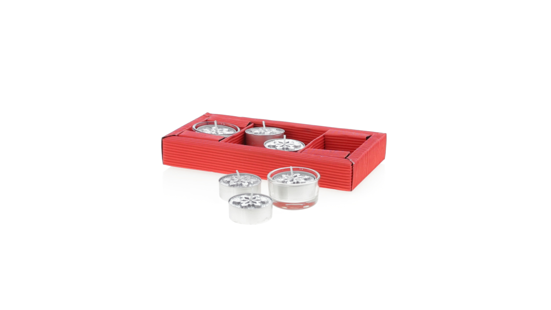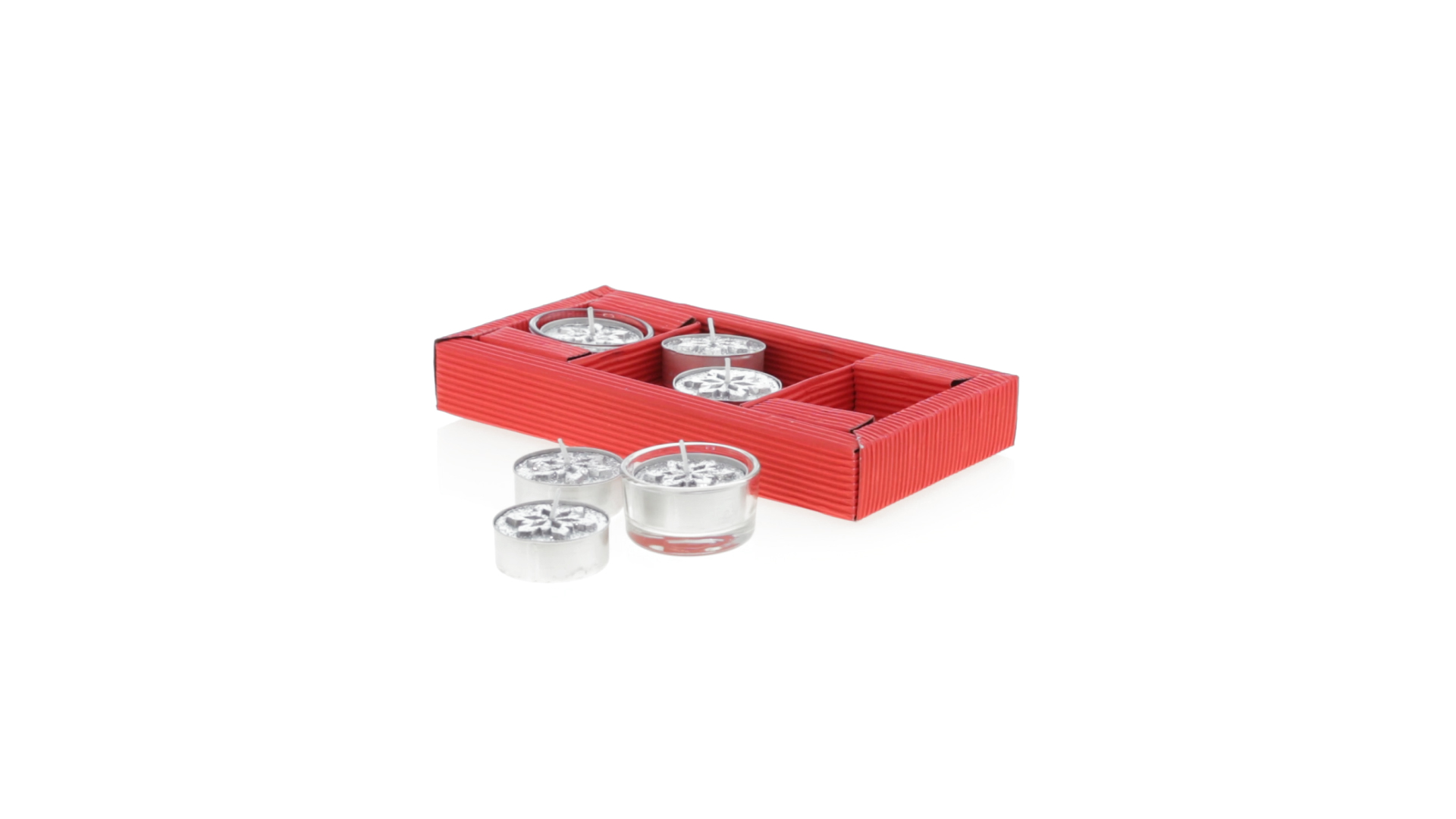 8-teiliges Kerzen-Set in einer individuellen Box in Weihnachtsrot, mit Fenster und Schleifenband. Enthält 6 Kerzen und 2 Kerzenhalter aus Glas.
