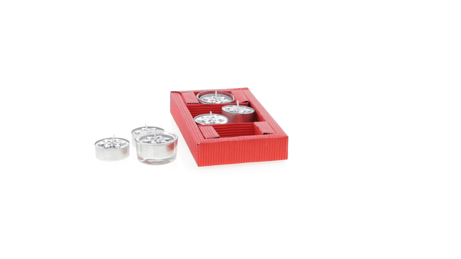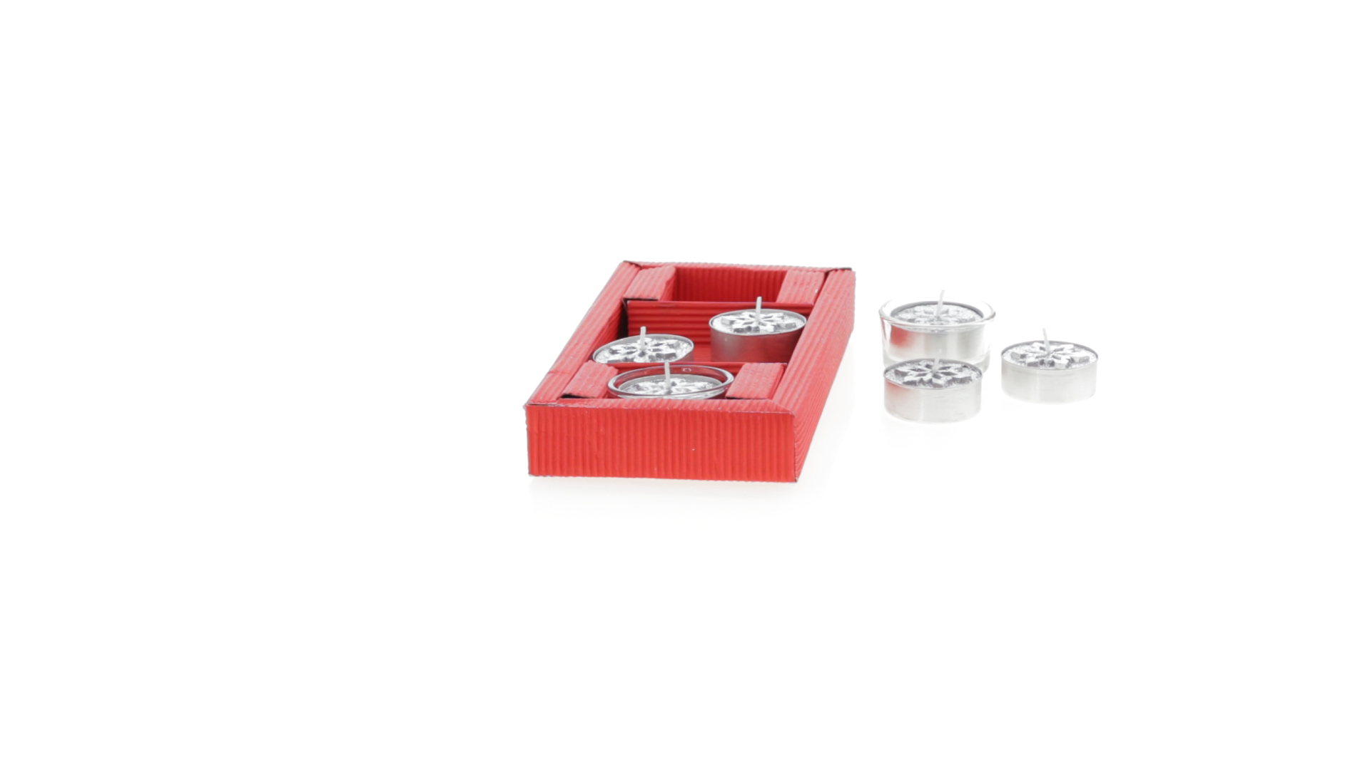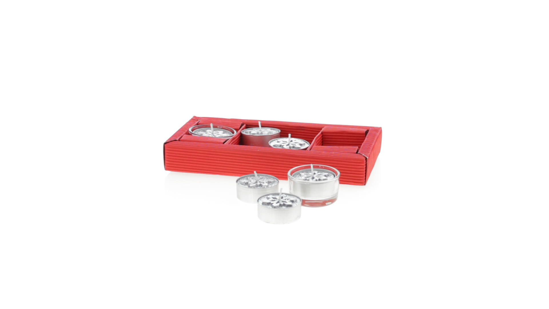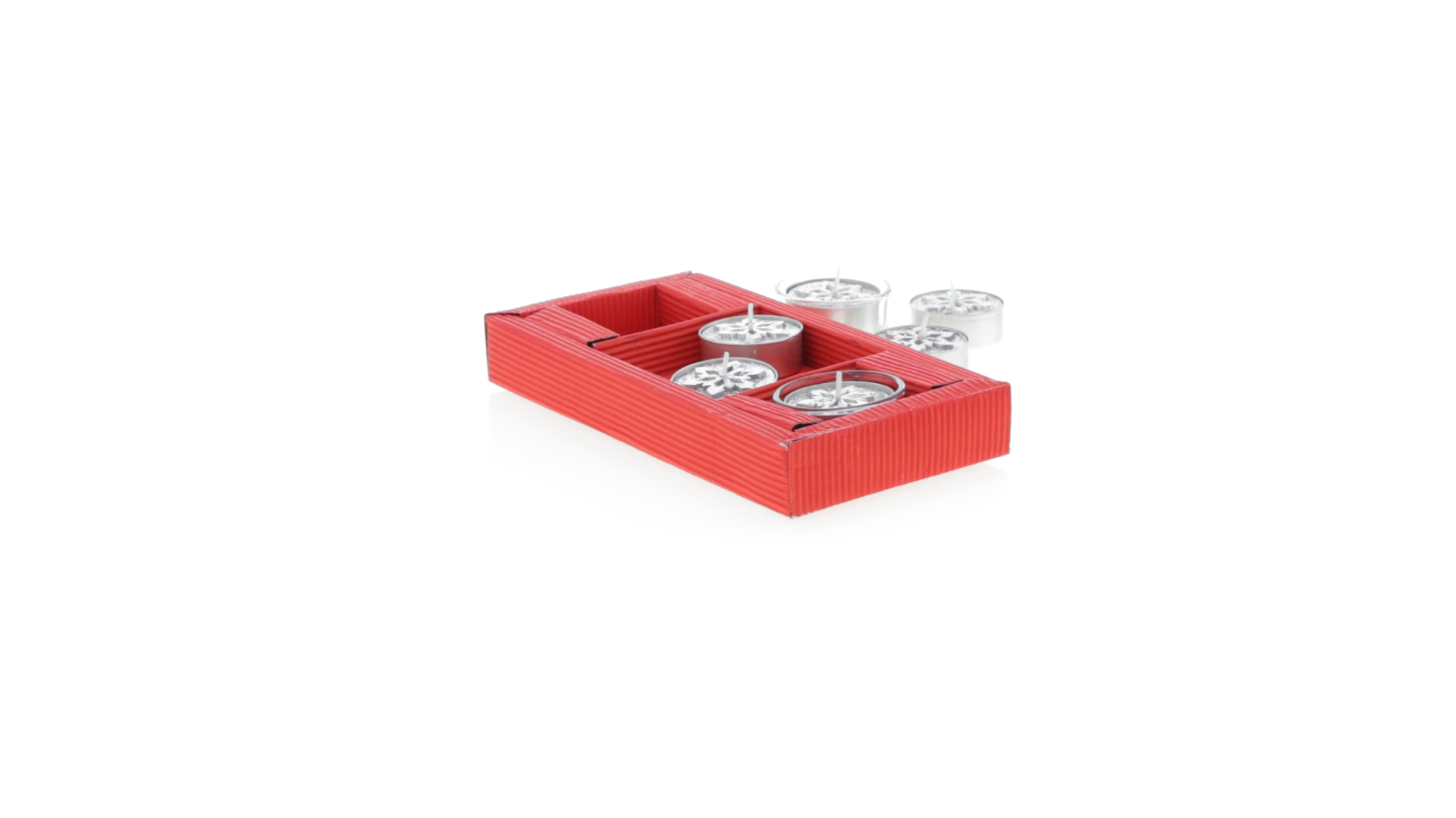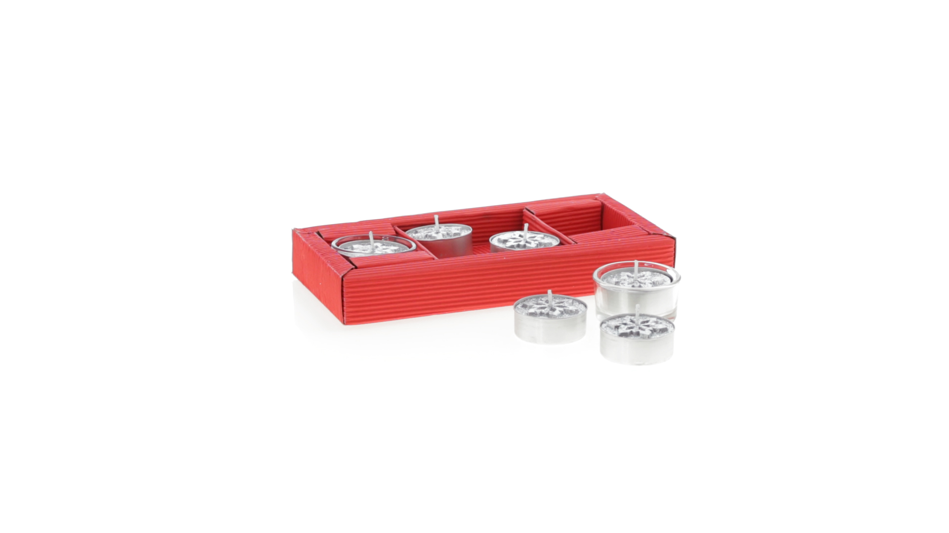 8-teiliges Kerzen-Set in einer individuellen Box in Weihnachtsrot, mit Fenster und Schleifenband. Enthält 6 Kerzen und 2 Kerzenhalter aus Glas.