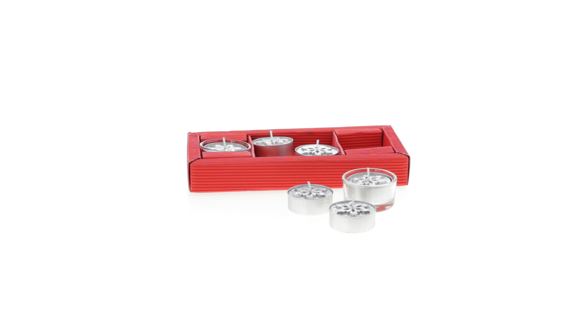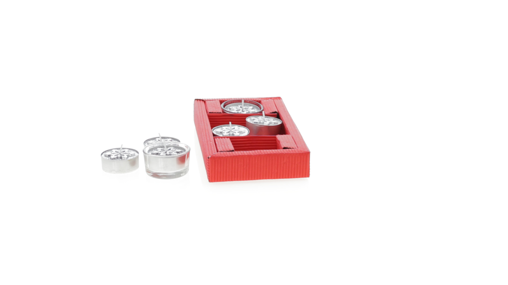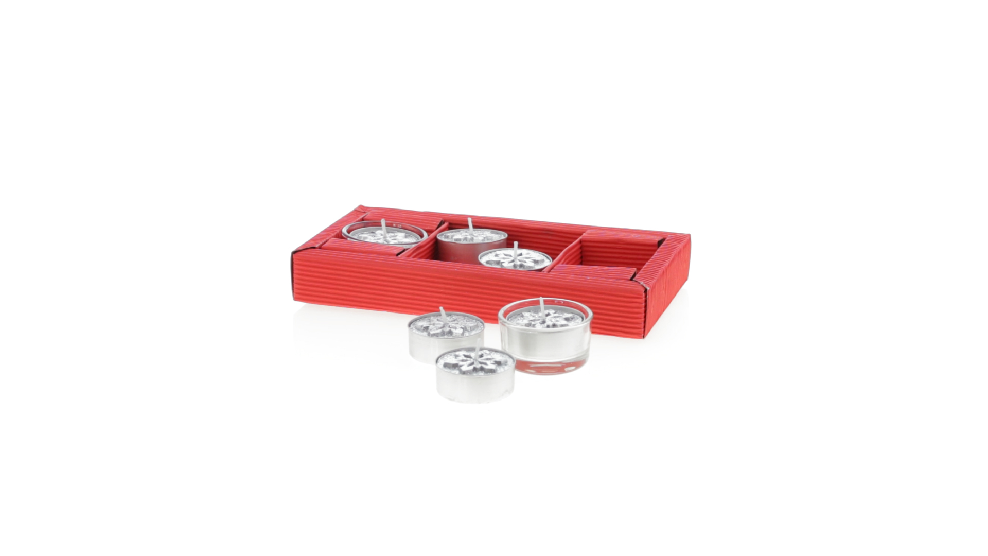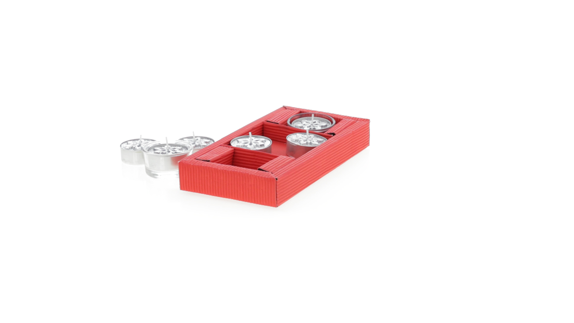 8-teiliges Kerzen-Set in einer individuellen Box in Weihnachtsrot, mit Fenster und Schleifenband. Enthält 6 Kerzen und 2 Kerzenhalter aus Glas.