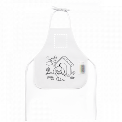 Kinderschürze aus Non-Woven (80 g/m²) zum Ausmalen. Mit vorbedrucktem Motiv, einer Seitentasche, anpassbaren Bändern und 4 Filzstiften. 380 x 430 mm