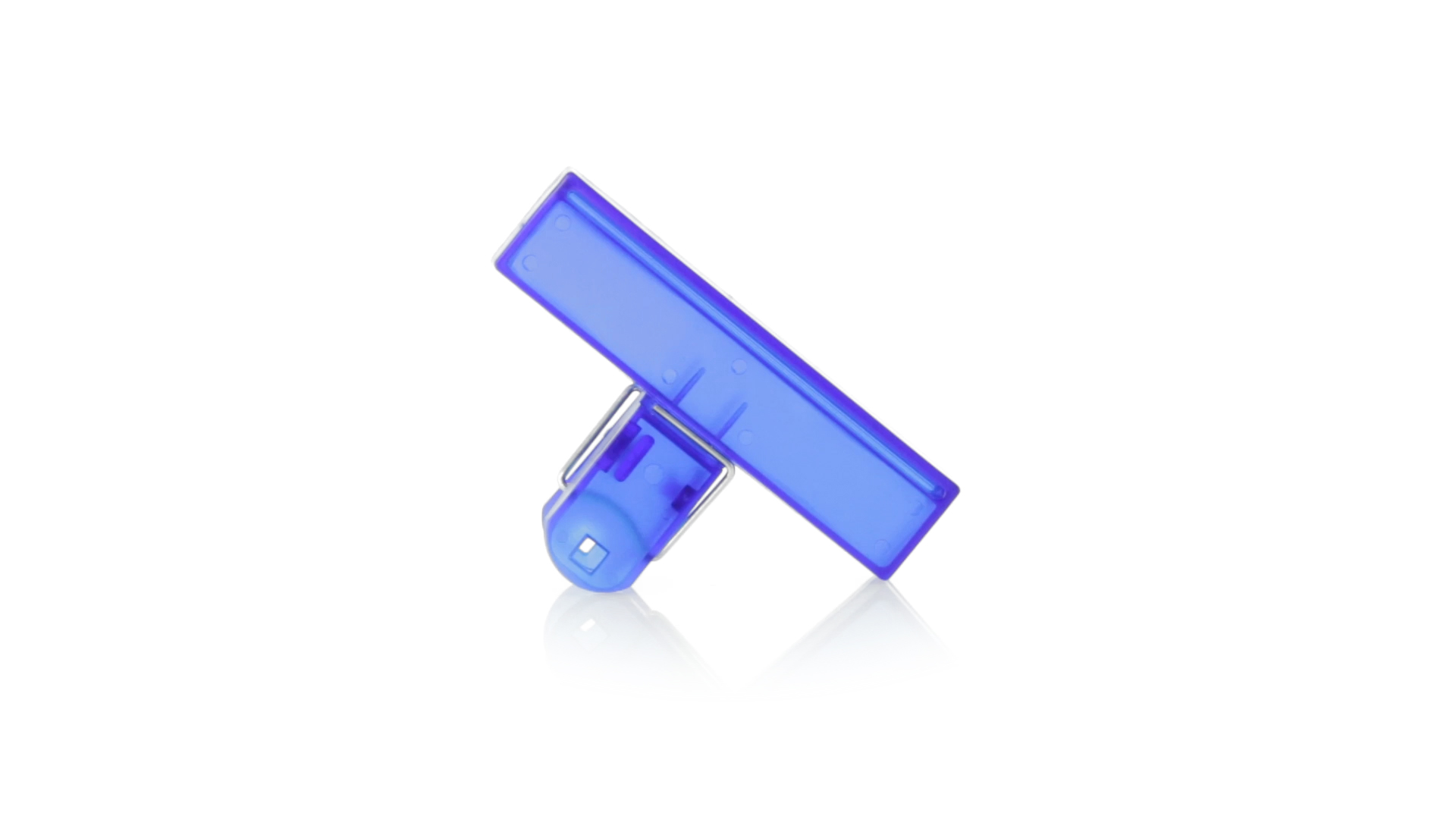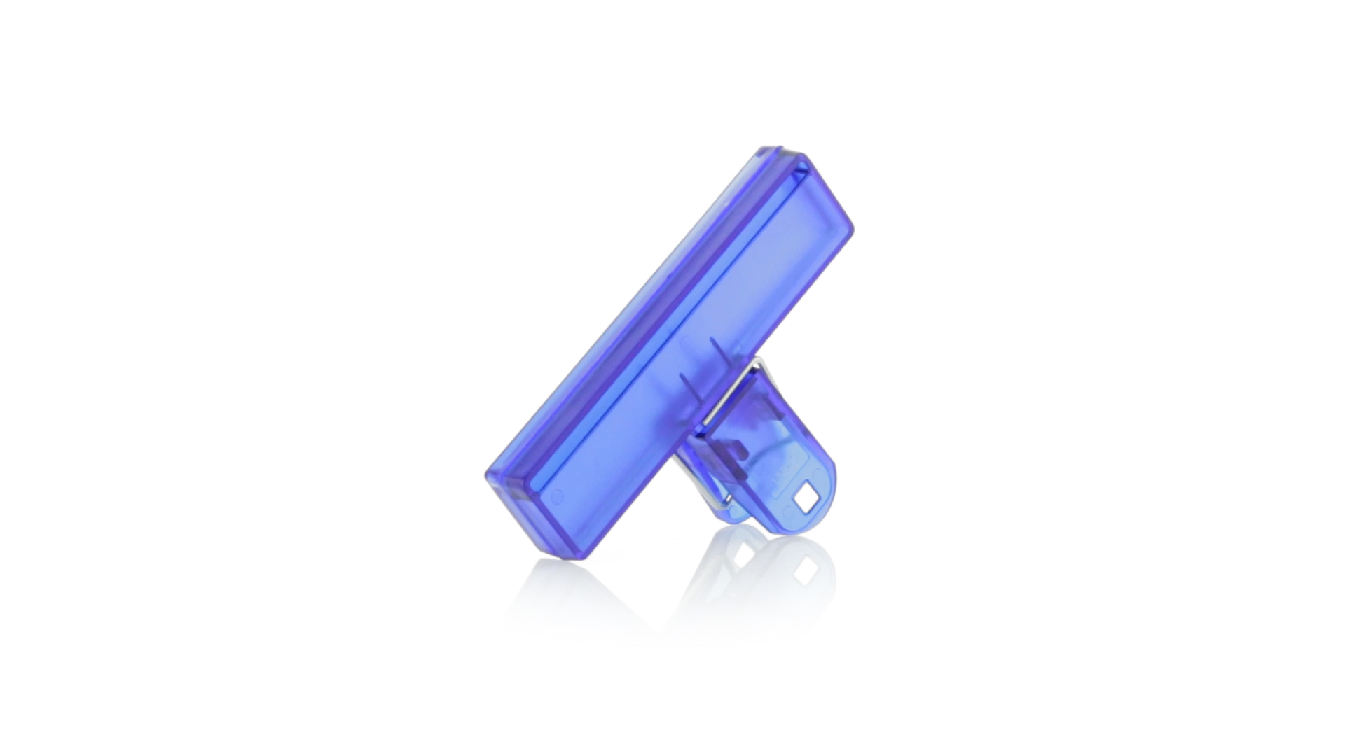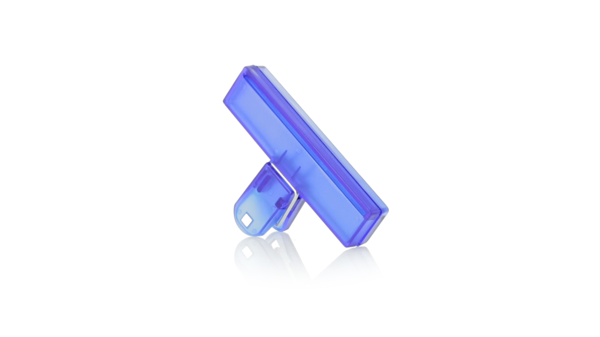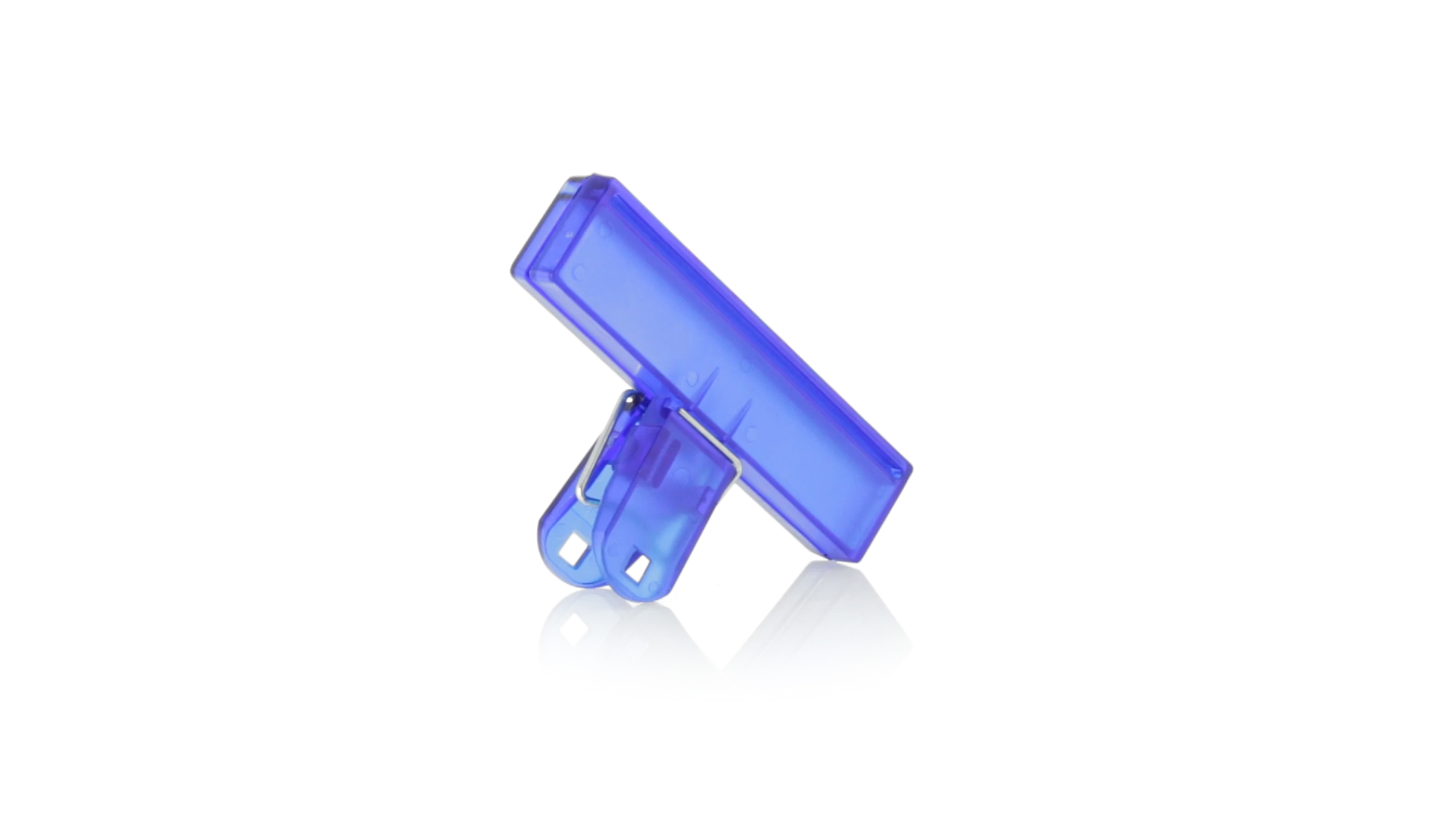 Verschlussklemme in einer Vielzahl von kräftigen, halbtransparenten Farben. Mit Stanzung zum Aufhängen.