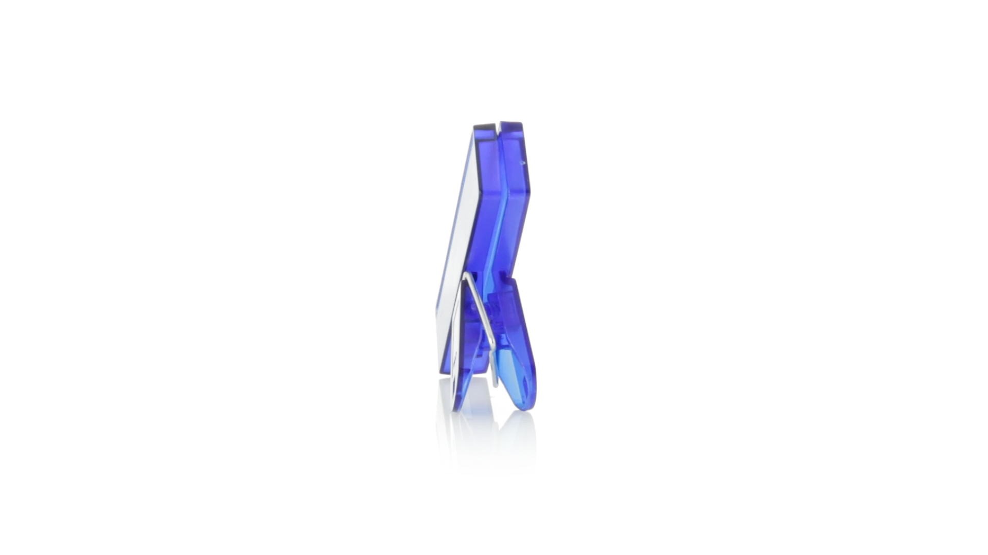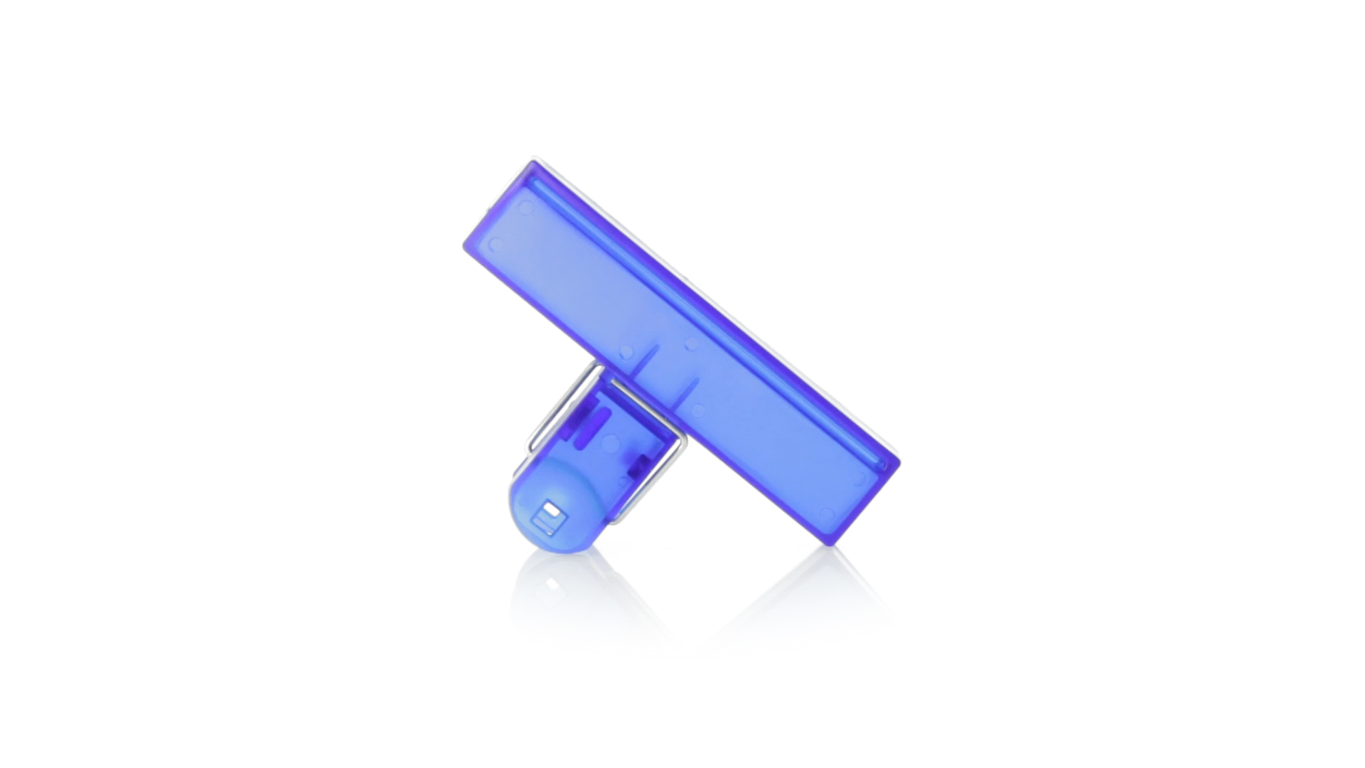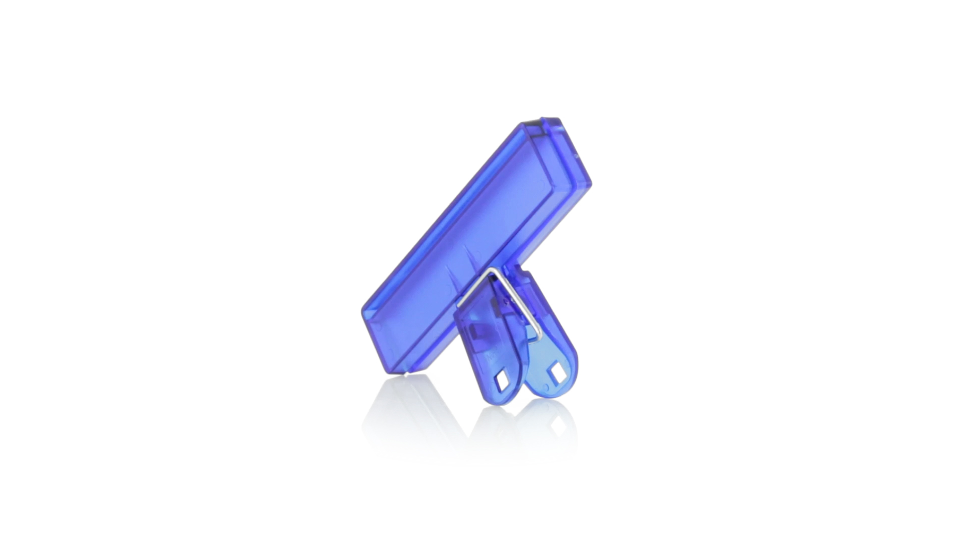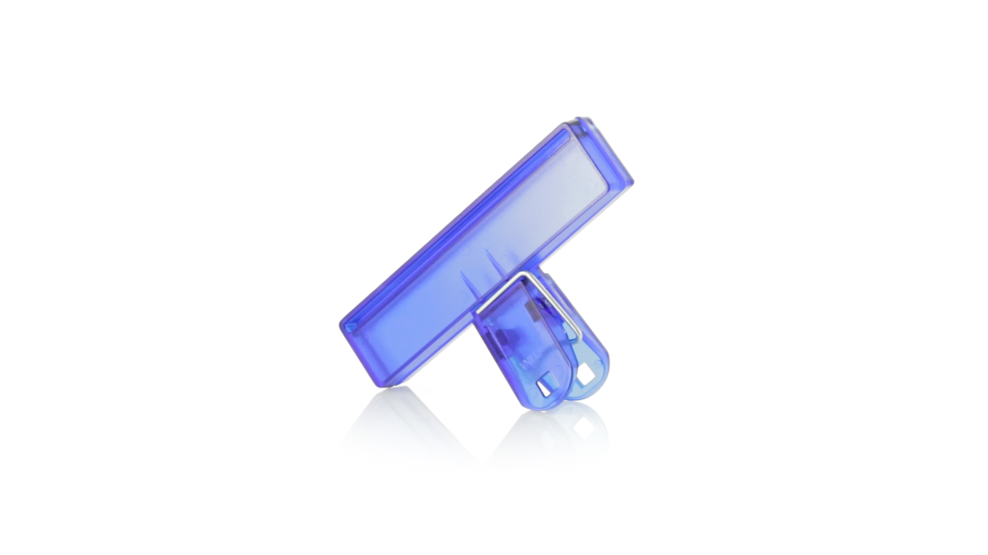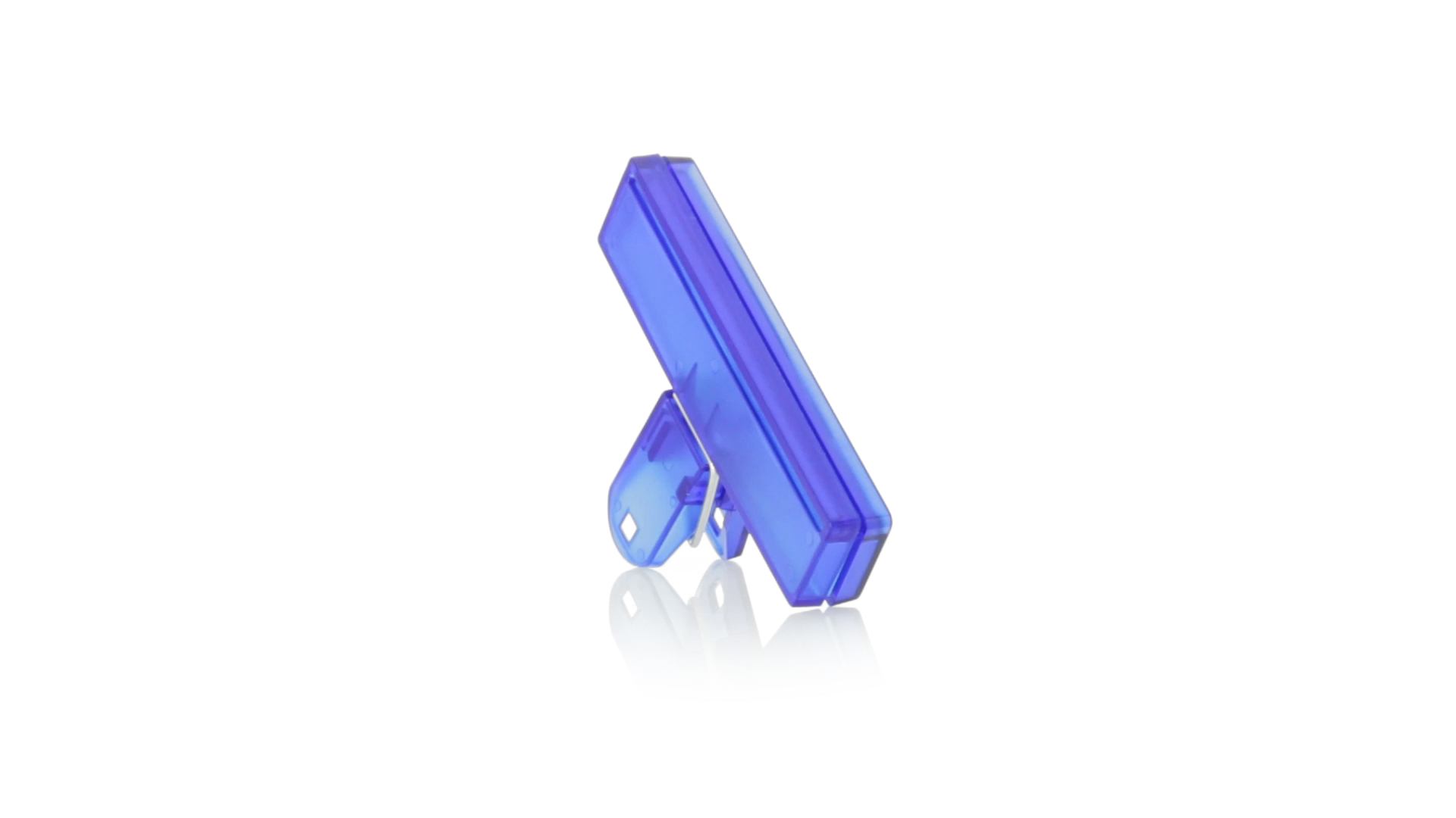 Verschlussklemme in einer Vielzahl von kräftigen, halbtransparenten Farben. Mit Stanzung zum Aufhängen.