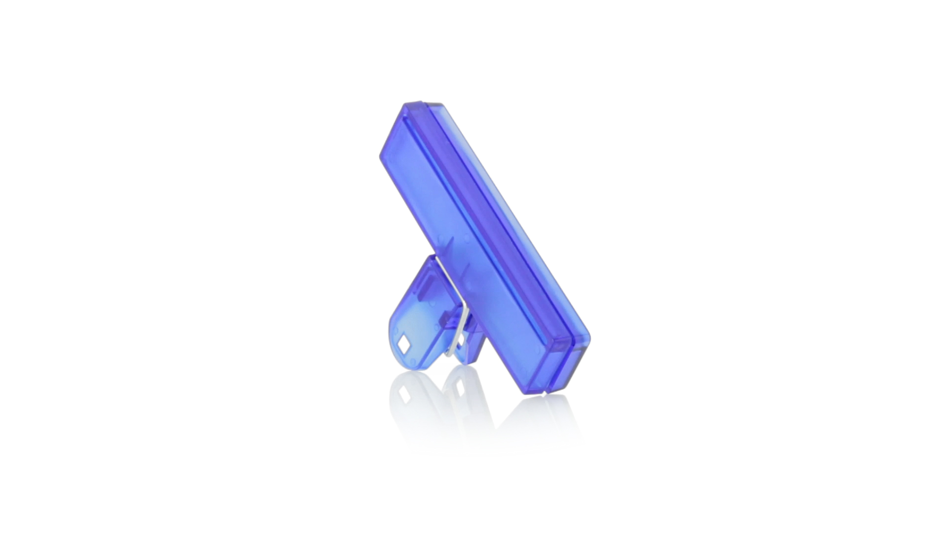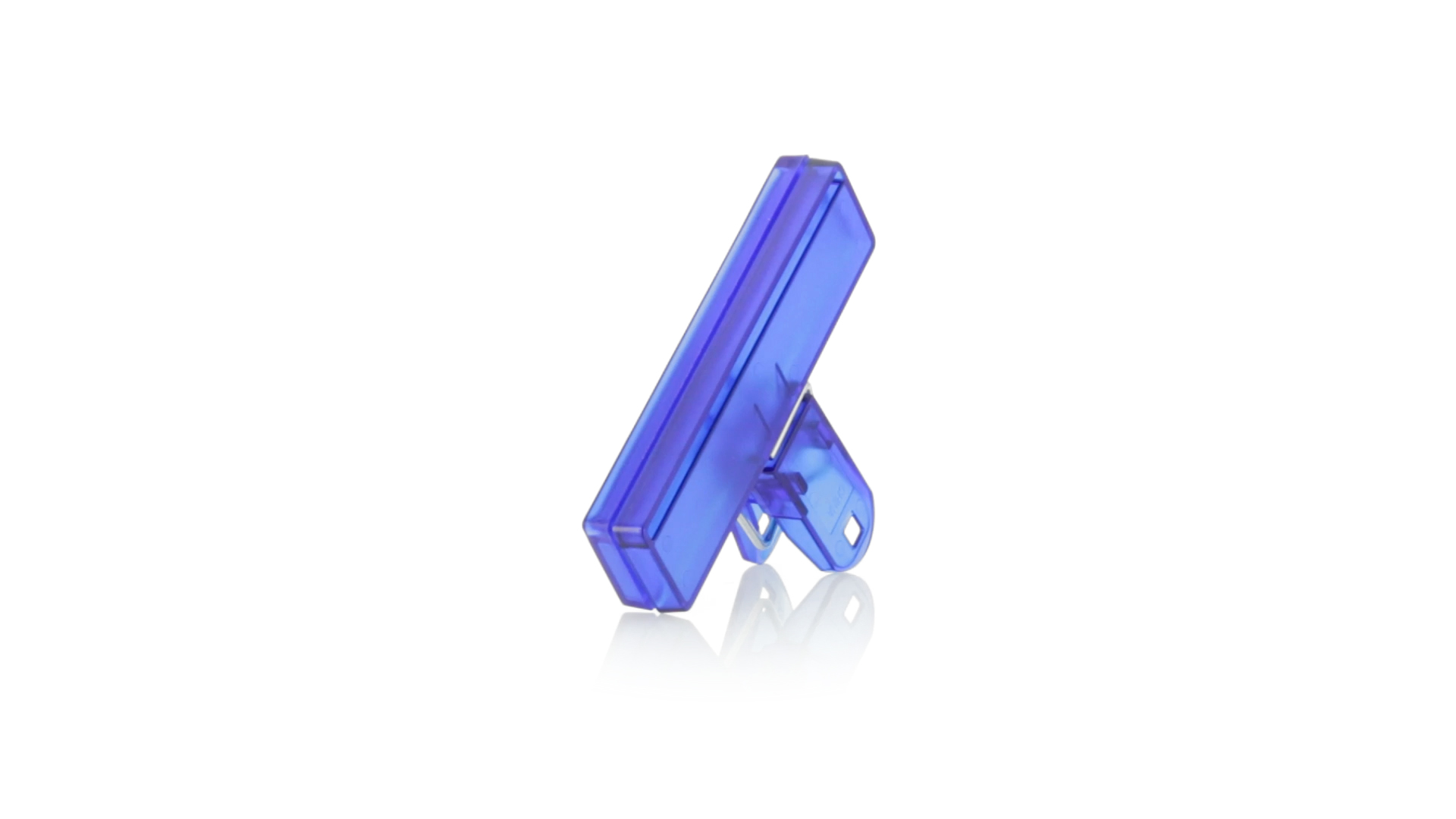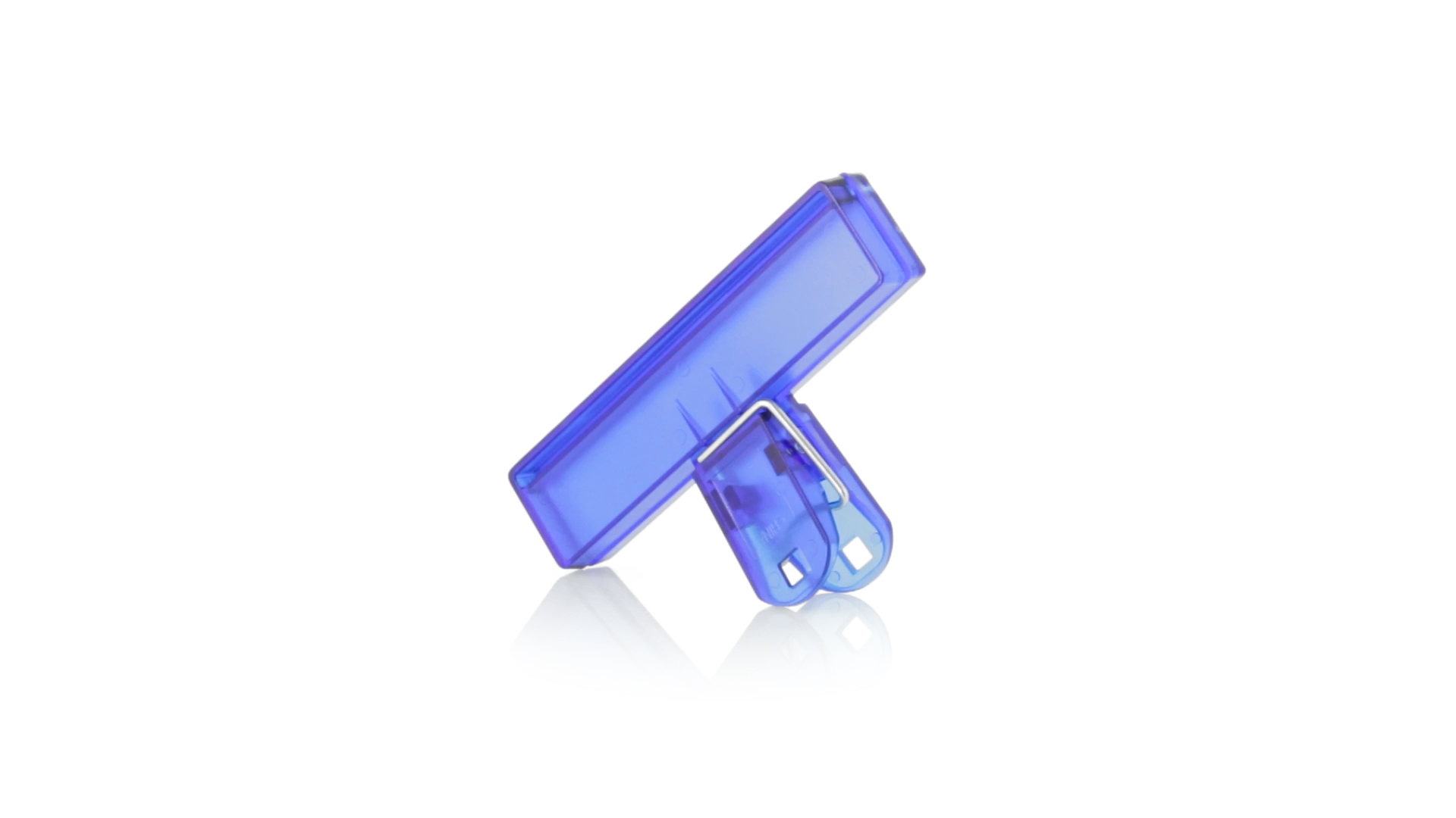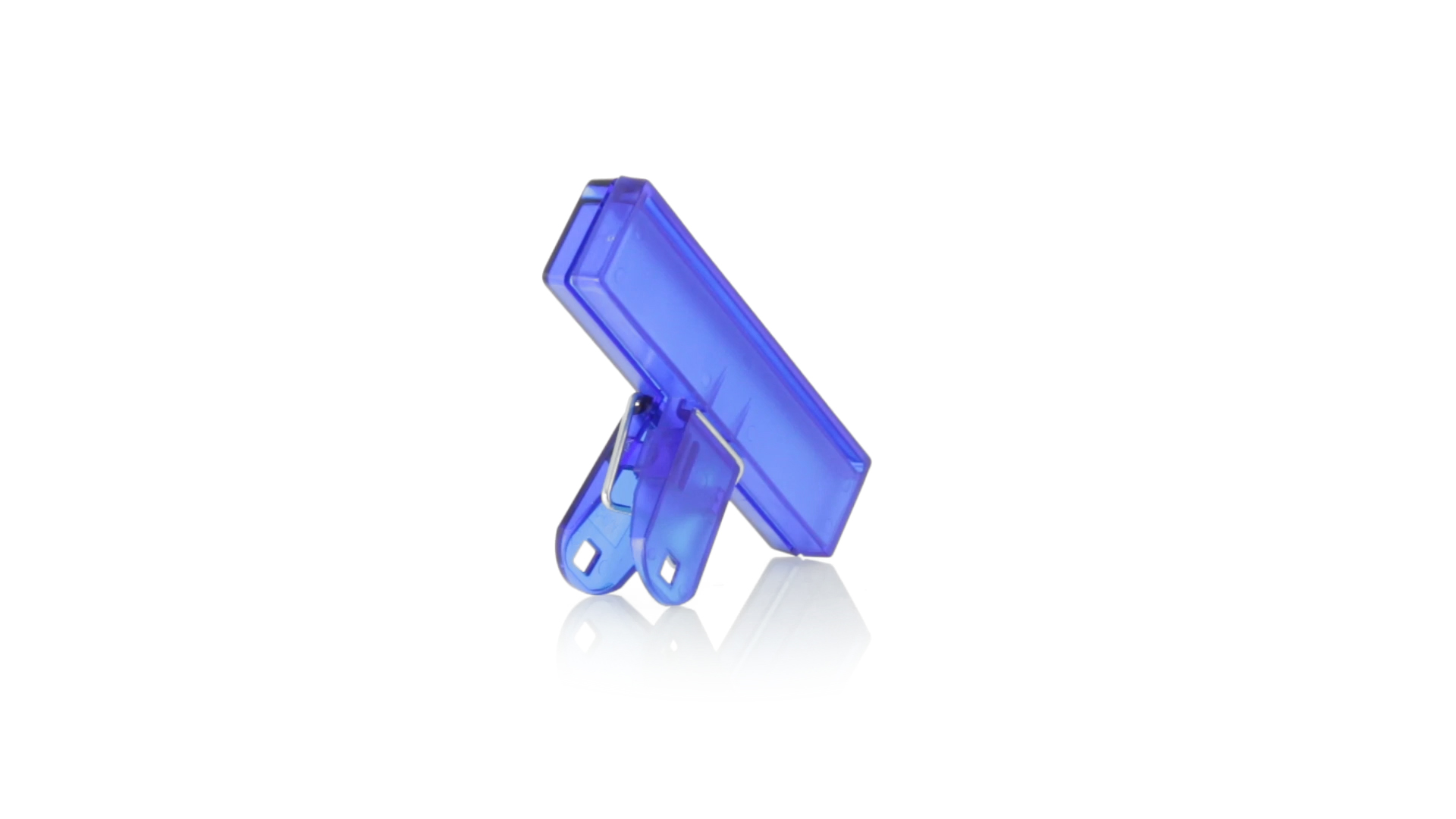Verschlussklemme in einer Vielzahl von kräftigen, halbtransparenten Farben. Mit Stanzung zum Aufhängen.