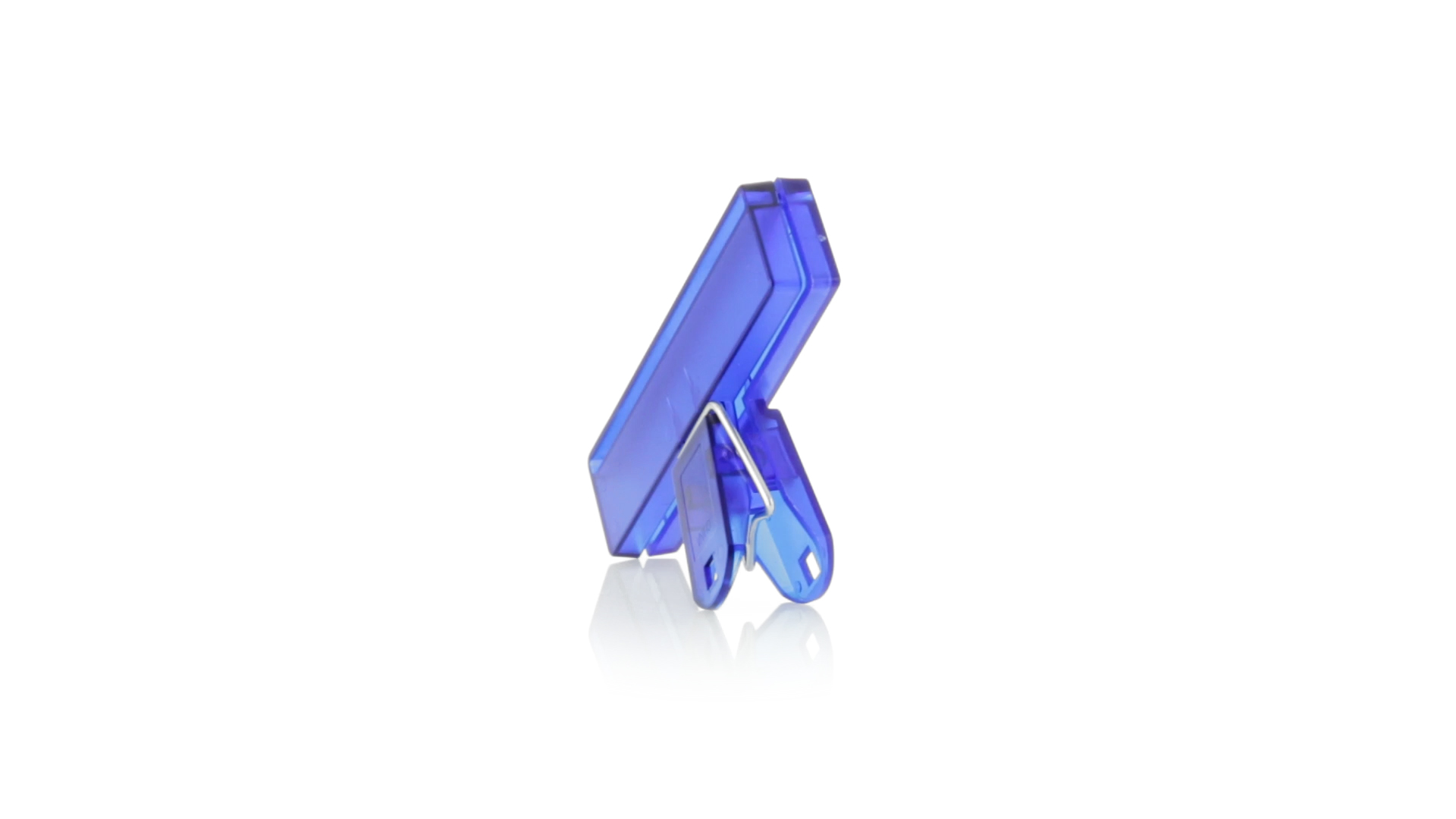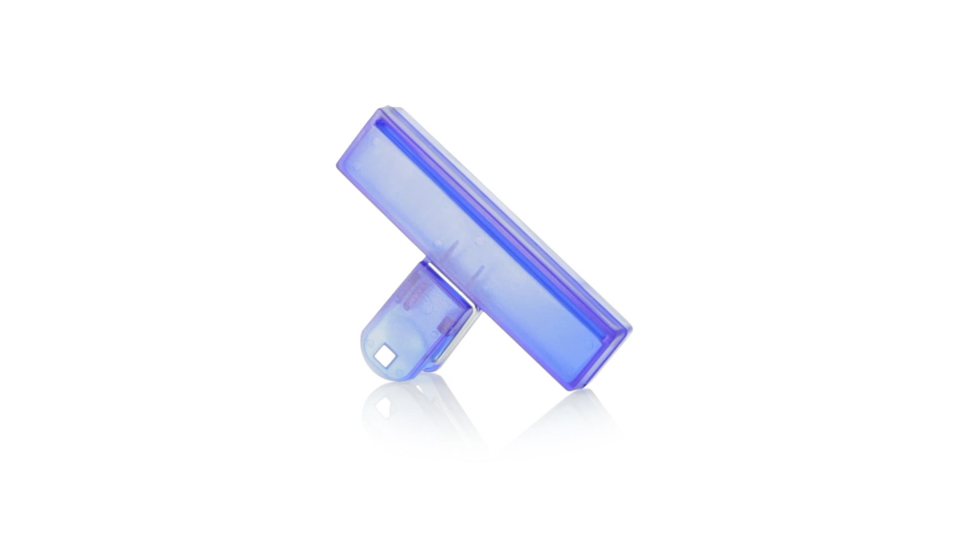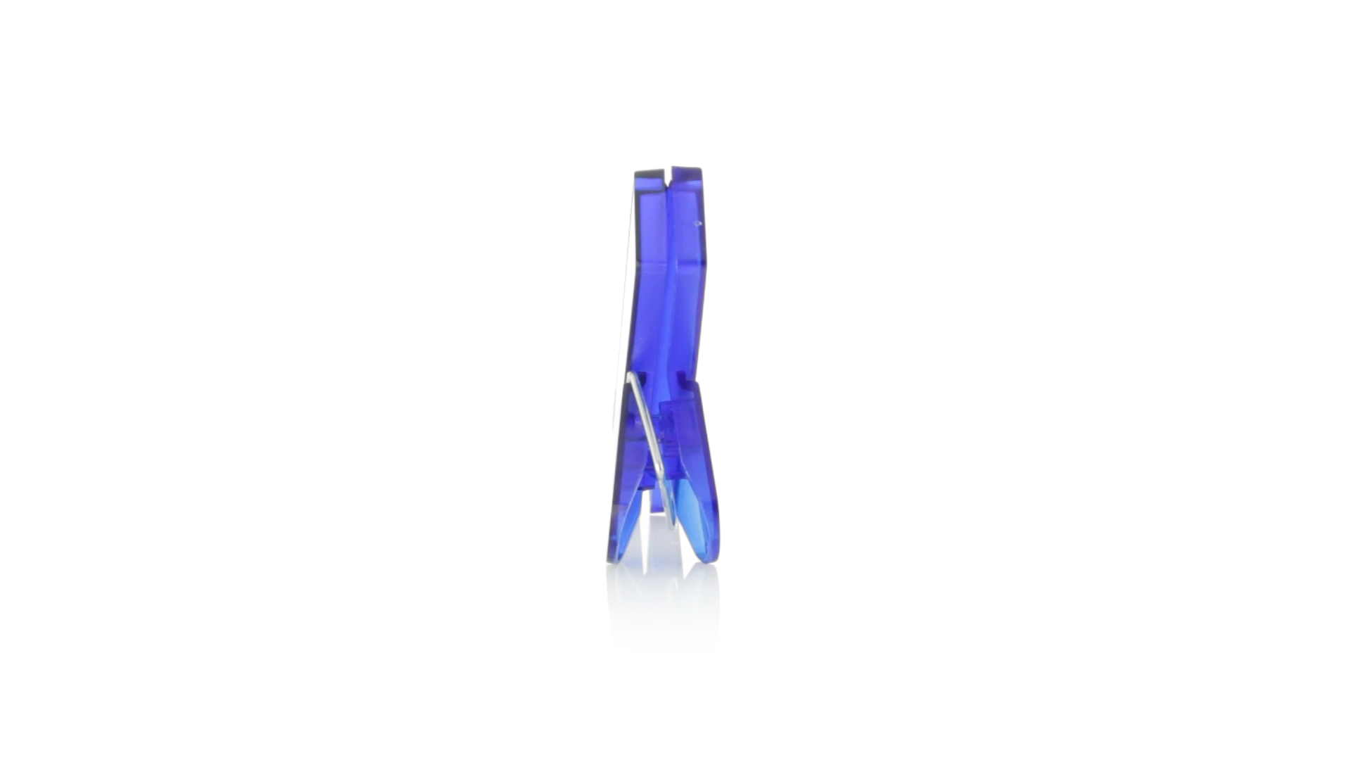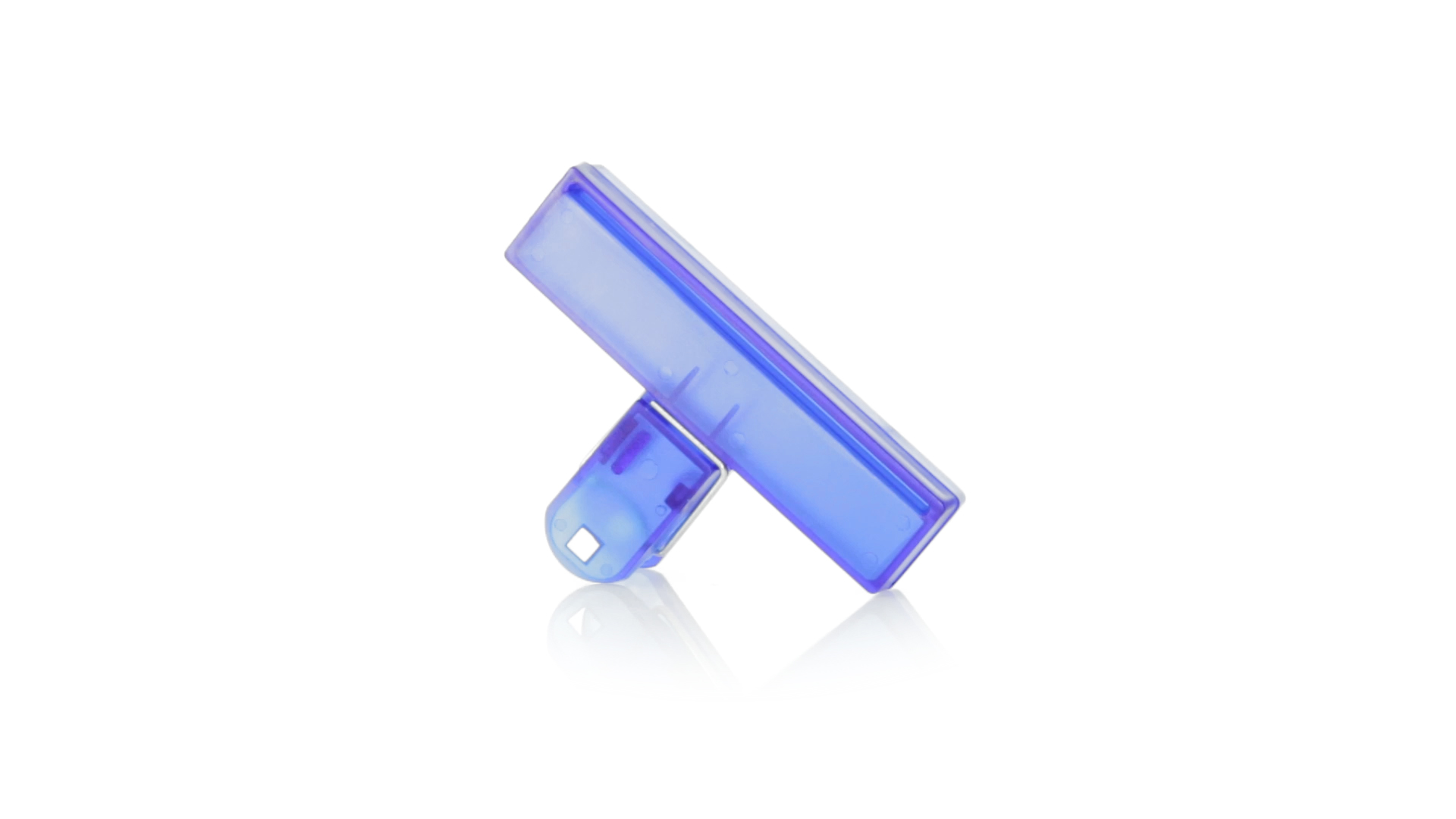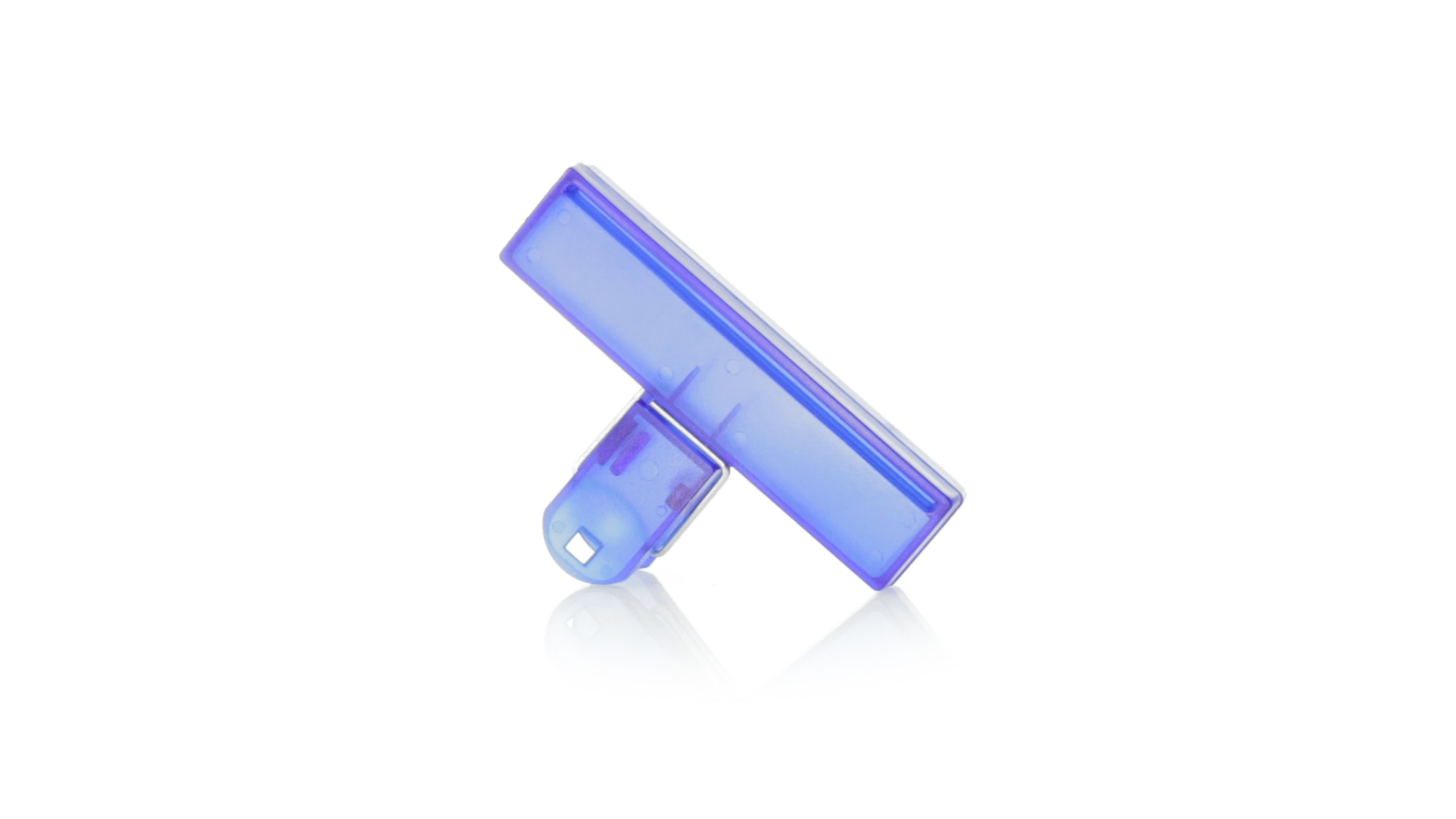 Verschlussklemme in einer Vielzahl von kräftigen, halbtransparenten Farben. Mit Stanzung zum Aufhängen.
