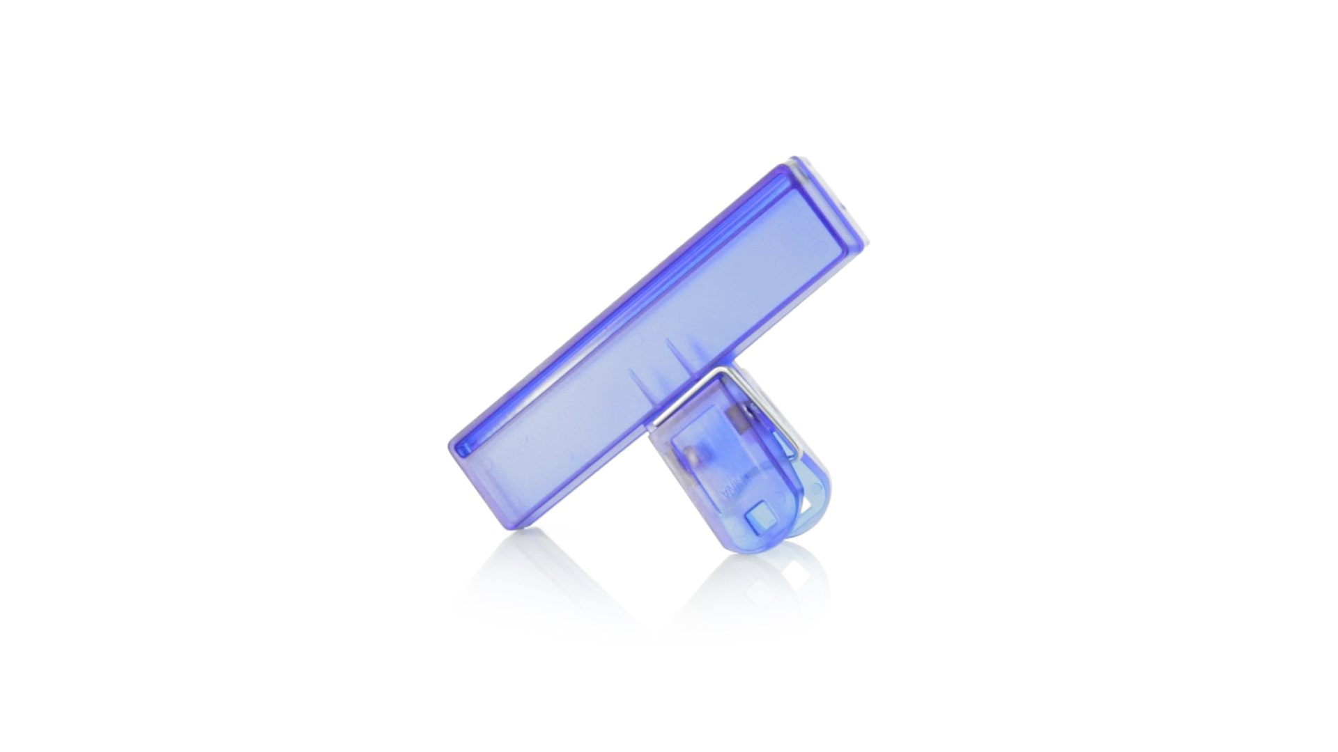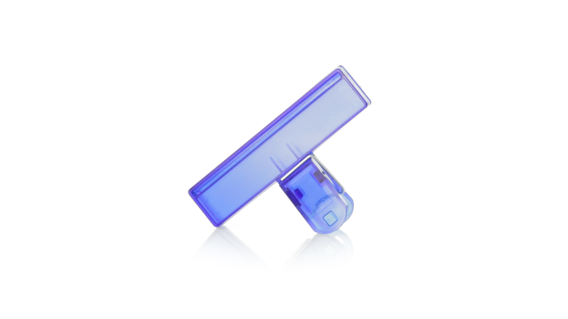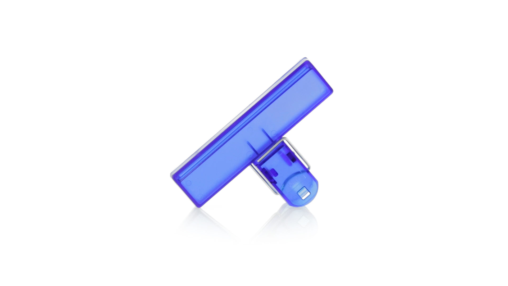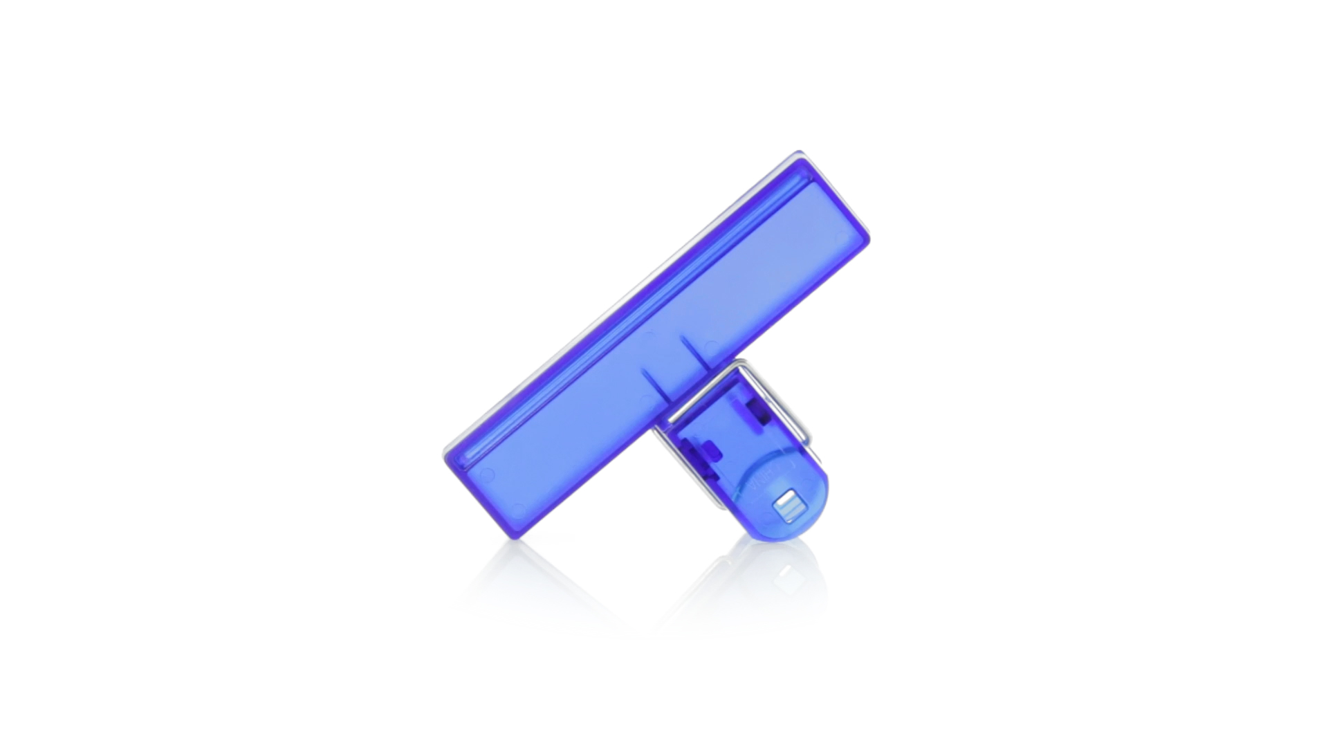 Verschlussklemme in einer Vielzahl von kräftigen, halbtransparenten Farben. Mit Stanzung zum Aufhängen.