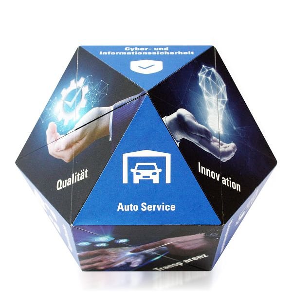 Du kannst aus verschiedenen Formen wählen: Würfel in unterschiedlichen Größen, Diamant, auf Anfrage Container, Dose, Orbit oder Prisma – ganz nach deinen Wünschen und Bedürfnissen. Alle Seiten des Klappwürfels können von dir individuell designt werden, damit er perfekt zu deiner Marke passt. Die Druckvorlagen lieferst du einfach gemäß unseren Vorgaben, und wir setzen alles 1:1 um.