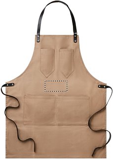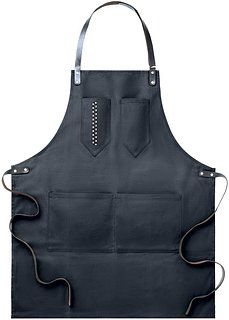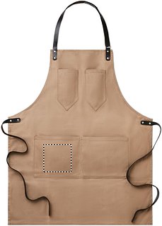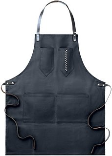 Schürze aus gewachstem Canvas. Verstellbarer Nackengurt sowie Bindegurt aus Leder. 2 Brusttaschen und eine grosse Fronttasche.
