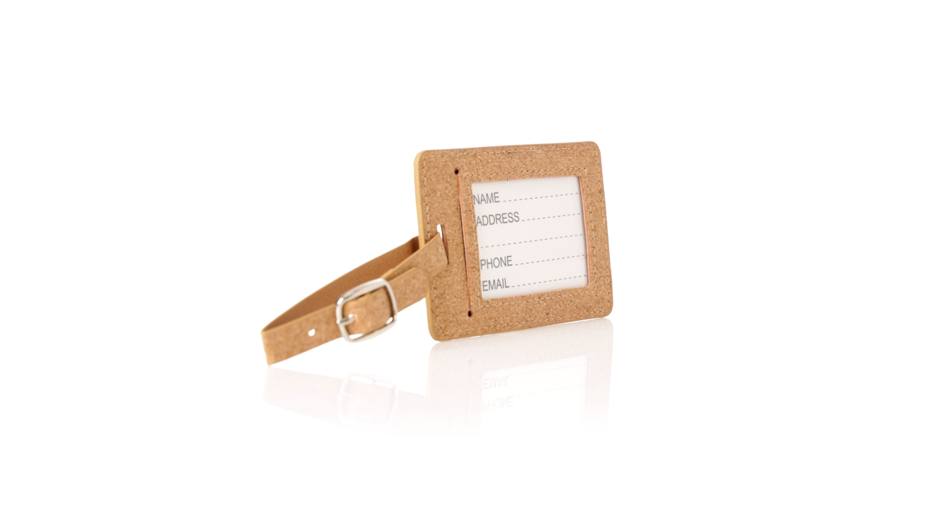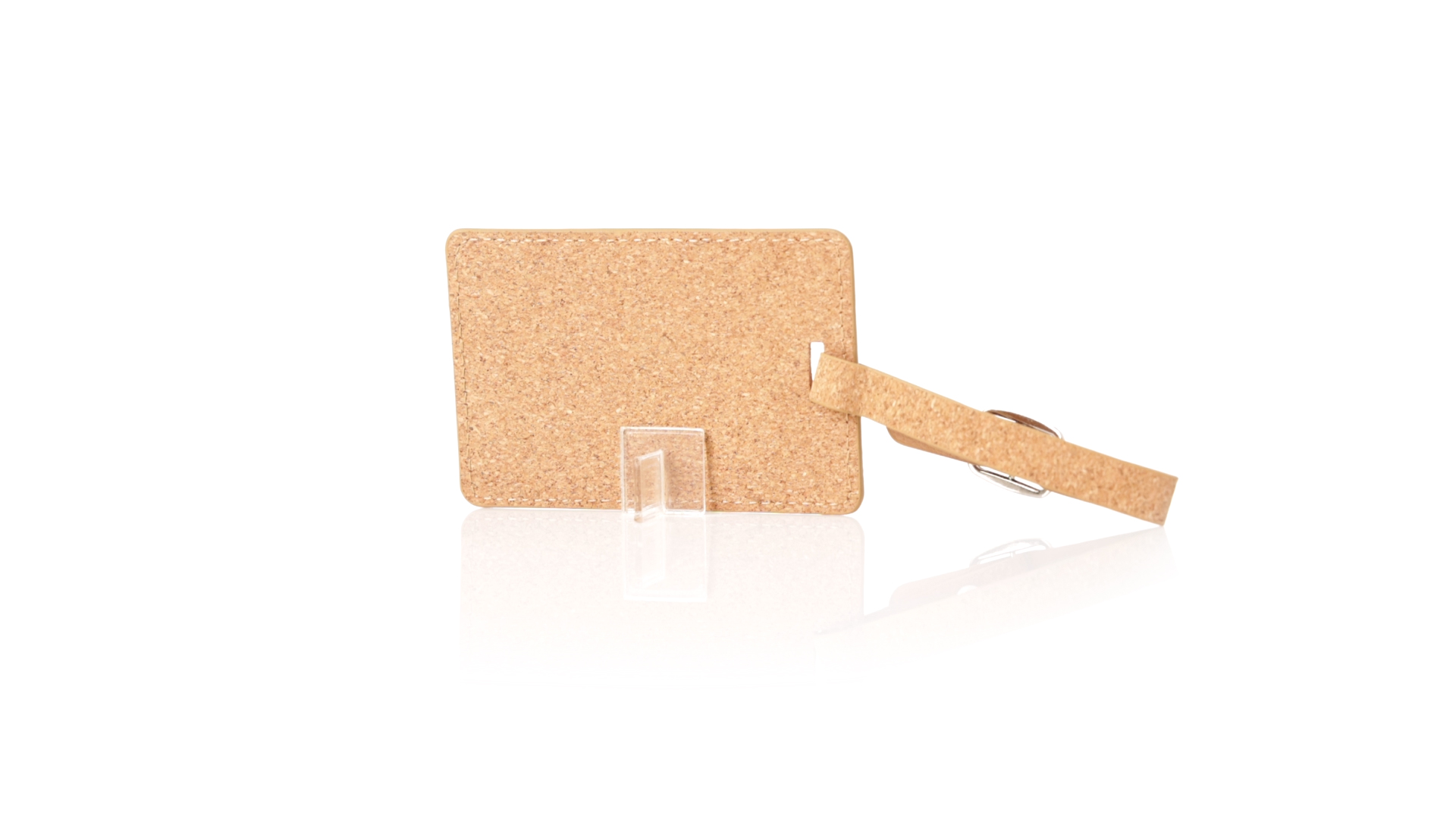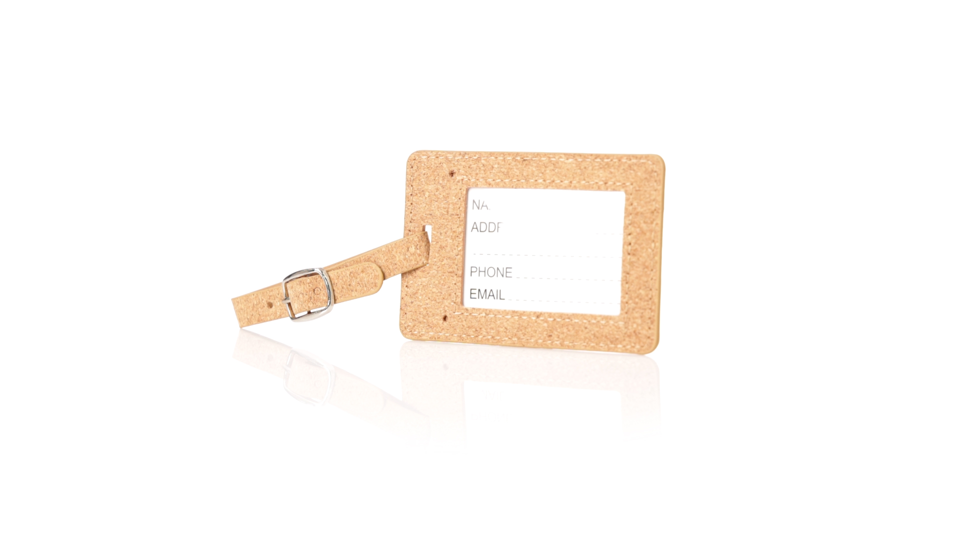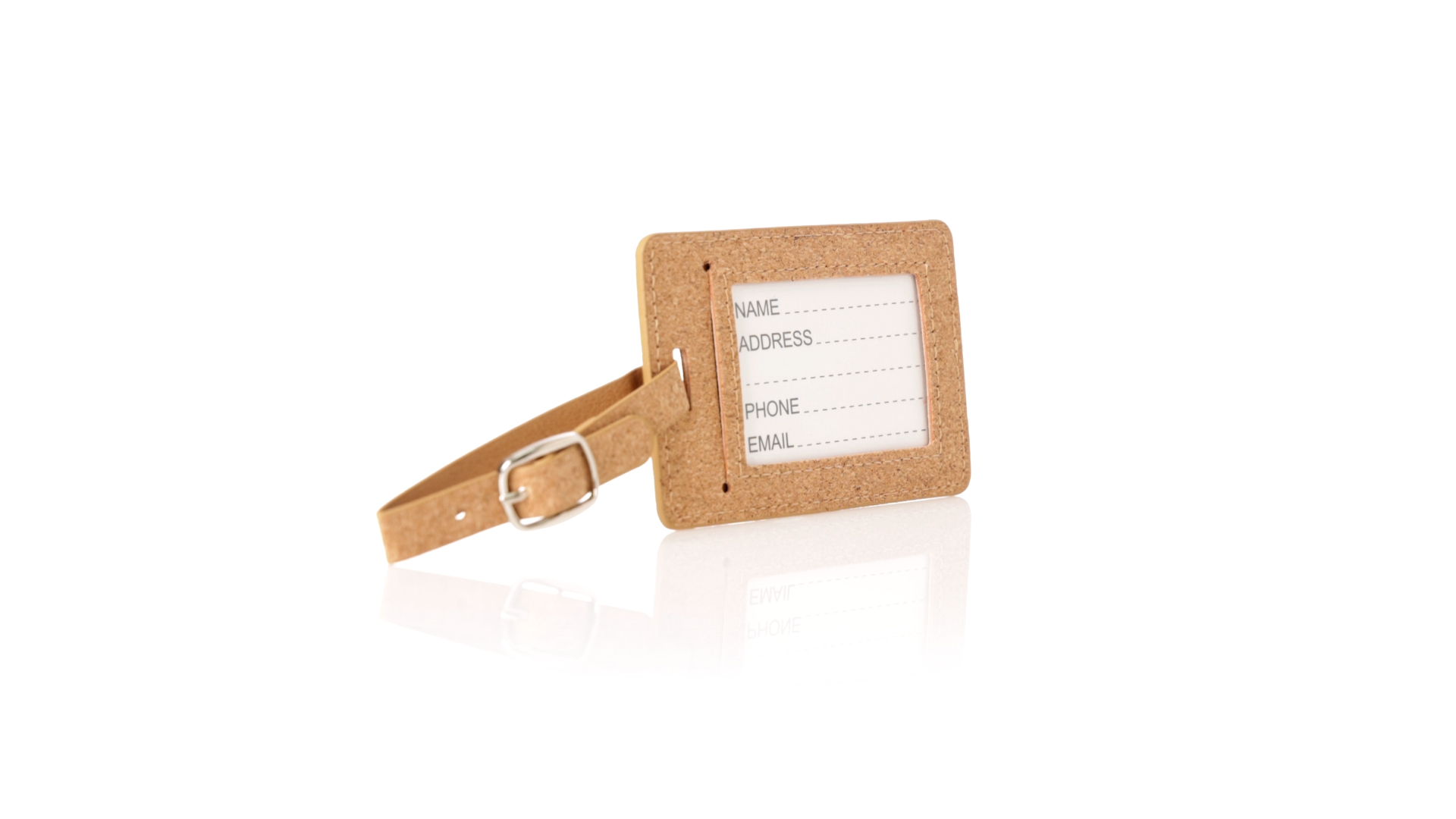 Linie Natur Kofferanhänger aus Naturkork. Band mit Metallschnallenverschluss und Identifikationskarte in englischer Sprache.