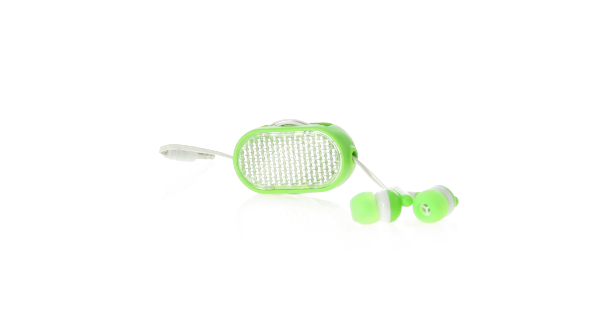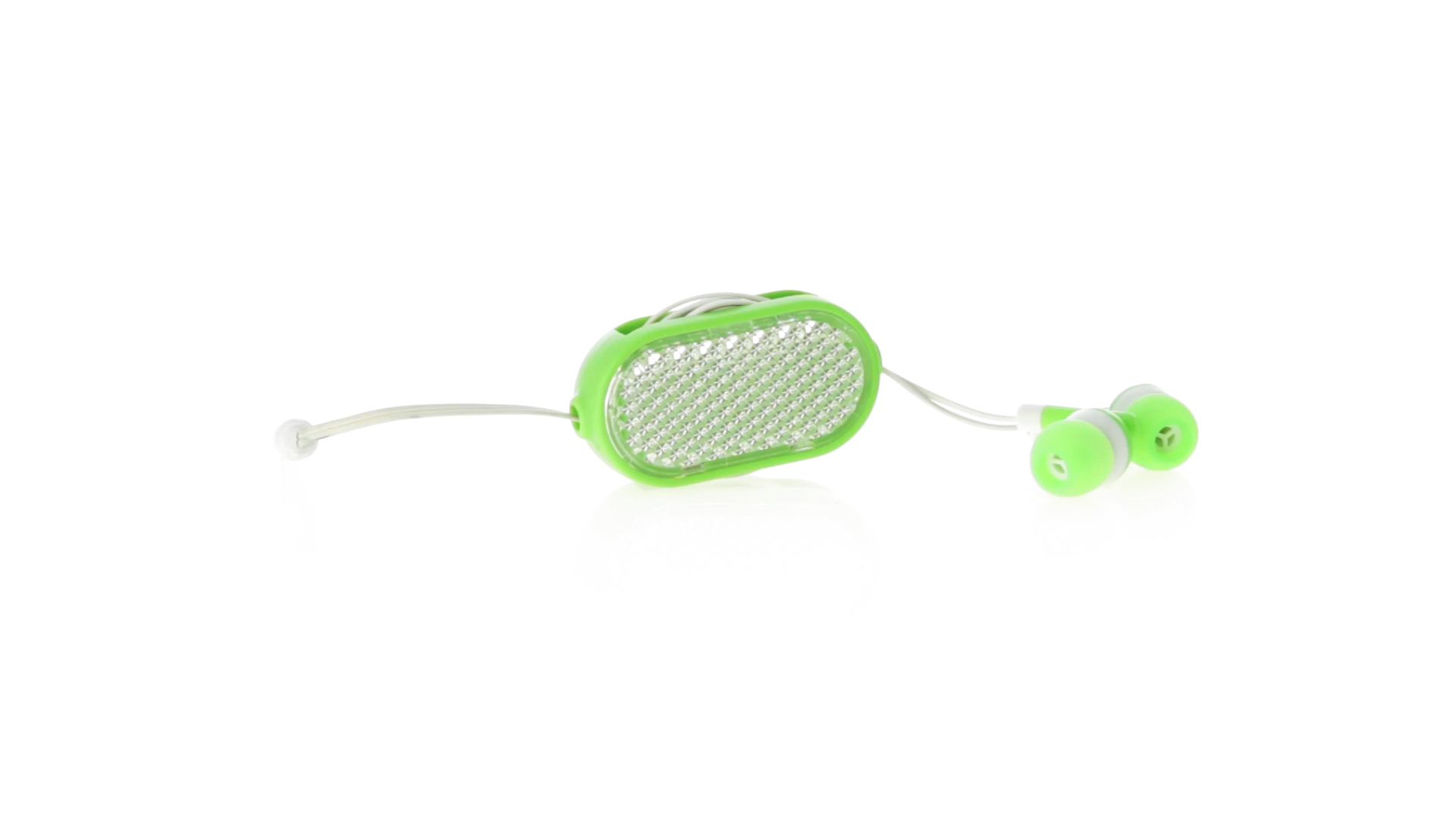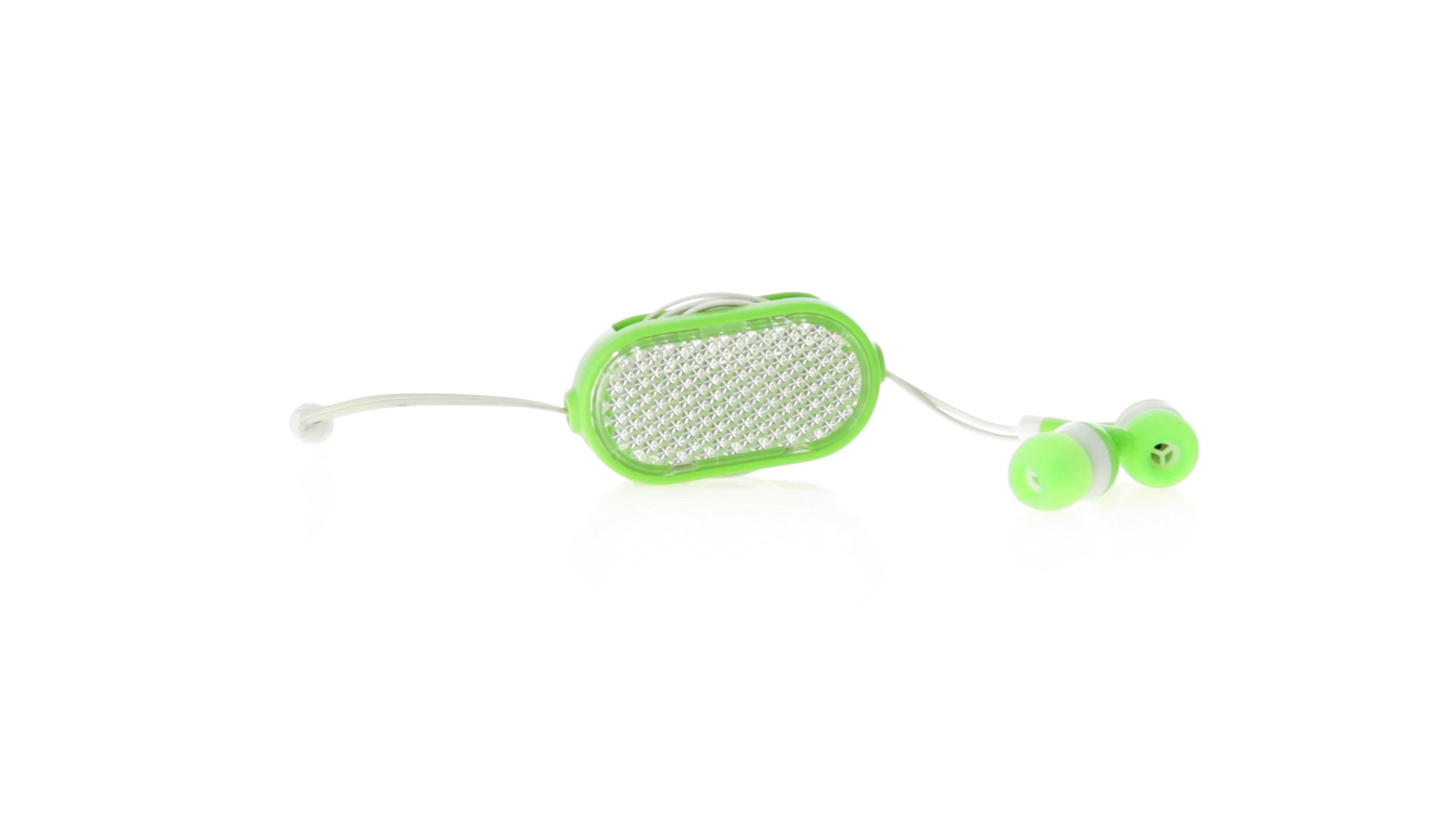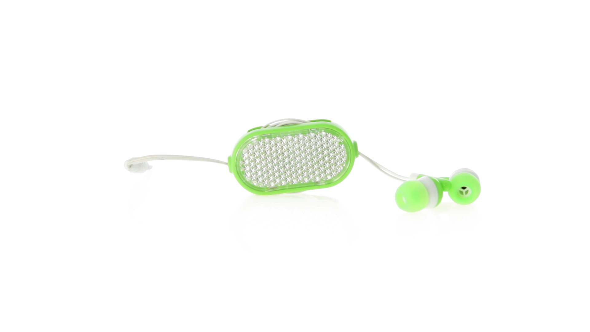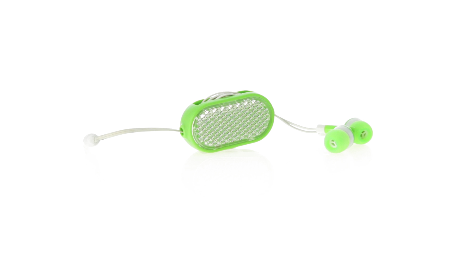 In-Ear-Kopfhörer mit sportlichem Design und reflektierendem Gehäuse in verschiedenen lebendigen Farben. Mit ausziehbarem Kabel und Clip sowie 3,5-mm-Klinkenstecker und Kabel in Weiss.