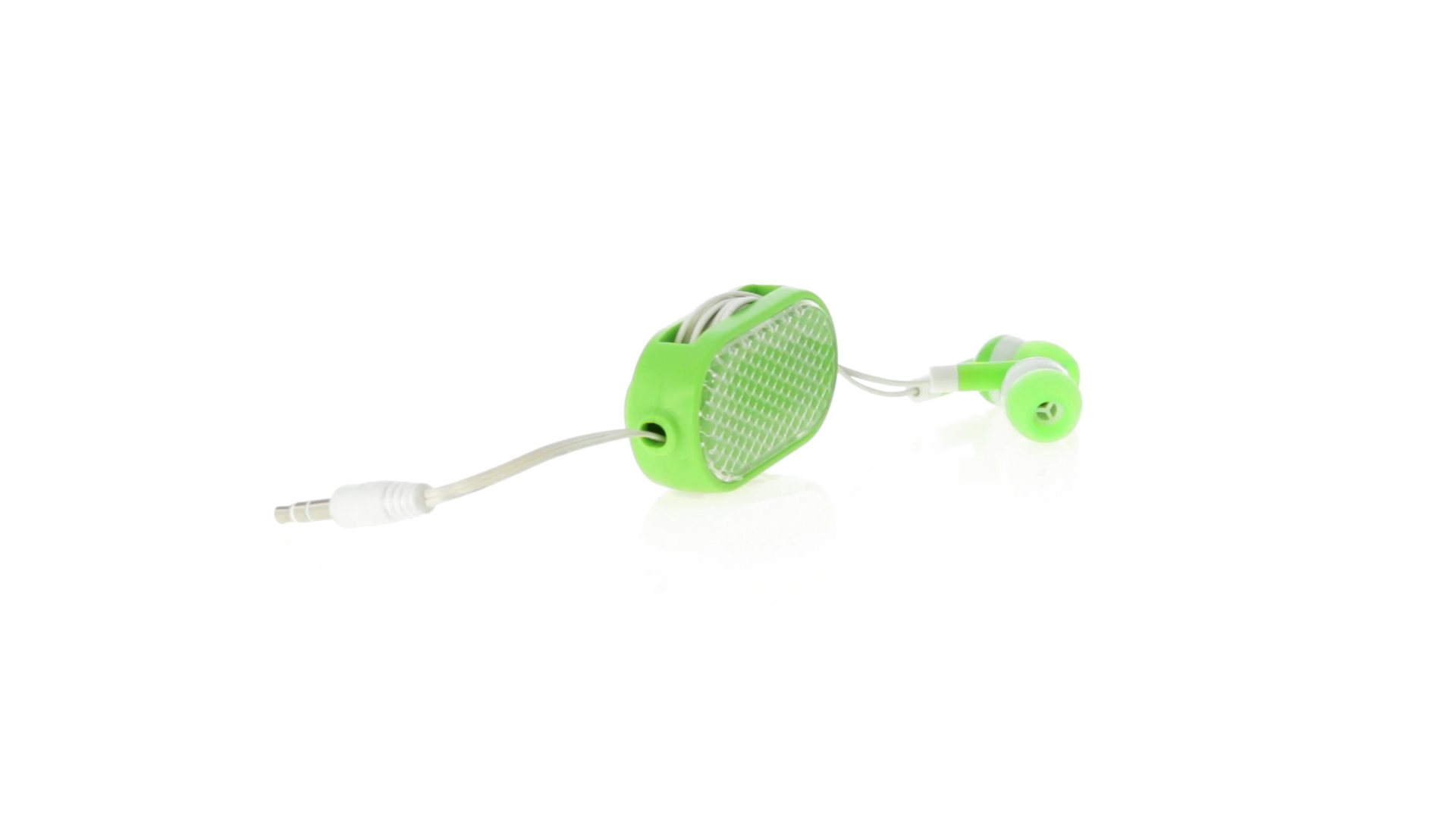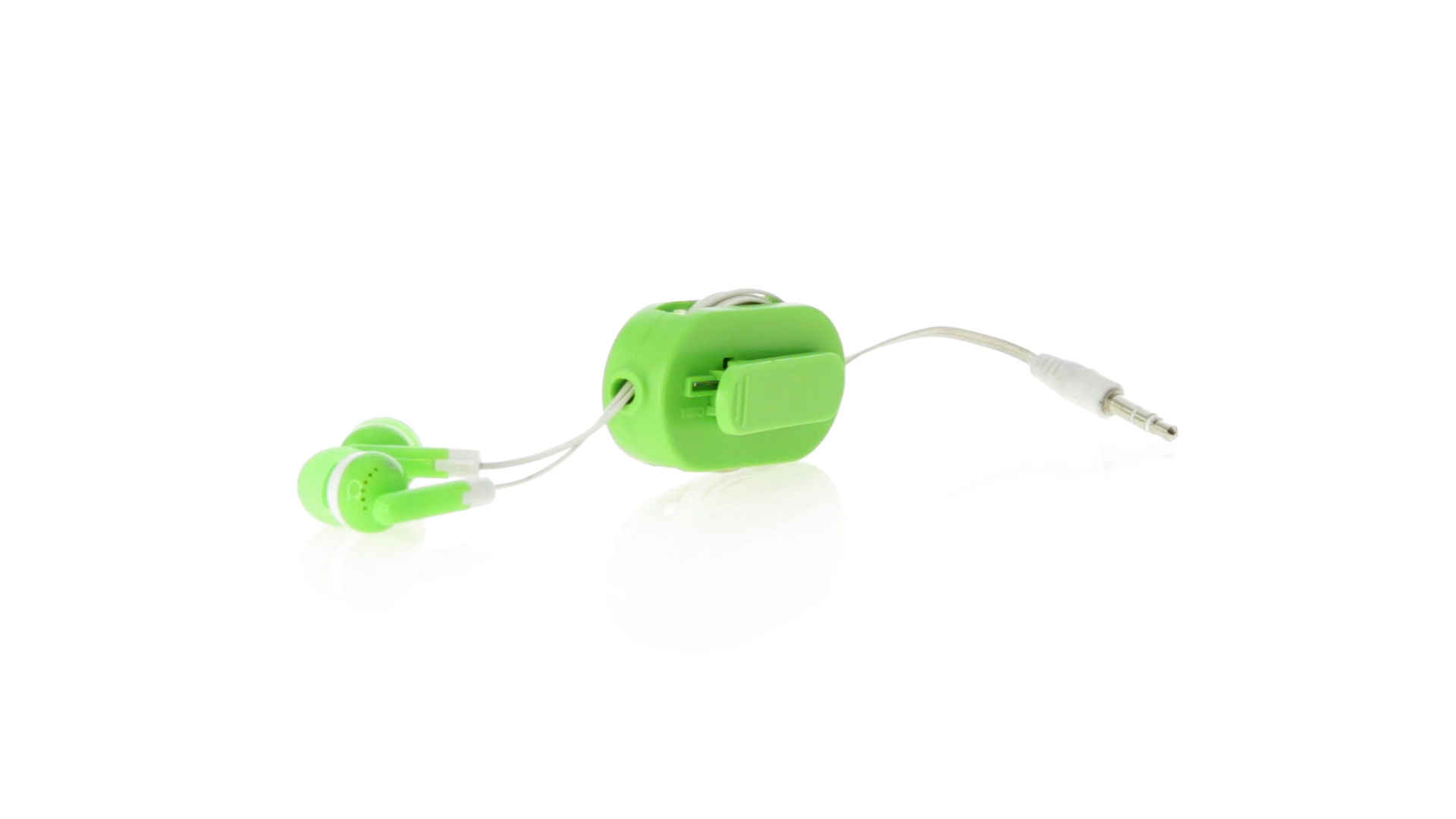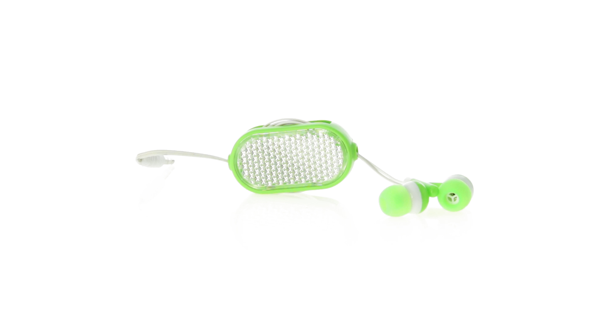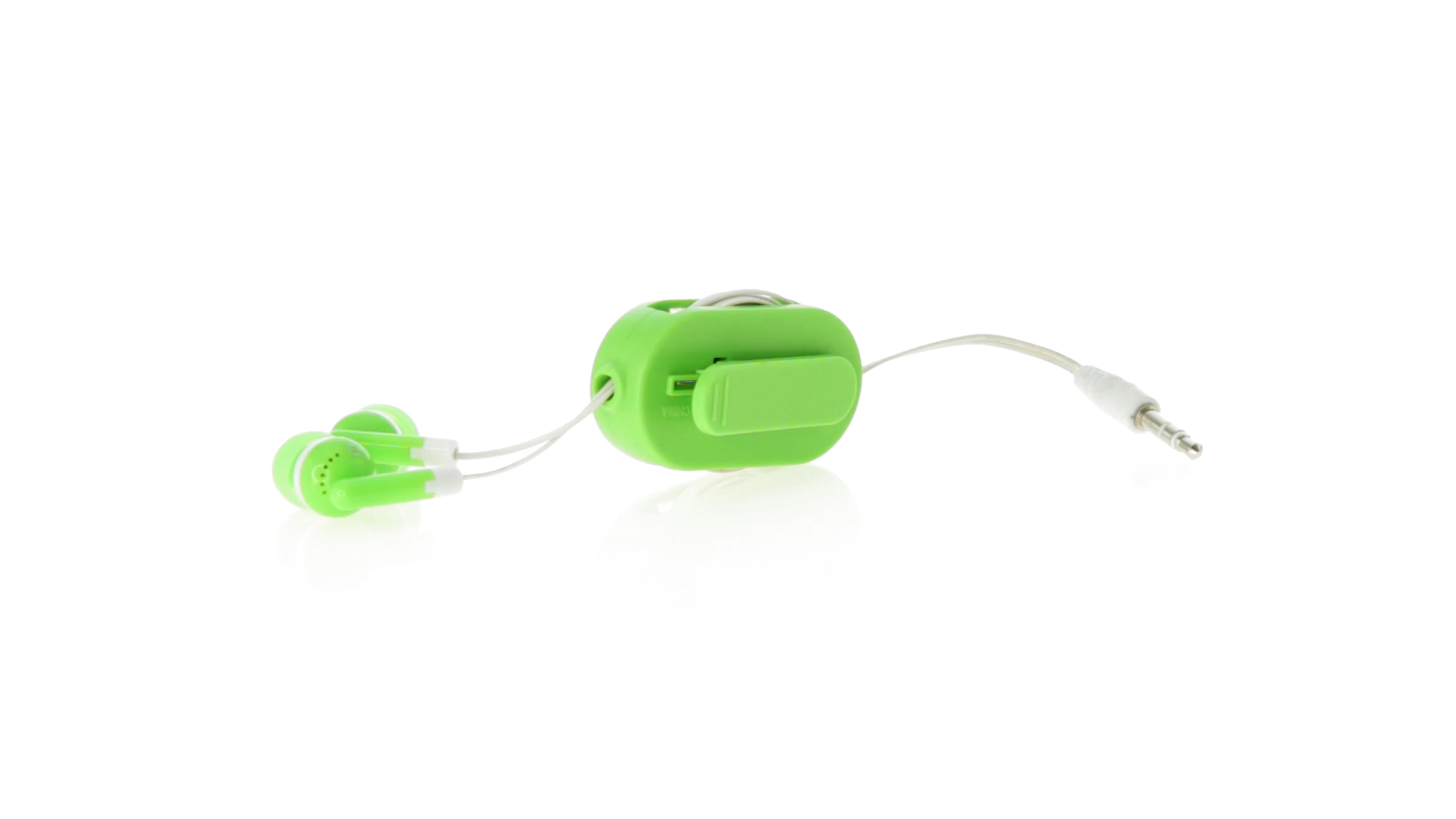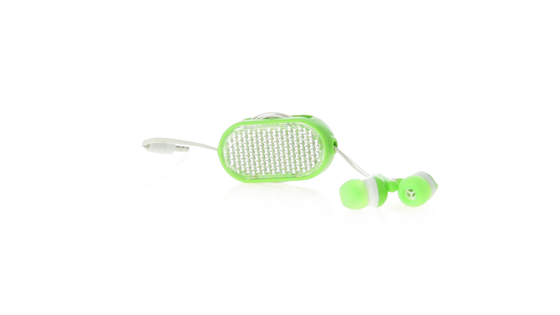 In-Ear-Kopfhörer mit sportlichem Design und reflektierendem Gehäuse in verschiedenen lebendigen Farben. Mit ausziehbarem Kabel und Clip sowie 3,5-mm-Klinkenstecker und Kabel in Weiss.