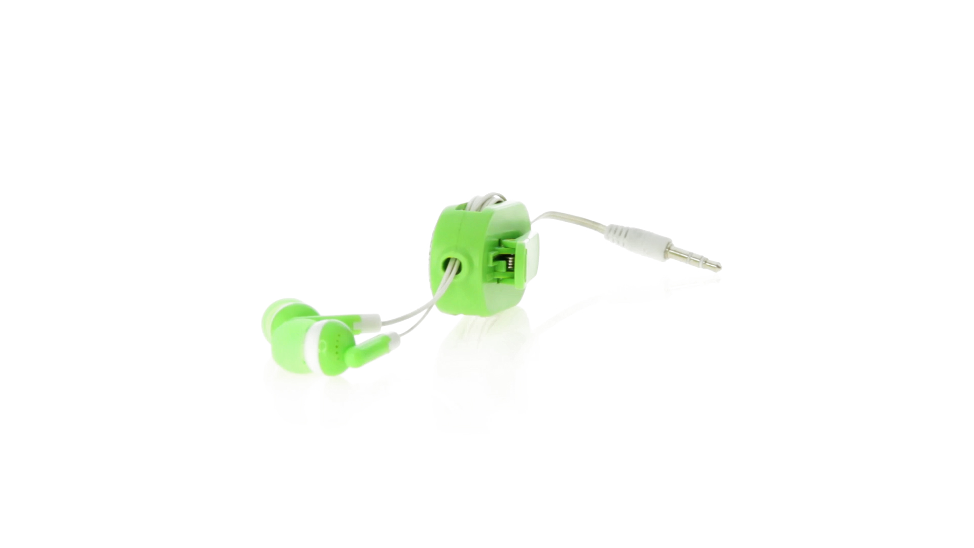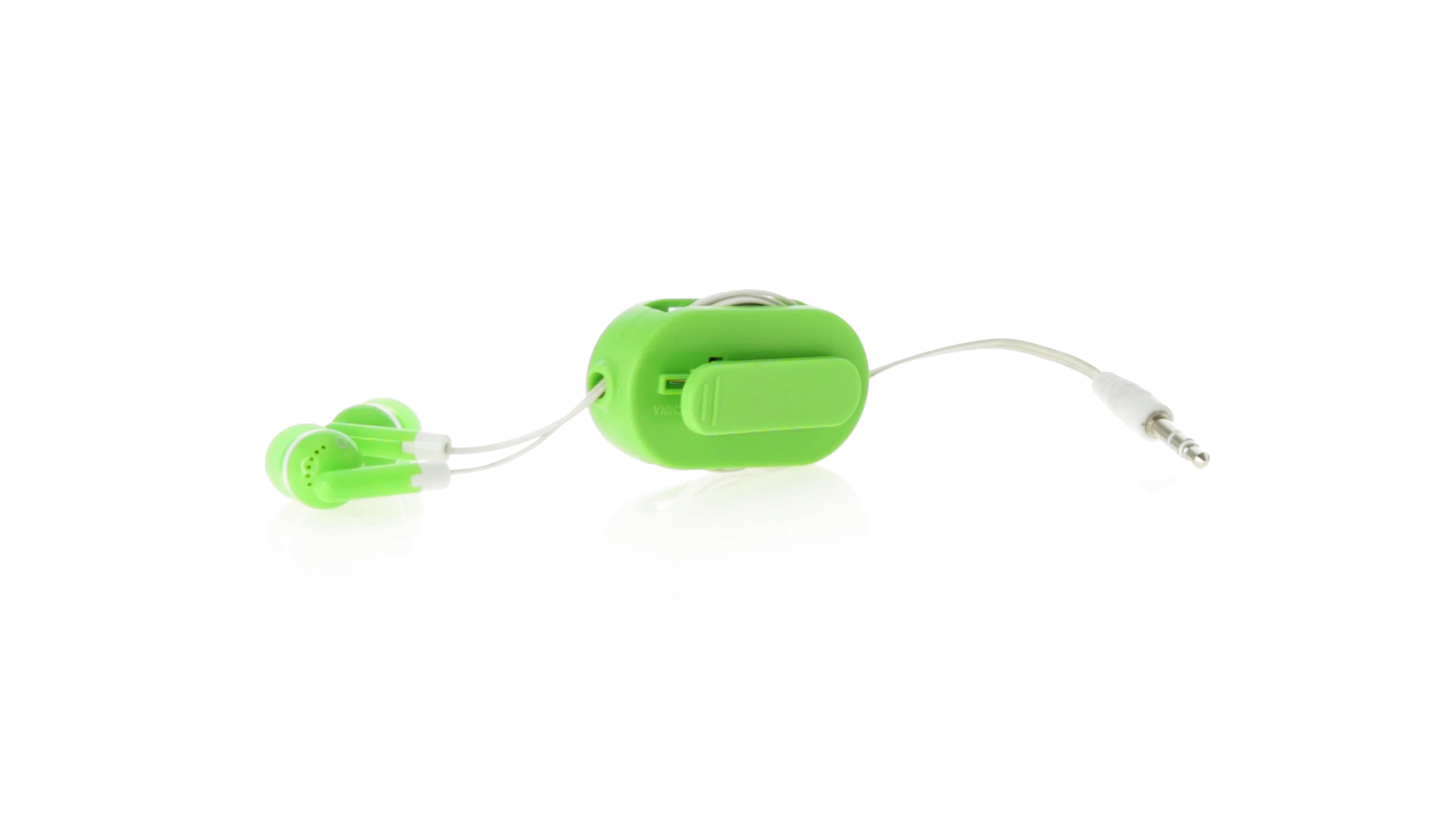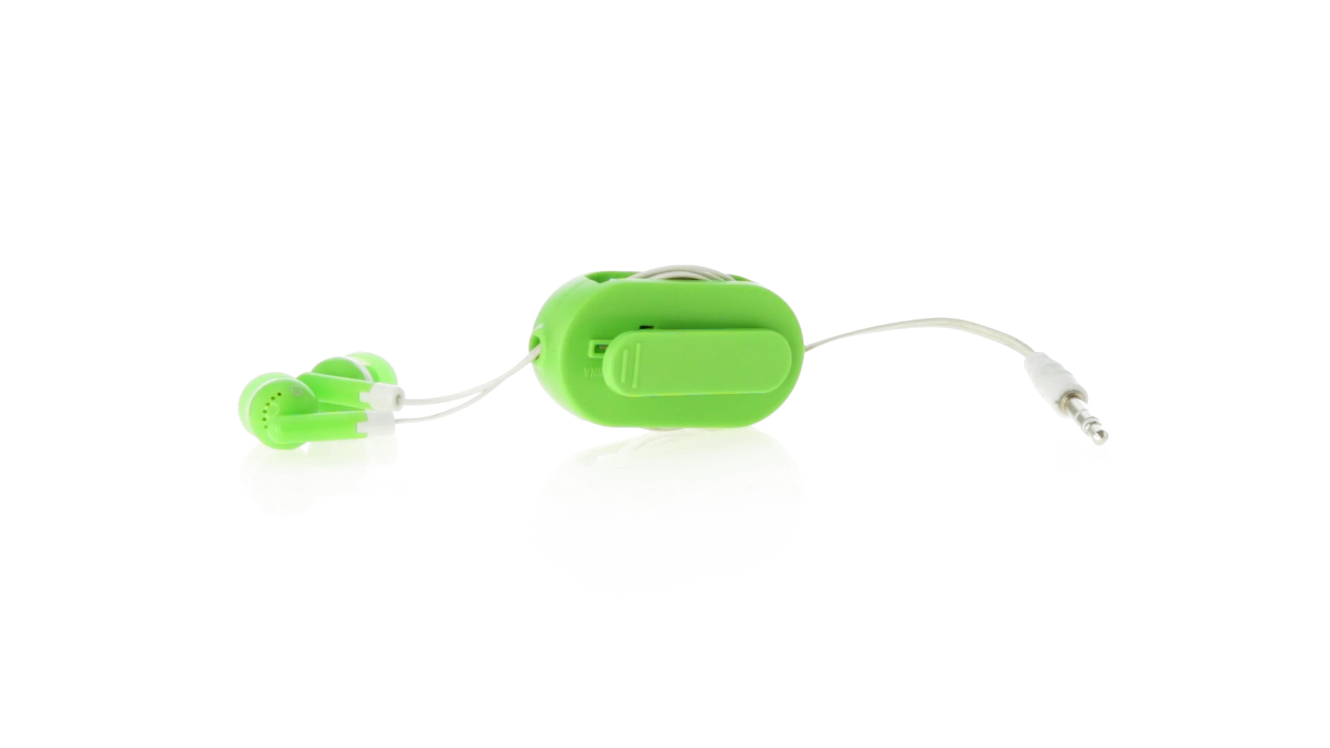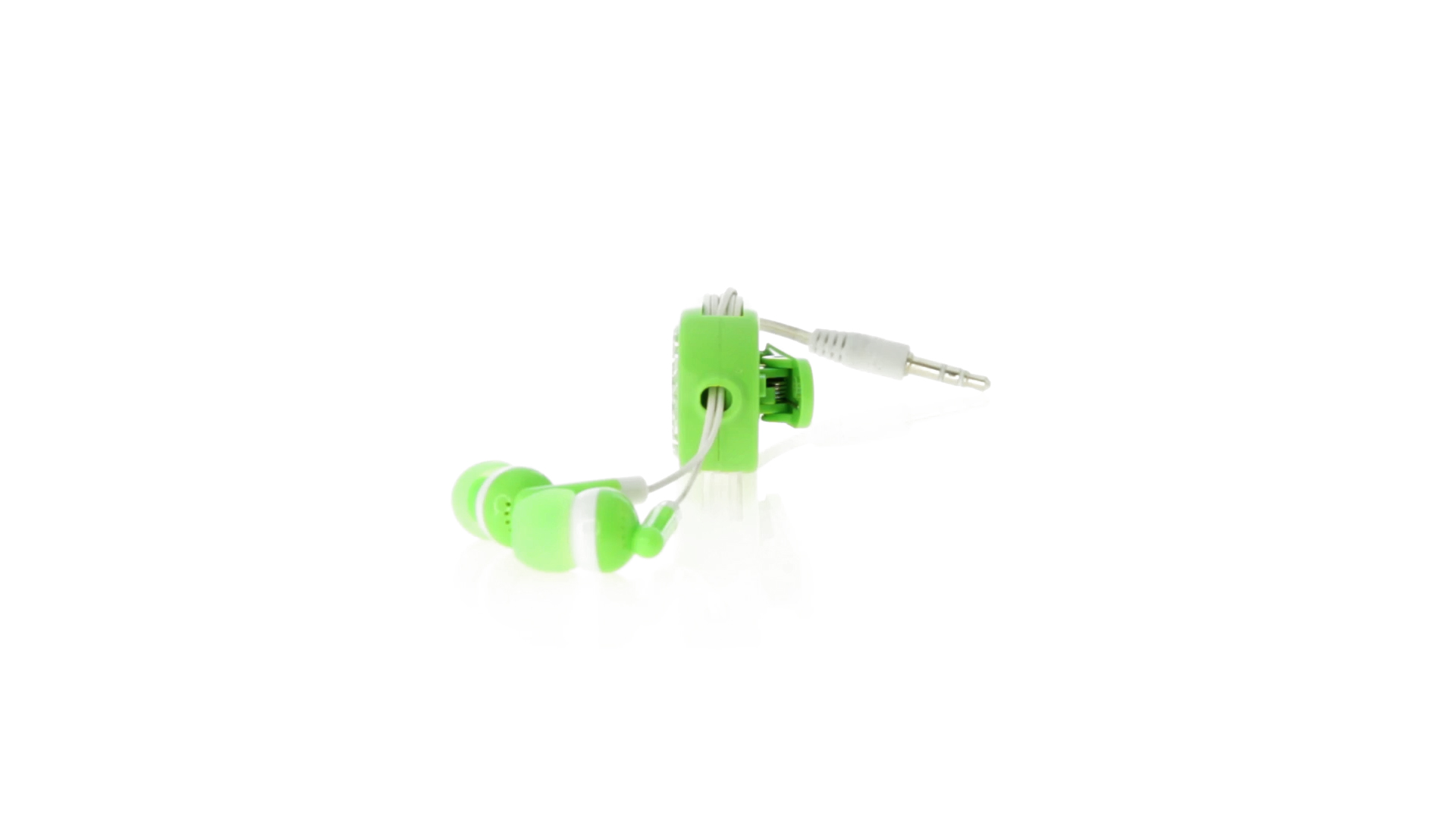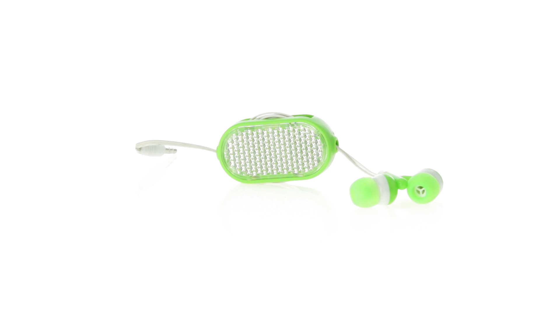 In-Ear-Kopfhörer mit sportlichem Design und reflektierendem Gehäuse in verschiedenen lebendigen Farben. Mit ausziehbarem Kabel und Clip sowie 3,5-mm-Klinkenstecker und Kabel in Weiss.