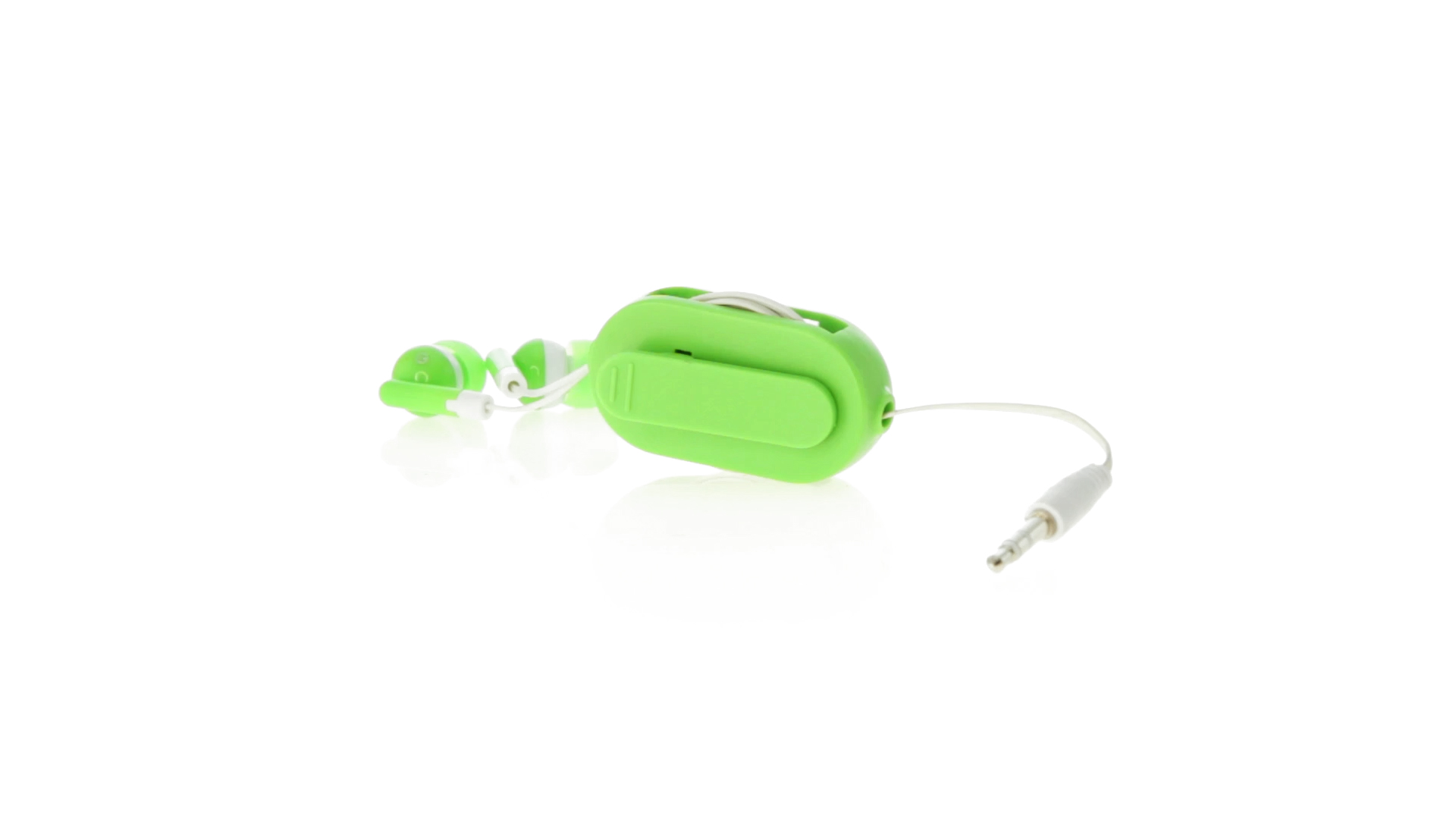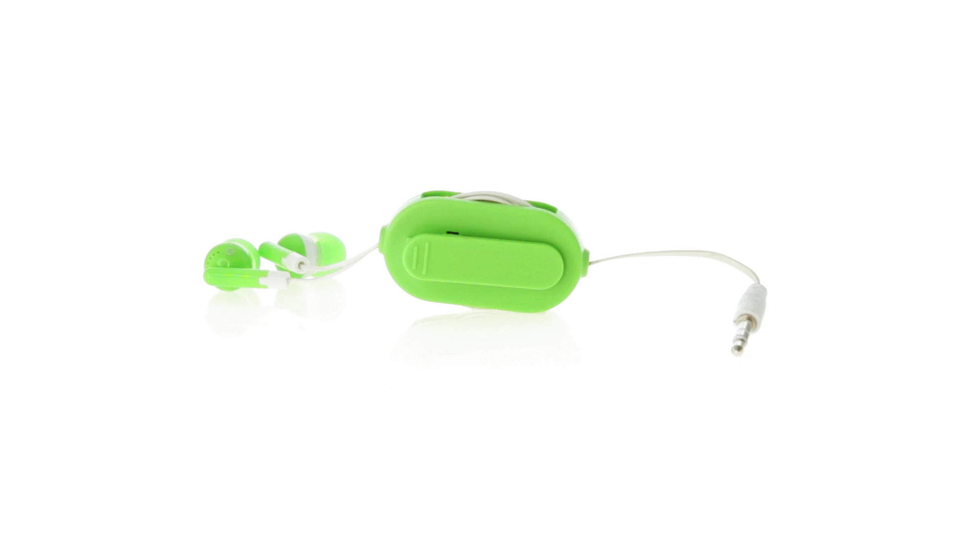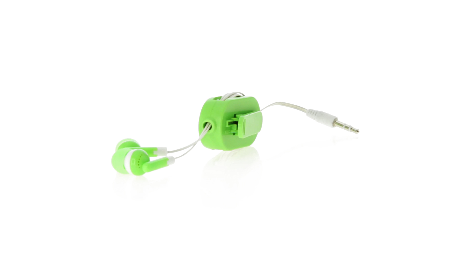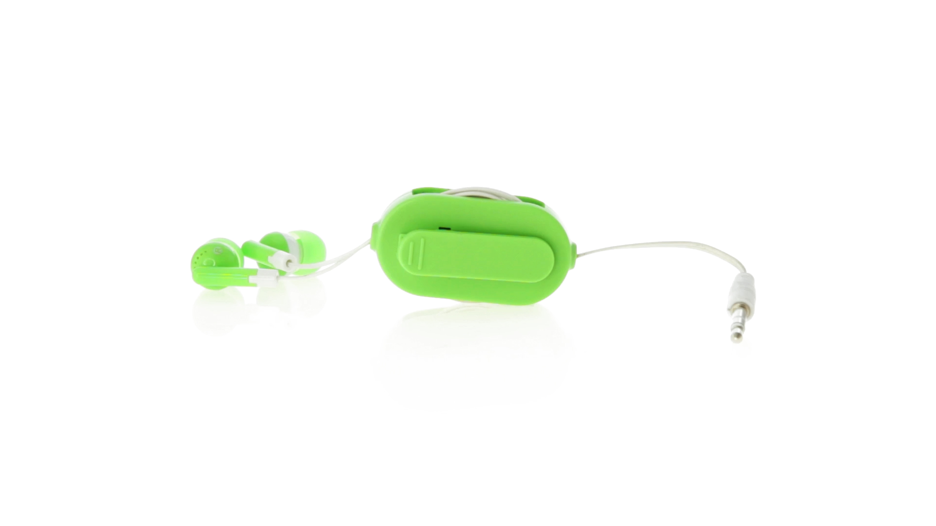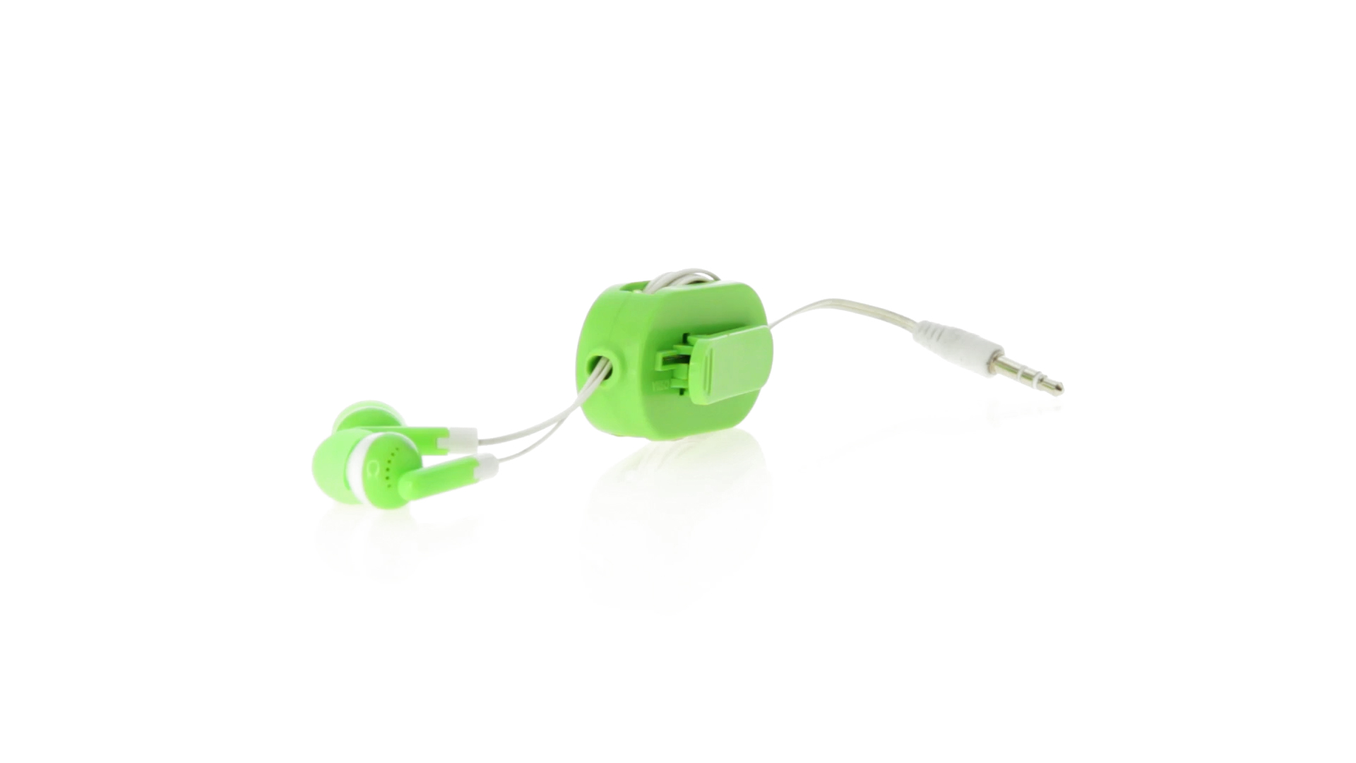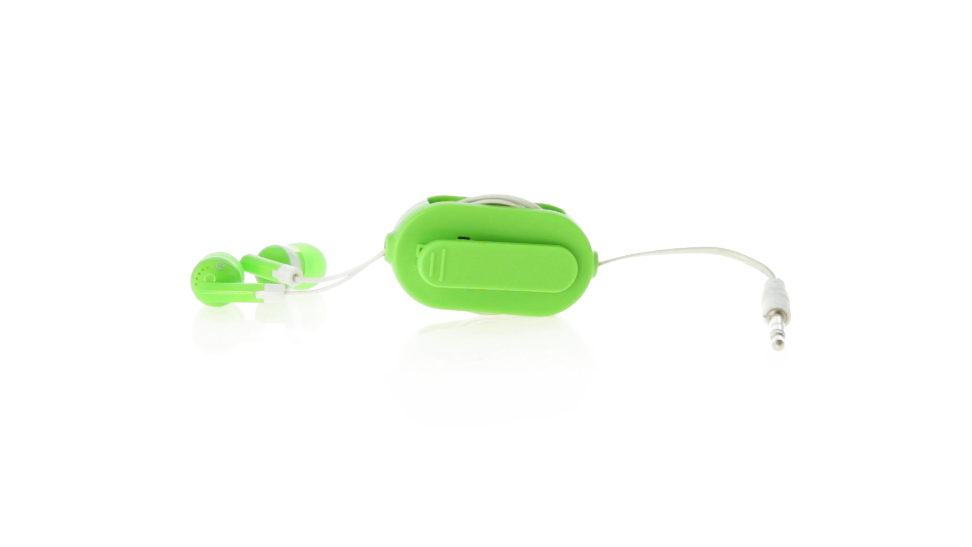 In-Ear-Kopfhörer mit sportlichem Design und reflektierendem Gehäuse in verschiedenen lebendigen Farben. Mit ausziehbarem Kabel und Clip sowie 3,5-mm-Klinkenstecker und Kabel in Weiss.