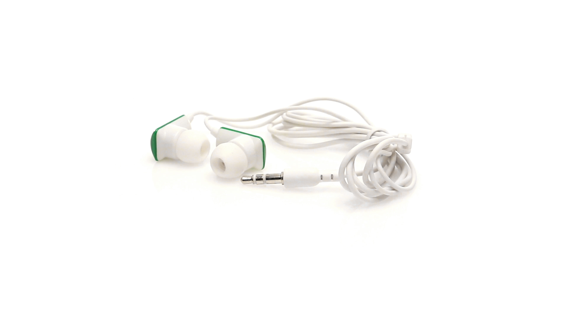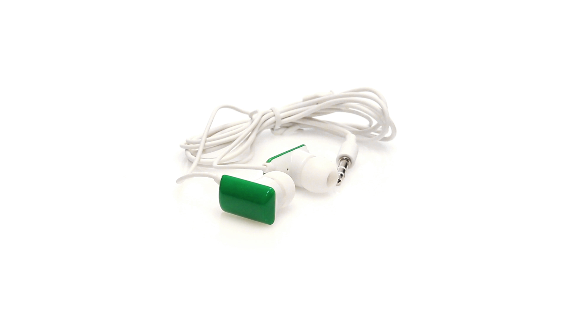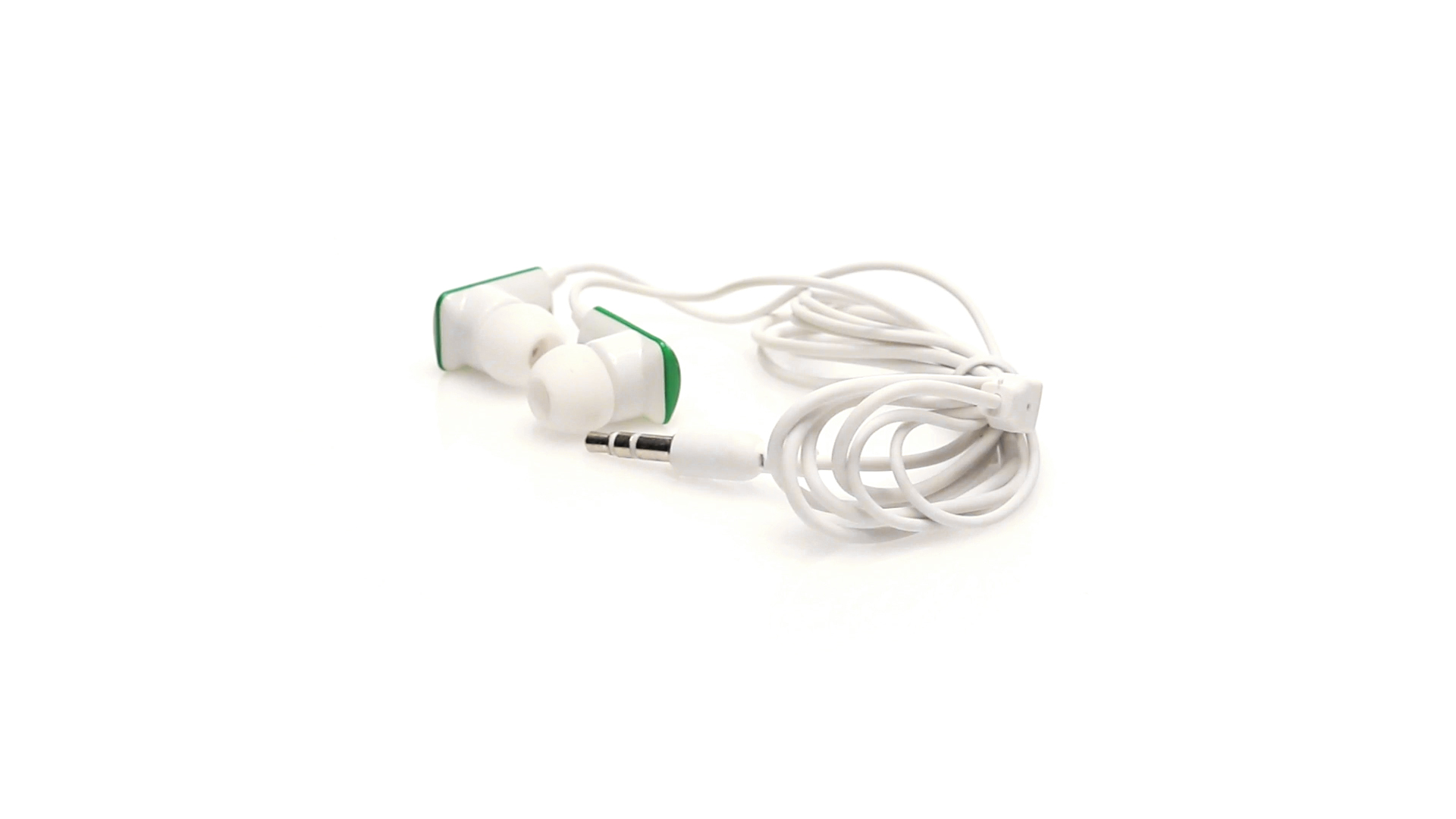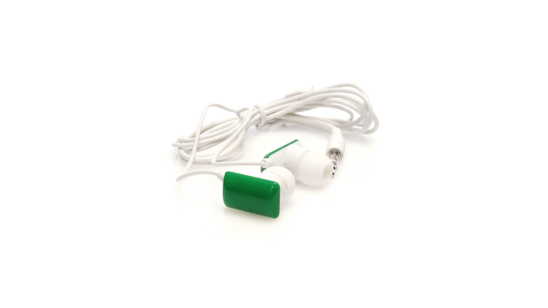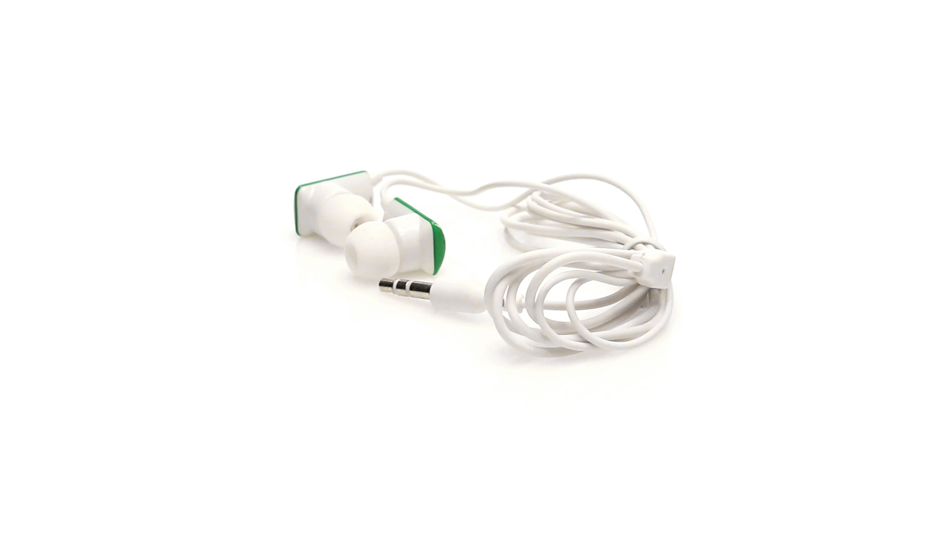 Zweifarbige In-Ear-Kopfhörer mit 3,5-mm-Klinkenanschluss und weissem Kabel. Mit rechteckigen Druckflächen für Tampondruck. Präsentiert in einer individuellen Kartonschachtel.