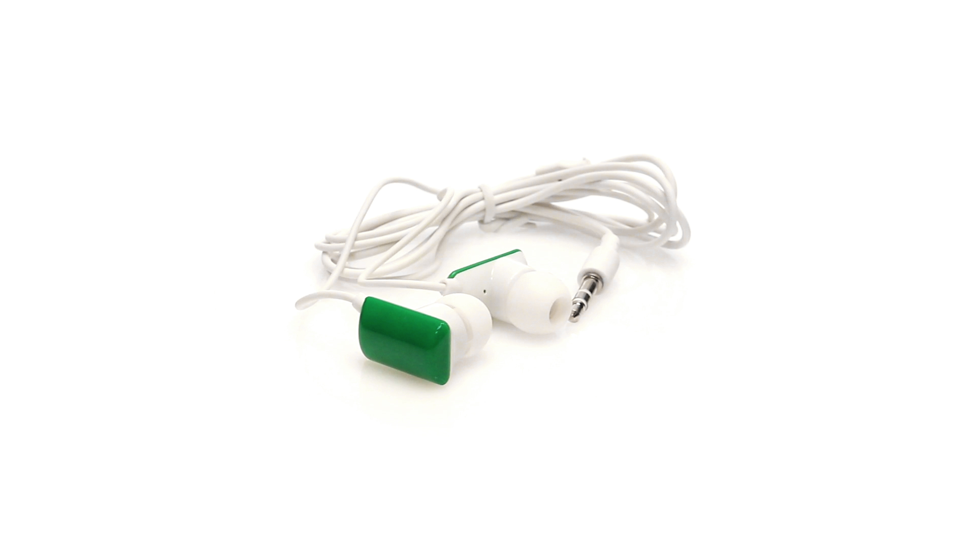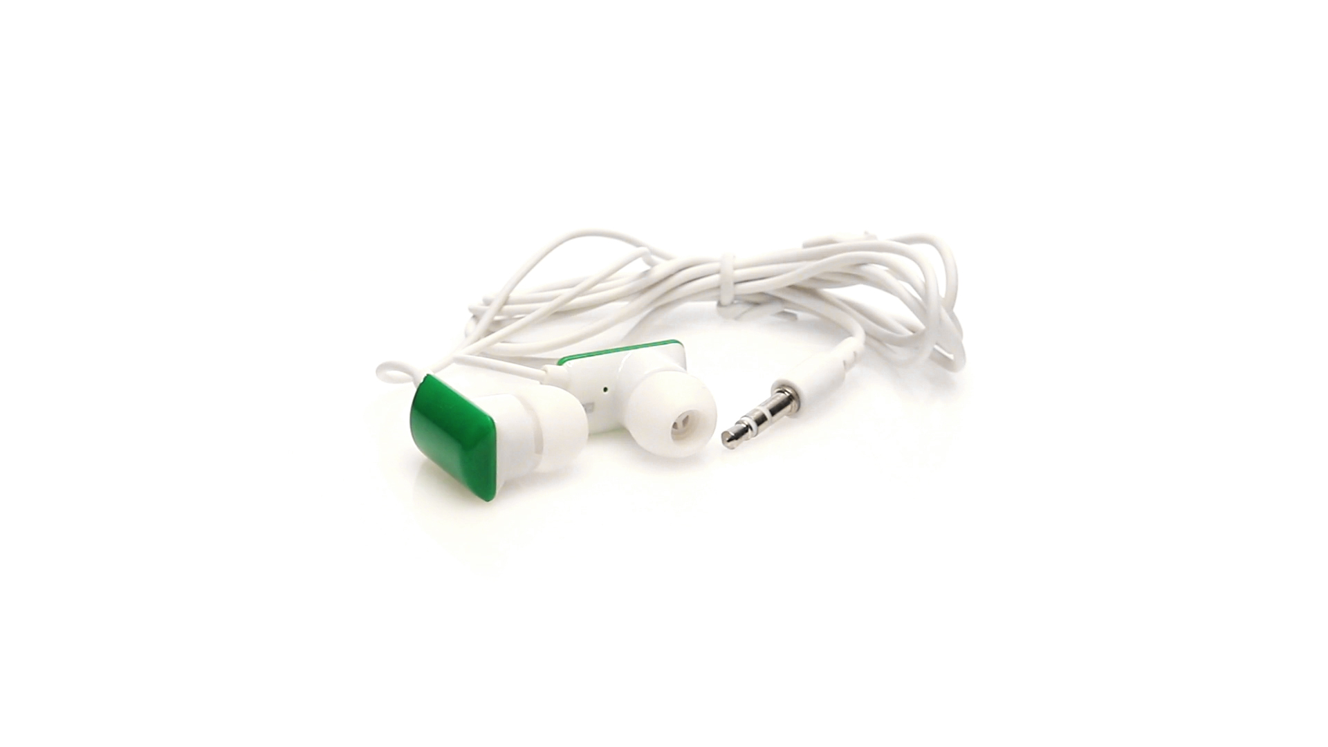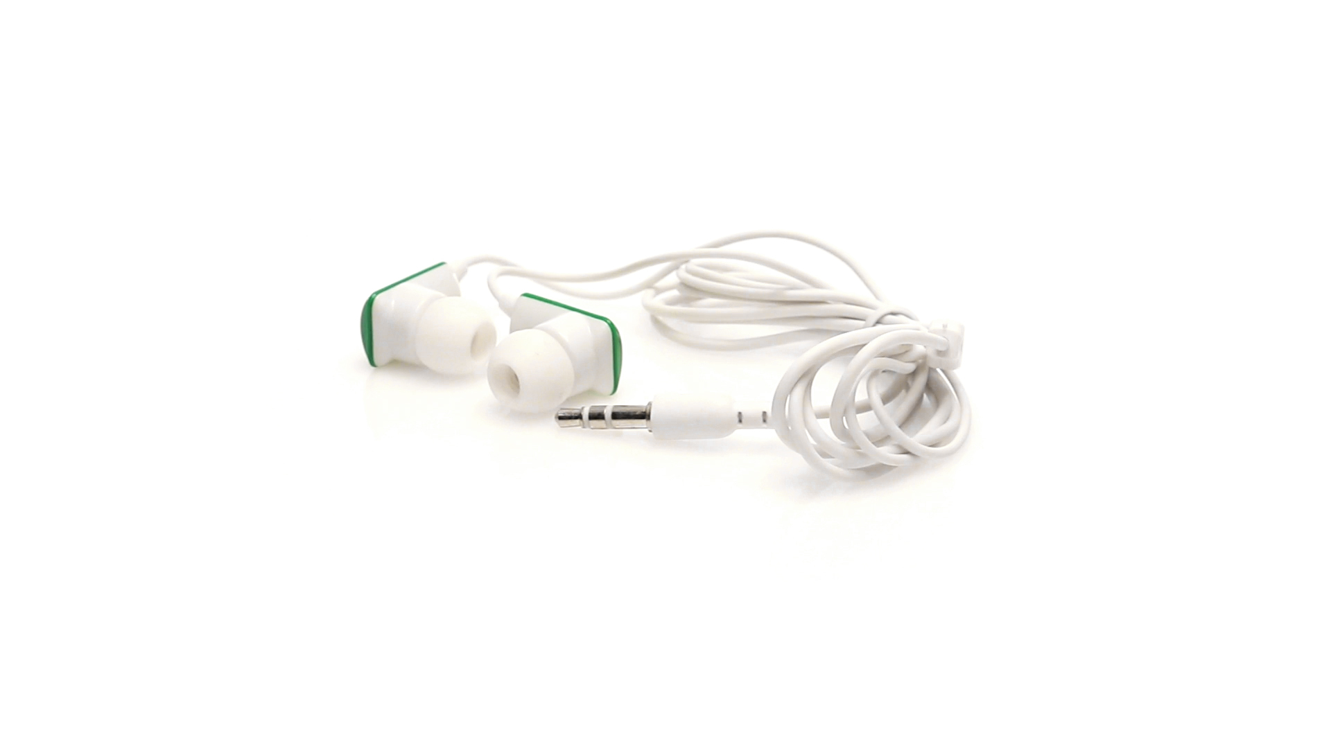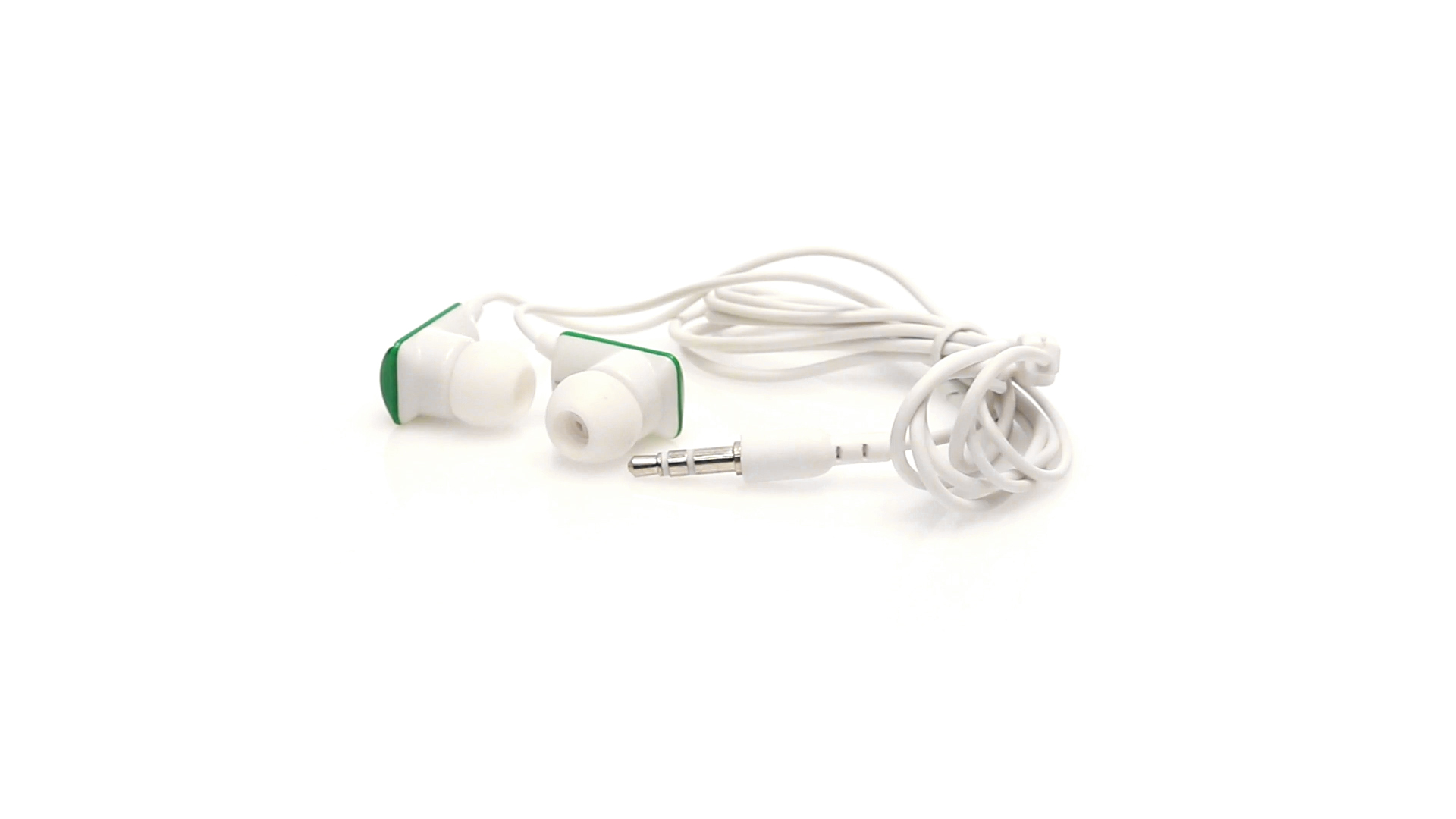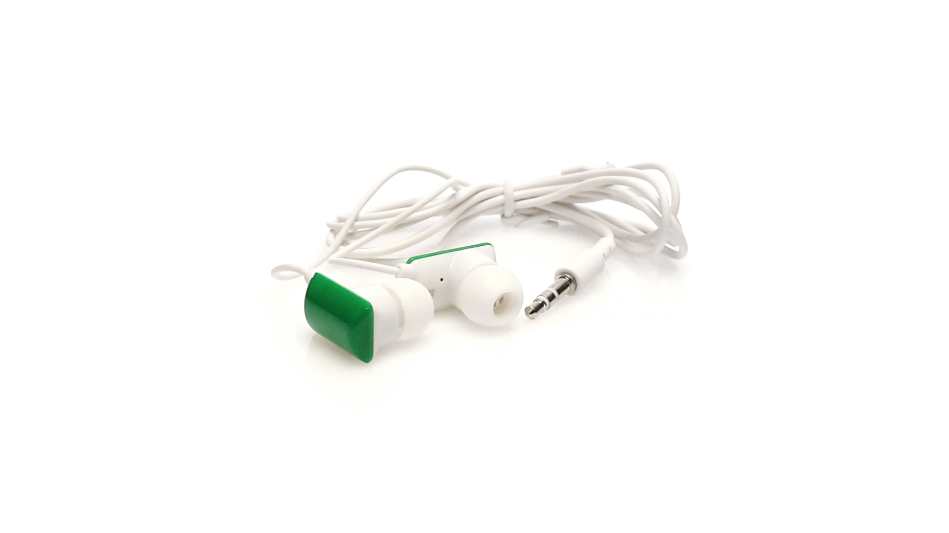 Zweifarbige In-Ear-Kopfhörer mit 3,5-mm-Klinkenanschluss und weissem Kabel. Mit rechteckigen Druckflächen für Tampondruck. Präsentiert in einer individuellen Kartonschachtel.