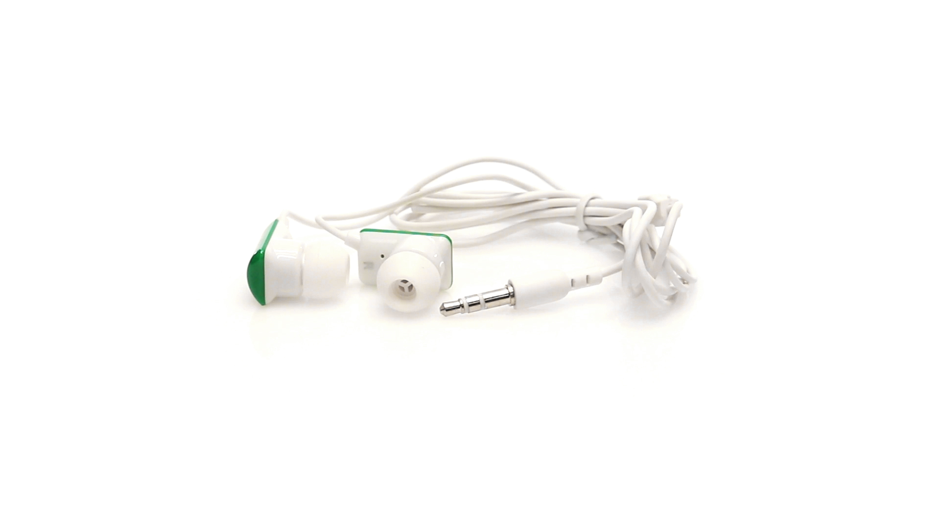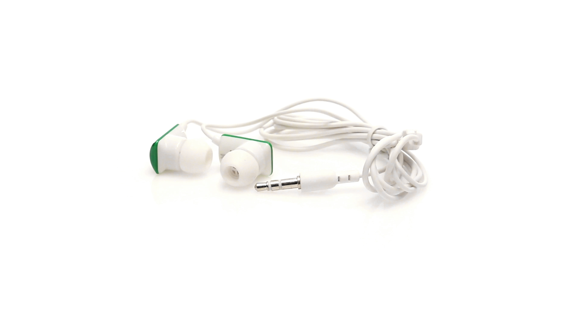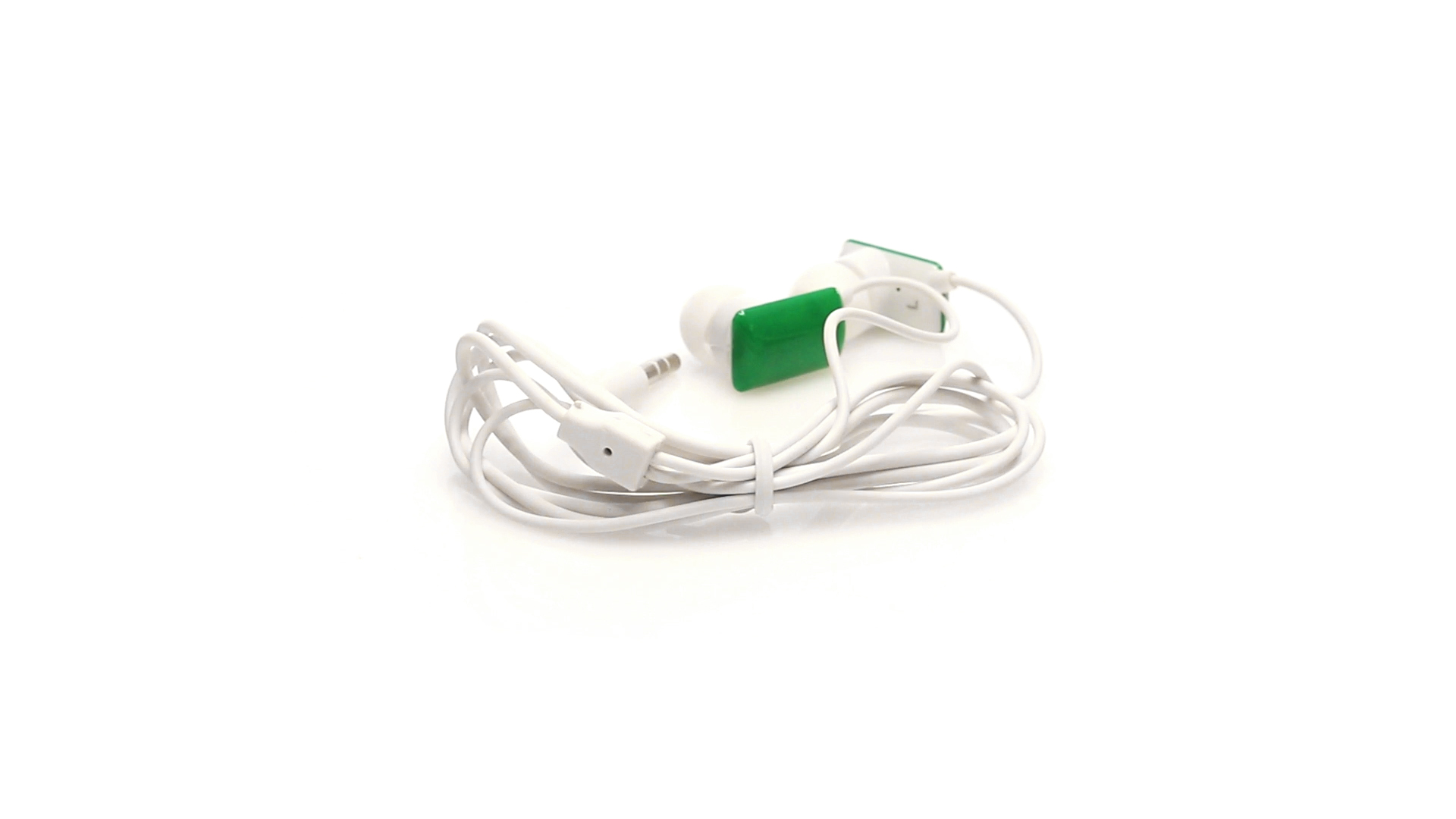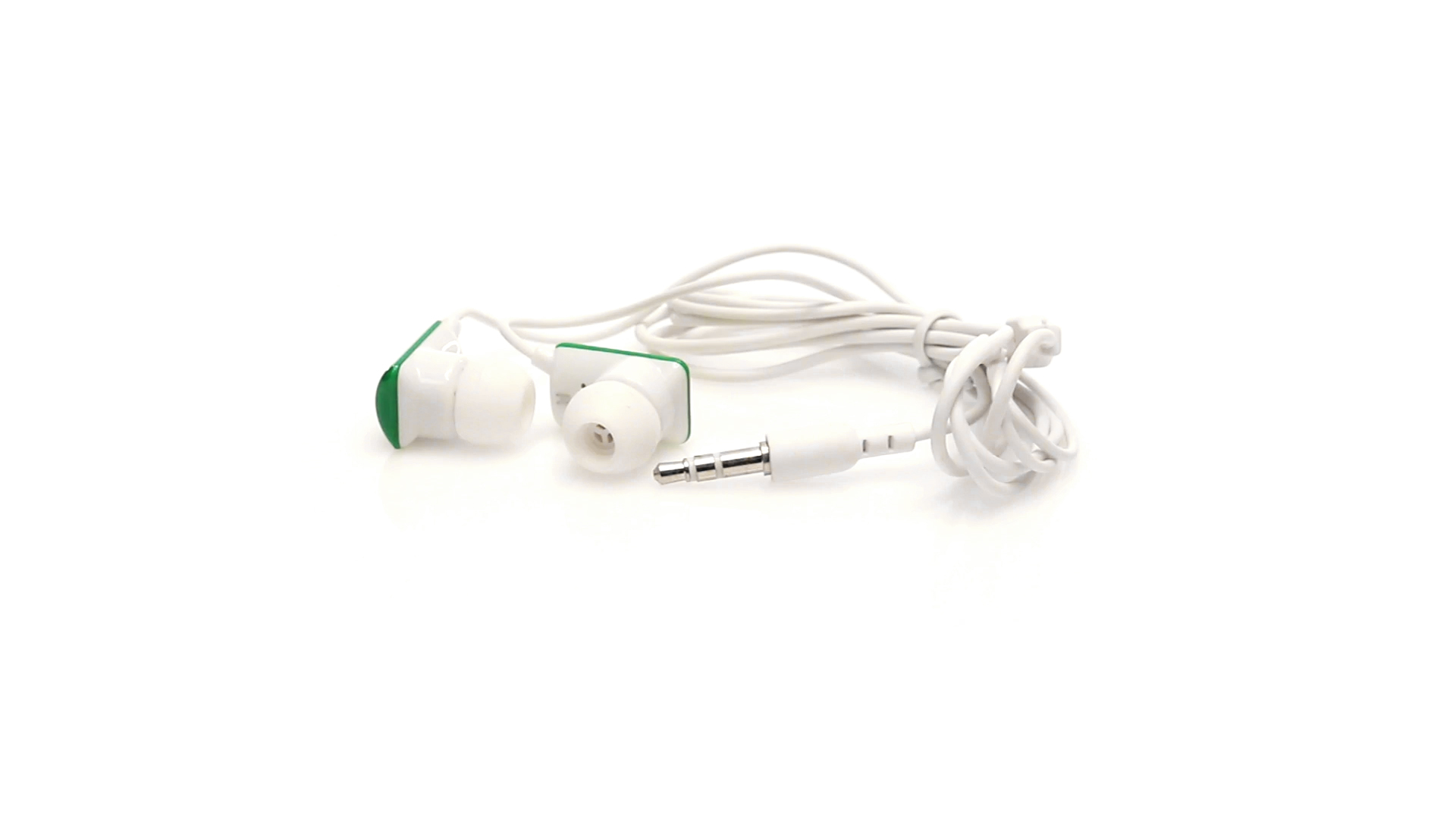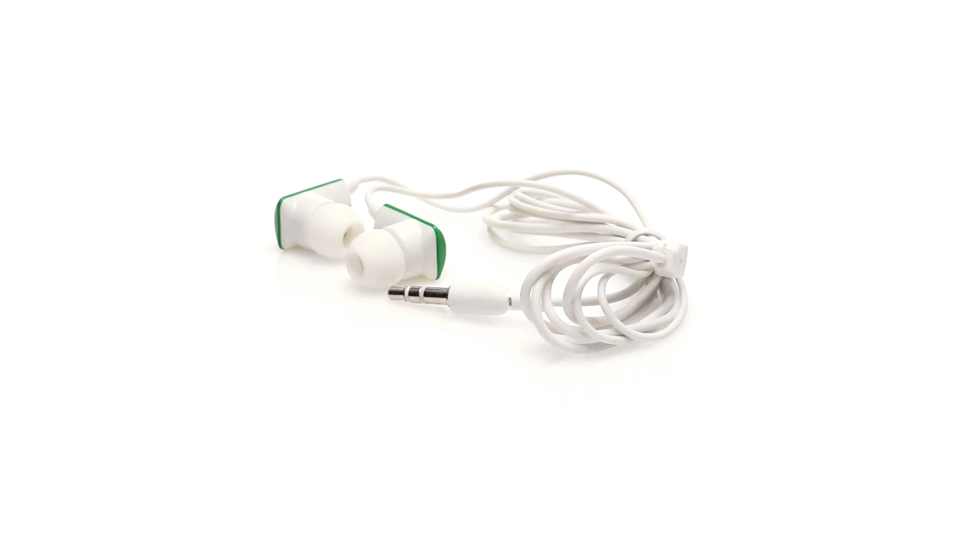 Zweifarbige In-Ear-Kopfhörer mit 3,5-mm-Klinkenanschluss und weissem Kabel. Mit rechteckigen Druckflächen für Tampondruck. Präsentiert in einer individuellen Kartonschachtel.