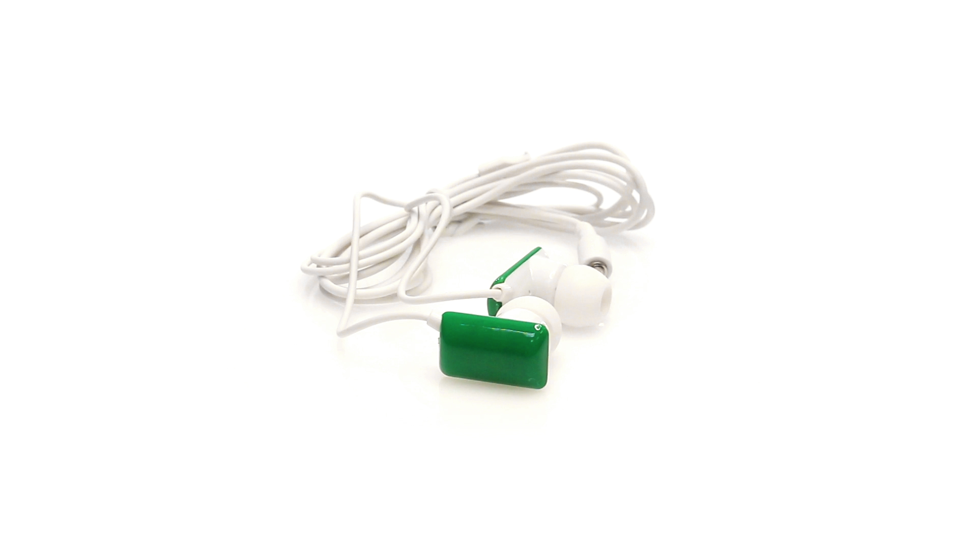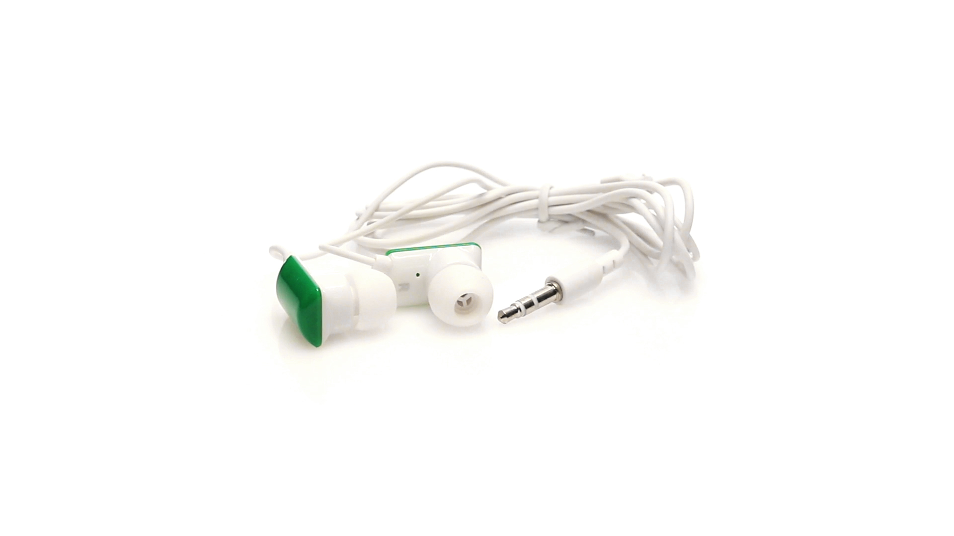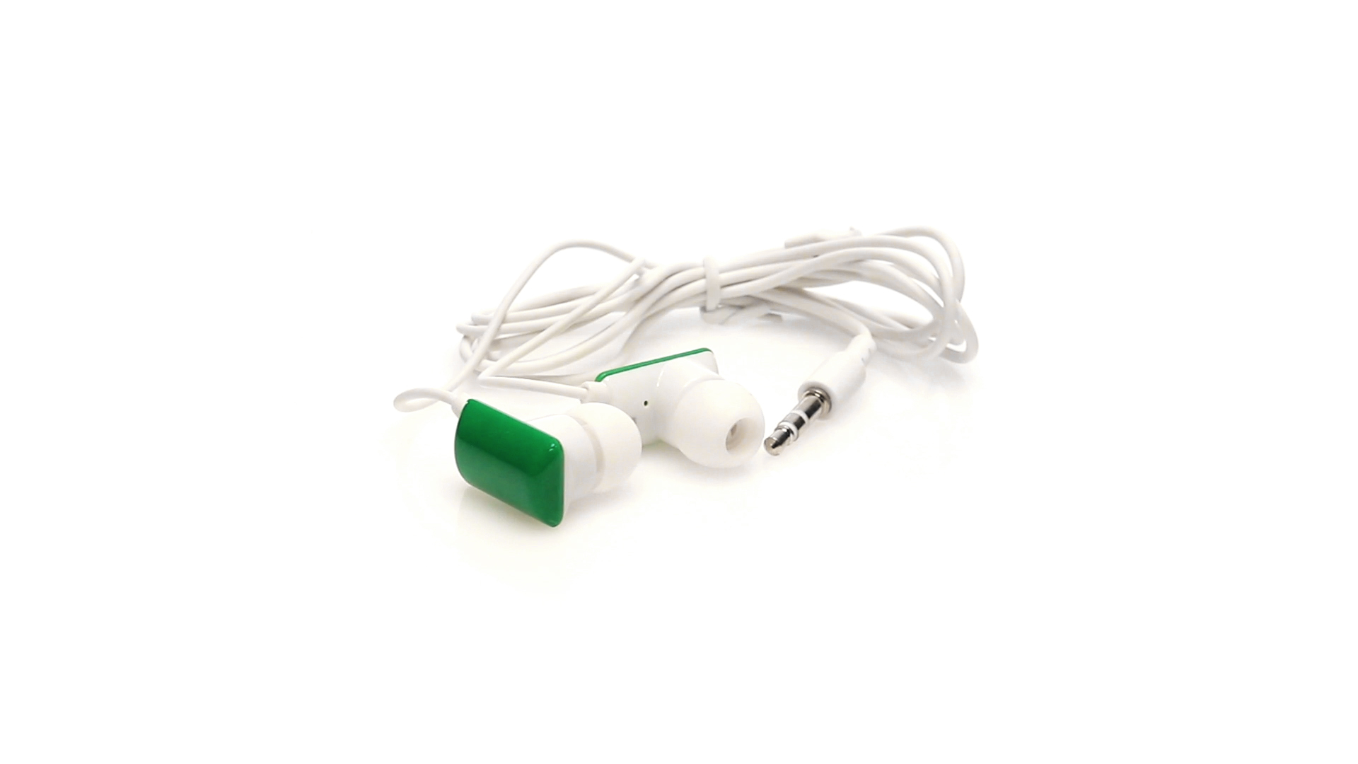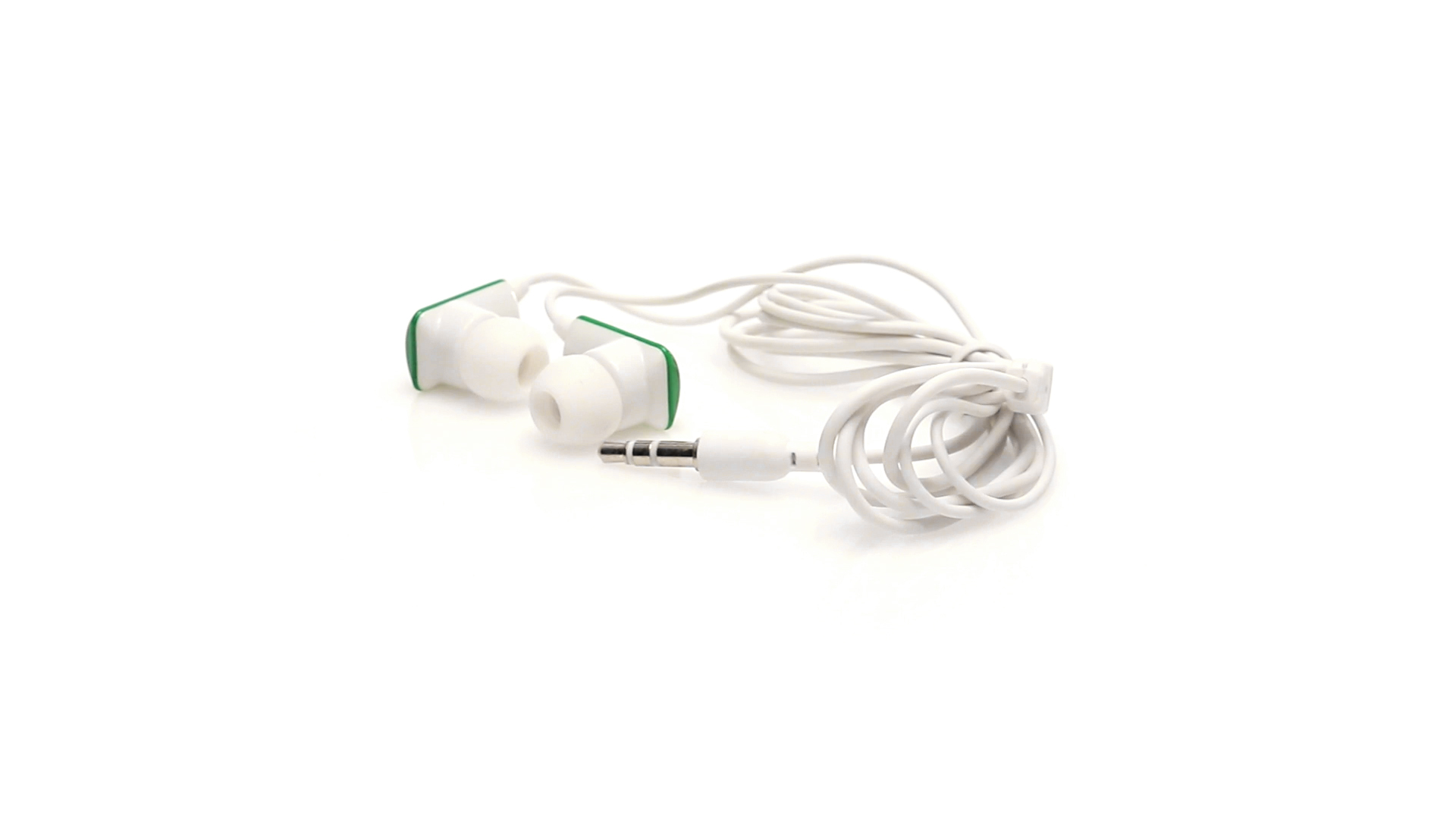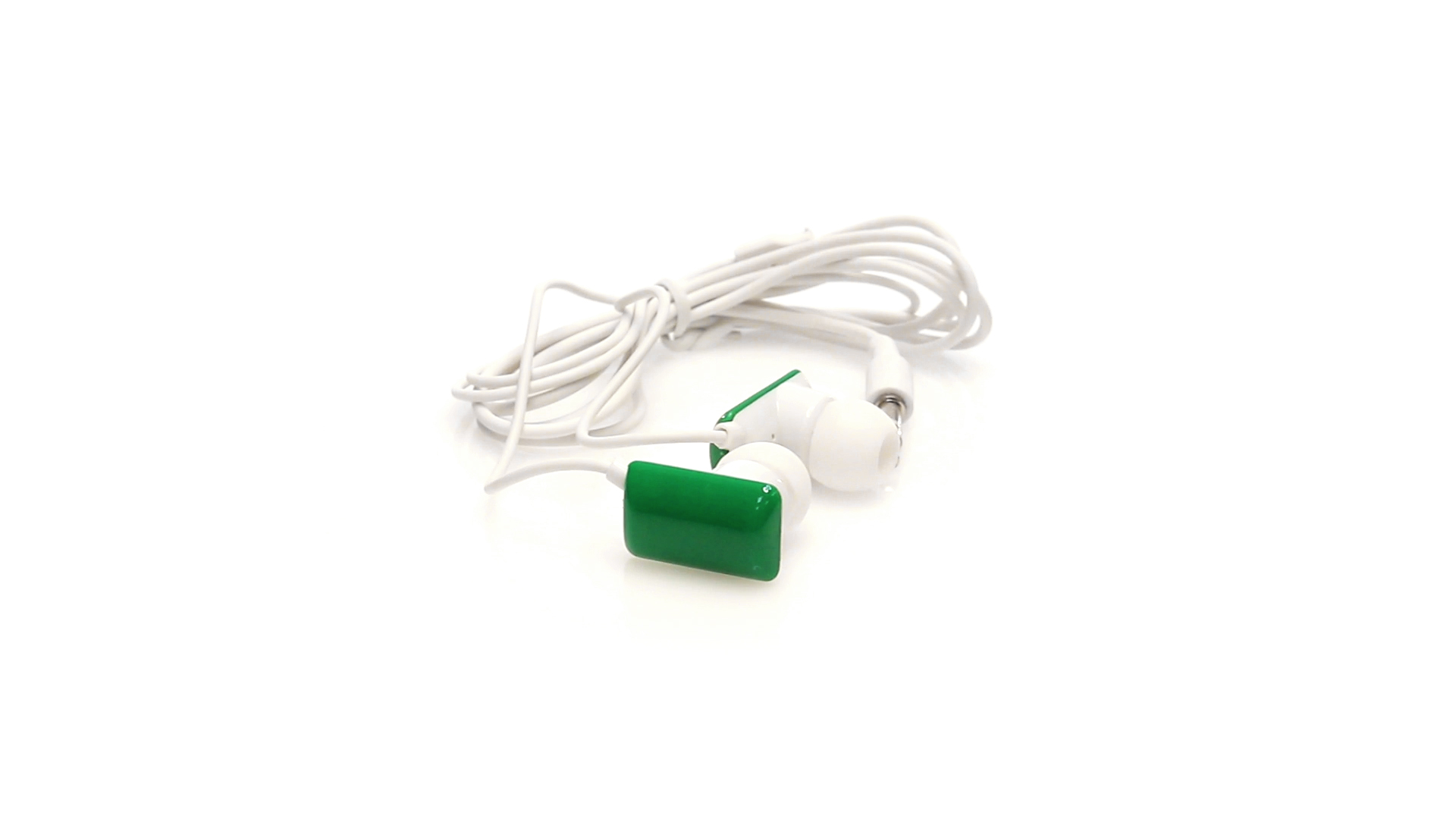 Zweifarbige In-Ear-Kopfhörer mit 3,5-mm-Klinkenanschluss und weissem Kabel. Mit rechteckigen Druckflächen für Tampondruck. Präsentiert in einer individuellen Kartonschachtel.