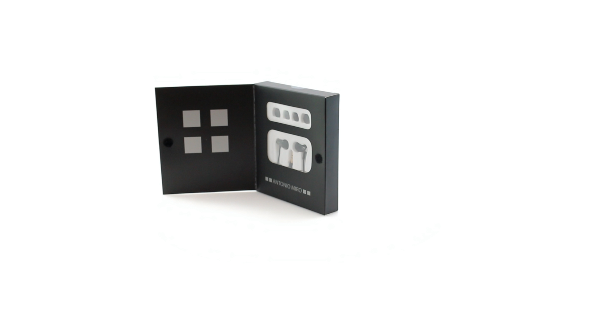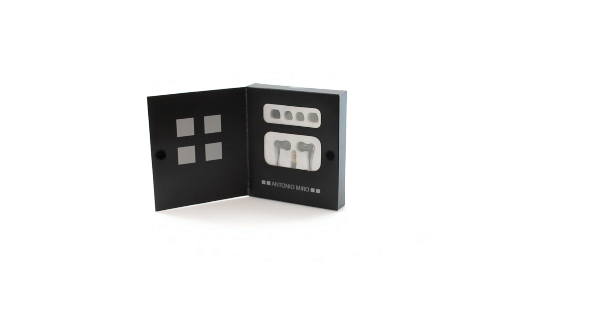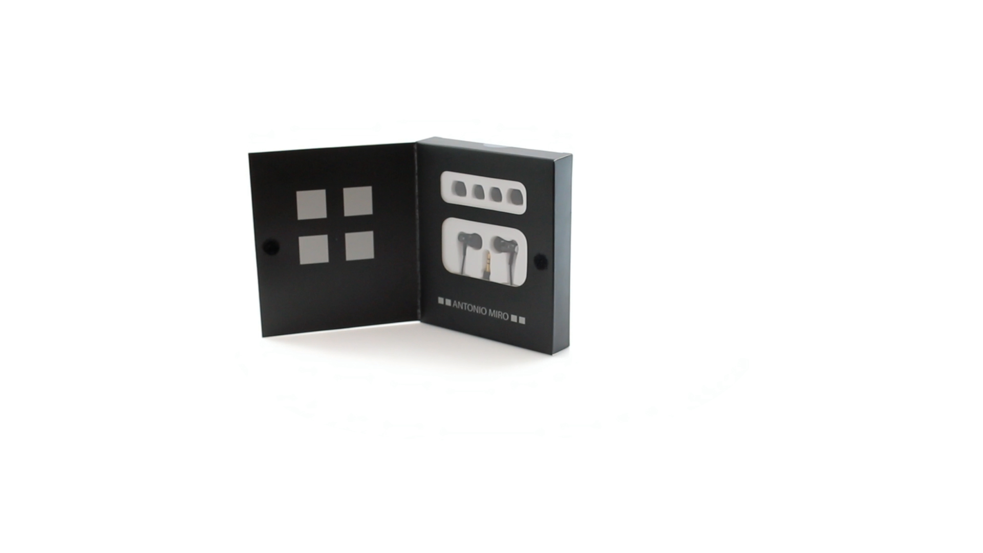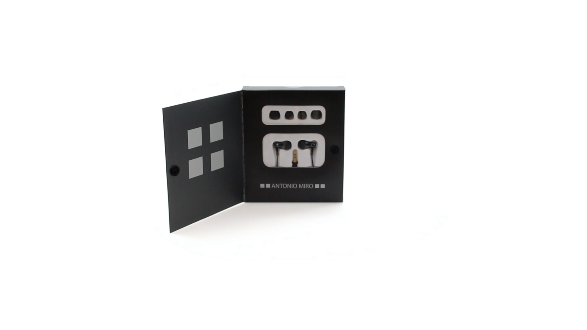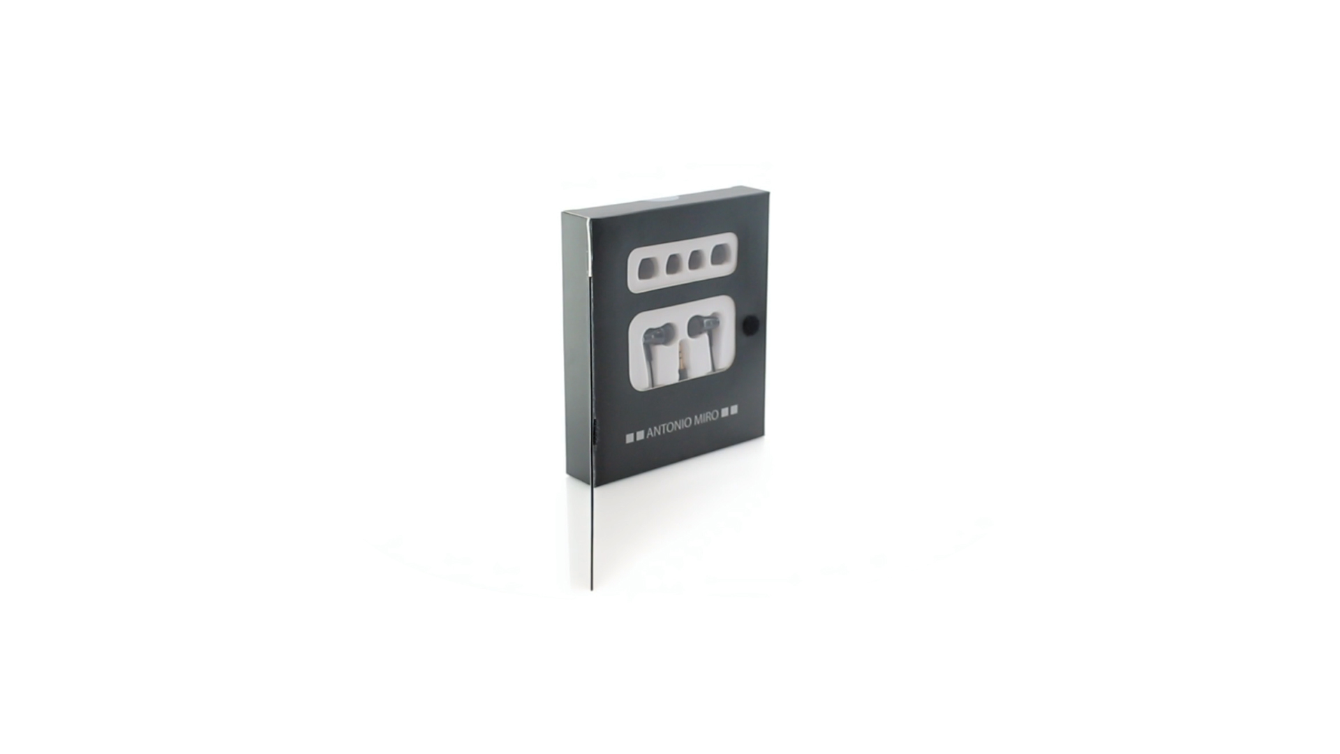 In-Ear-Kopfhörer von Antonio Miró mit minimalistischem Design in Schwarz und angenehm geschmeidiger Oberfläche. Mit farblich passendem Kabel, 3,5-mm-Klinkenstecker und Ersatzpolstern. Präsentiert in einer attraktiven Designbox mit dem Markenlogo.