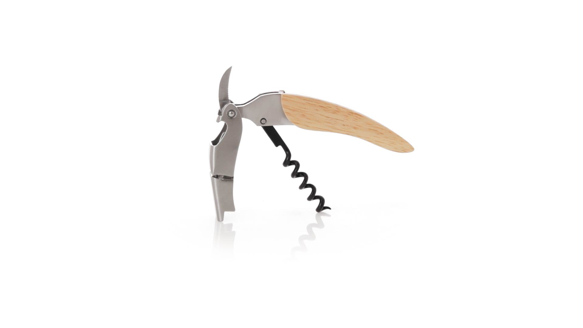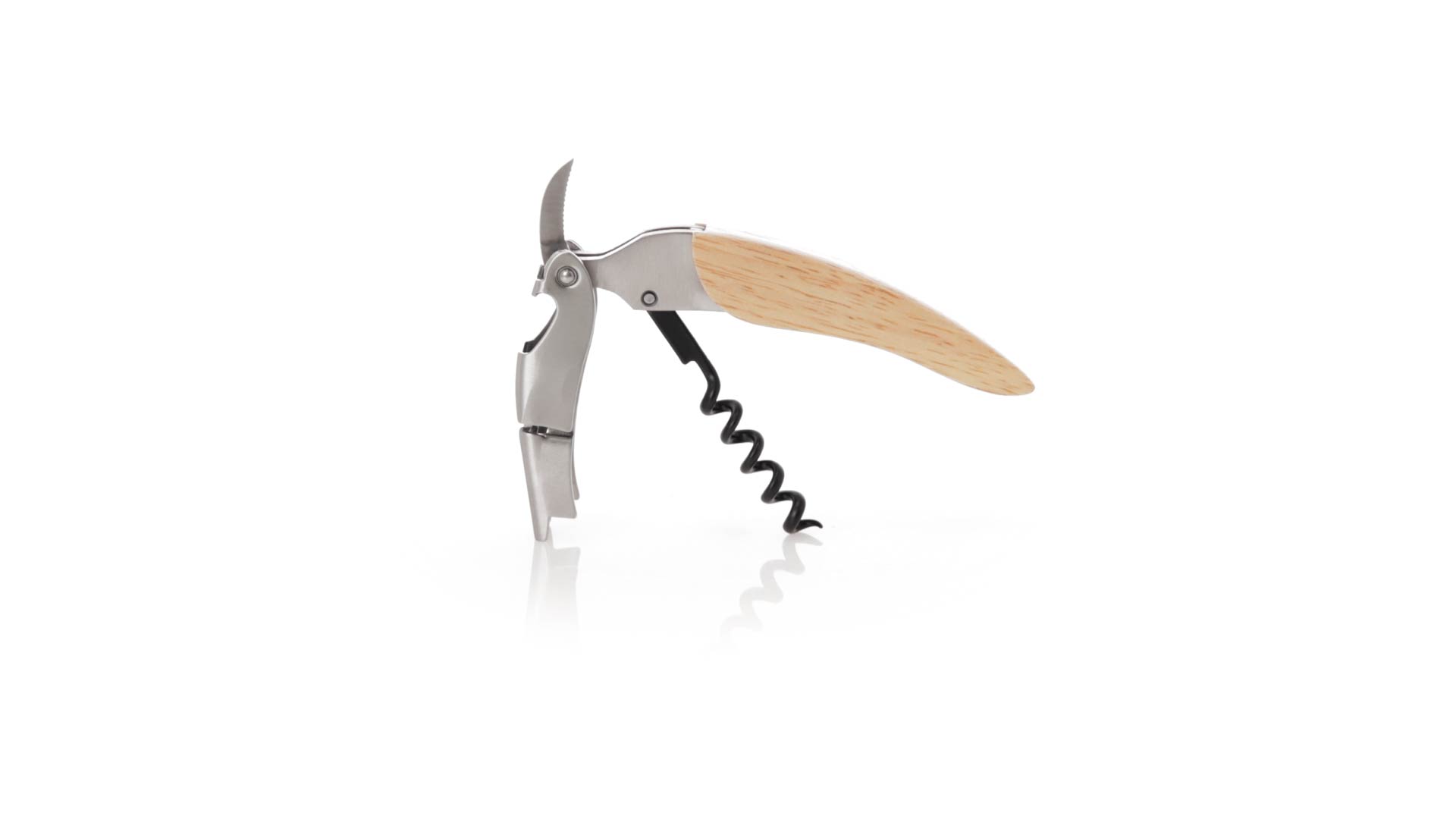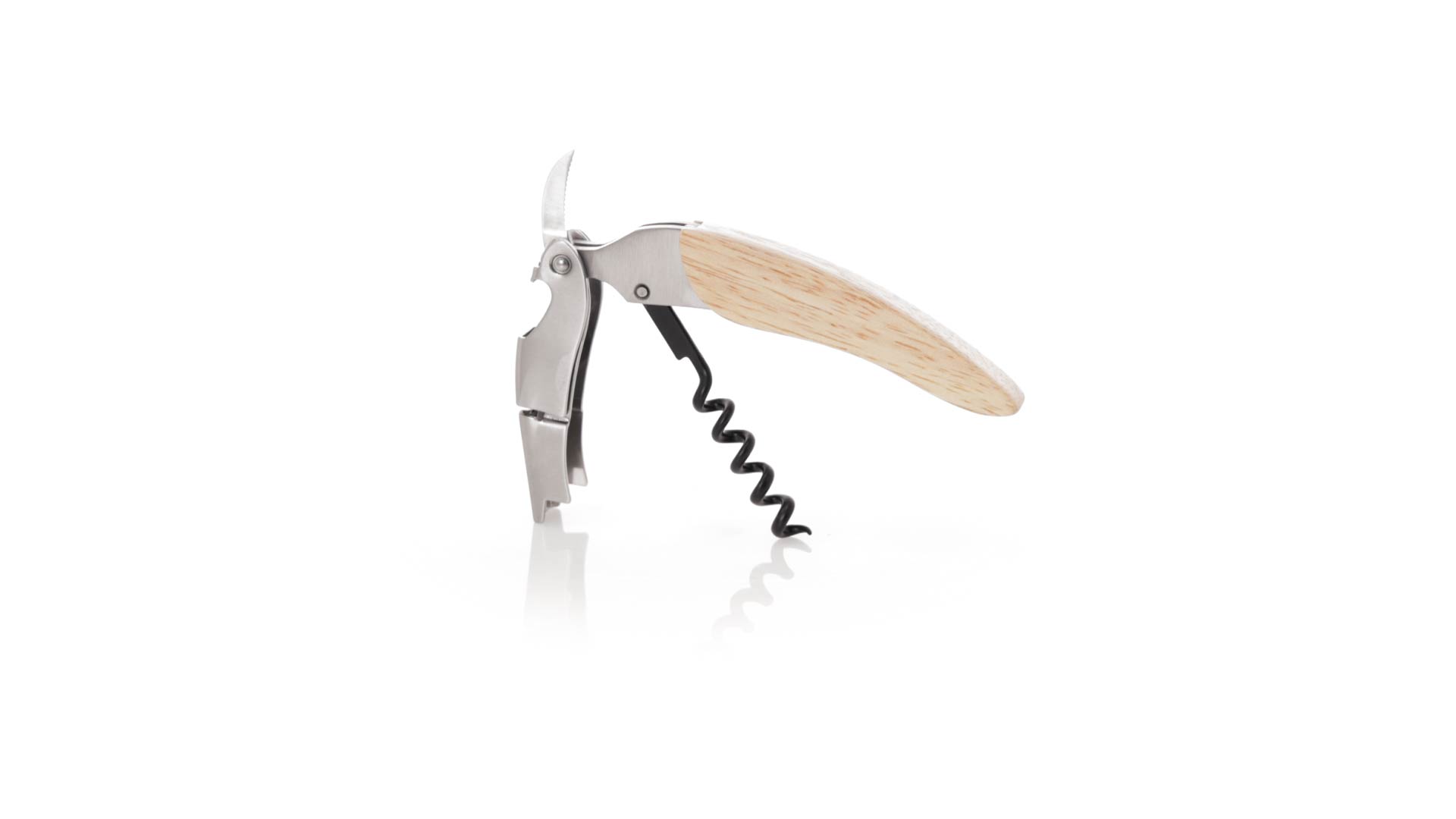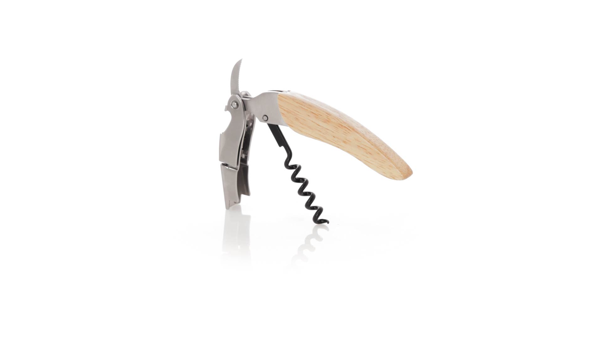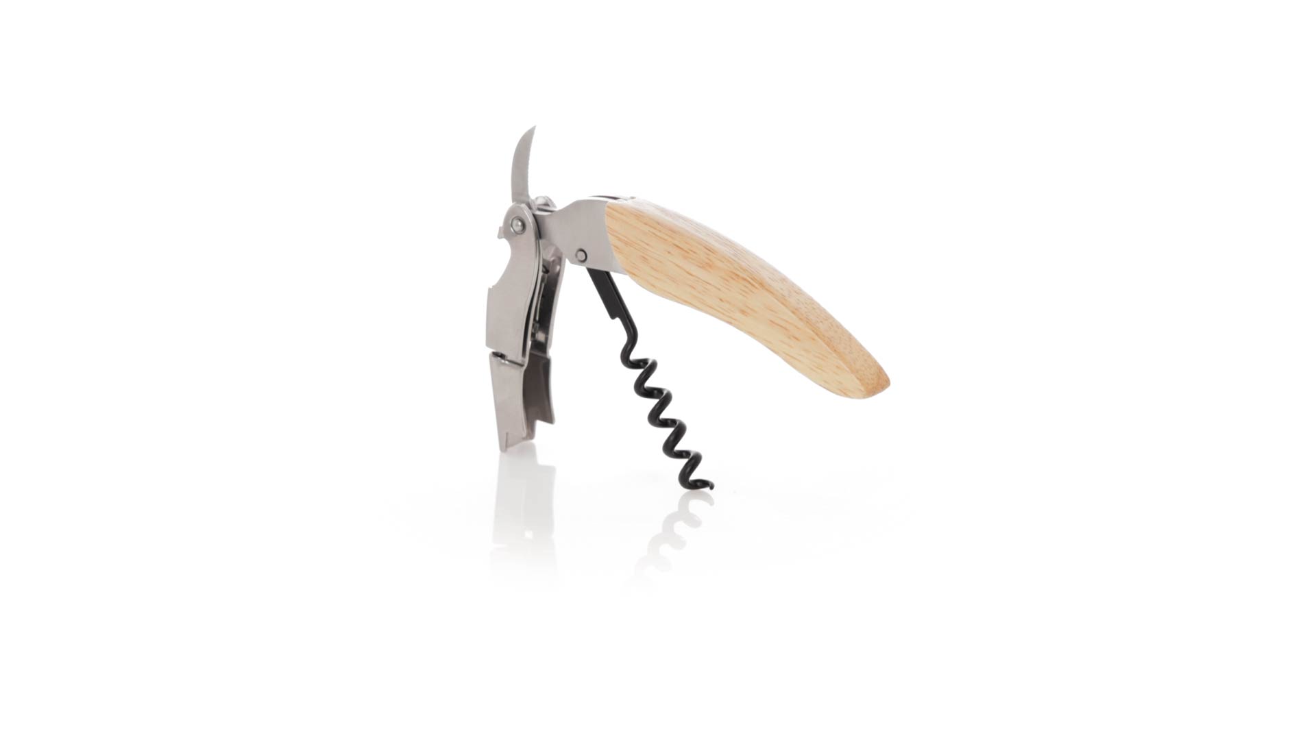 Korkenzieher aus Edelstahl, mit weichem Holzgriff und integriertem Kapselschneider. Präsentiert in einer individuellen Kraft-Designbox.