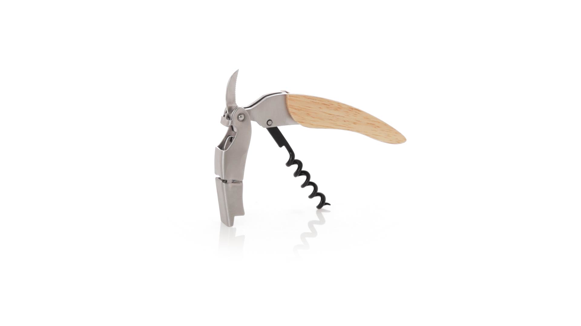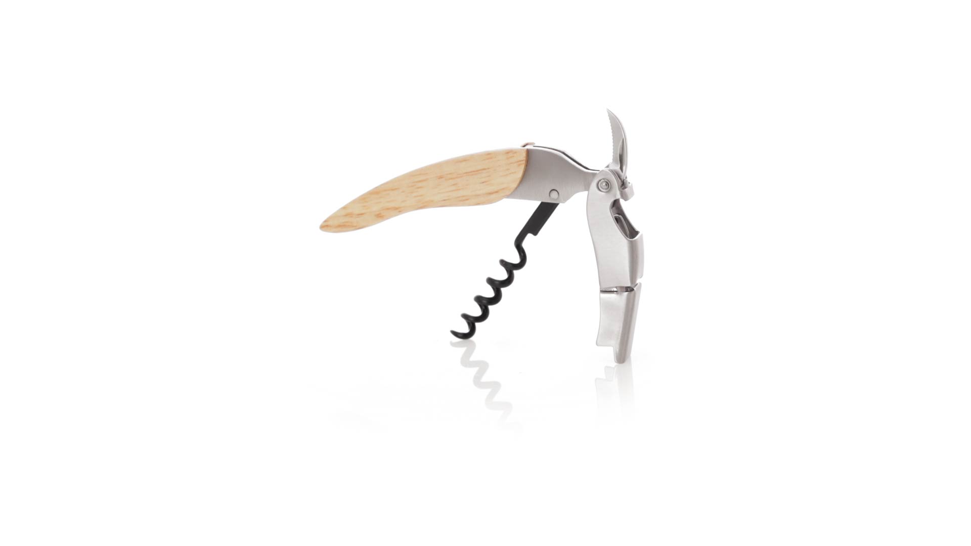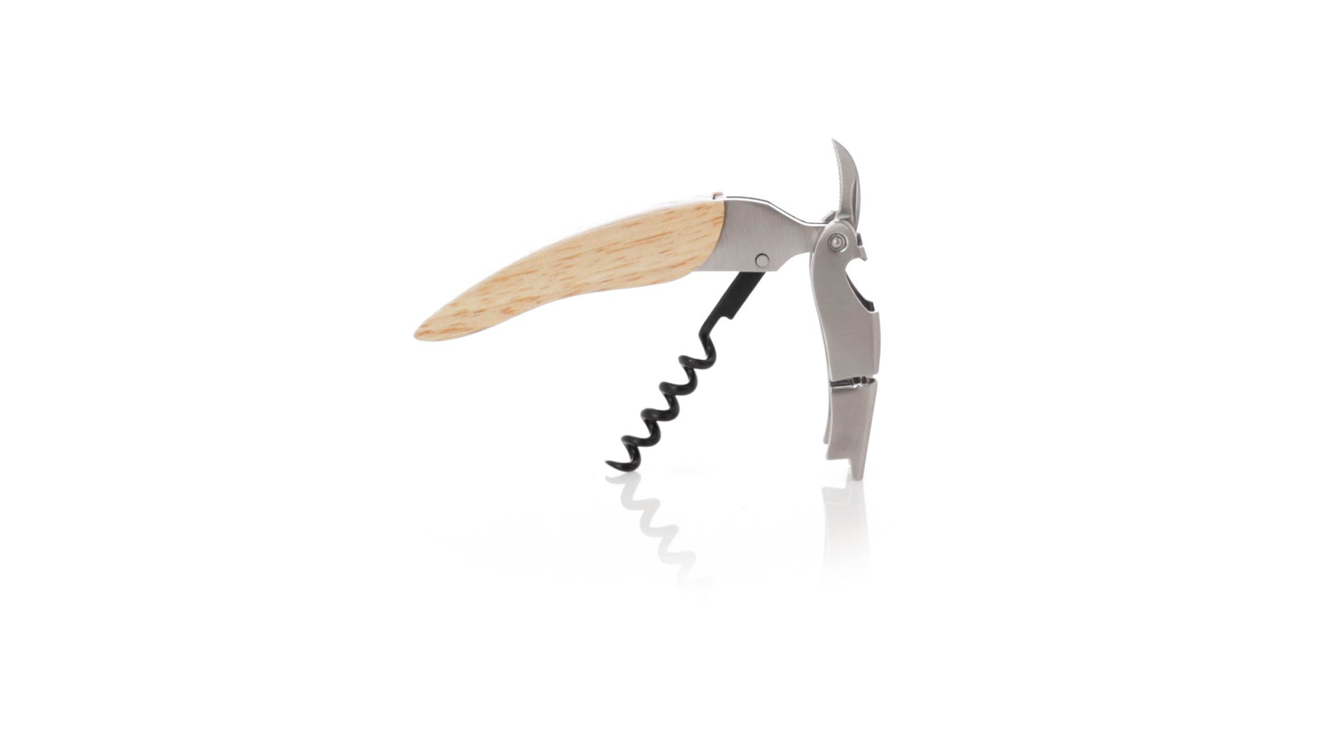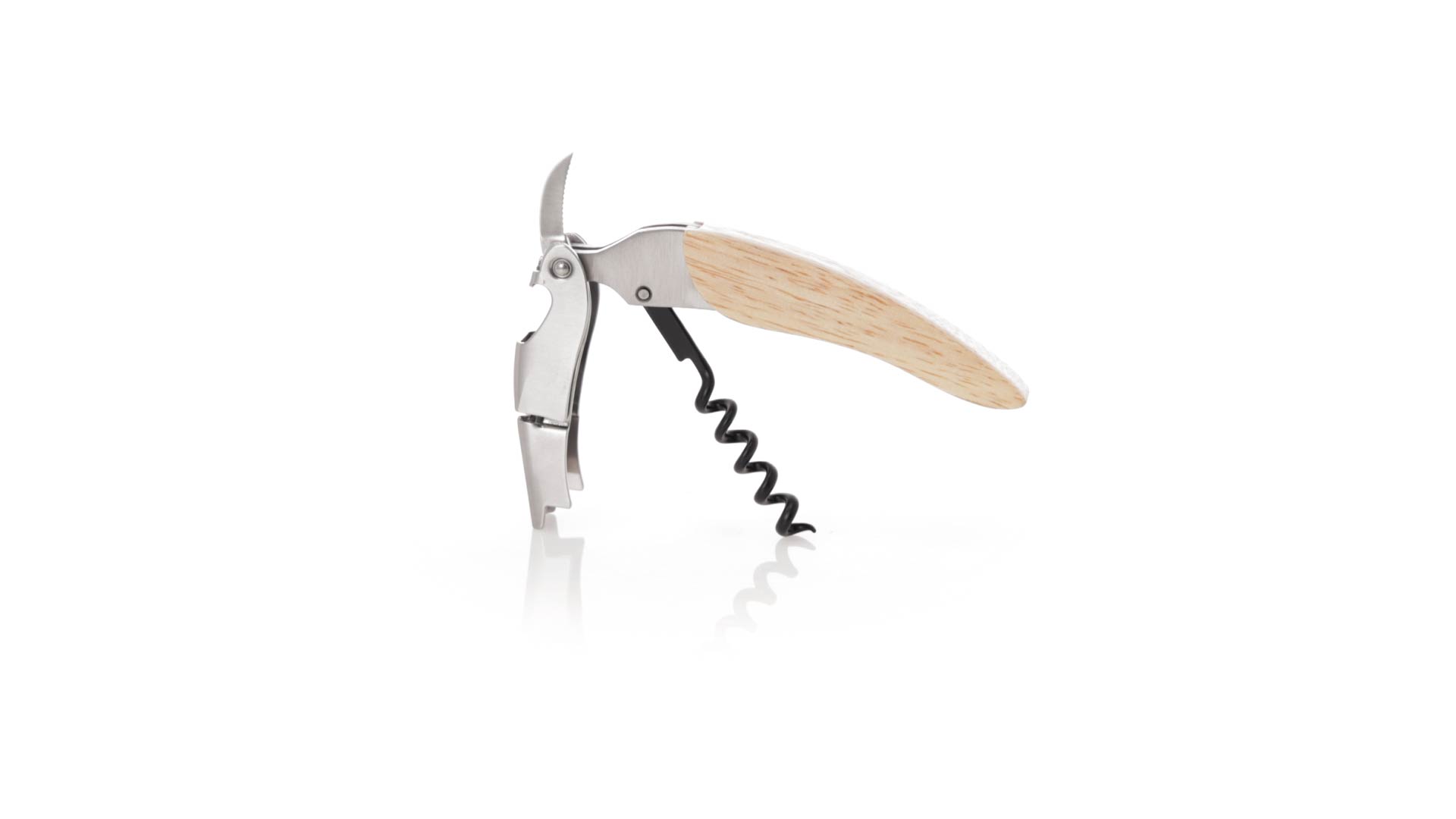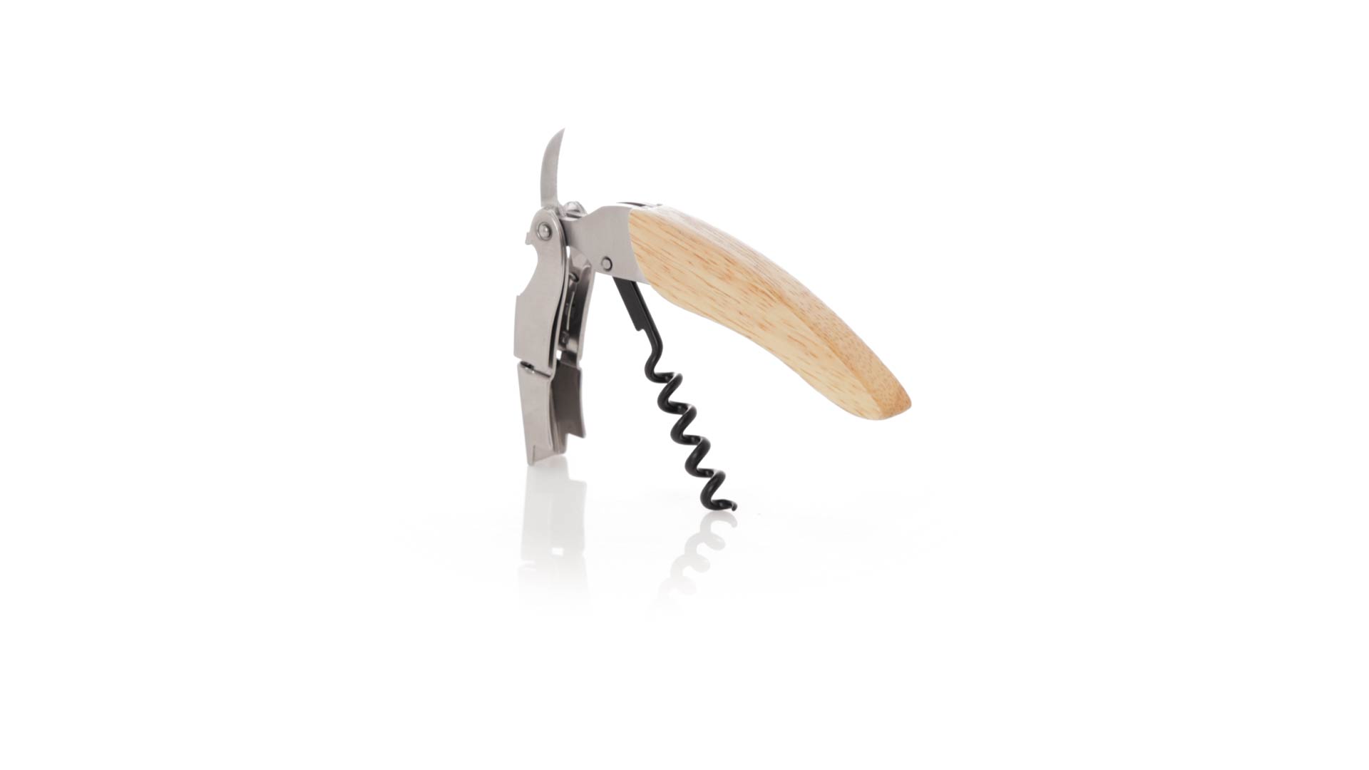 Korkenzieher aus Edelstahl, mit weichem Holzgriff und integriertem Kapselschneider. Präsentiert in einer individuellen Kraft-Designbox.