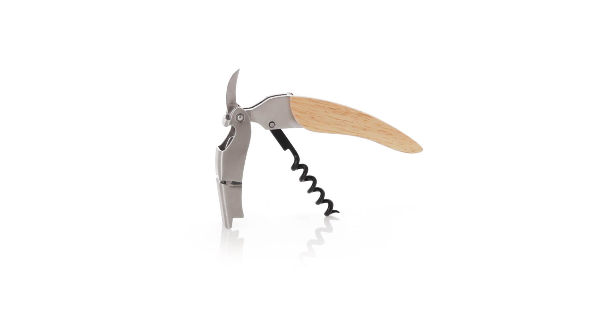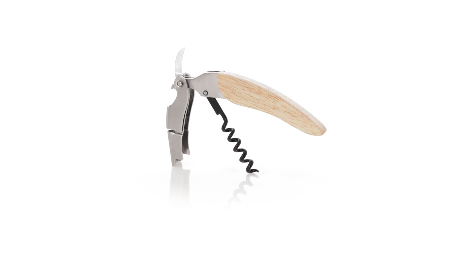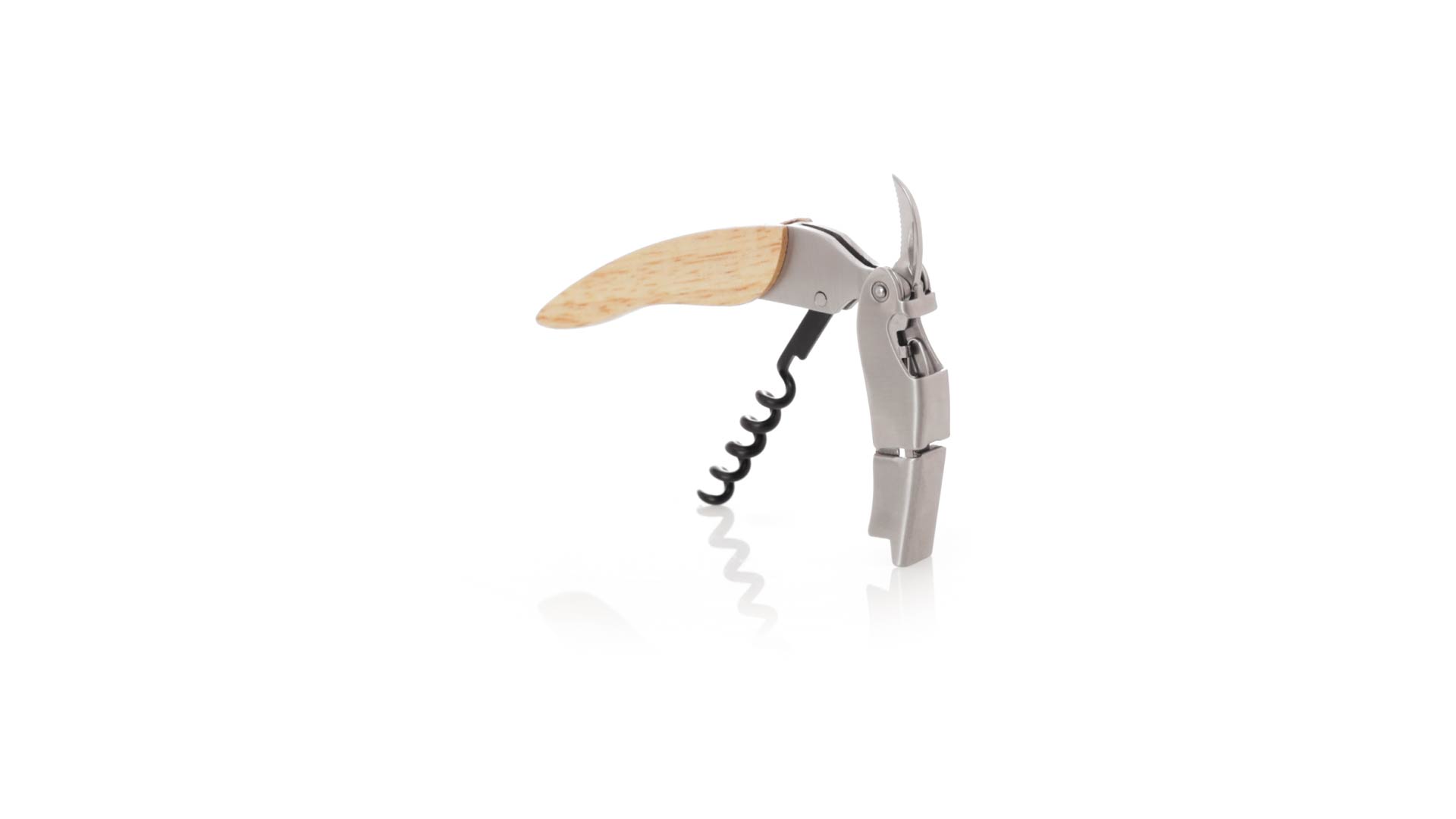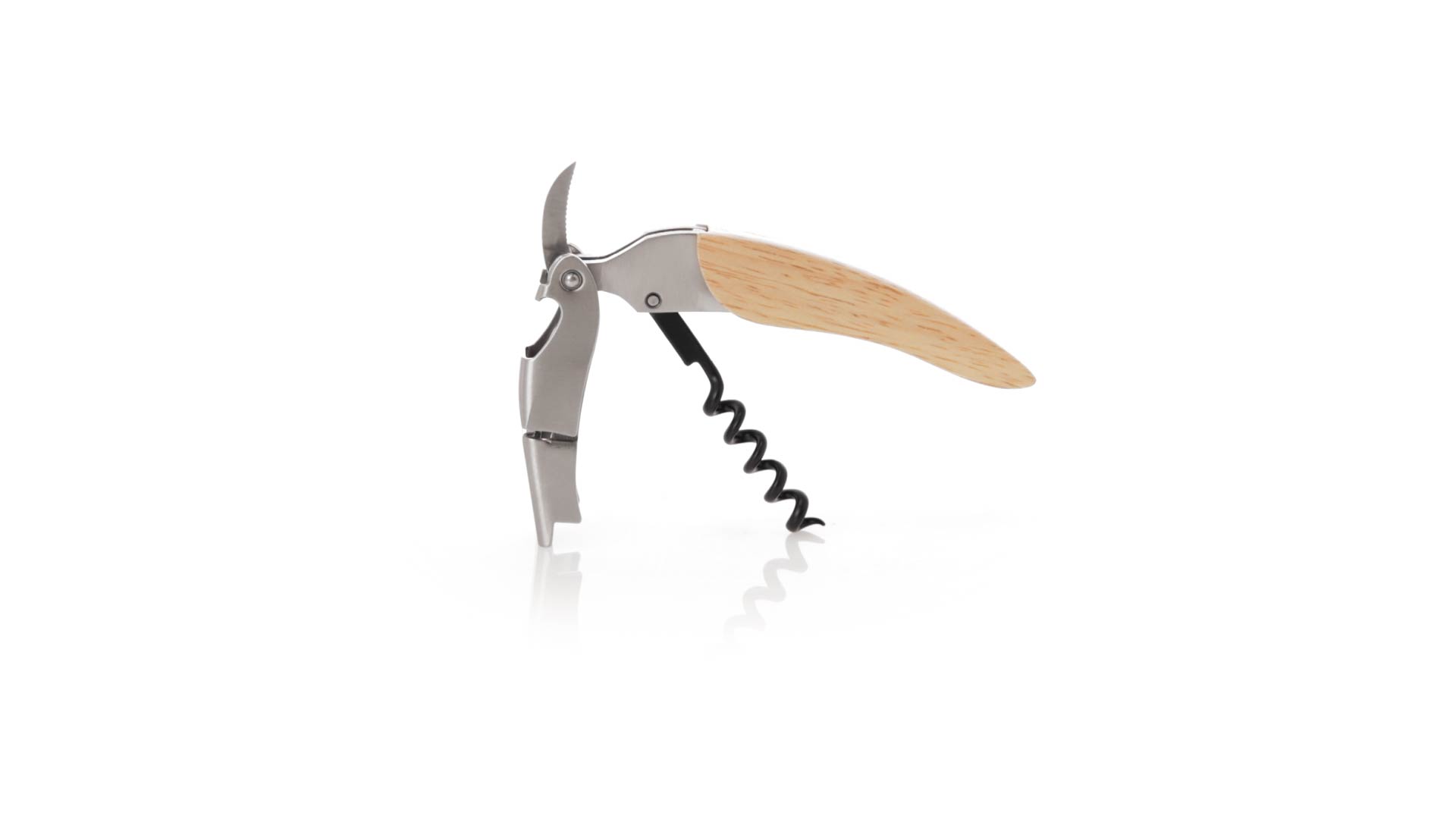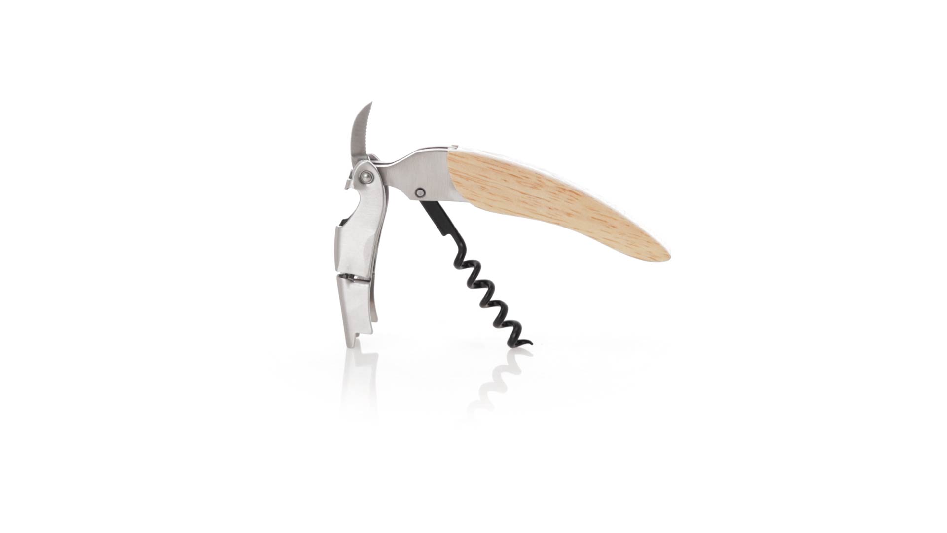 Korkenzieher aus Edelstahl, mit weichem Holzgriff und integriertem Kapselschneider. Präsentiert in einer individuellen Kraft-Designbox.