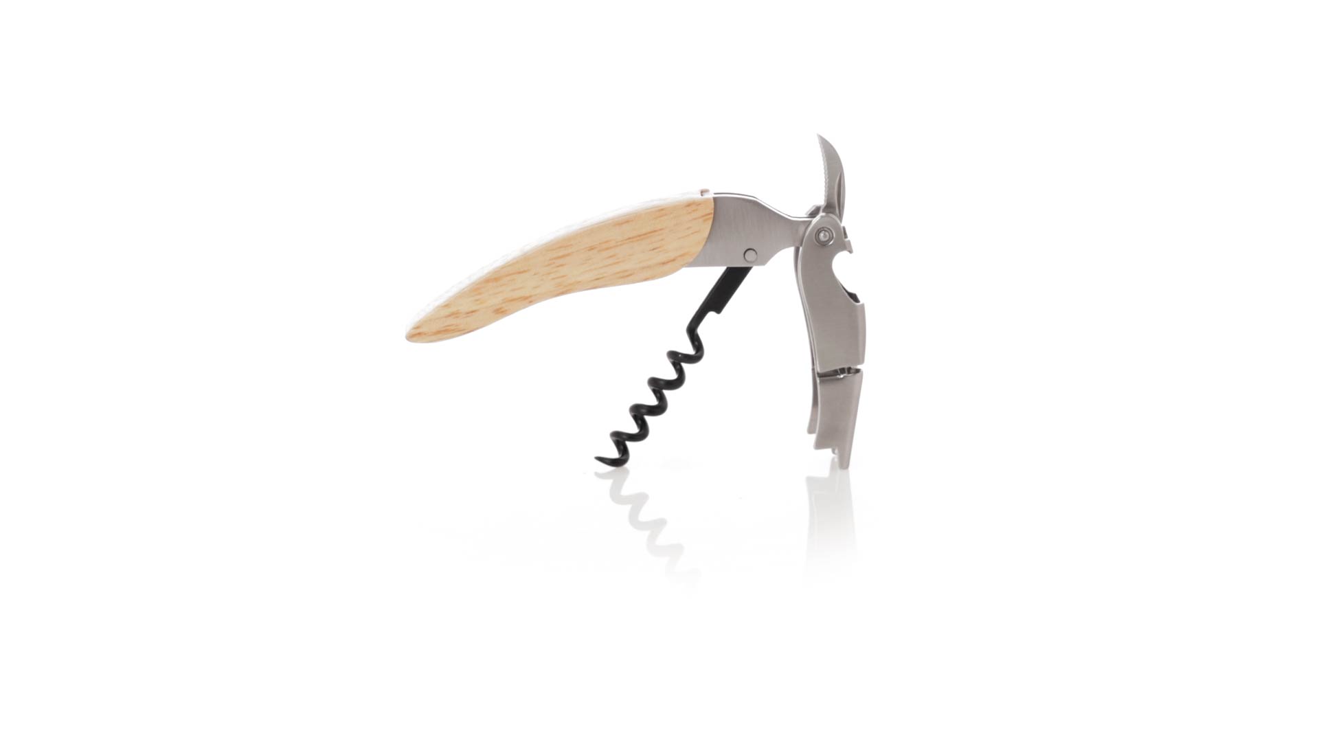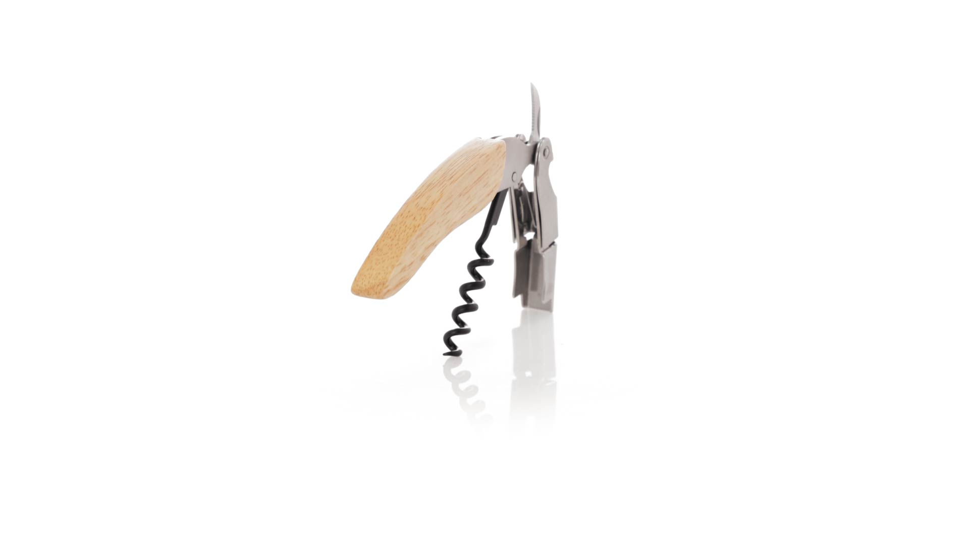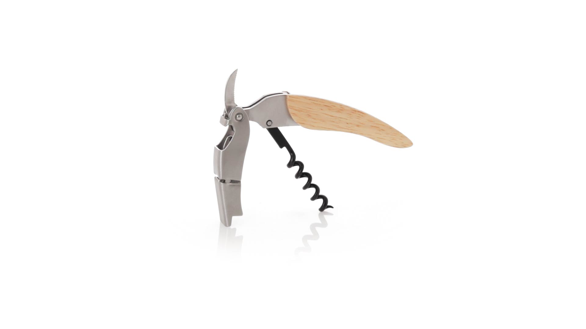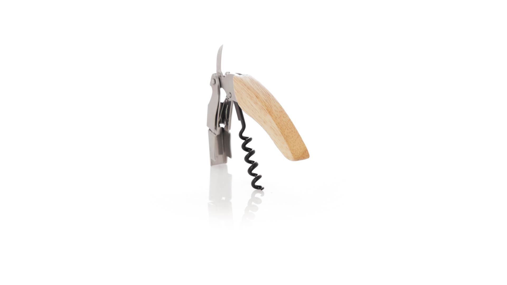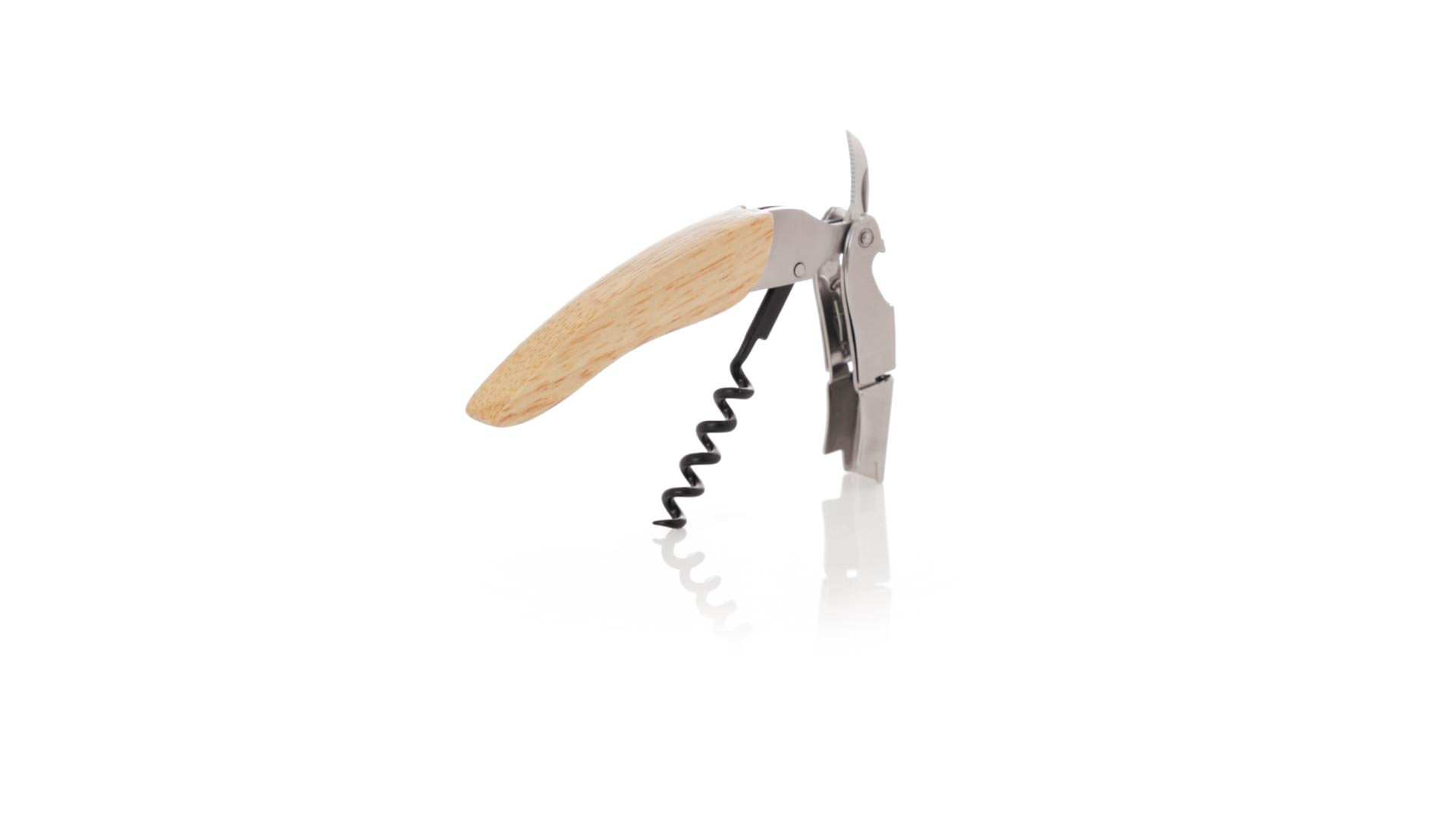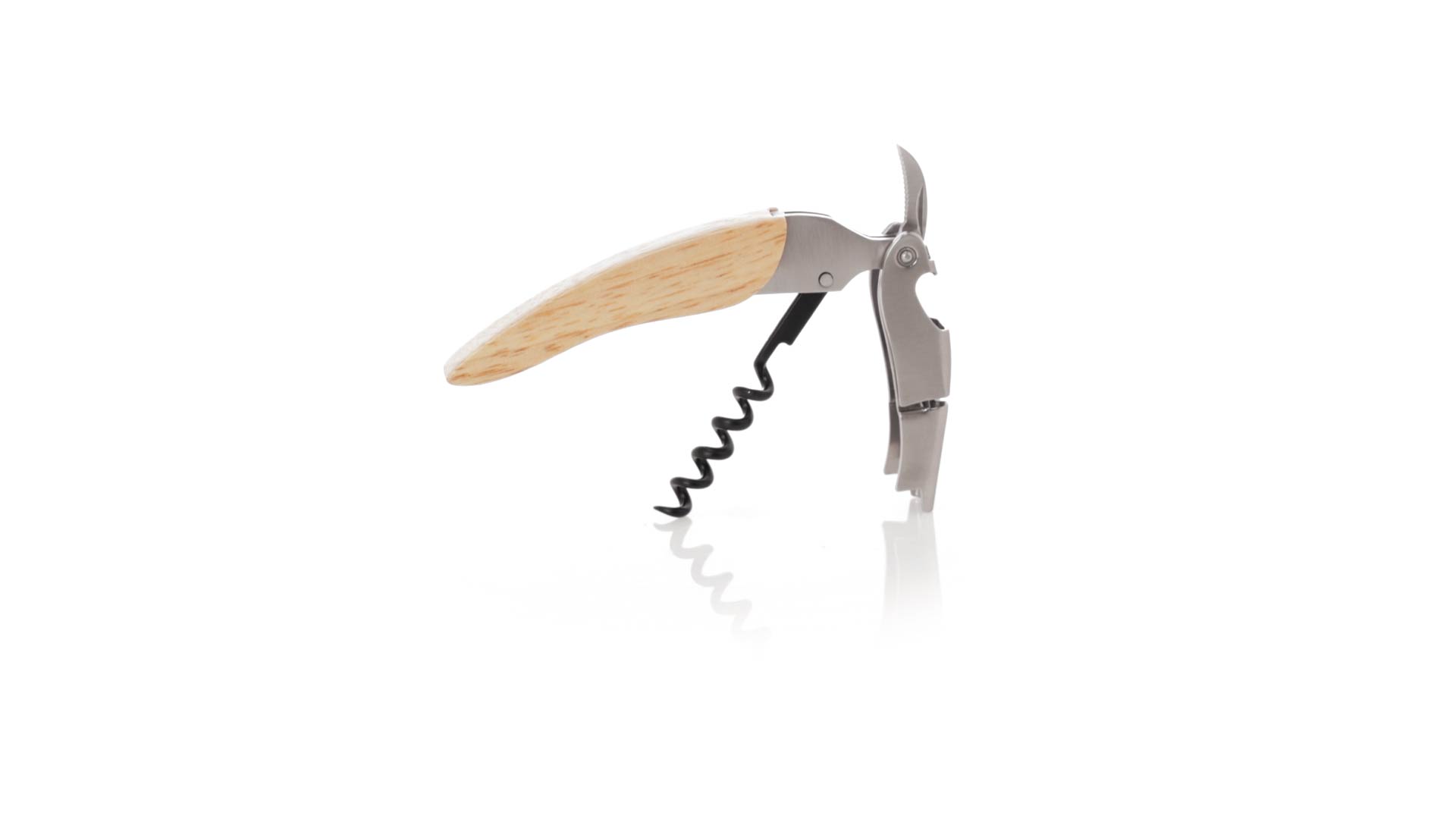 Korkenzieher aus Edelstahl, mit weichem Holzgriff und integriertem Kapselschneider. Präsentiert in einer individuellen Kraft-Designbox.