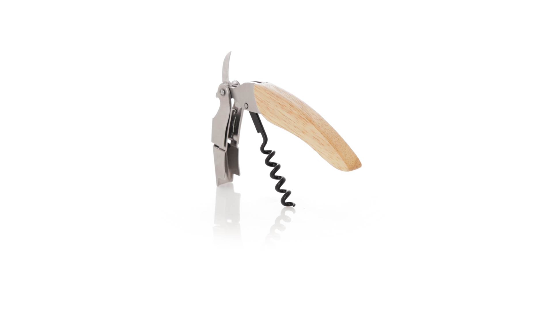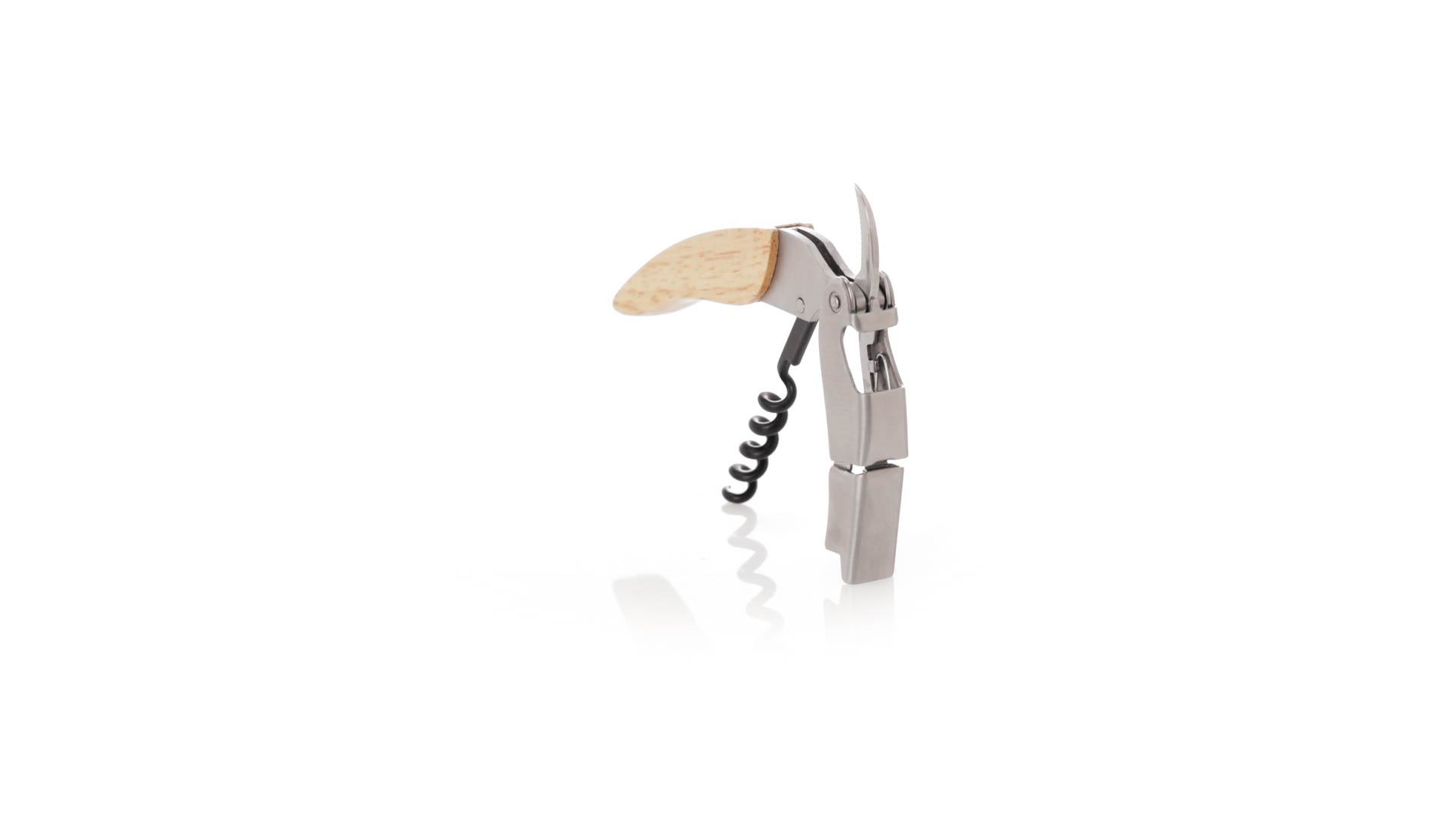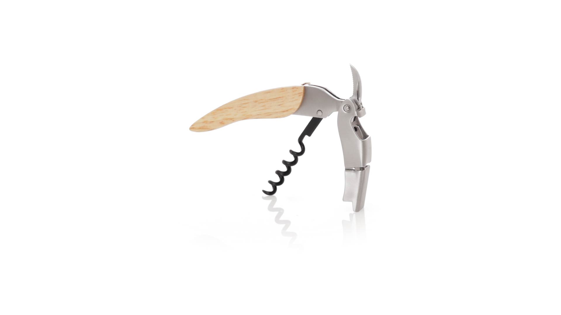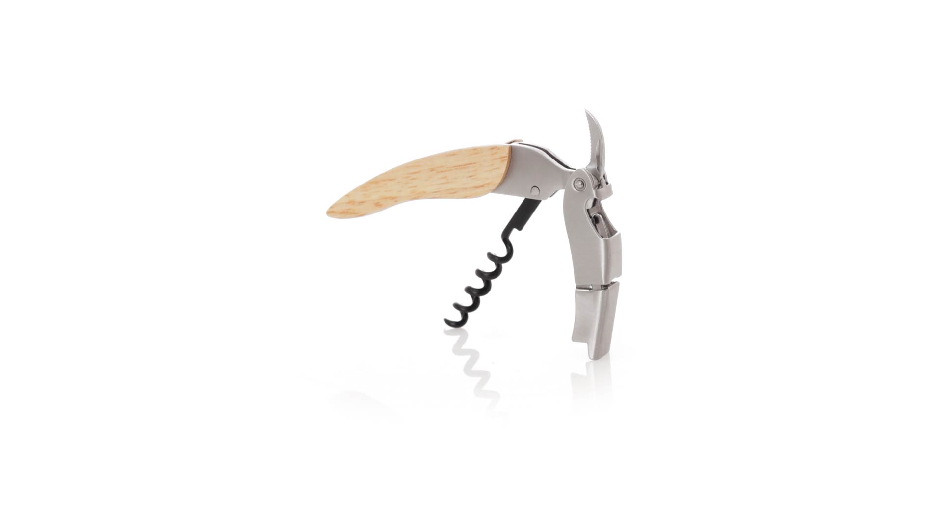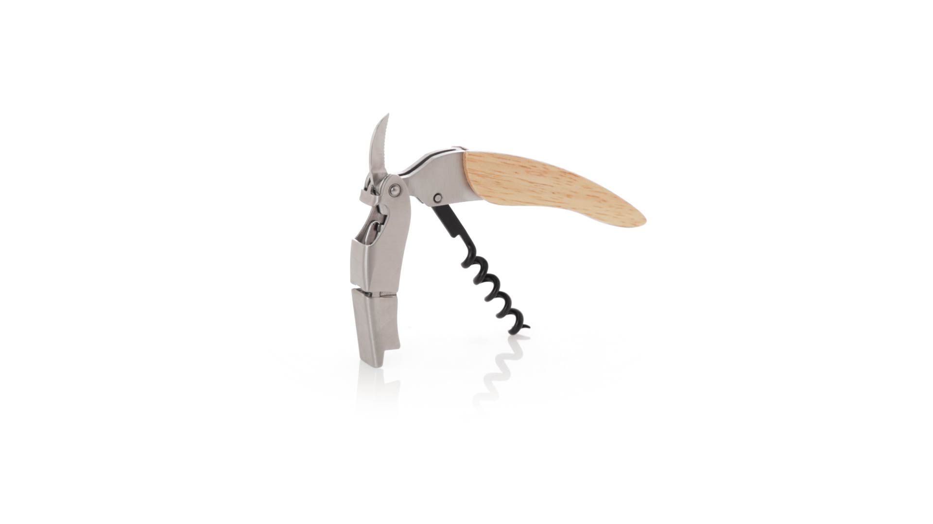Korkenzieher aus Edelstahl, mit weichem Holzgriff und integriertem Kapselschneider. Präsentiert in einer individuellen Kraft-Designbox.