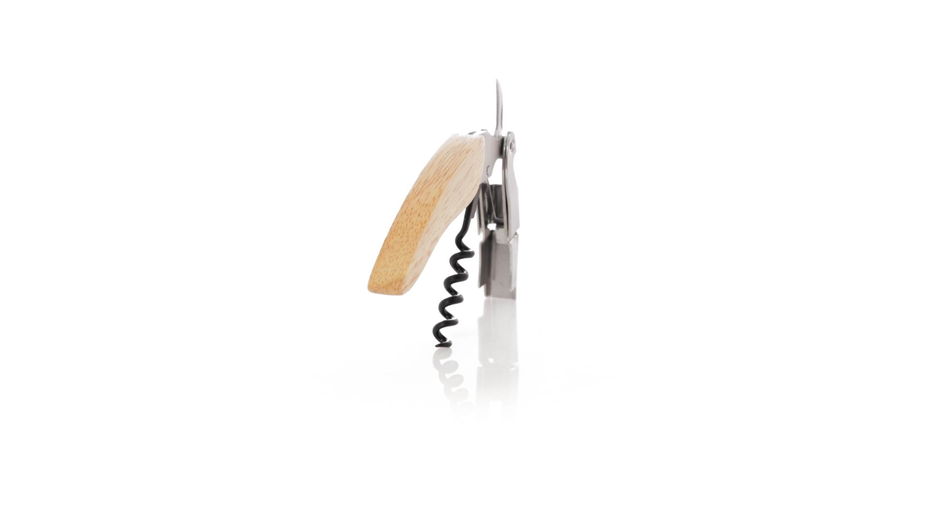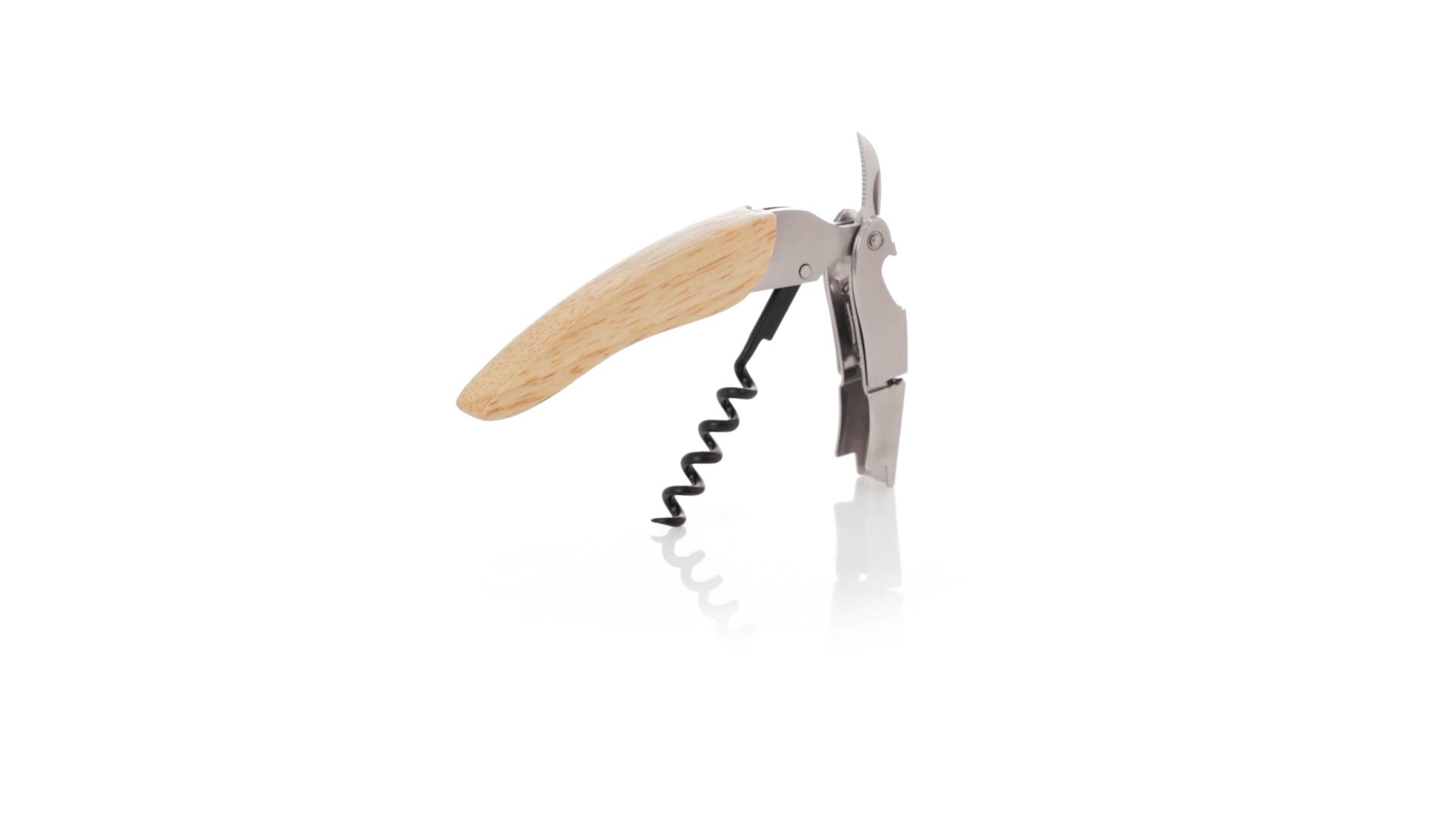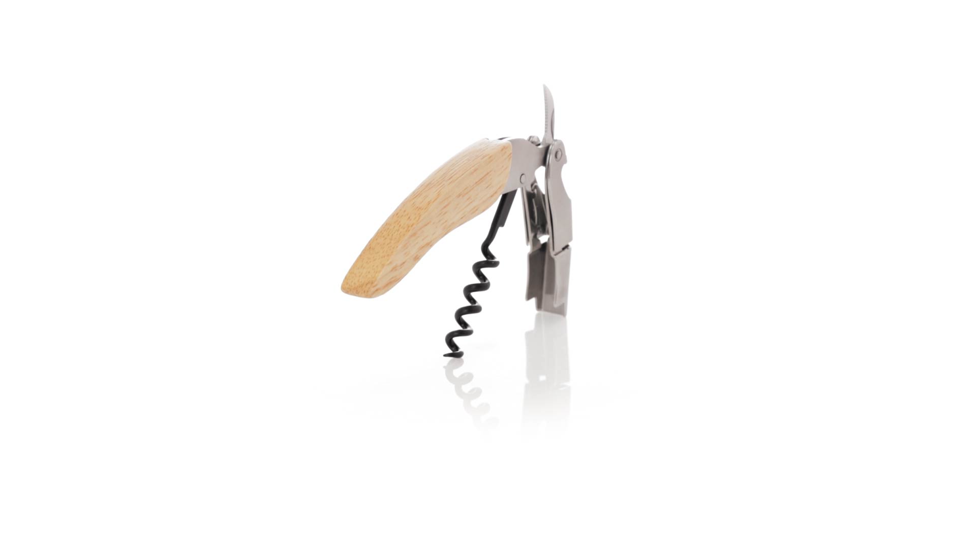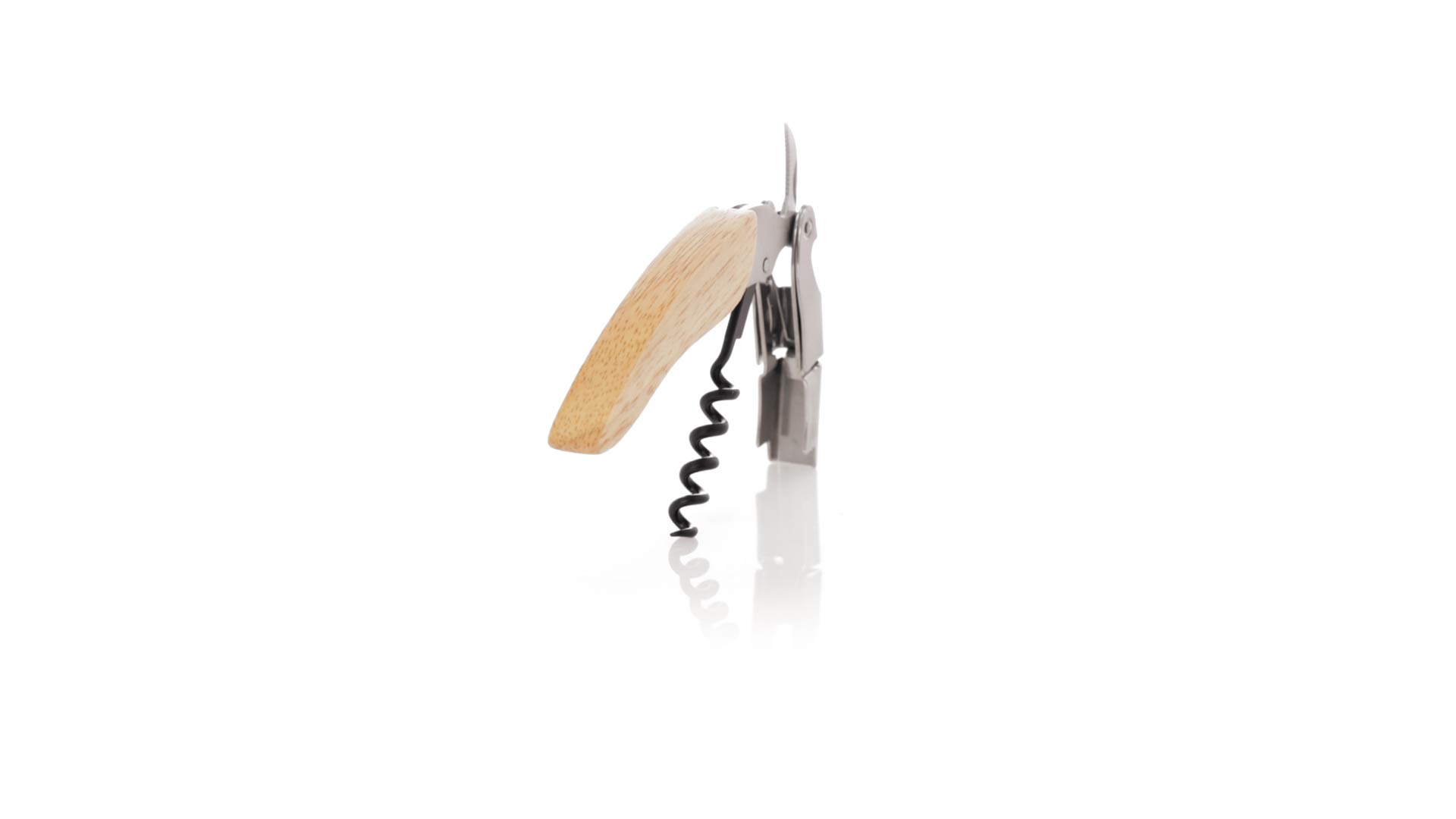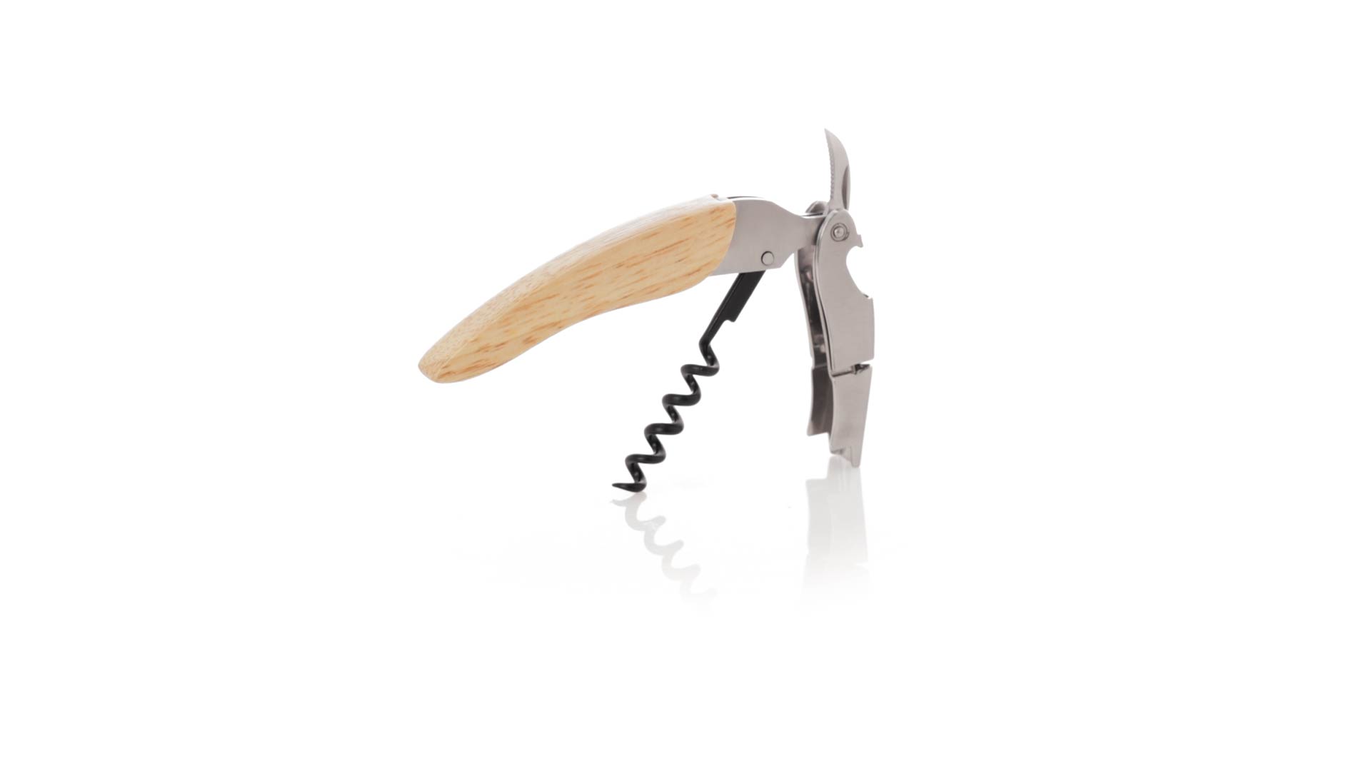 Korkenzieher aus Edelstahl, mit weichem Holzgriff und integriertem Kapselschneider. Präsentiert in einer individuellen Kraft-Designbox.
