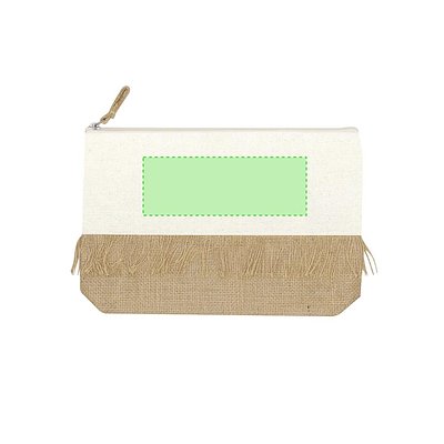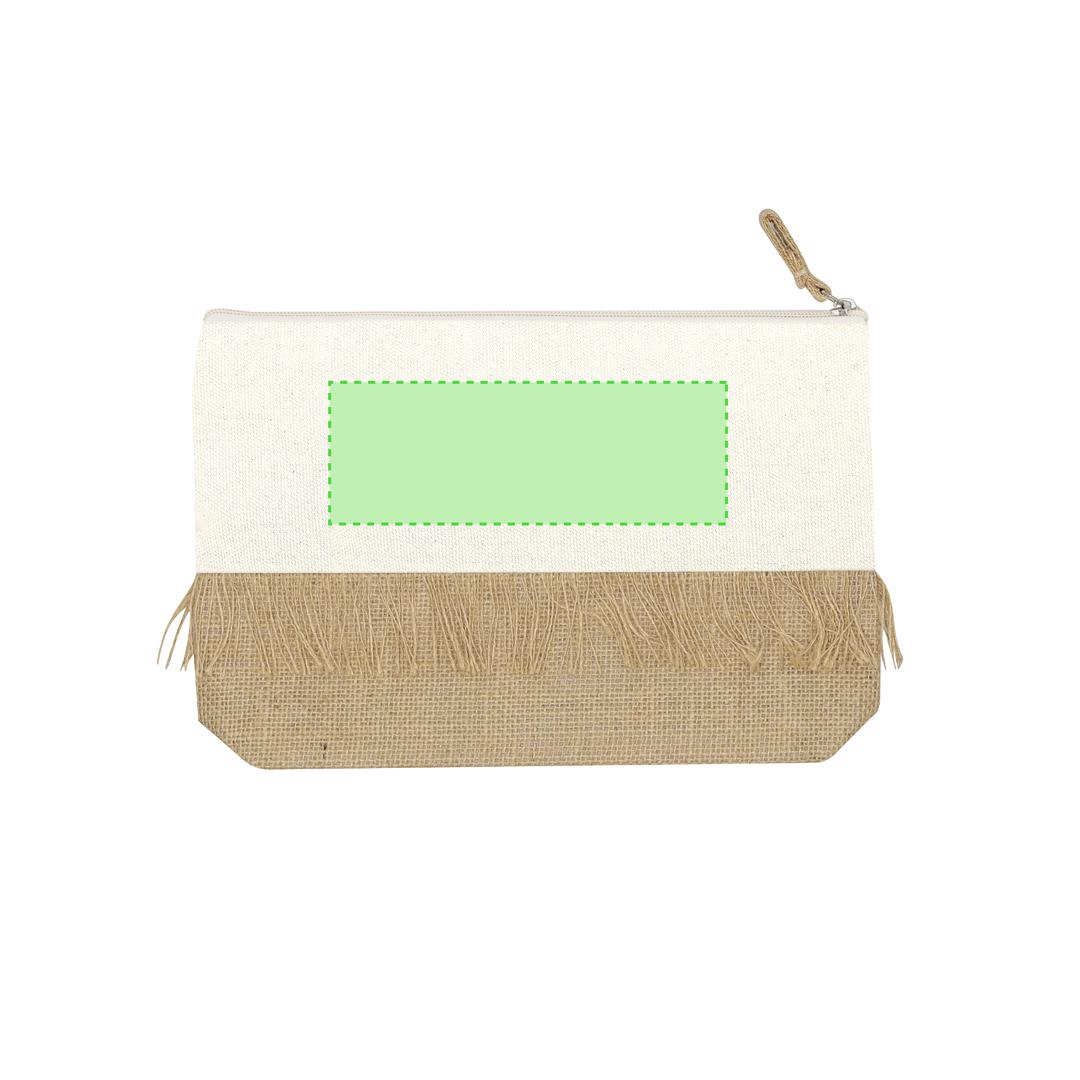 Necessaire aus laminiertem Jute und natürlicher Baumwolle. Mit auffälligen Fransen, Reissverschluss in natürlicher Farbe und Juteband.