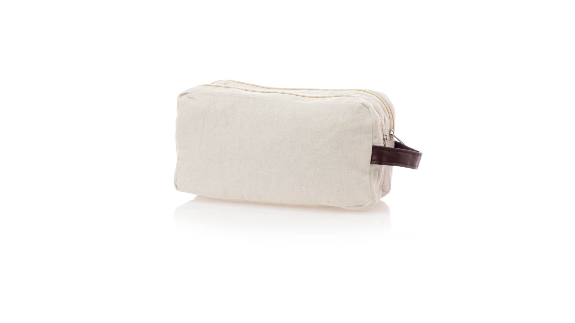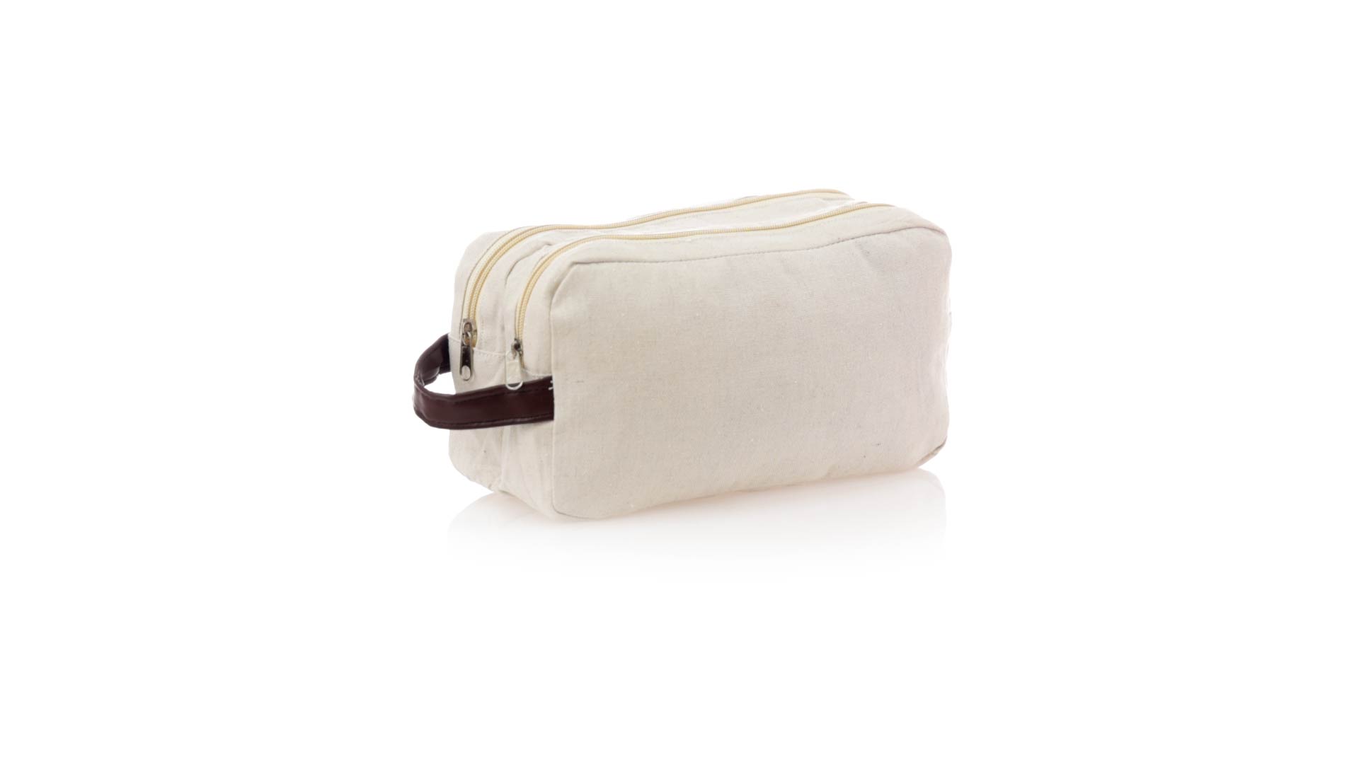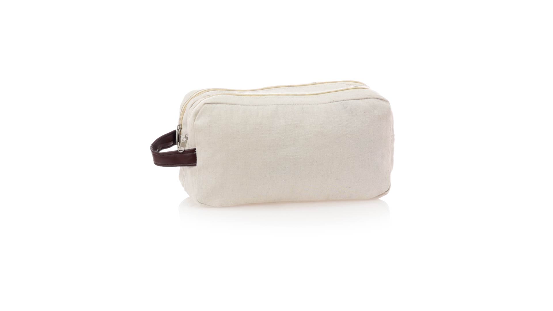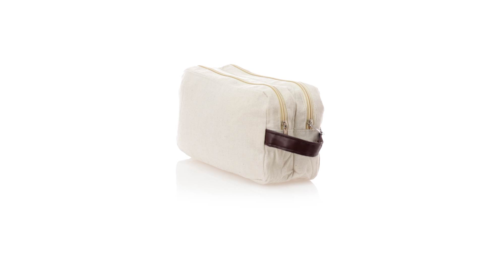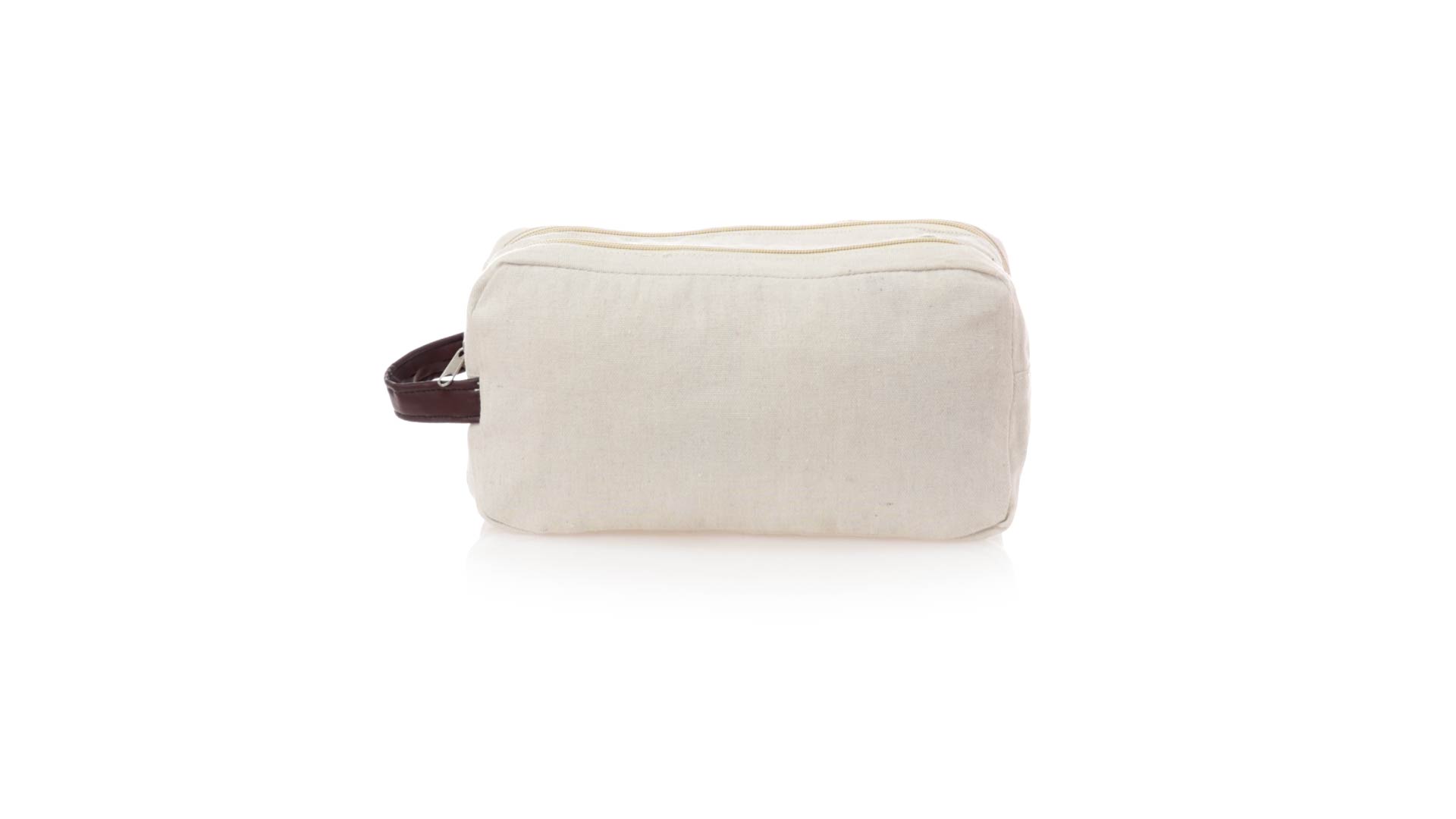 Kosmetiktasche mit zwei Fächern aus widerstandsfähigem Canvas. Mit Reissverschluss, Griffen und Zugvorrichtung aus braunem PU-Leder. Erhältlich in modischen Farben.