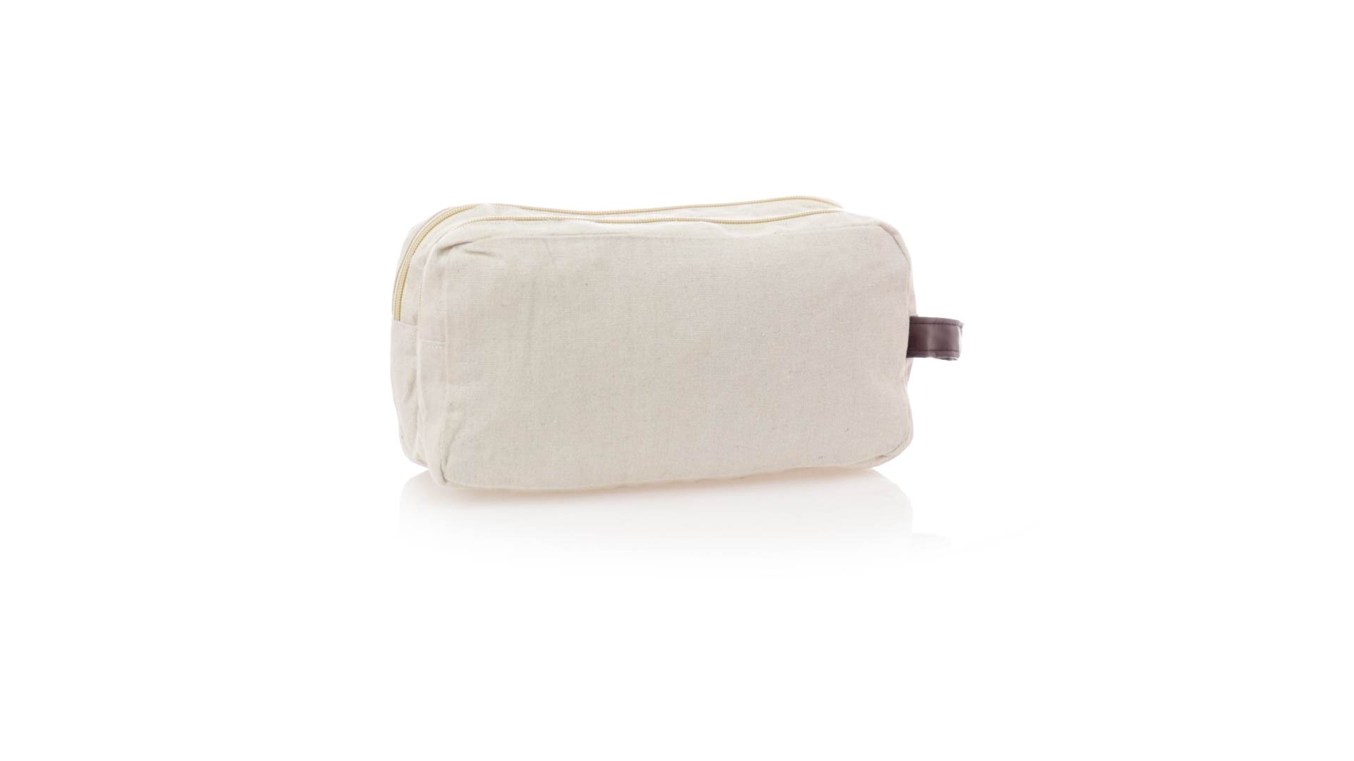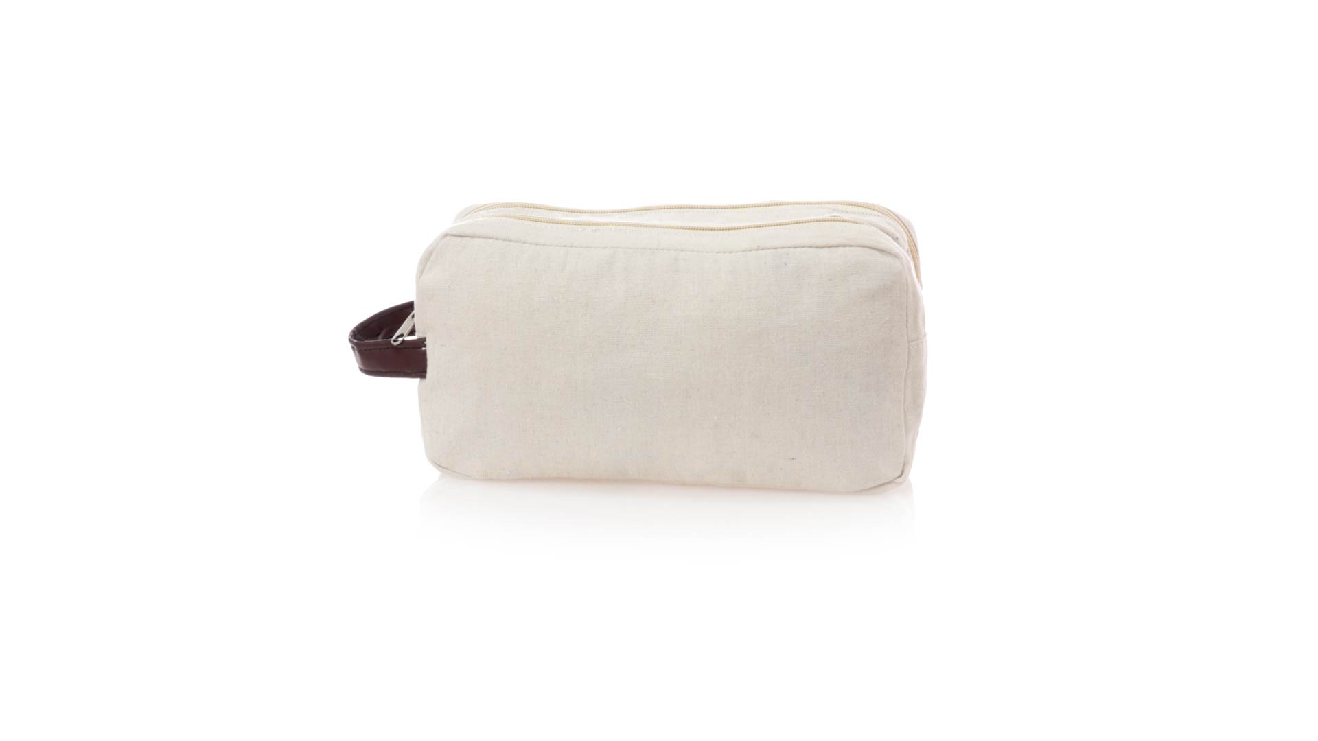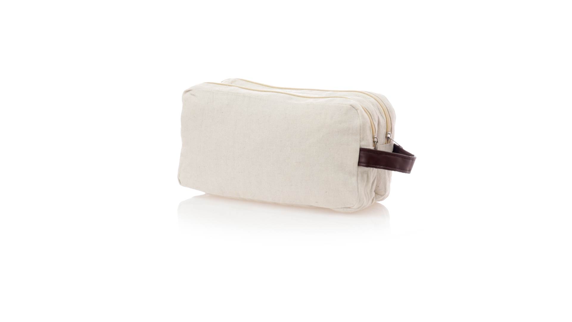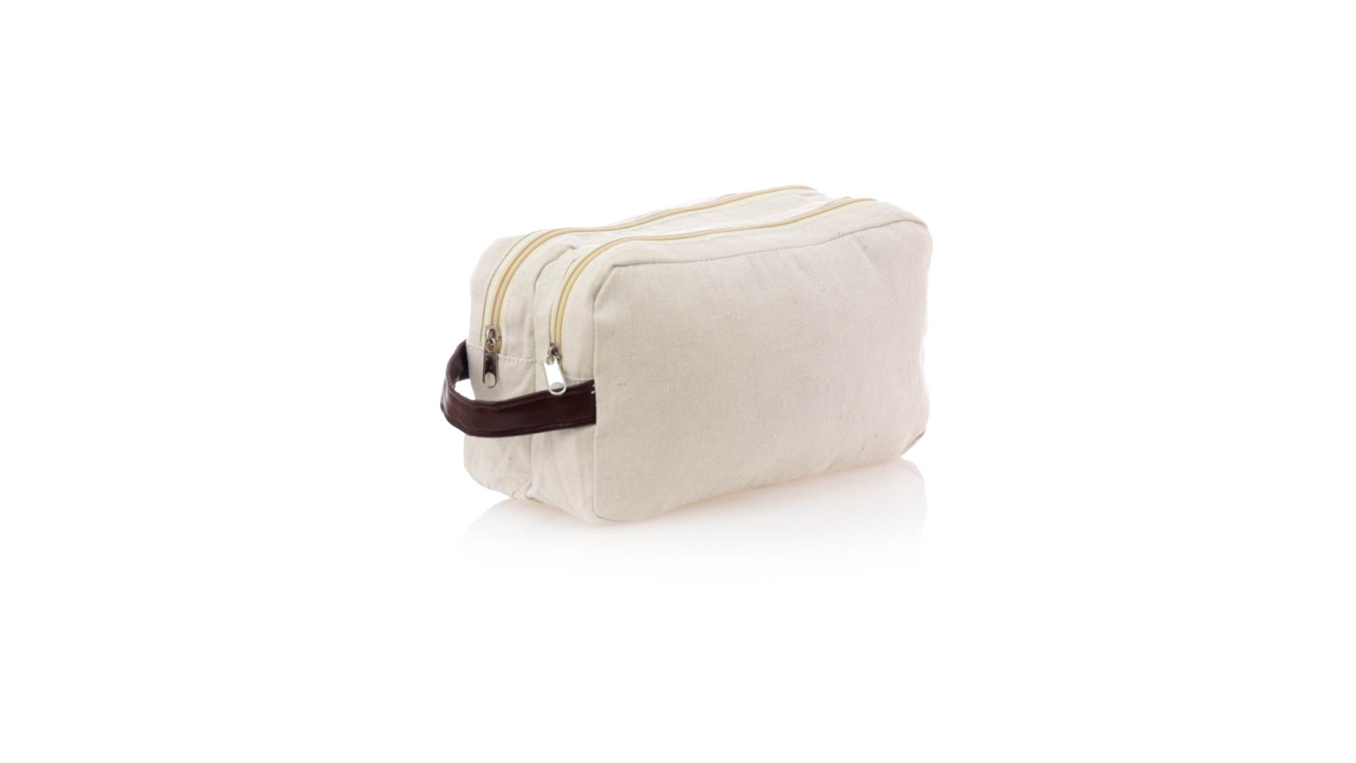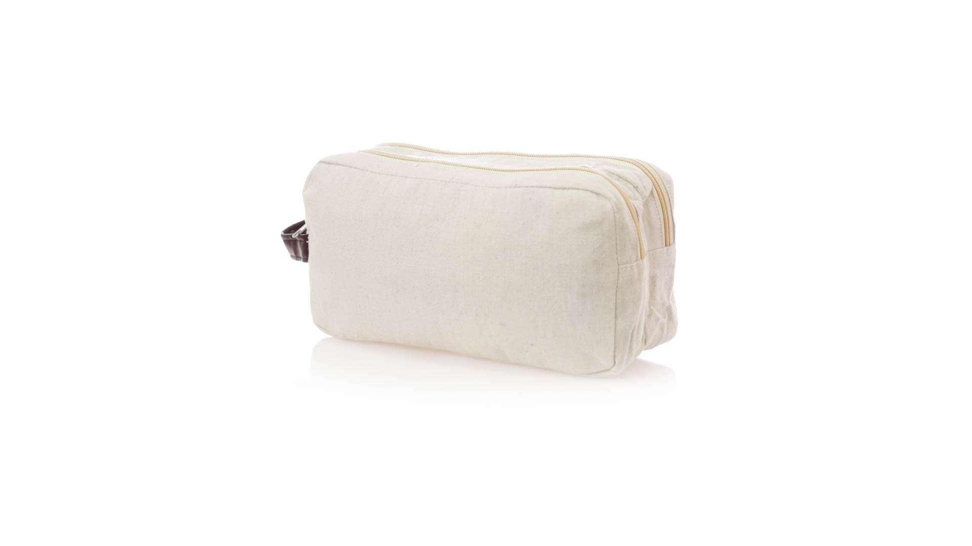 Kosmetiktasche mit zwei Fächern aus widerstandsfähigem Canvas. Mit Reissverschluss, Griffen und Zugvorrichtung aus braunem PU-Leder. Erhältlich in modischen Farben.