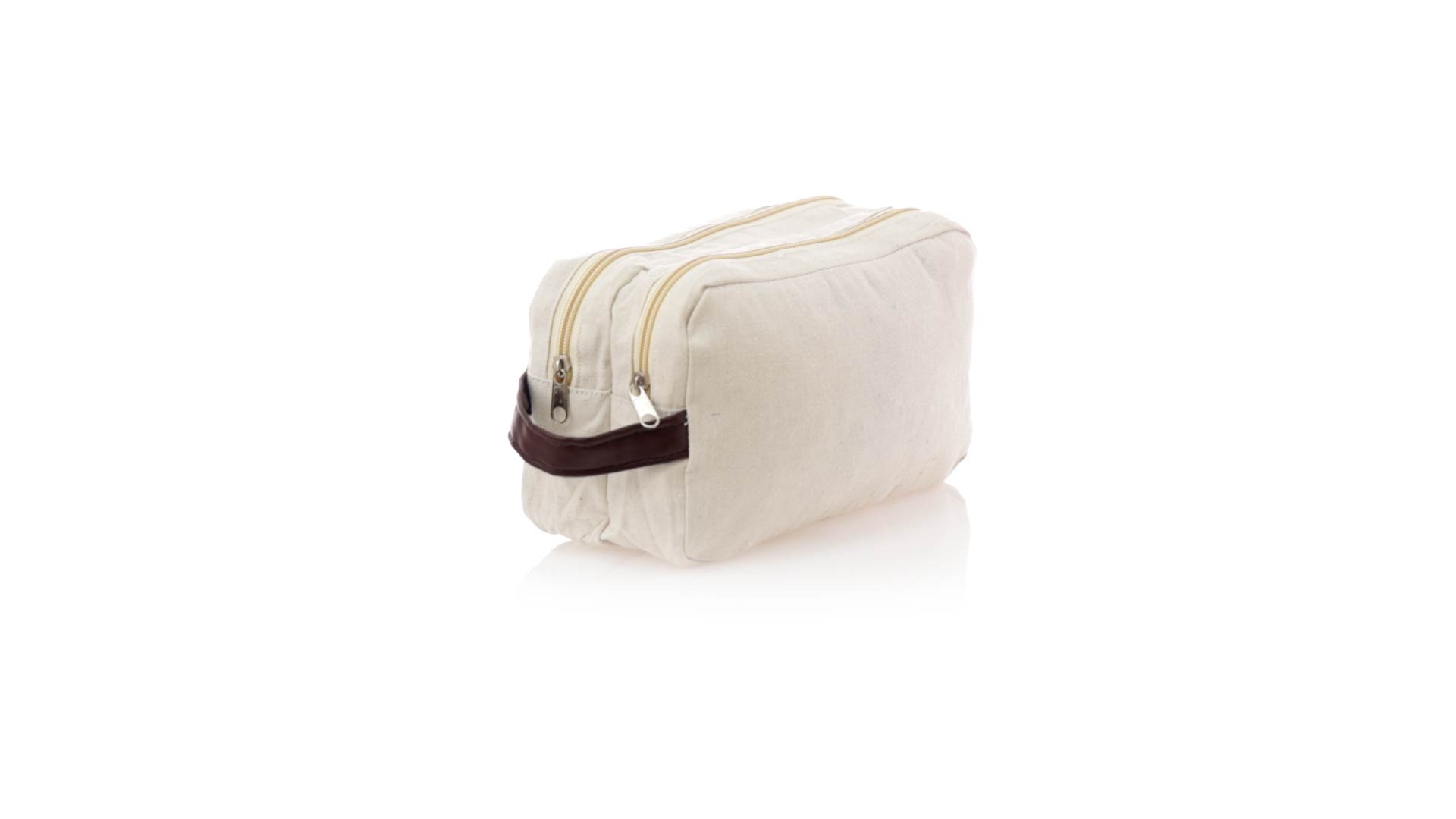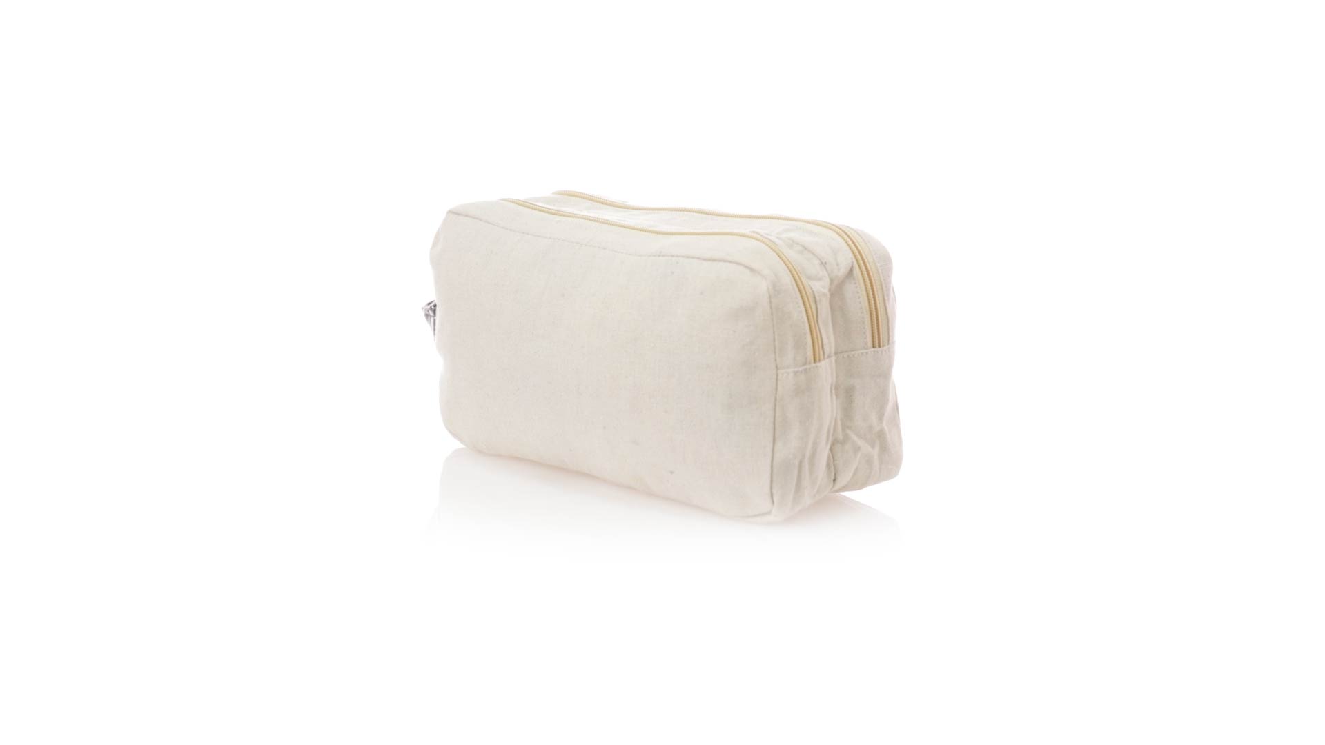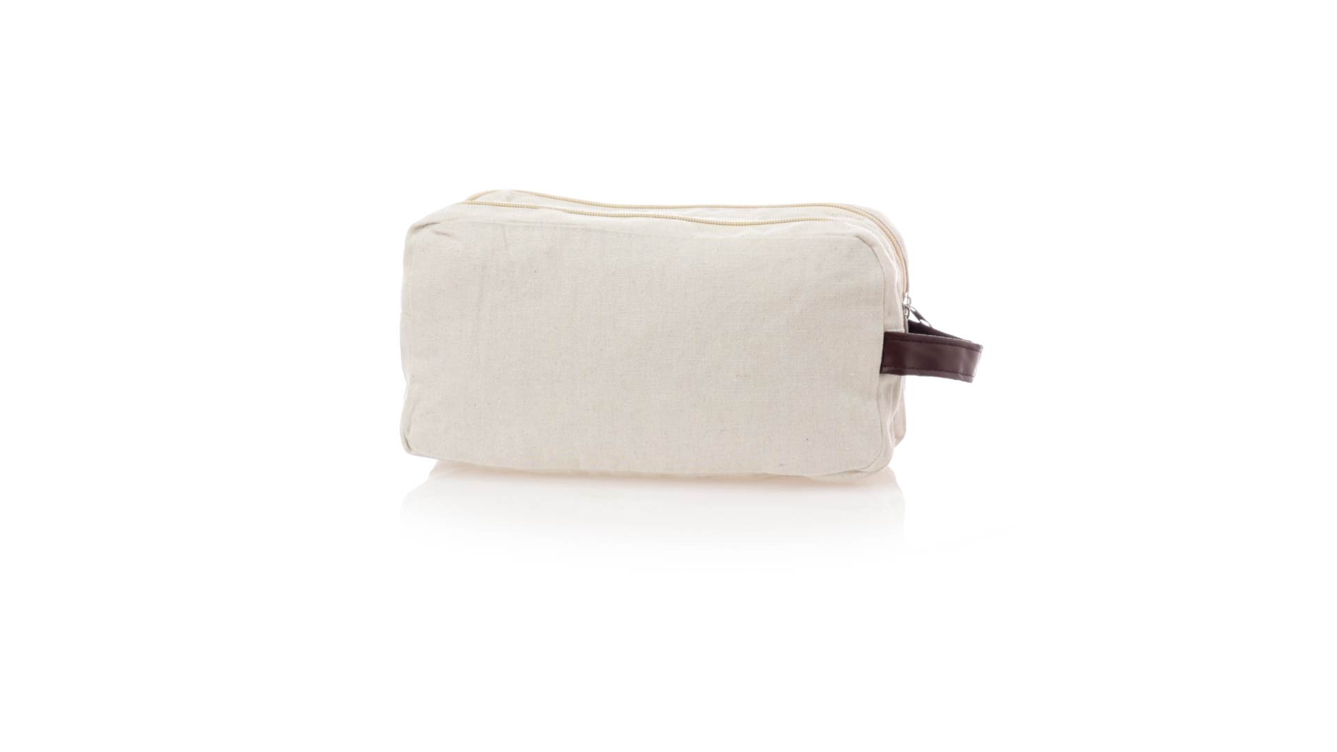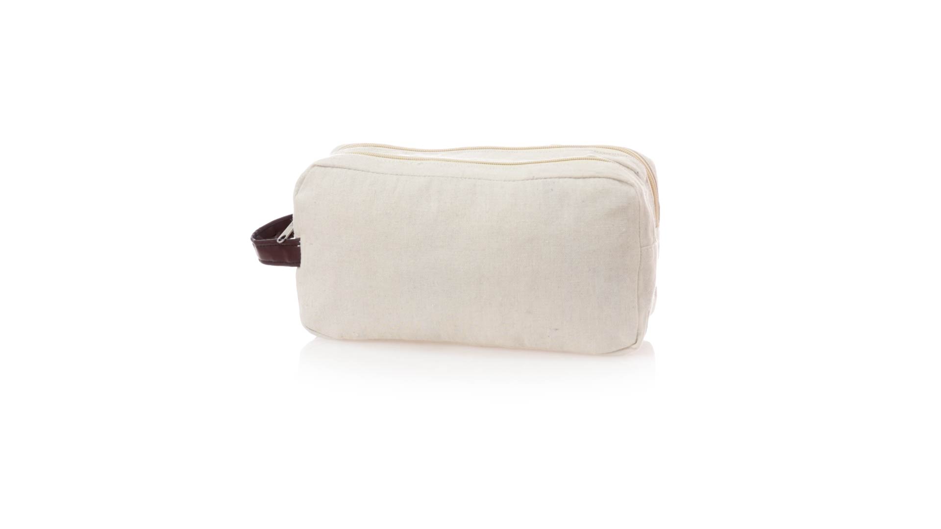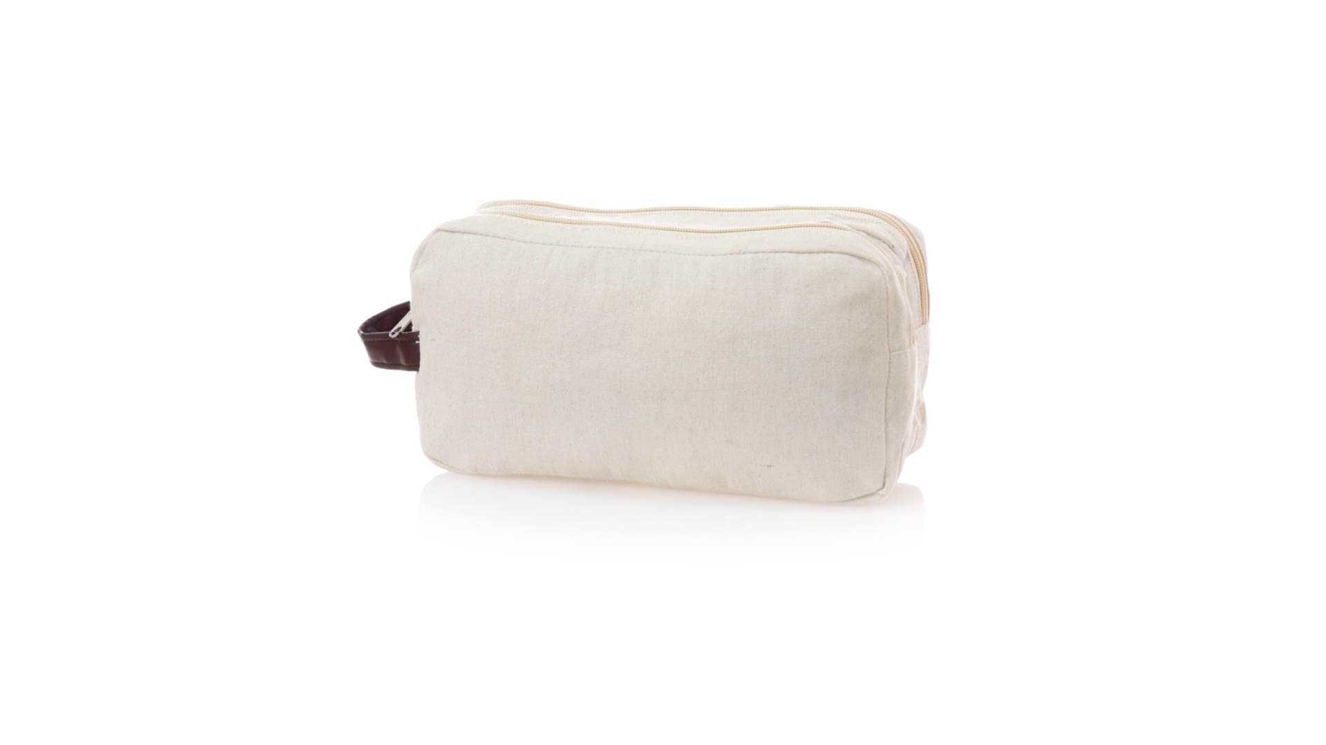 Kosmetiktasche mit zwei Fächern aus widerstandsfähigem Canvas. Mit Reissverschluss, Griffen und Zugvorrichtung aus braunem PU-Leder. Erhältlich in modischen Farben.