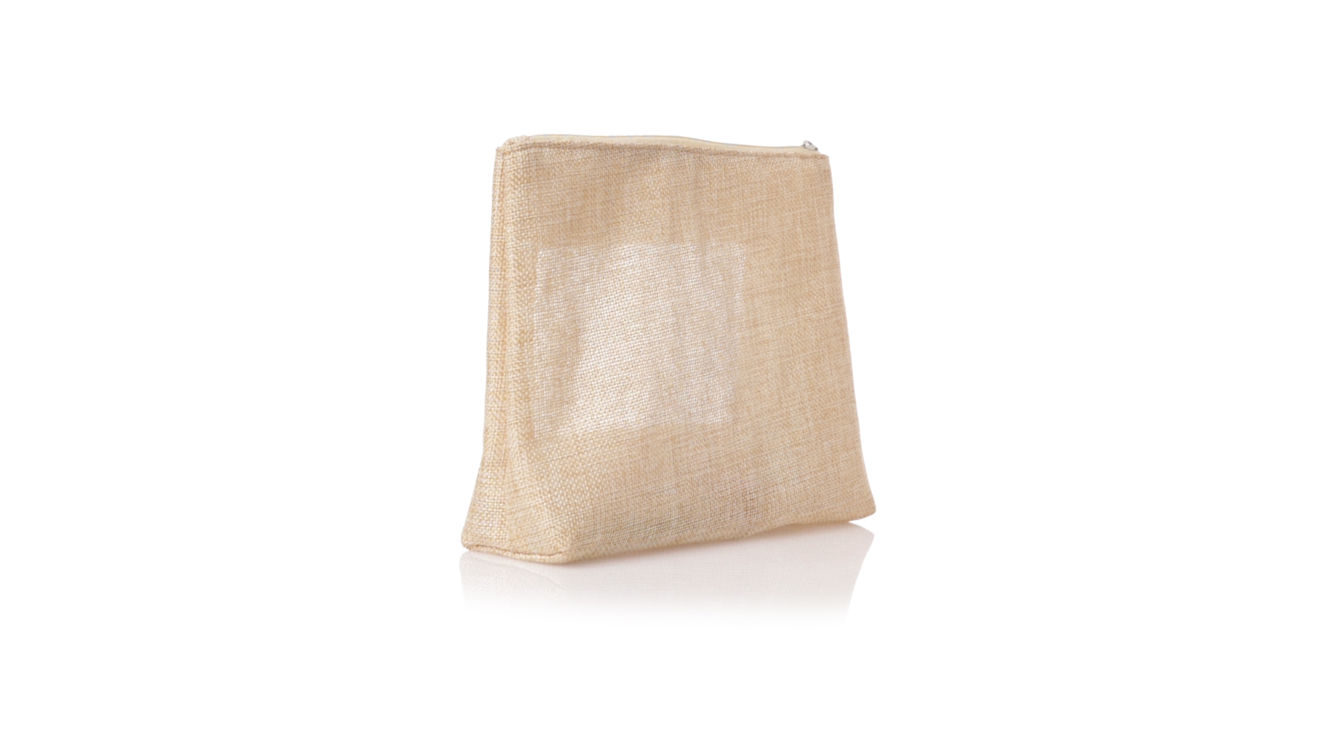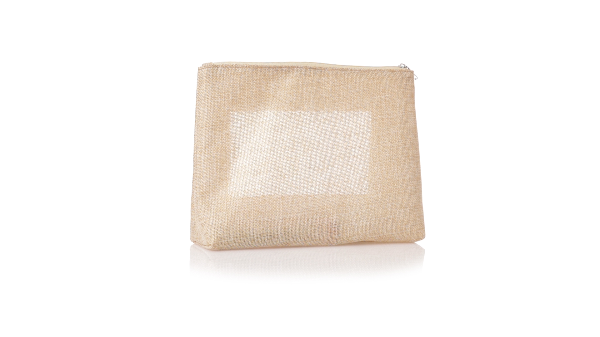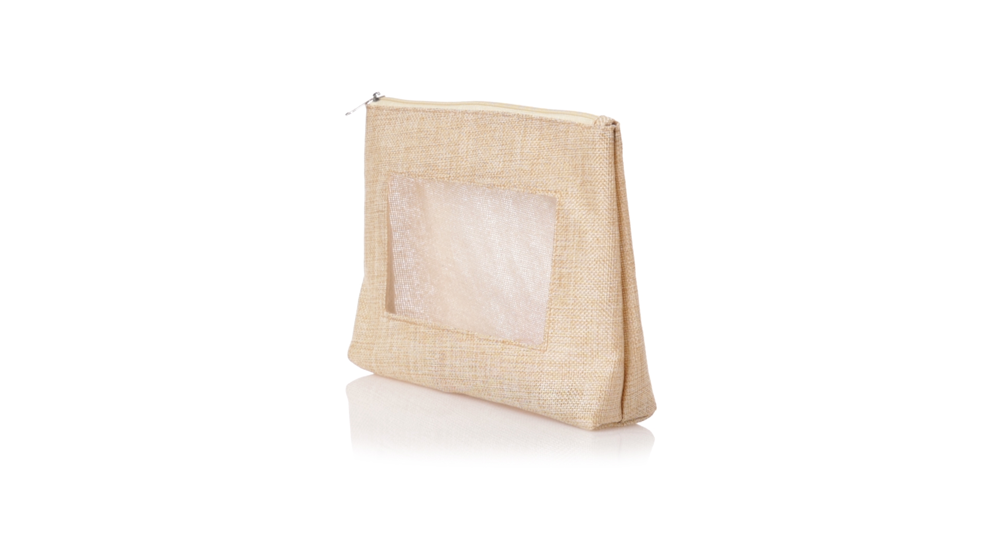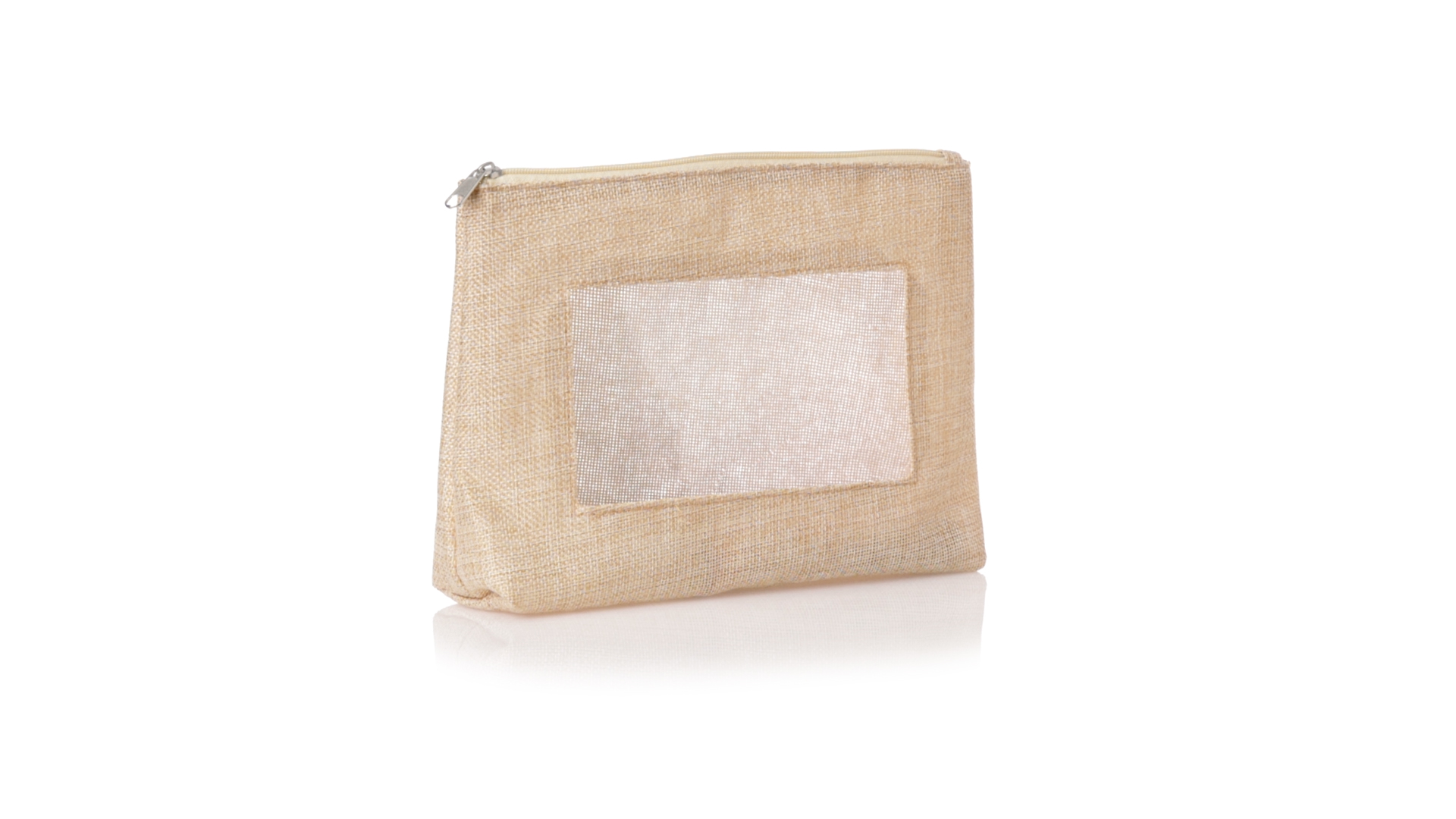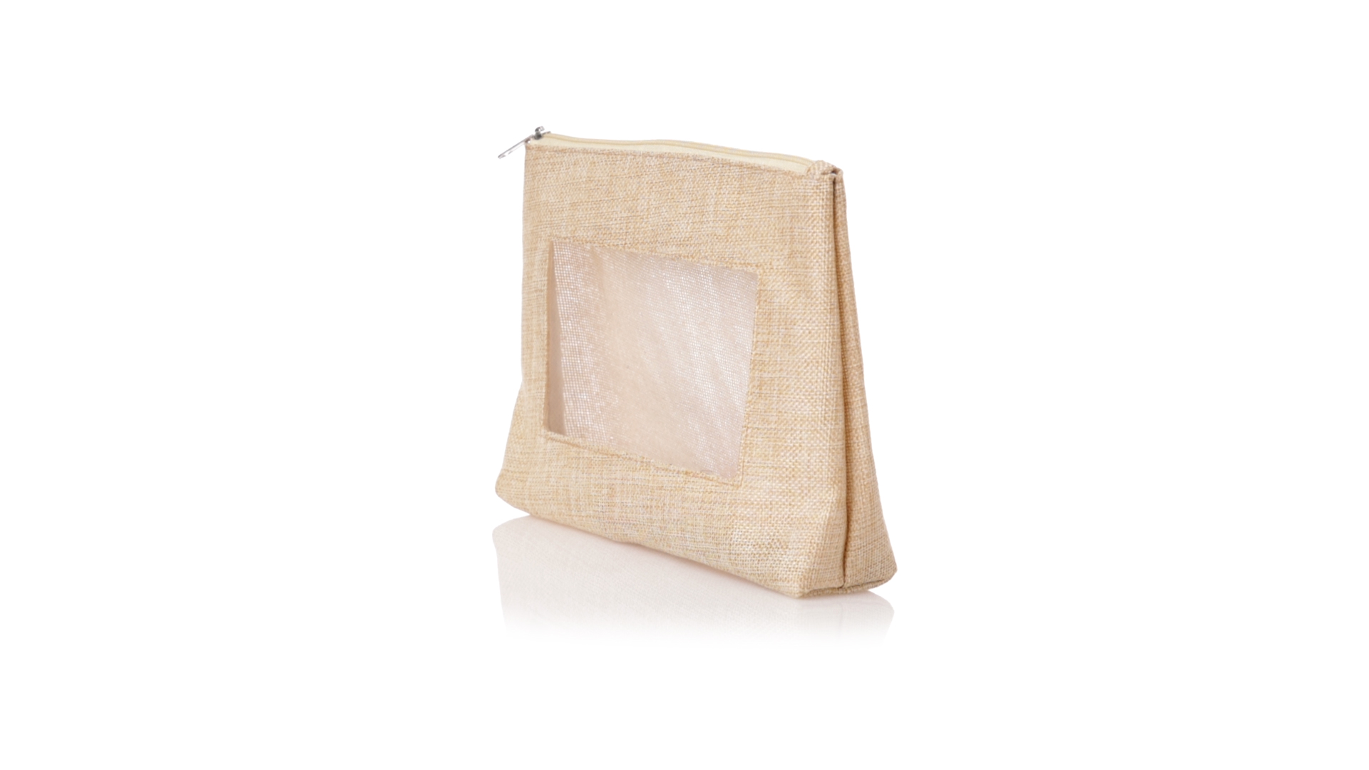 Von der Natur inspirierte Kulturtasche mit Sichtfenster auf einer Seite. Mit passendem Reissverschluss und genähtem Abschluss. Hergestellt aus ecrufarbenem Polyester, mit transparentem EVA-Fenster.