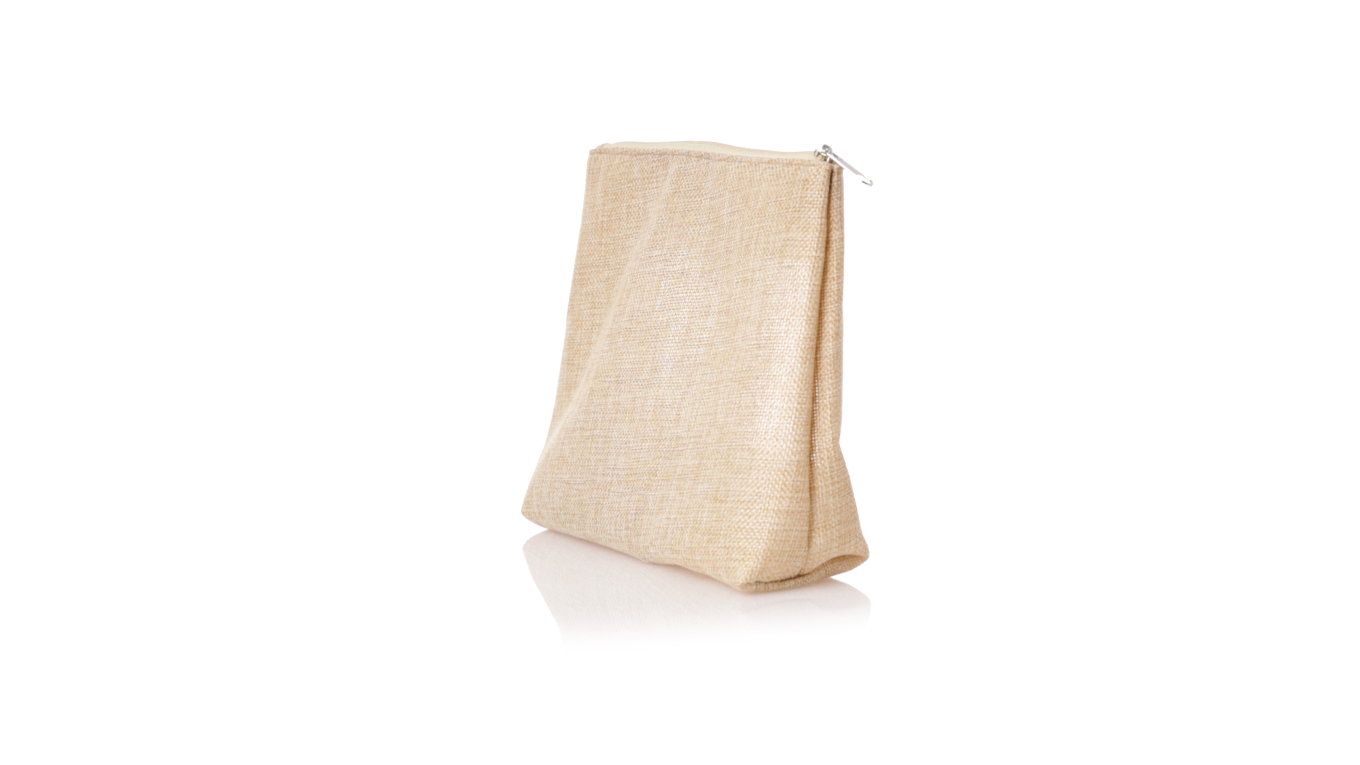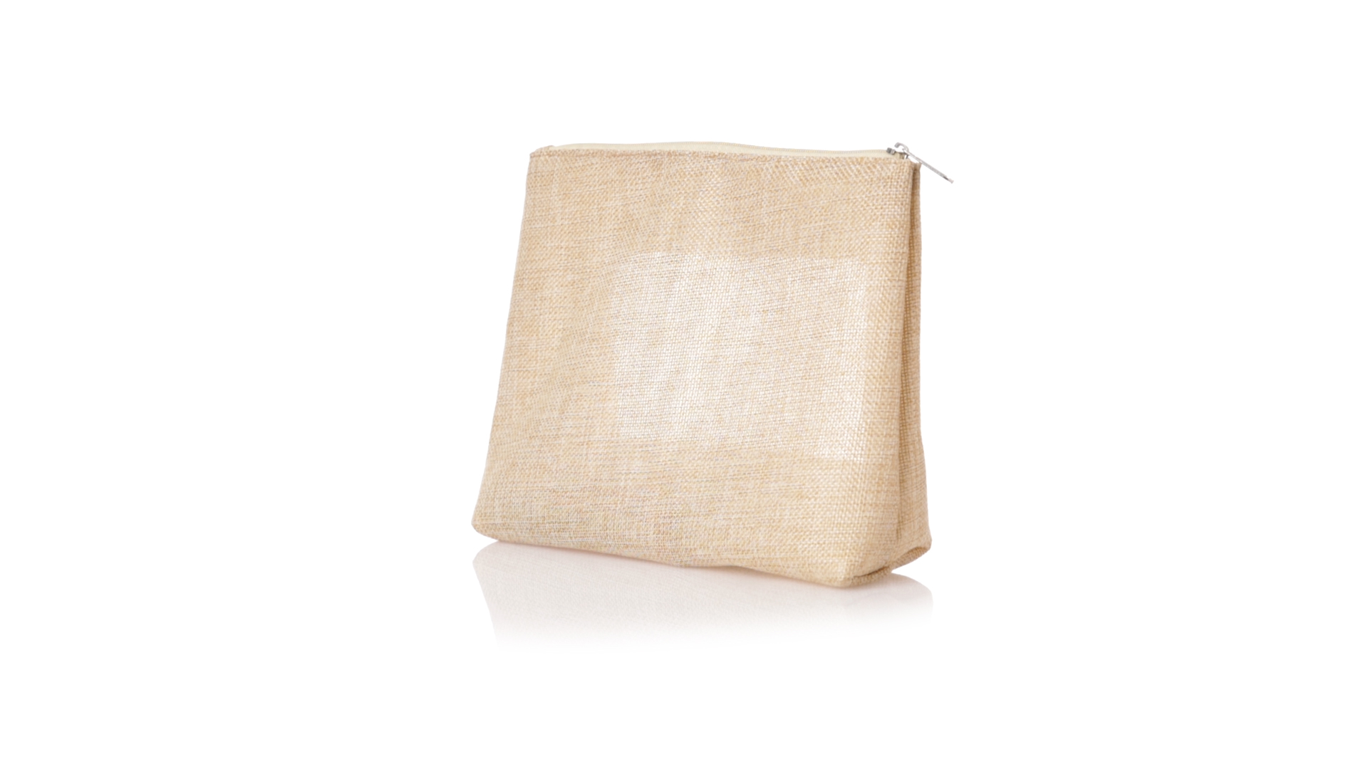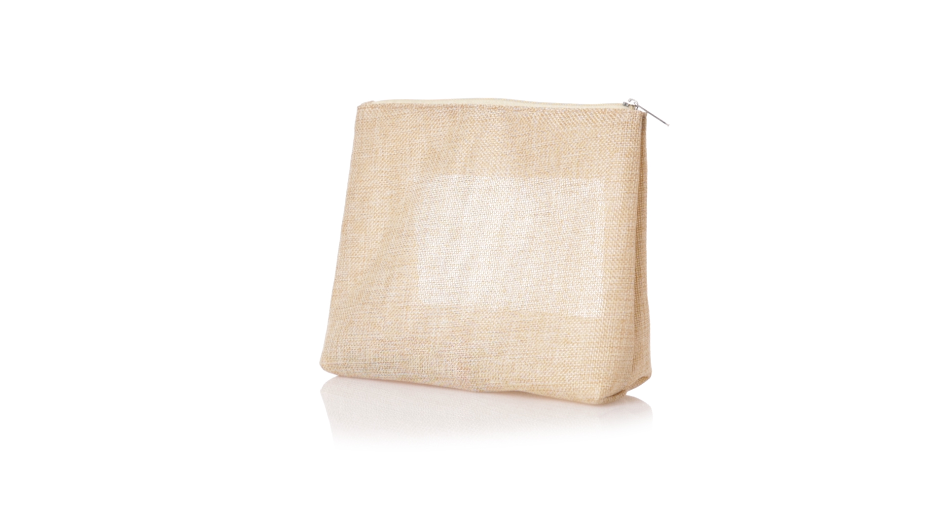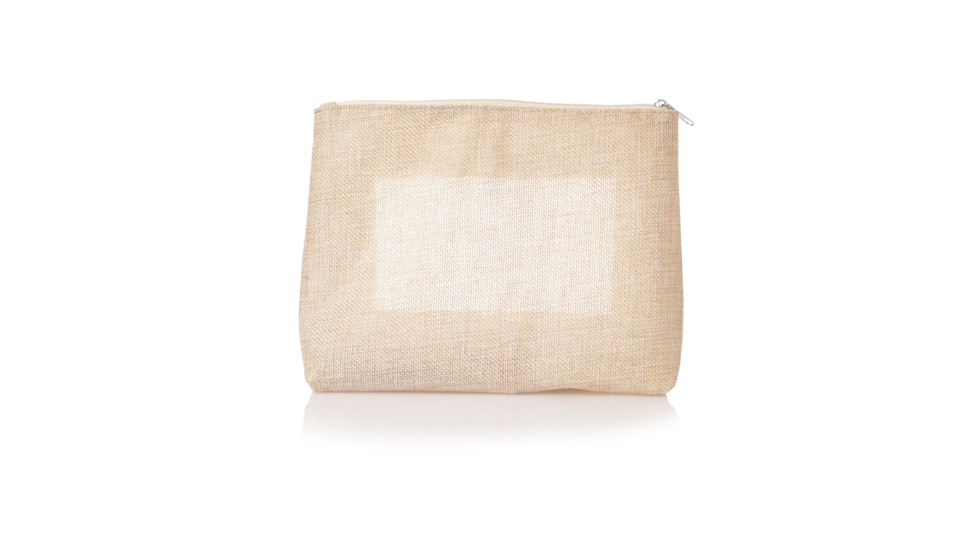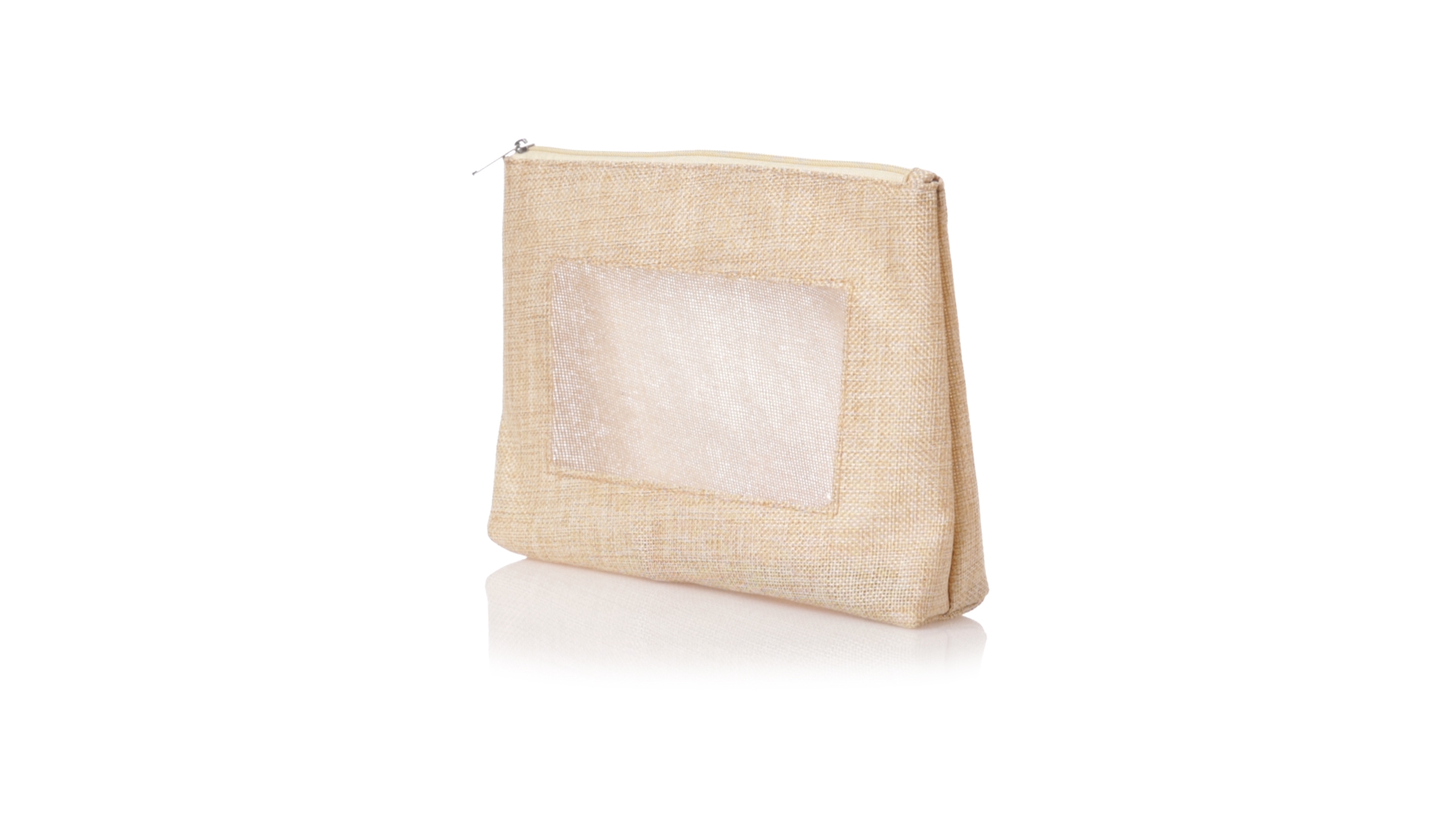 Von der Natur inspirierte Kulturtasche mit Sichtfenster auf einer Seite. Mit passendem Reissverschluss und genähtem Abschluss. Hergestellt aus ecrufarbenem Polyester, mit transparentem EVA-Fenster.