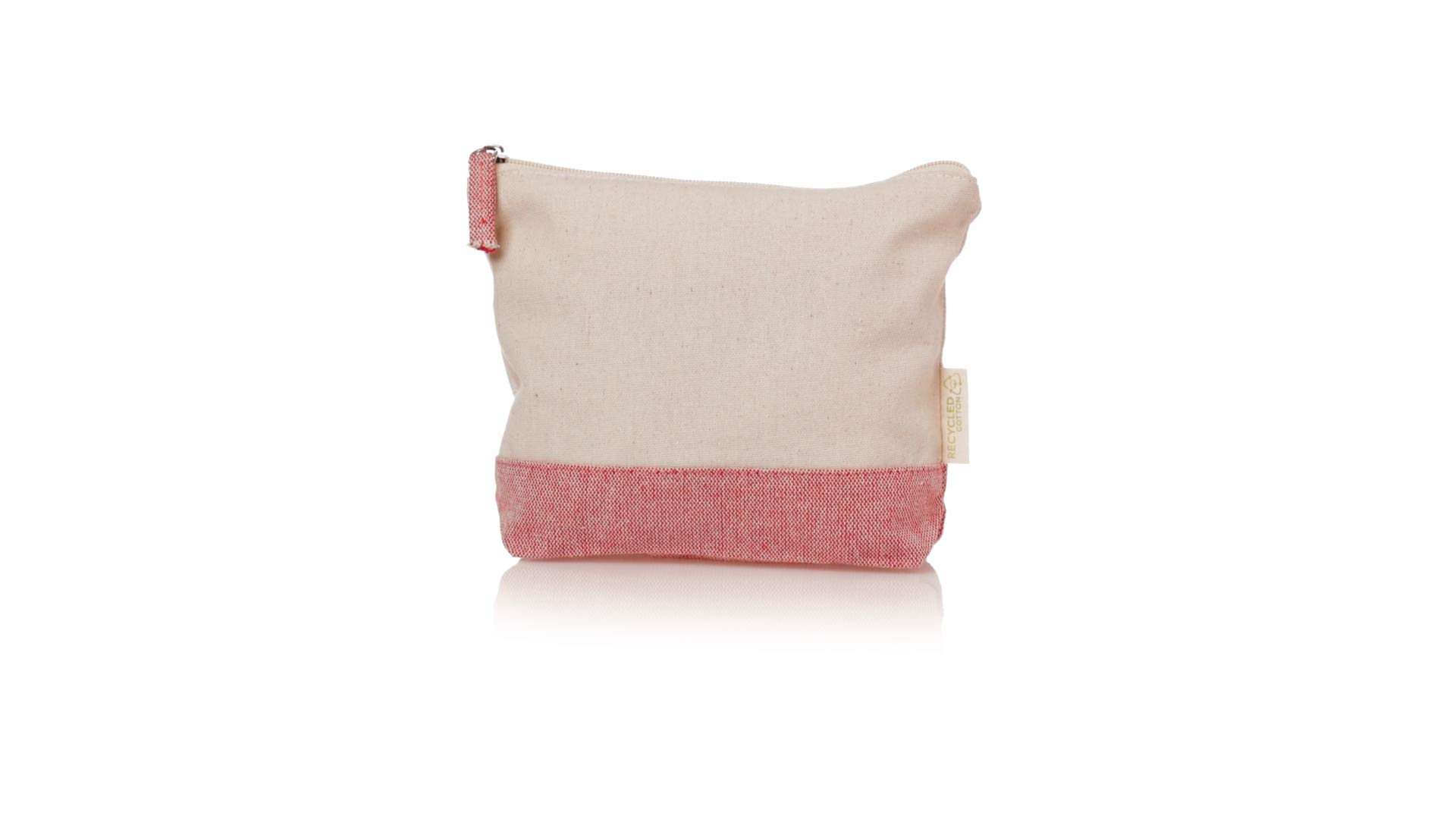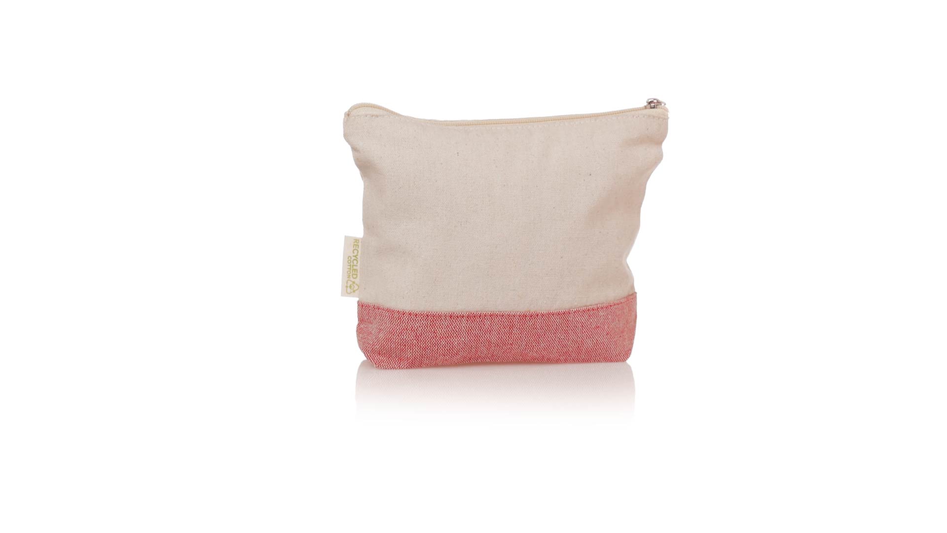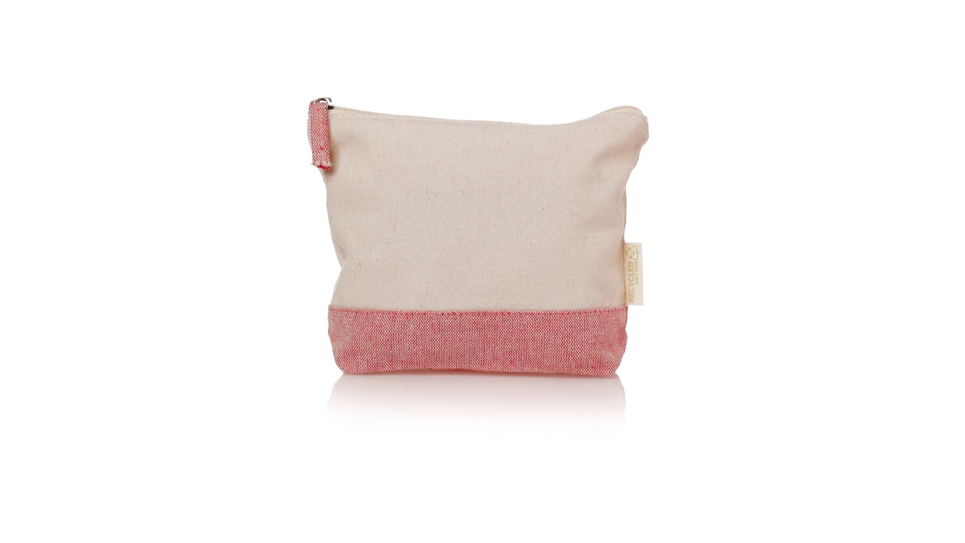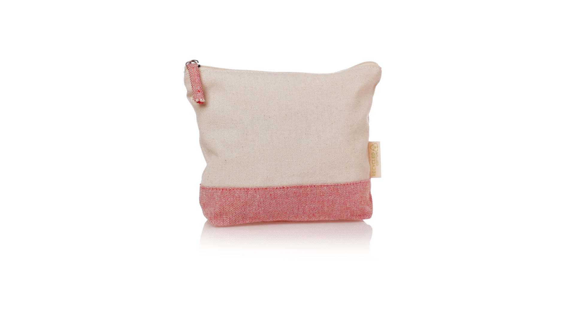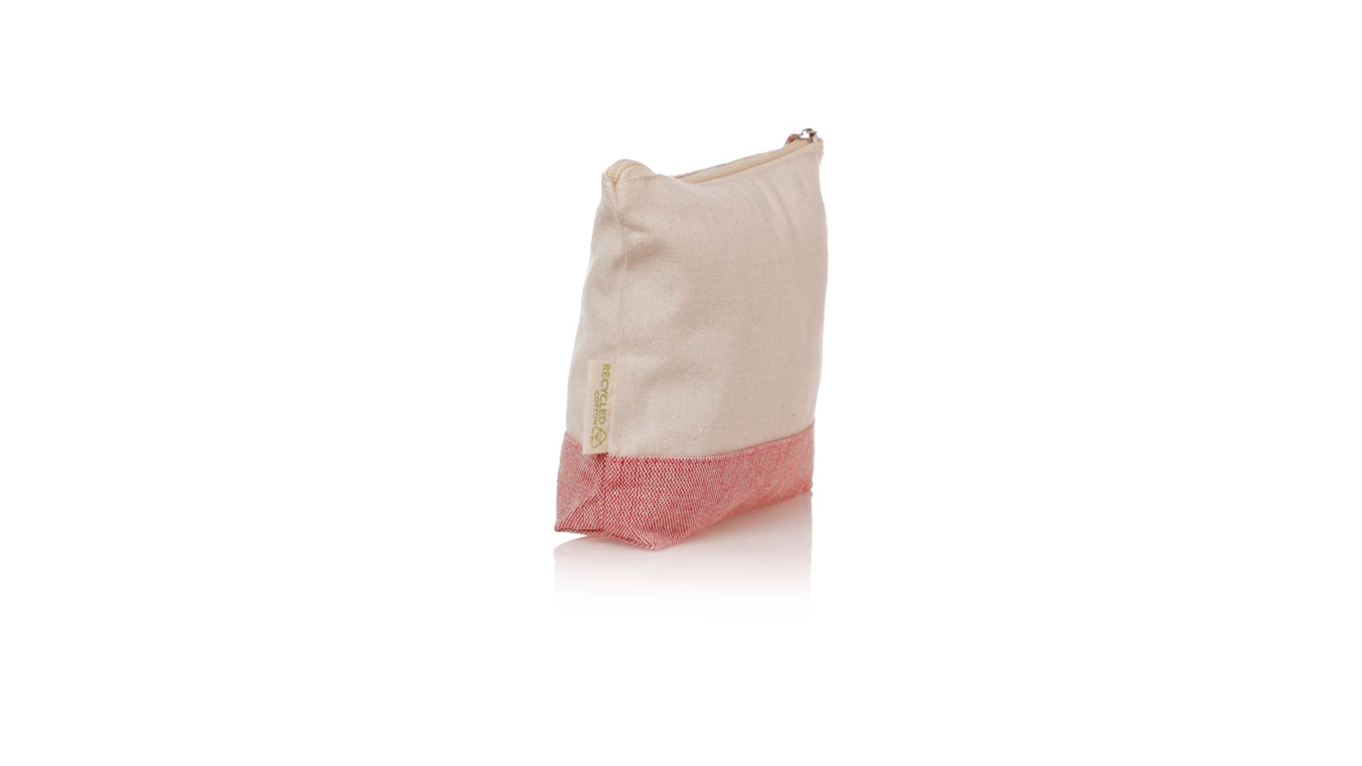 Kosmetiktasche aus recycelter Baumwolle. Hauptfach mit Reissverschluss und Griff in der gleichen Farbe wie der Boden. Erhältlich in vielen leuchtenden Farben, mit Etikett für recycelte Baumwolle.