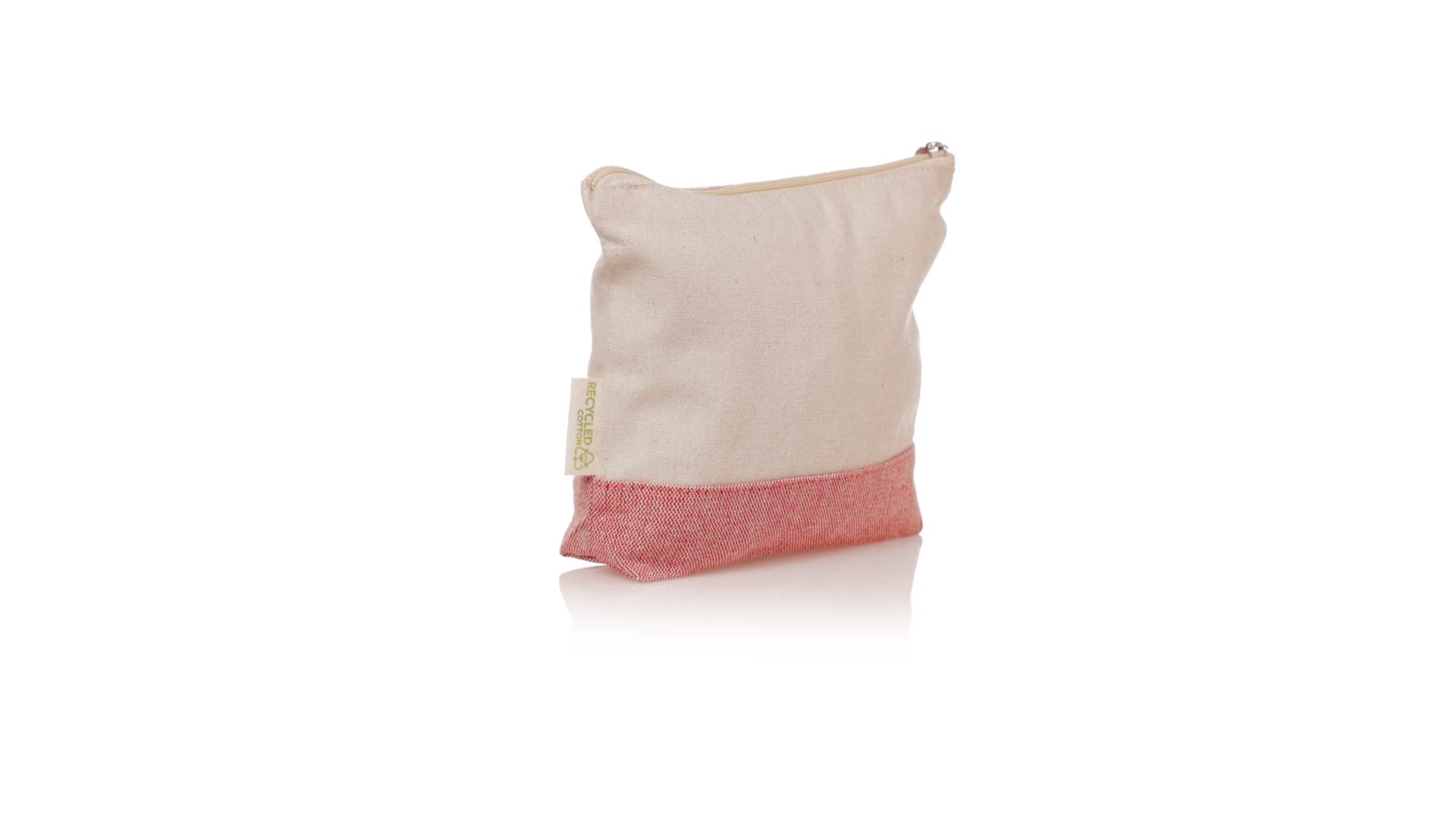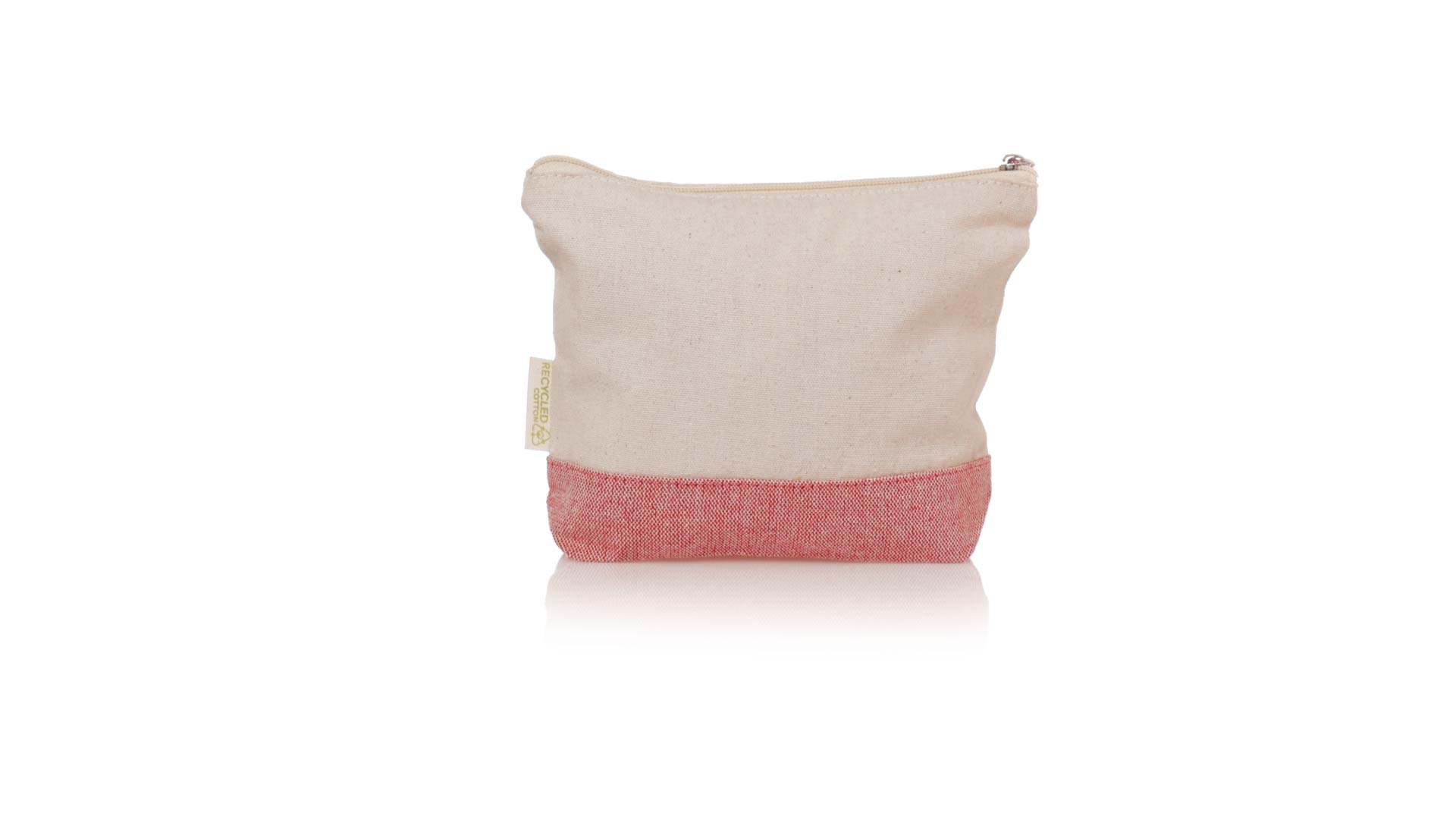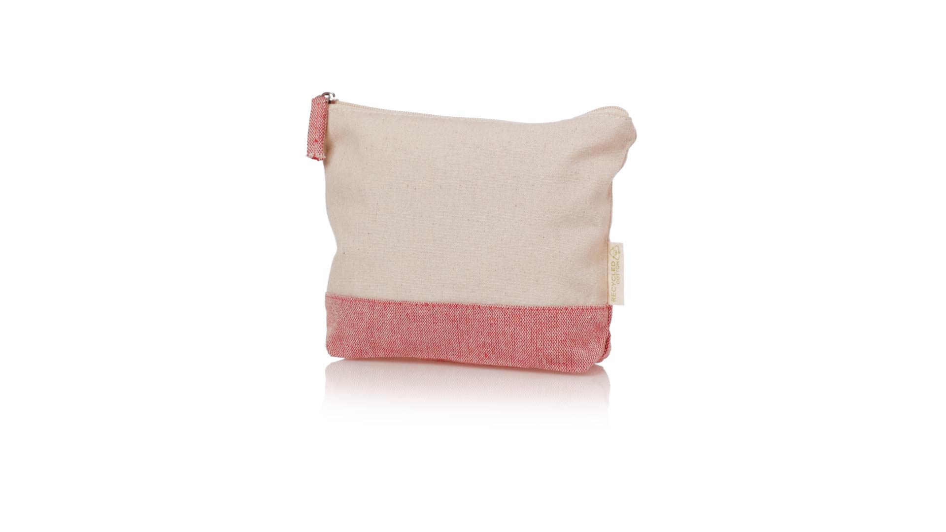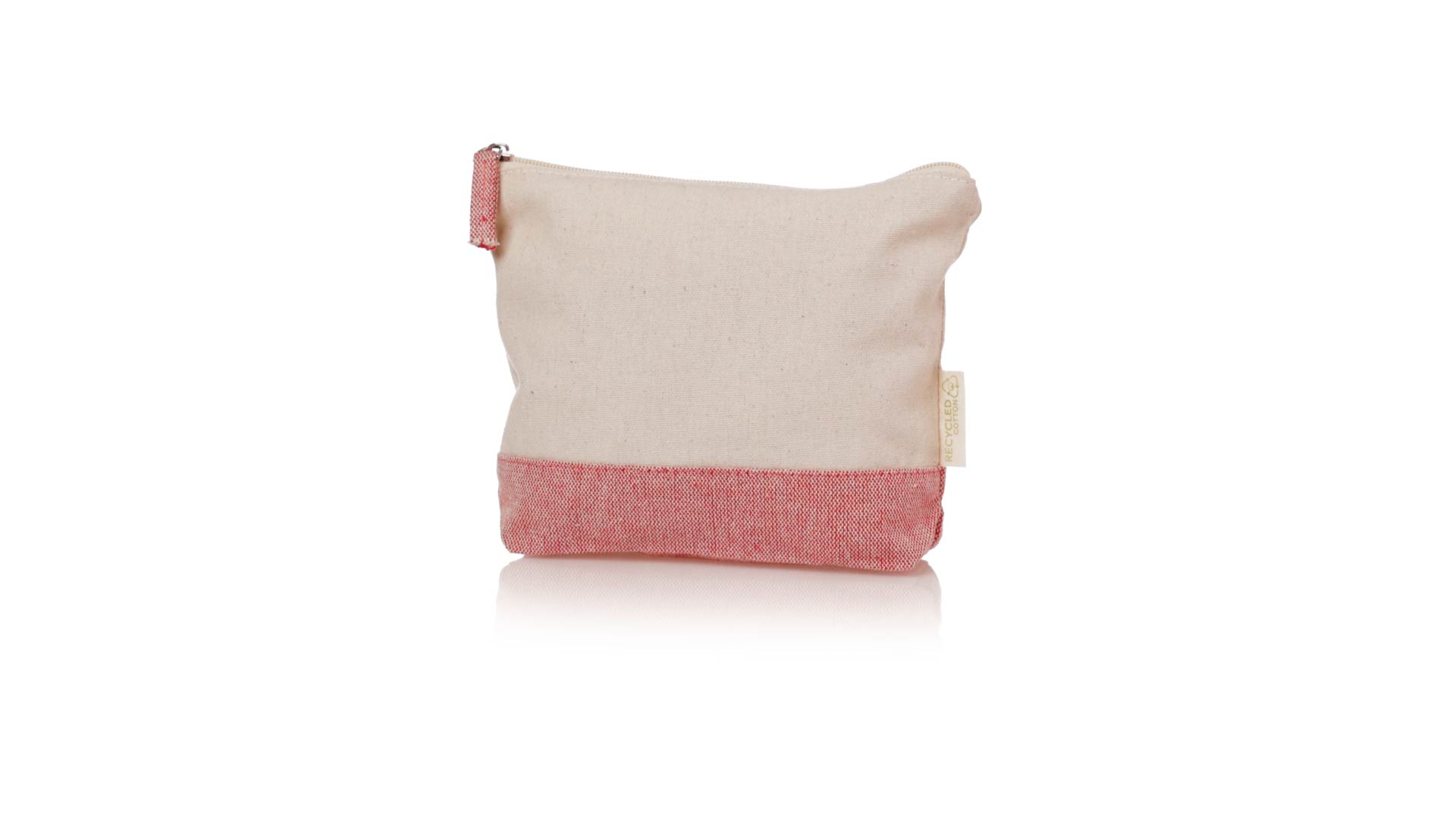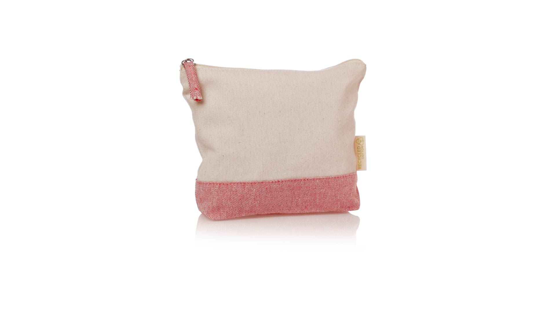 Kosmetiktasche aus recycelter Baumwolle. Hauptfach mit Reissverschluss und Griff in der gleichen Farbe wie der Boden. Erhältlich in vielen leuchtenden Farben, mit Etikett für recycelte Baumwolle.
